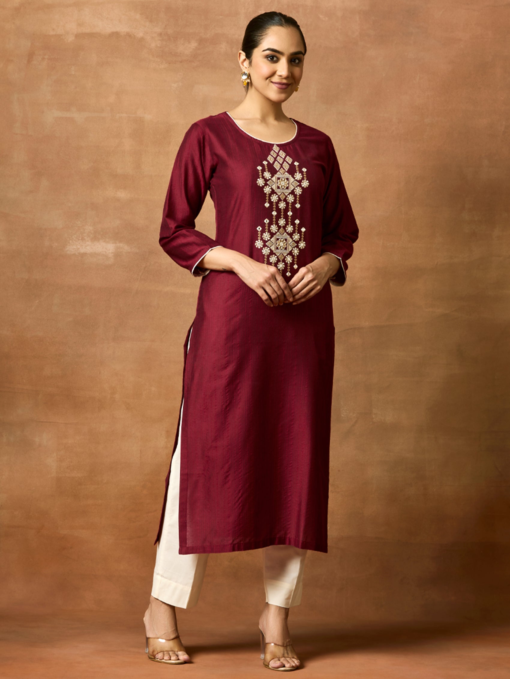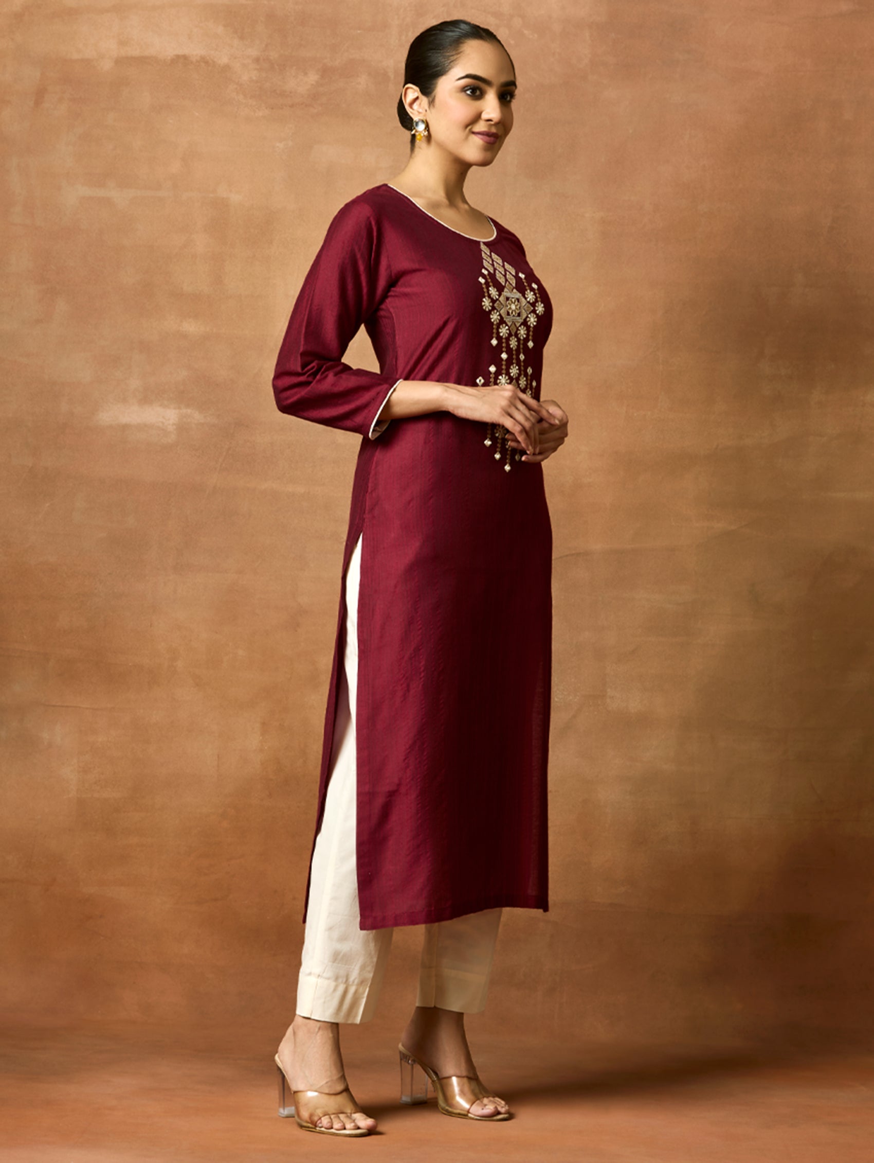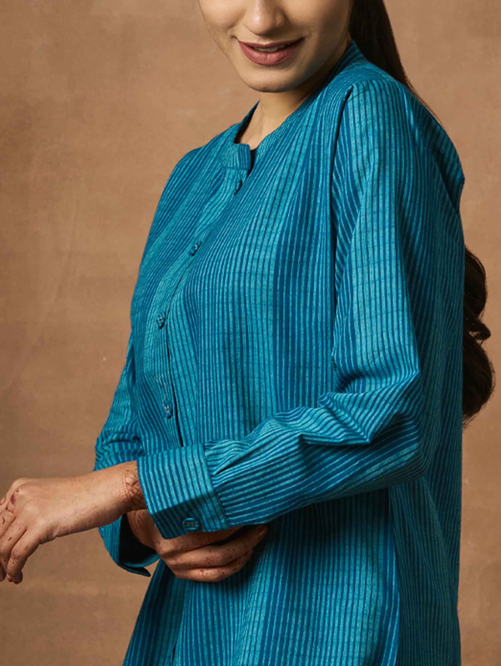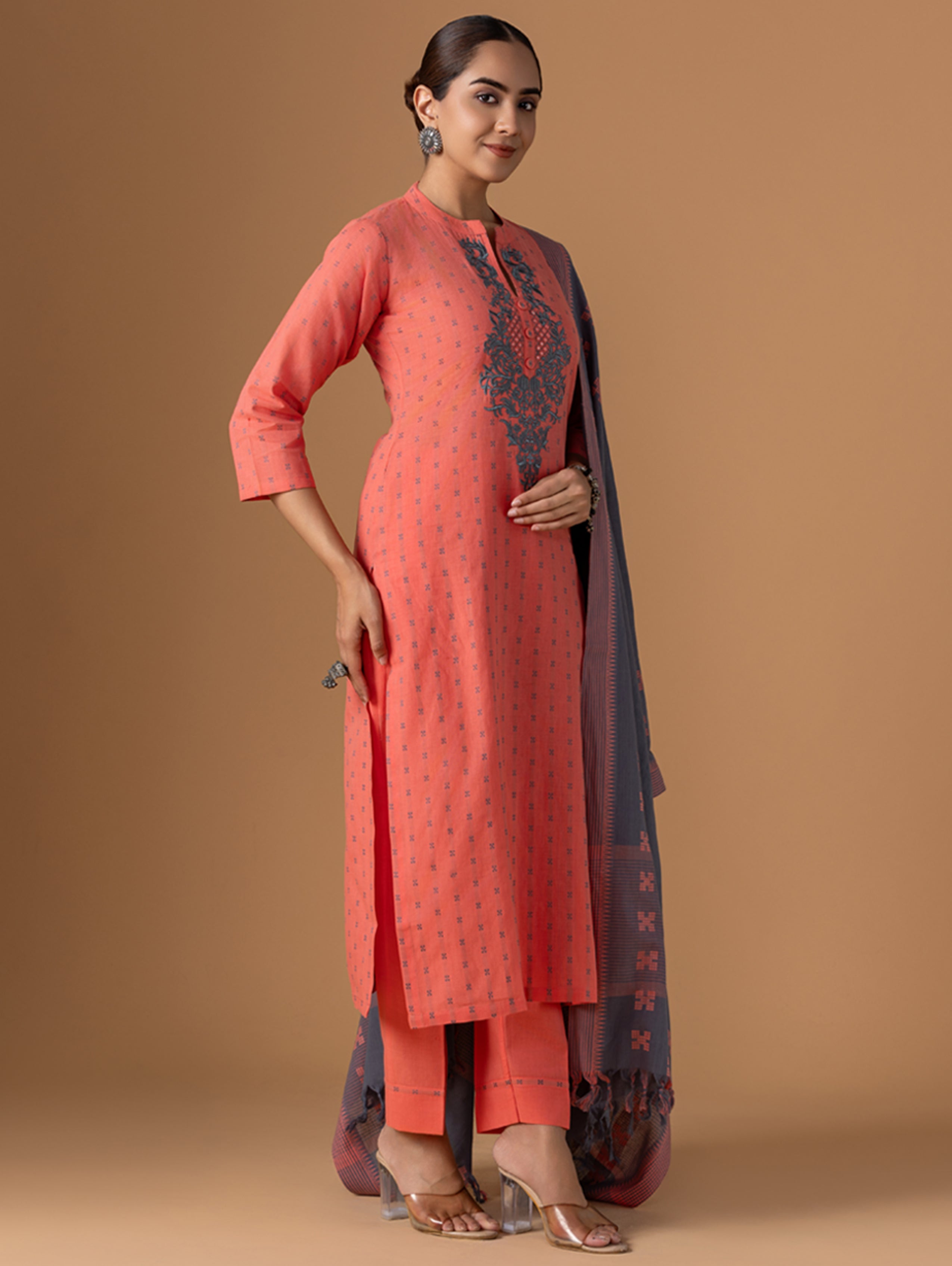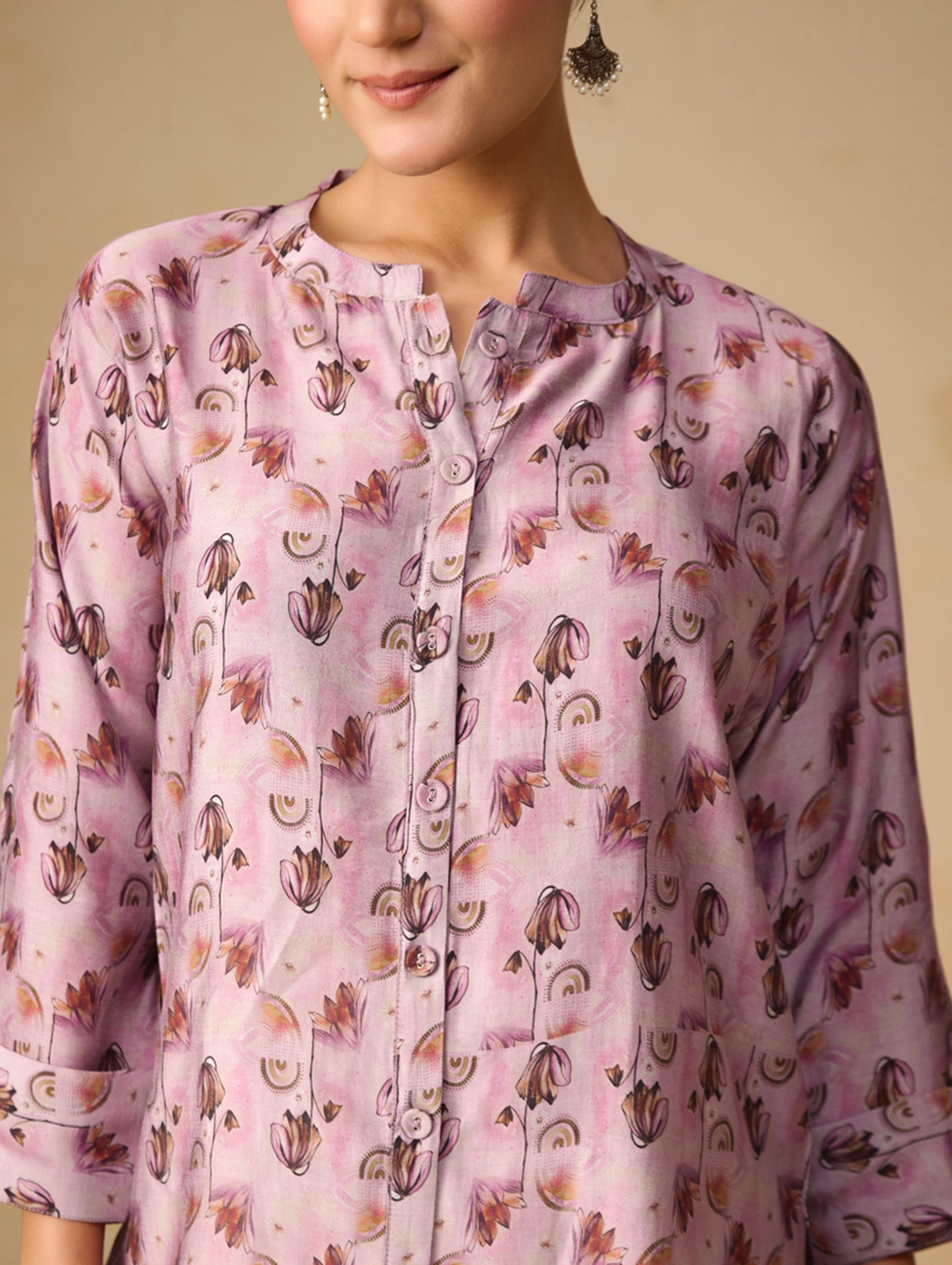• Short Kurti with mandarin collar, three-fourth sleeves, and side slits open