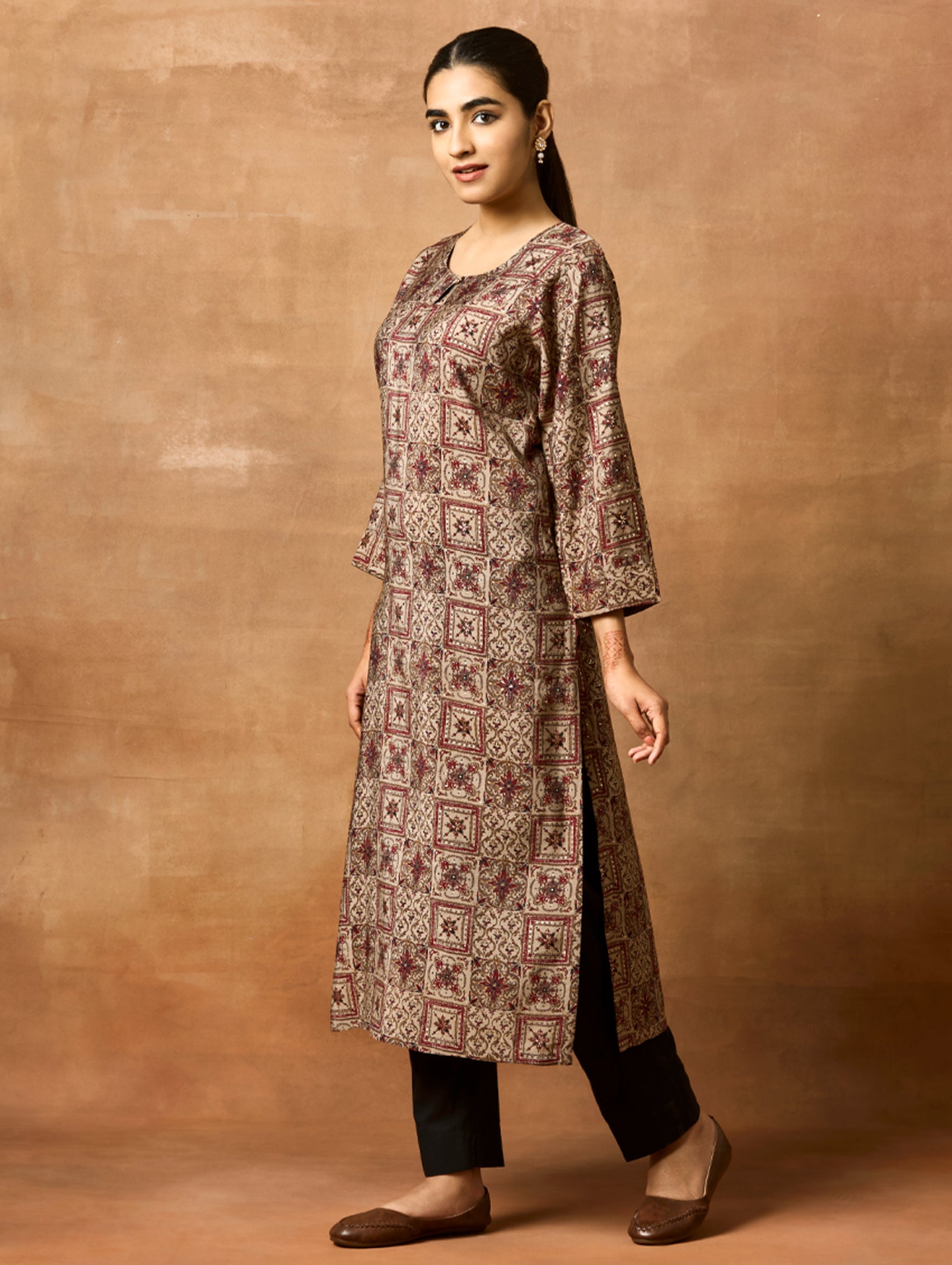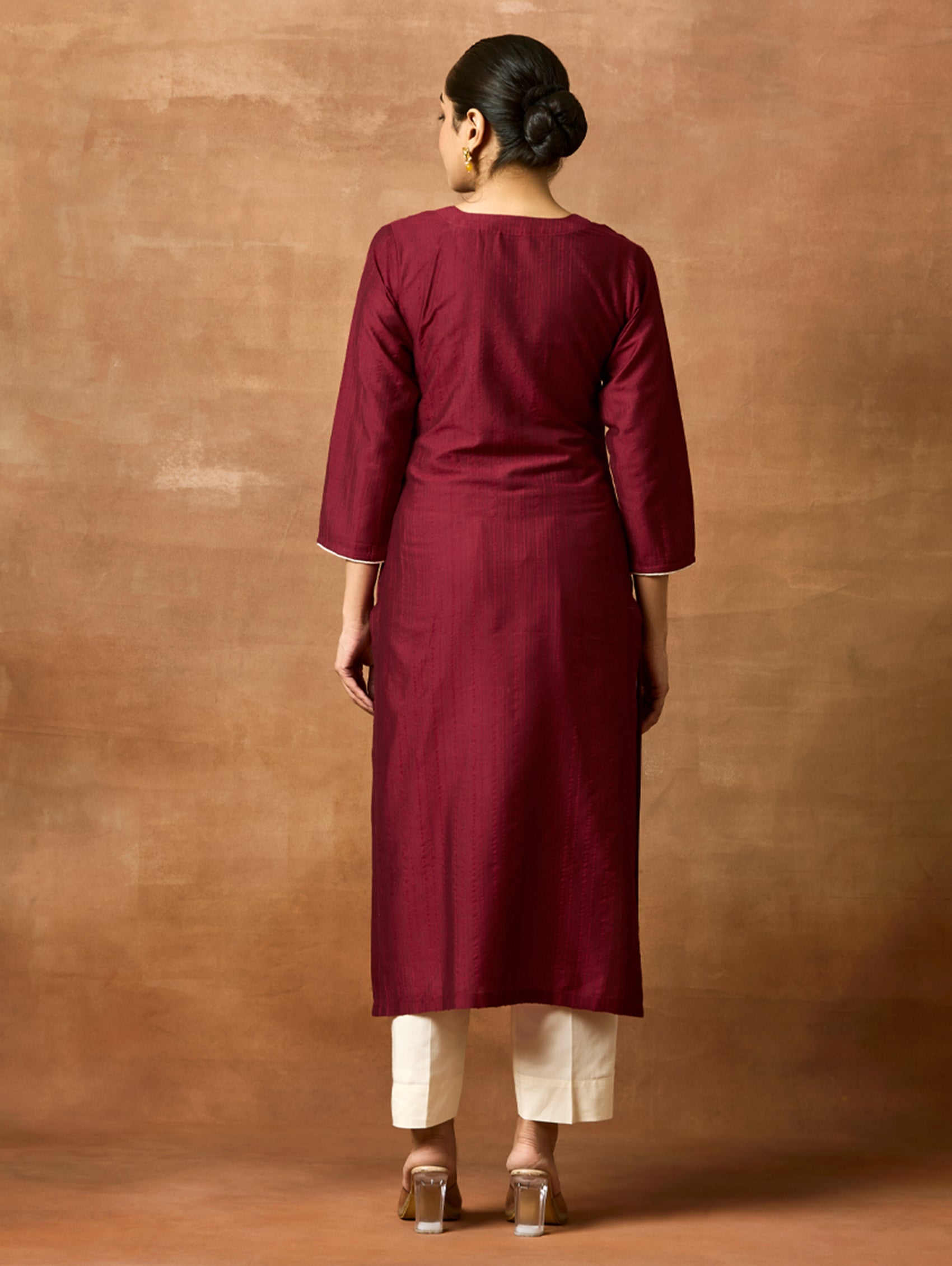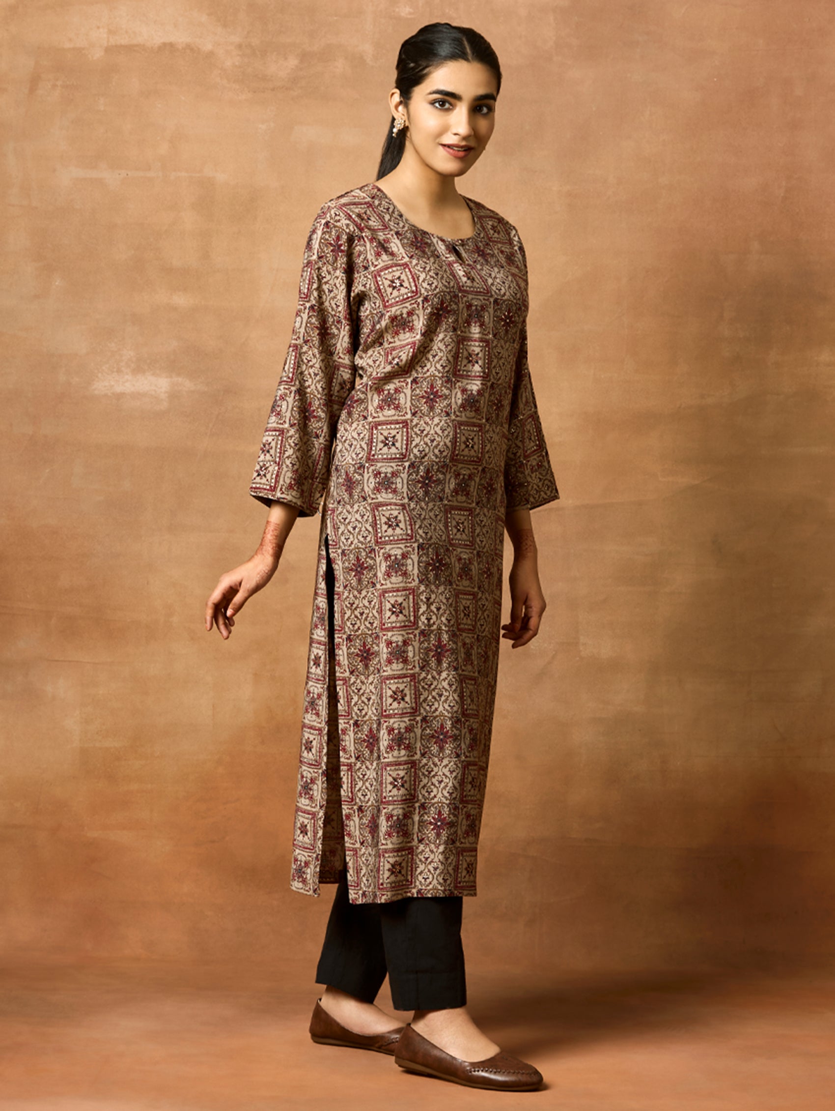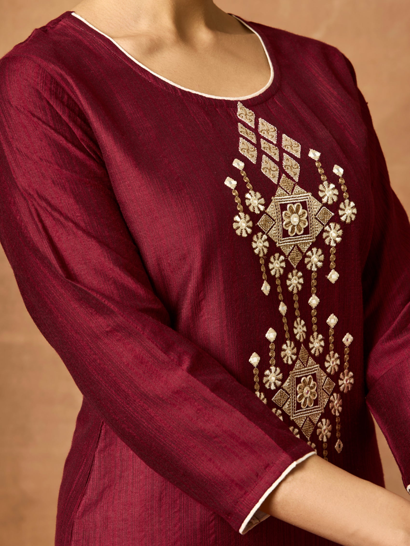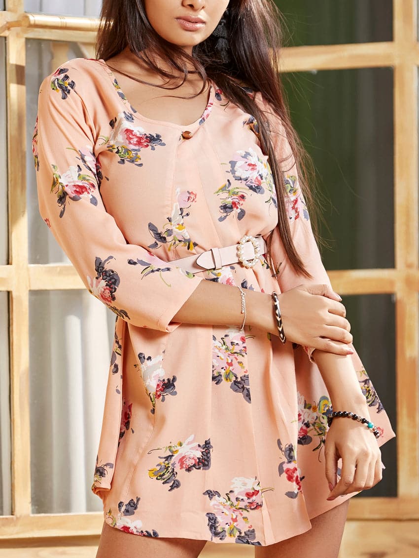 • Short Kurti with mandarin collar, three-fourth sleeves, and side slits open
