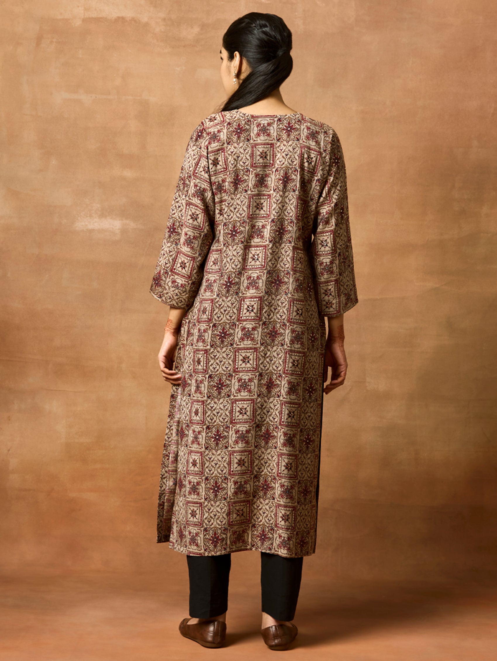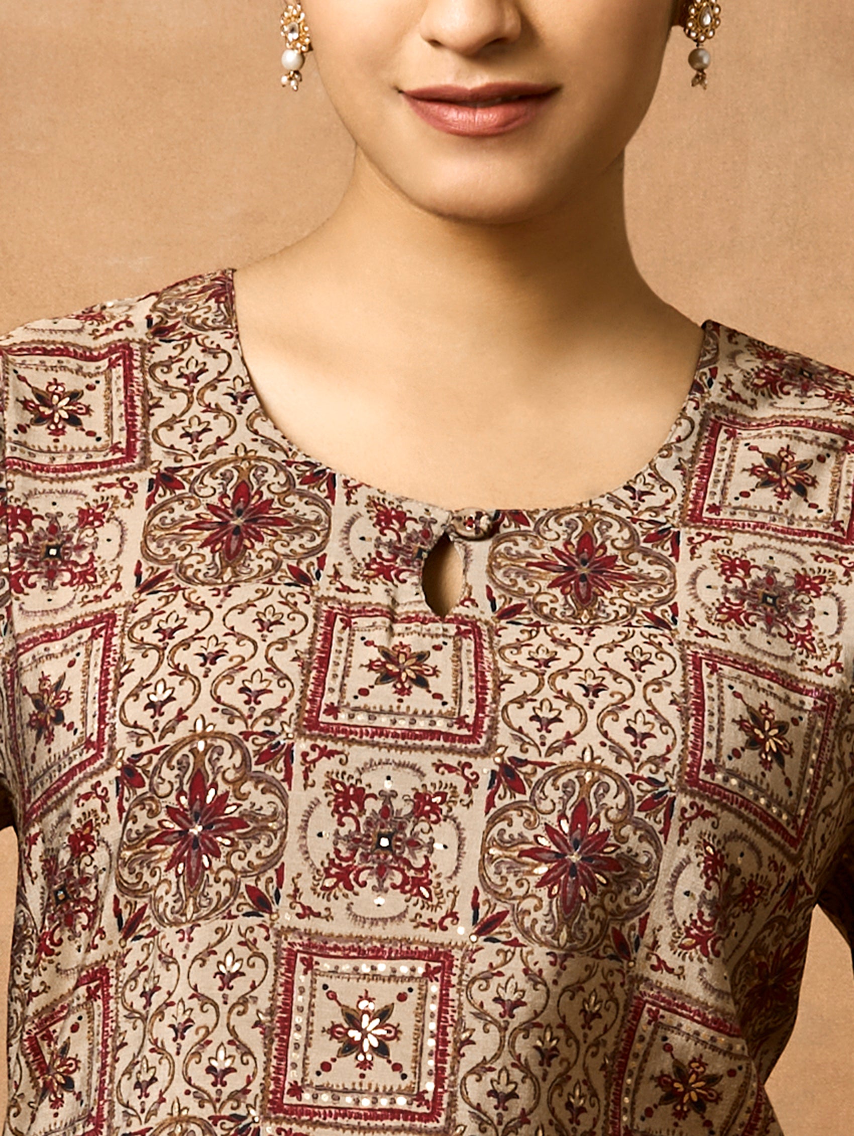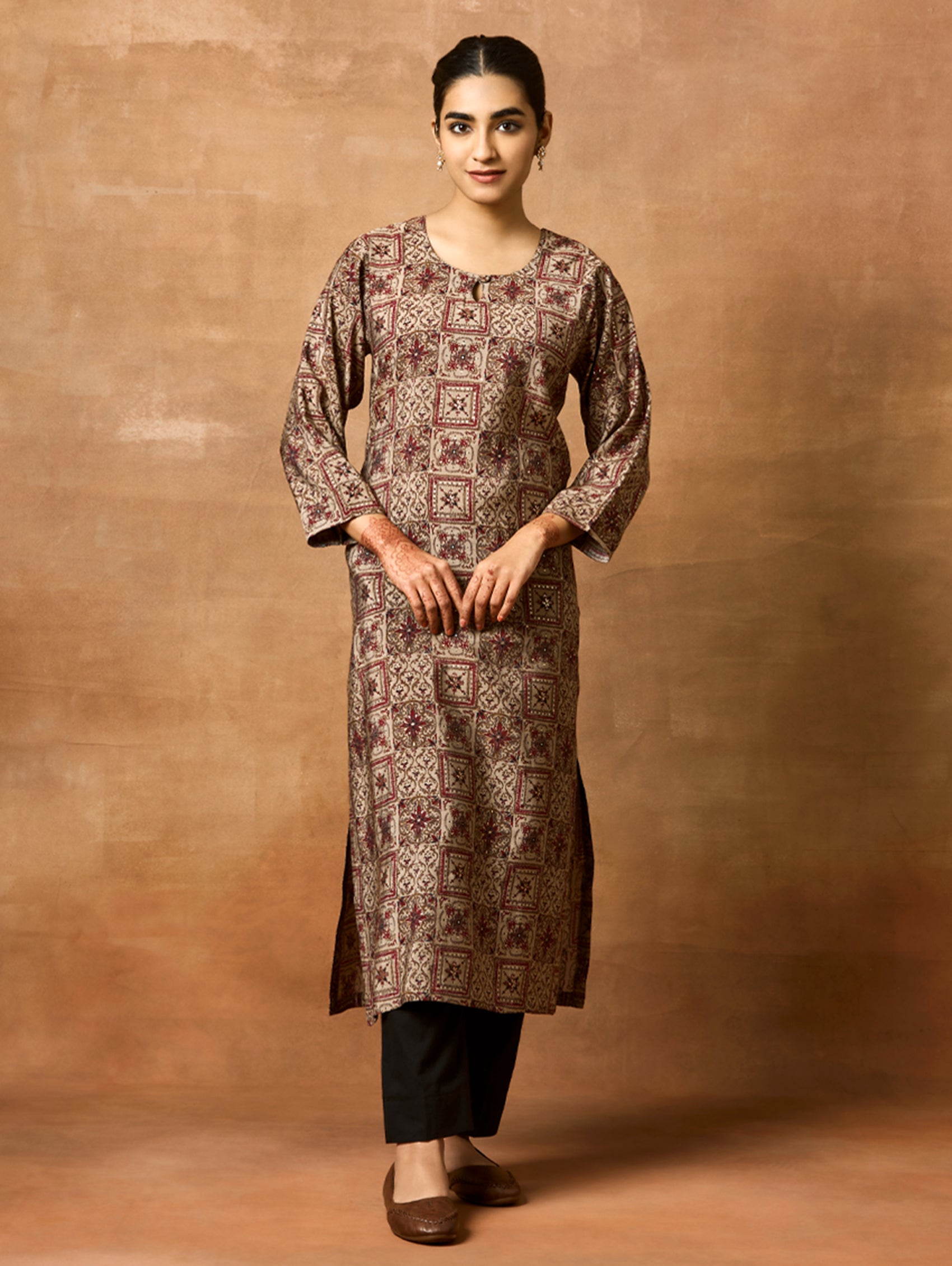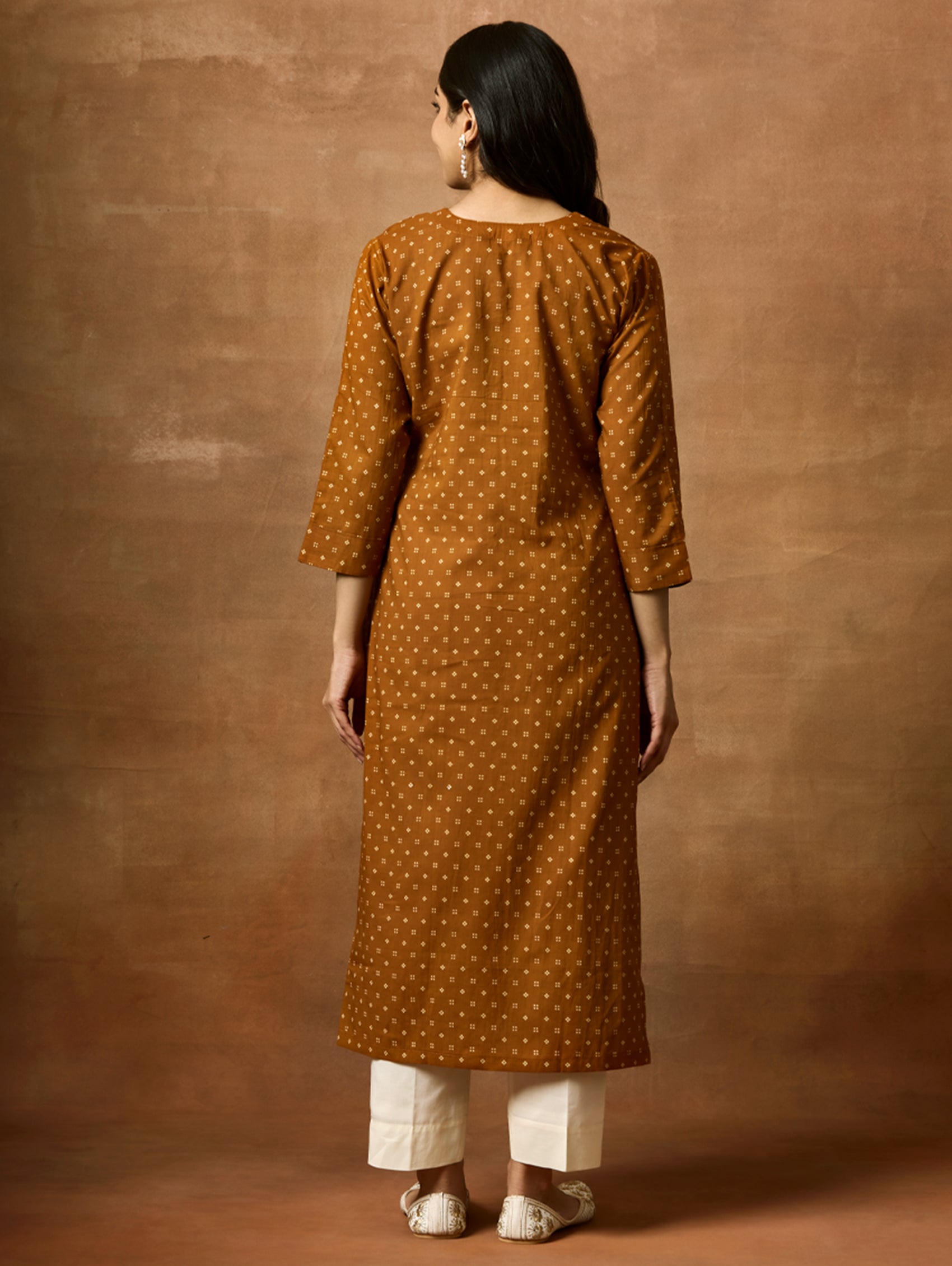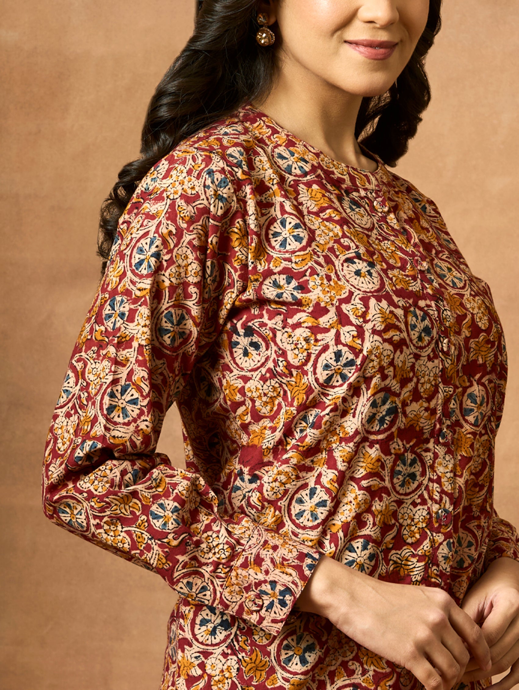 • Short Kurti with mandarin collar, three-fourth sleeves, and side slits open