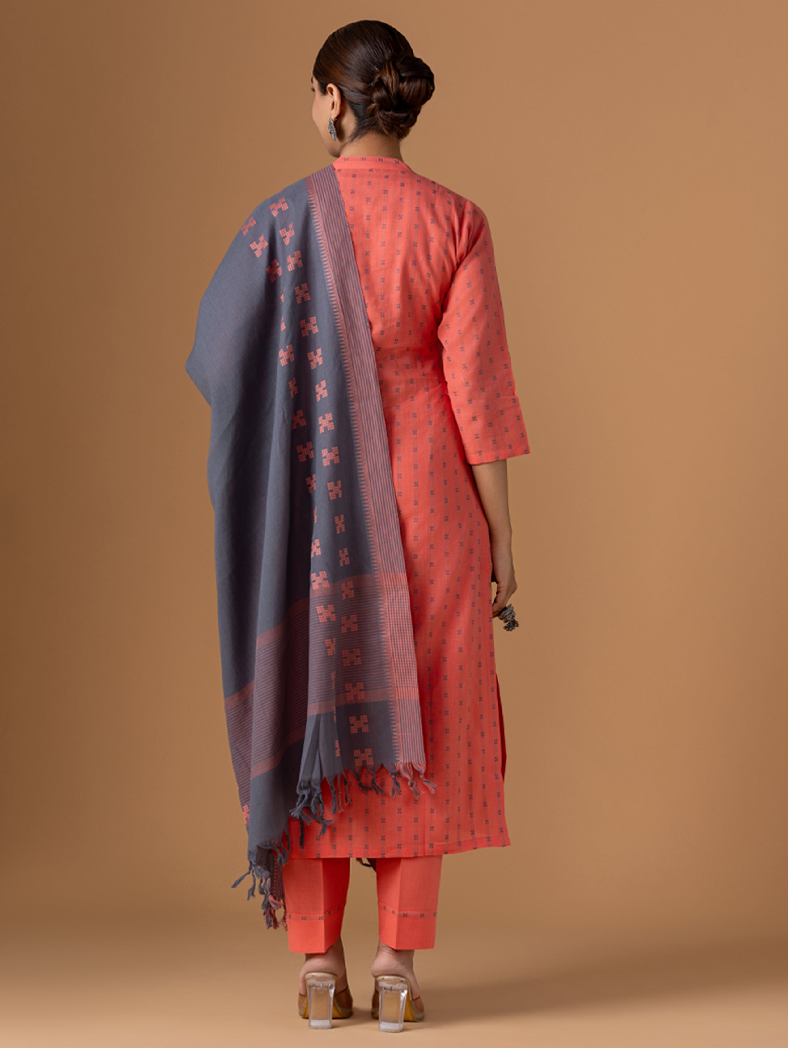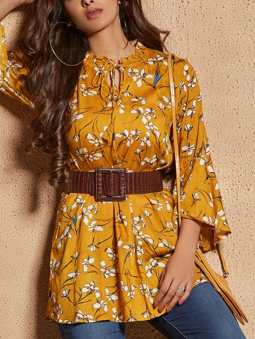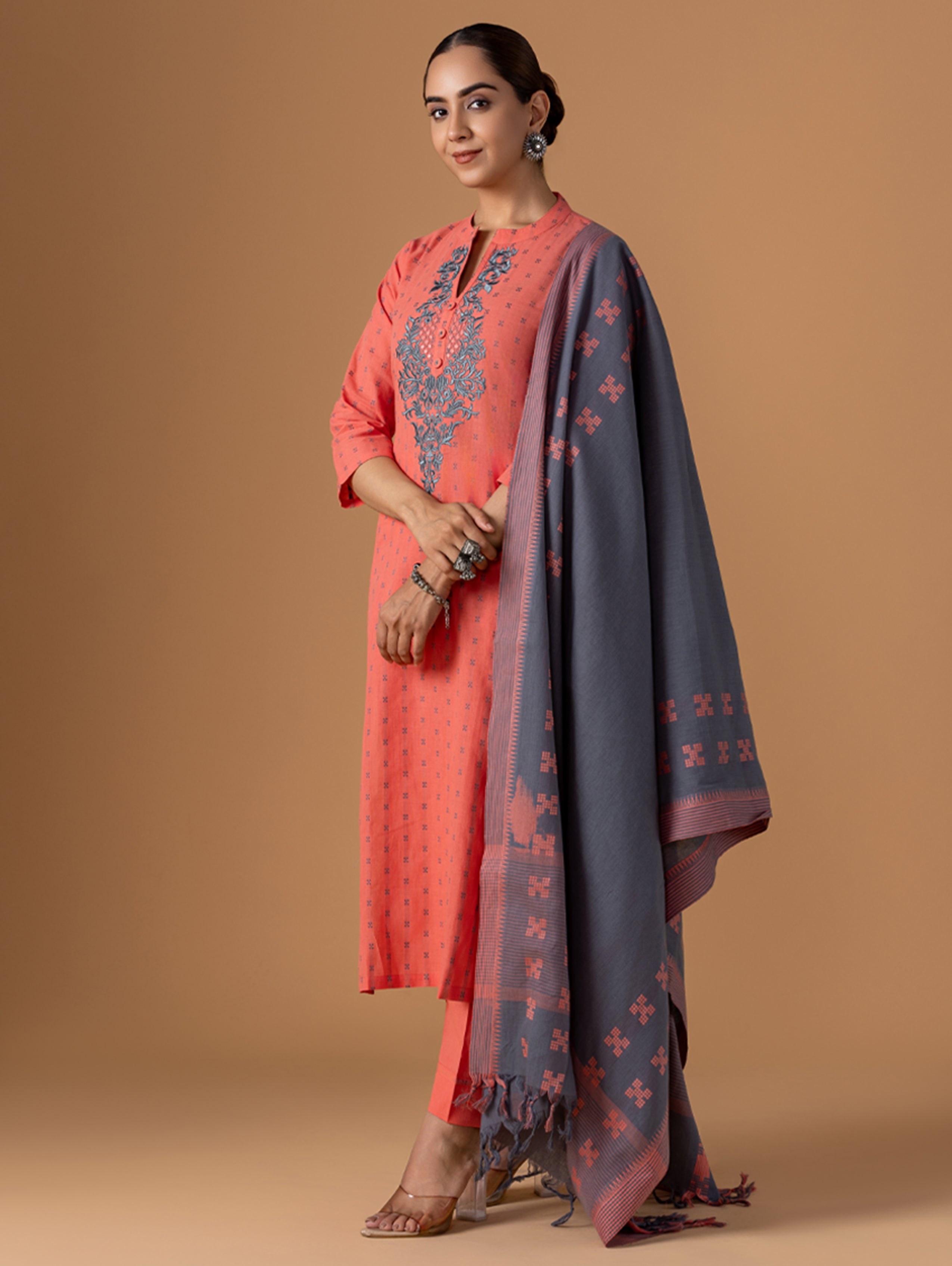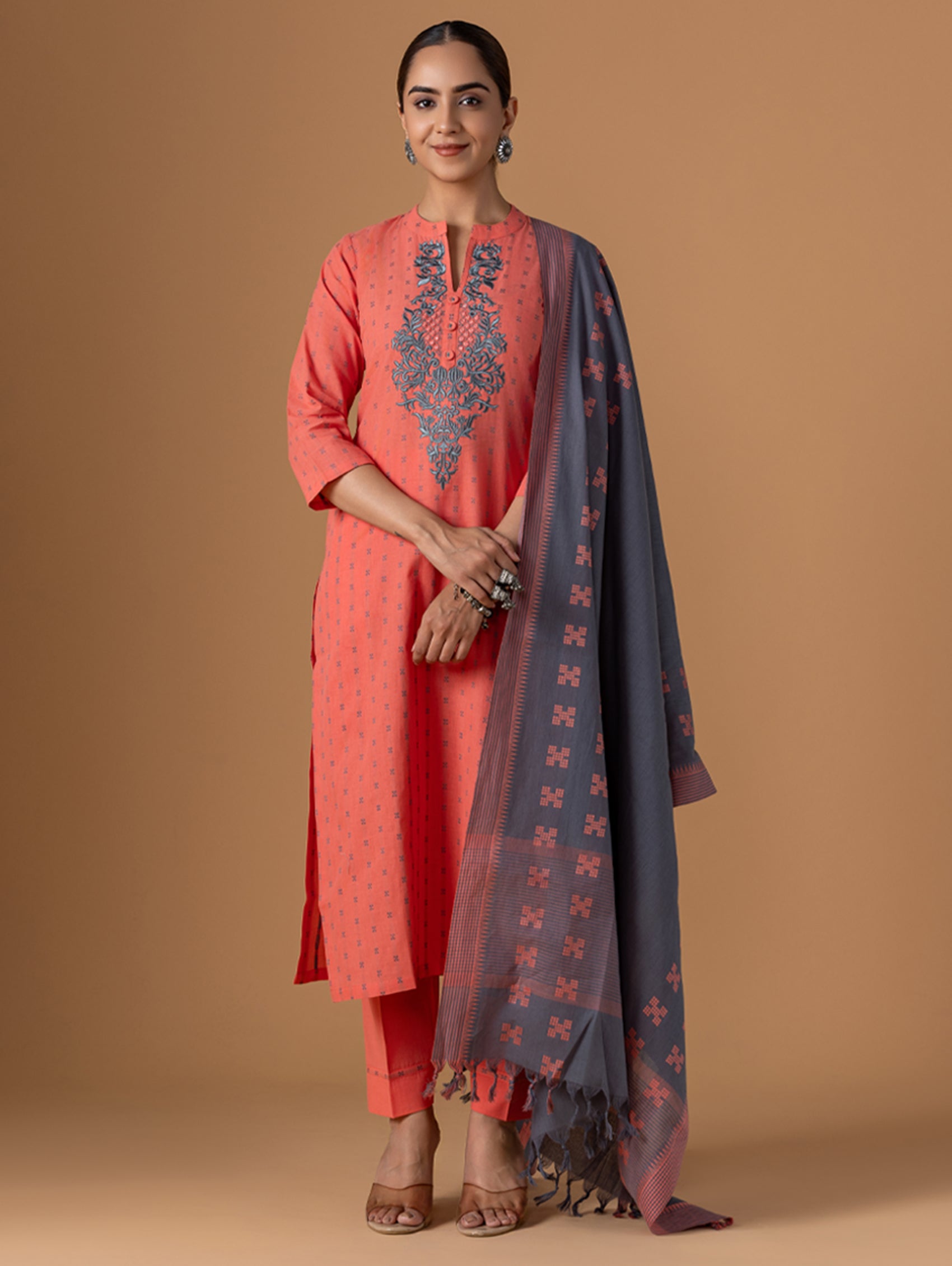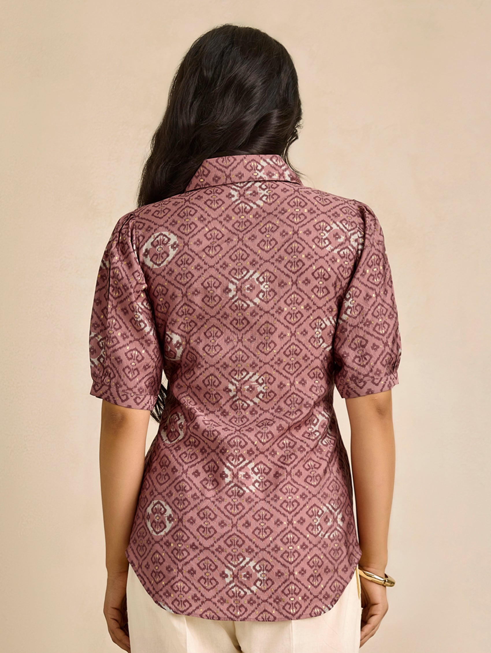 • Short Kurti with mandarin collar, three-fourth sleeves, and side slits open