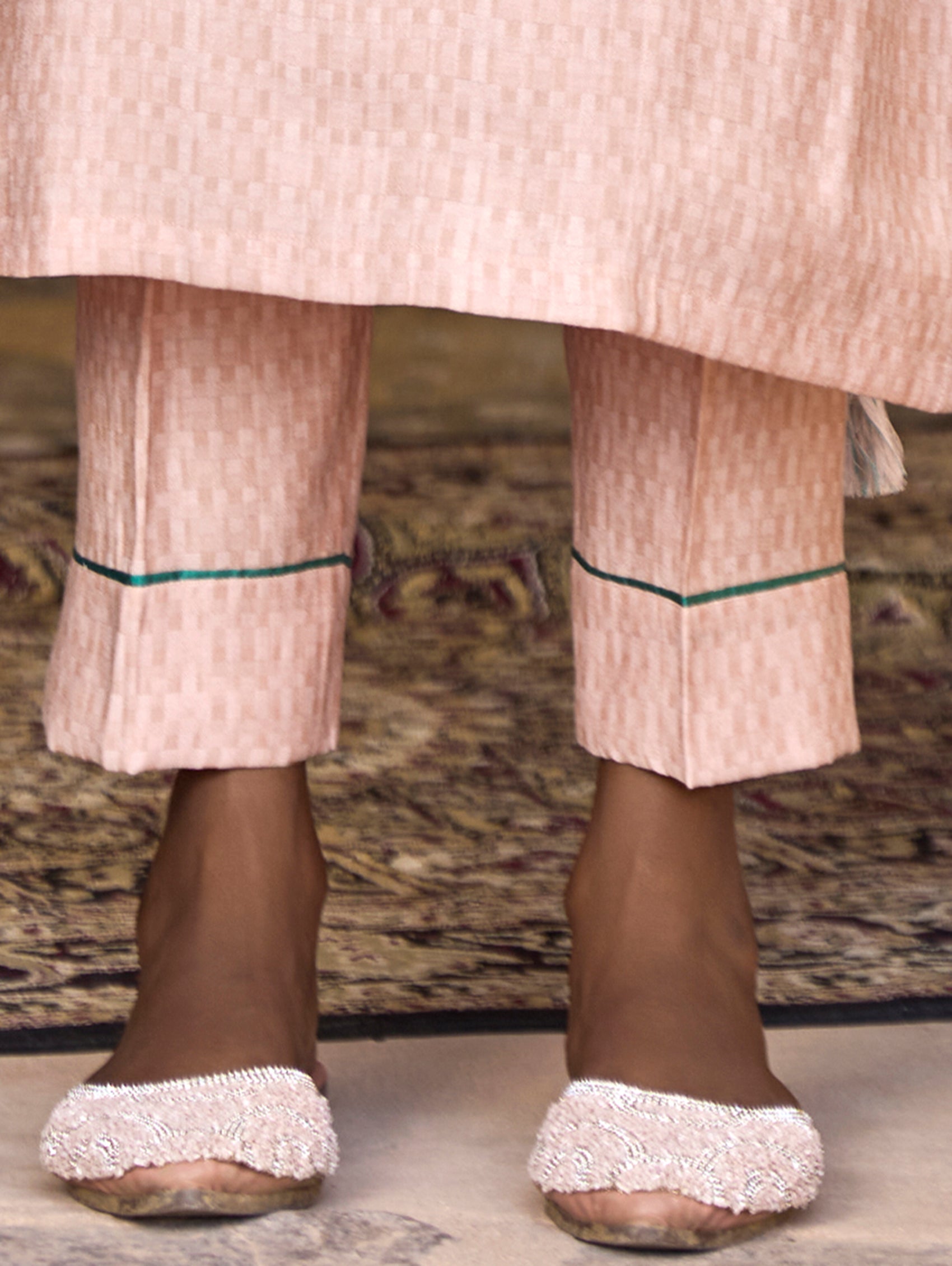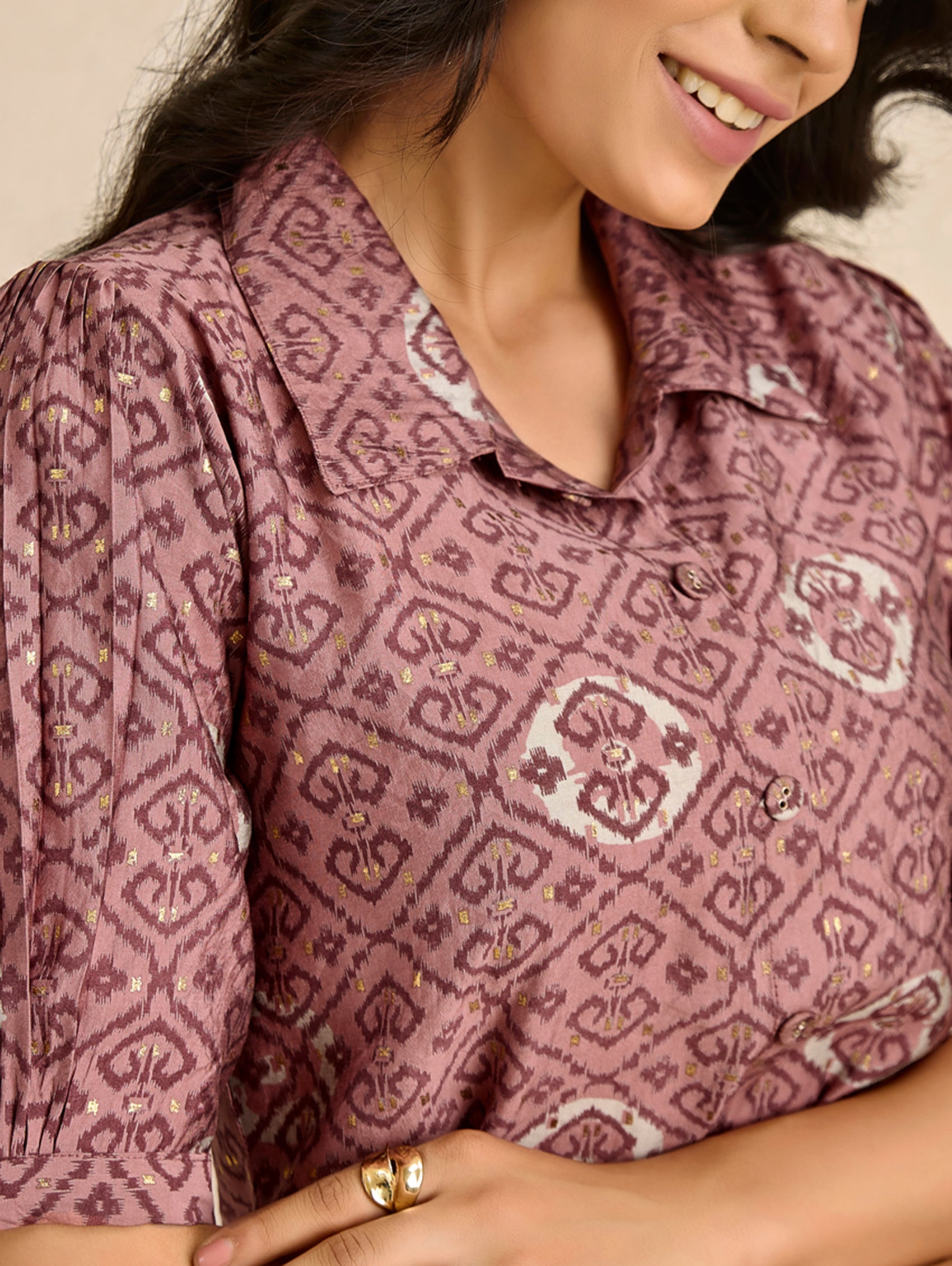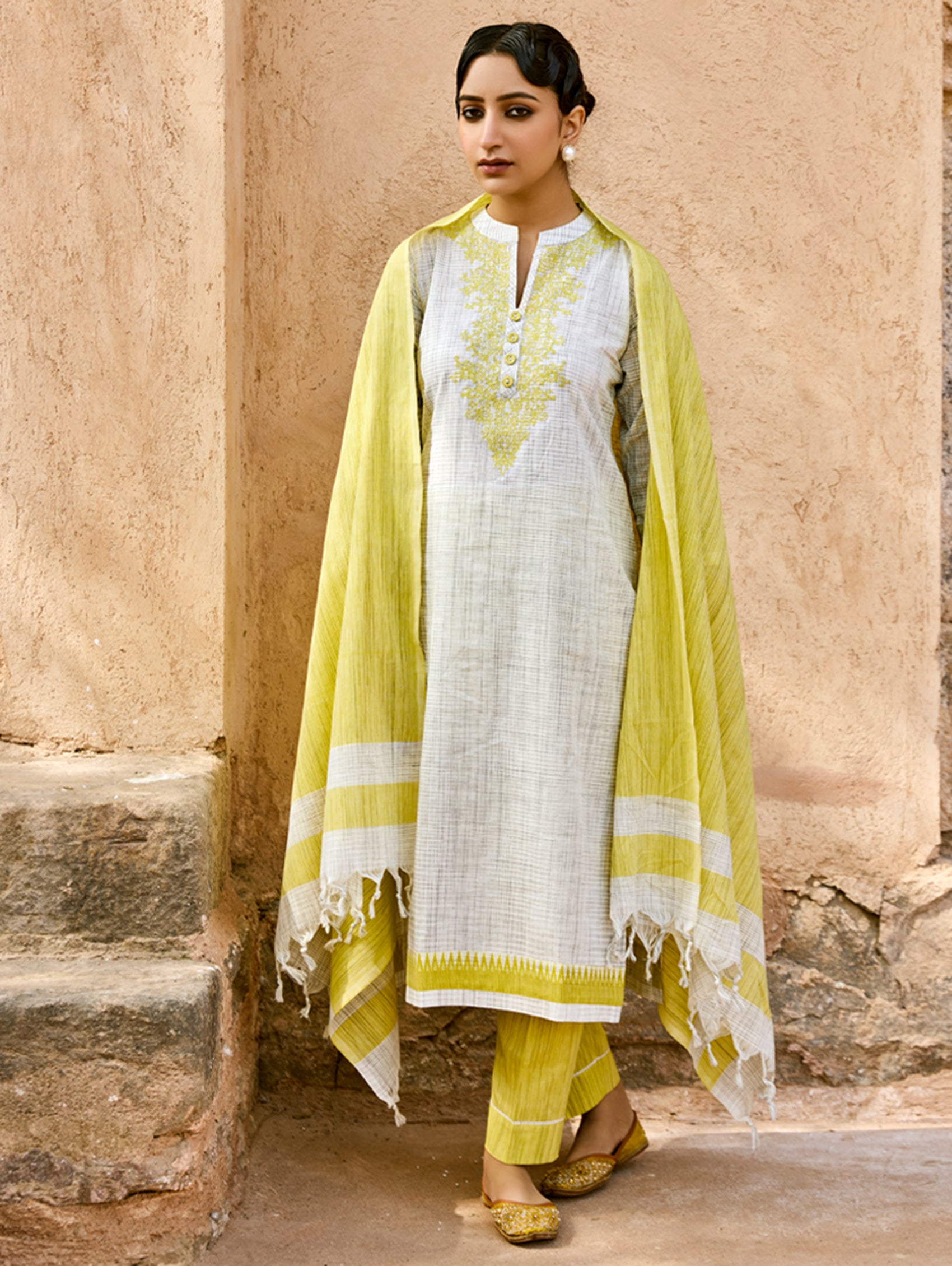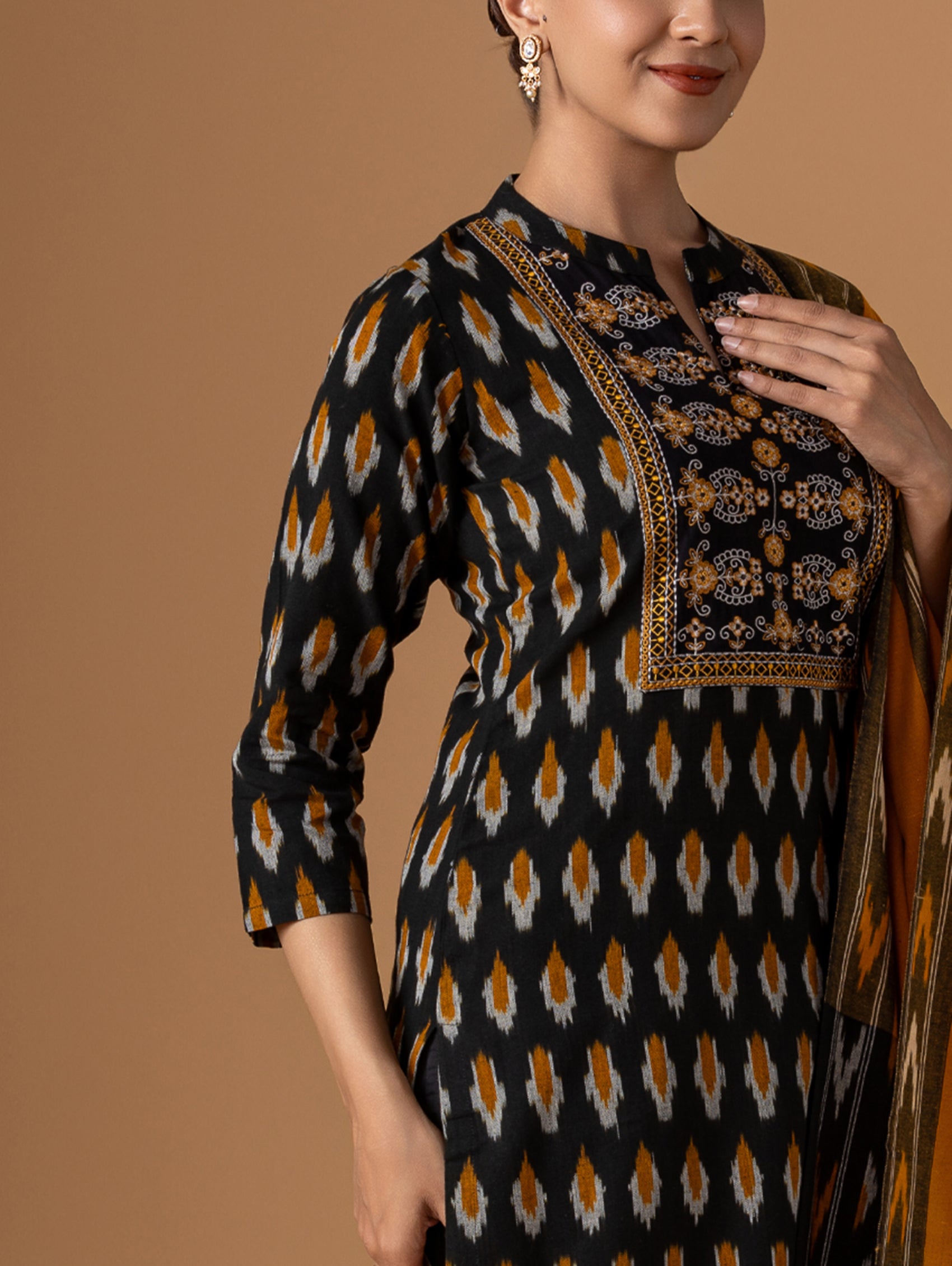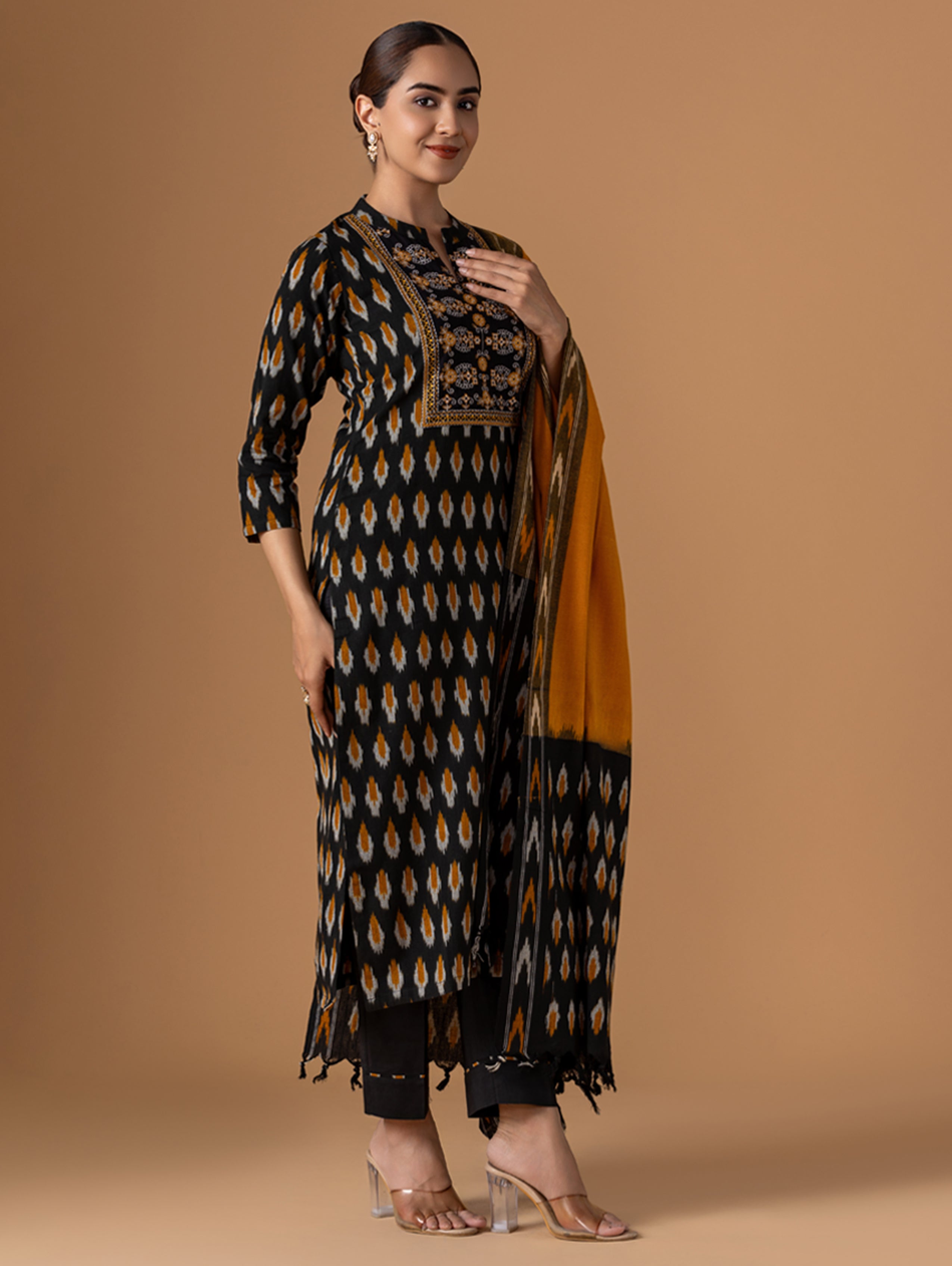 • Short Kurti with mandarin collar, three-fourth sleeves, and side slits open