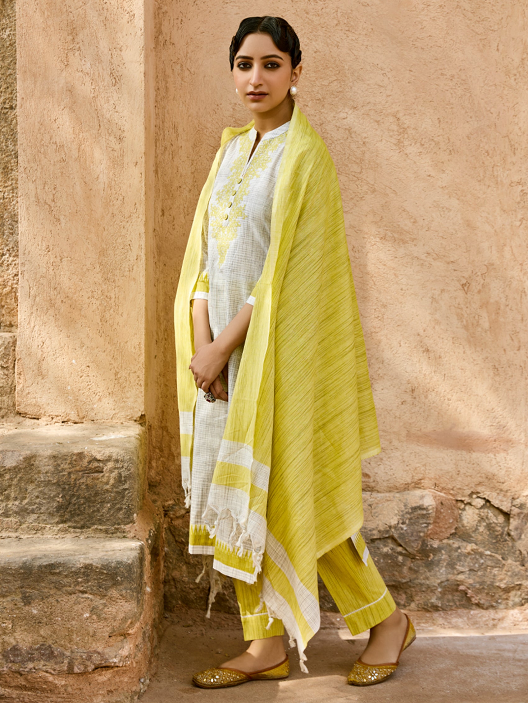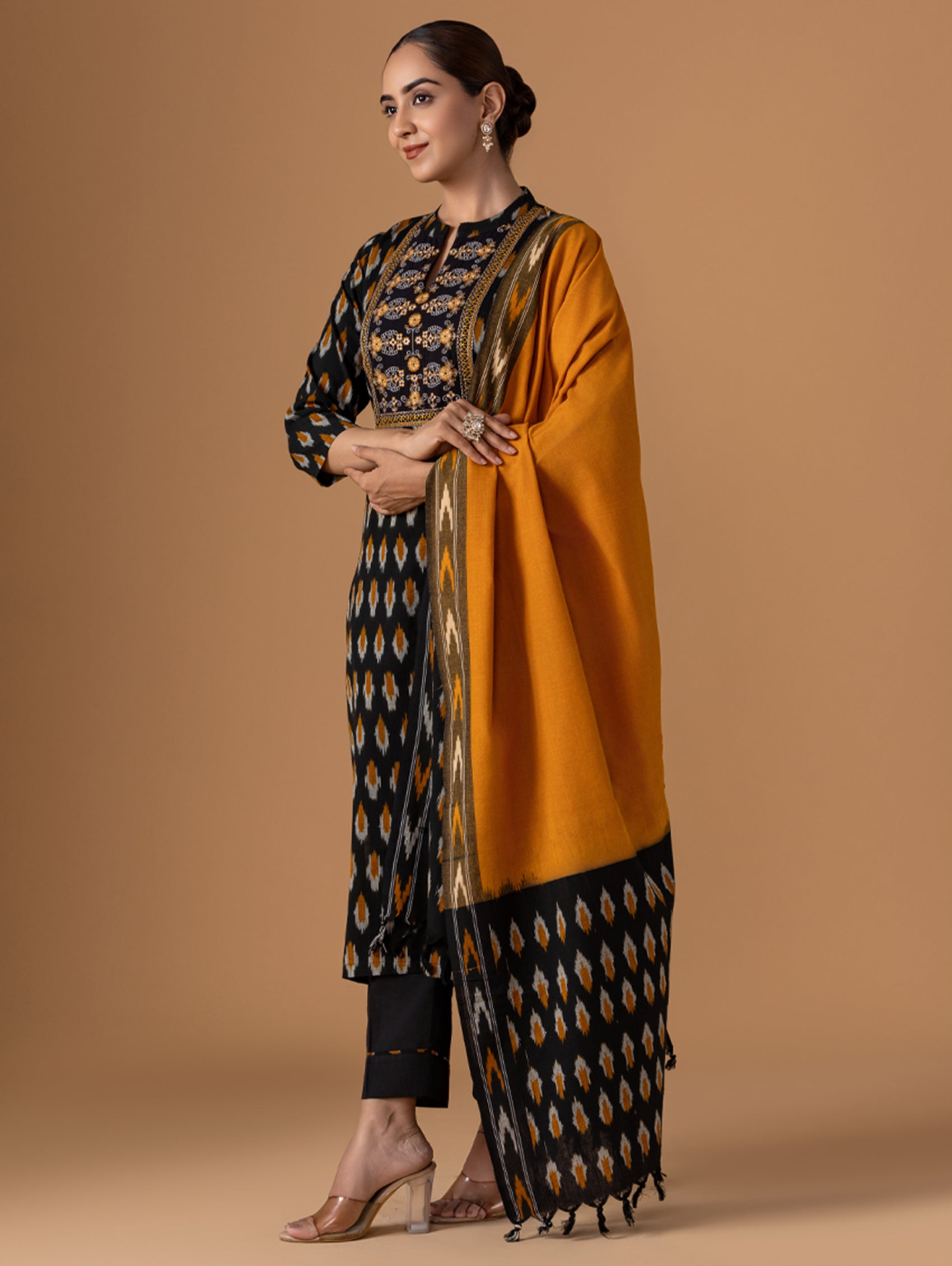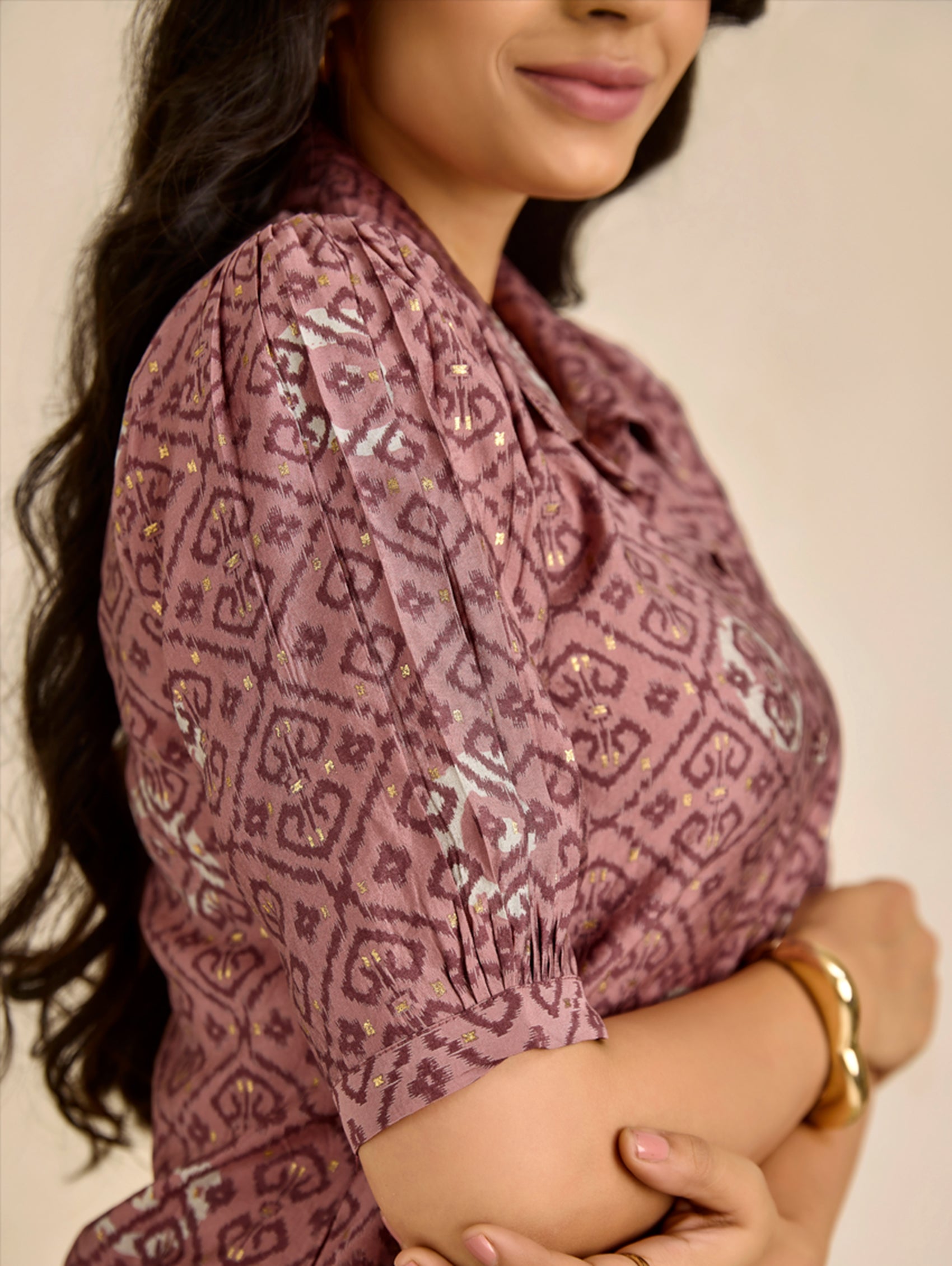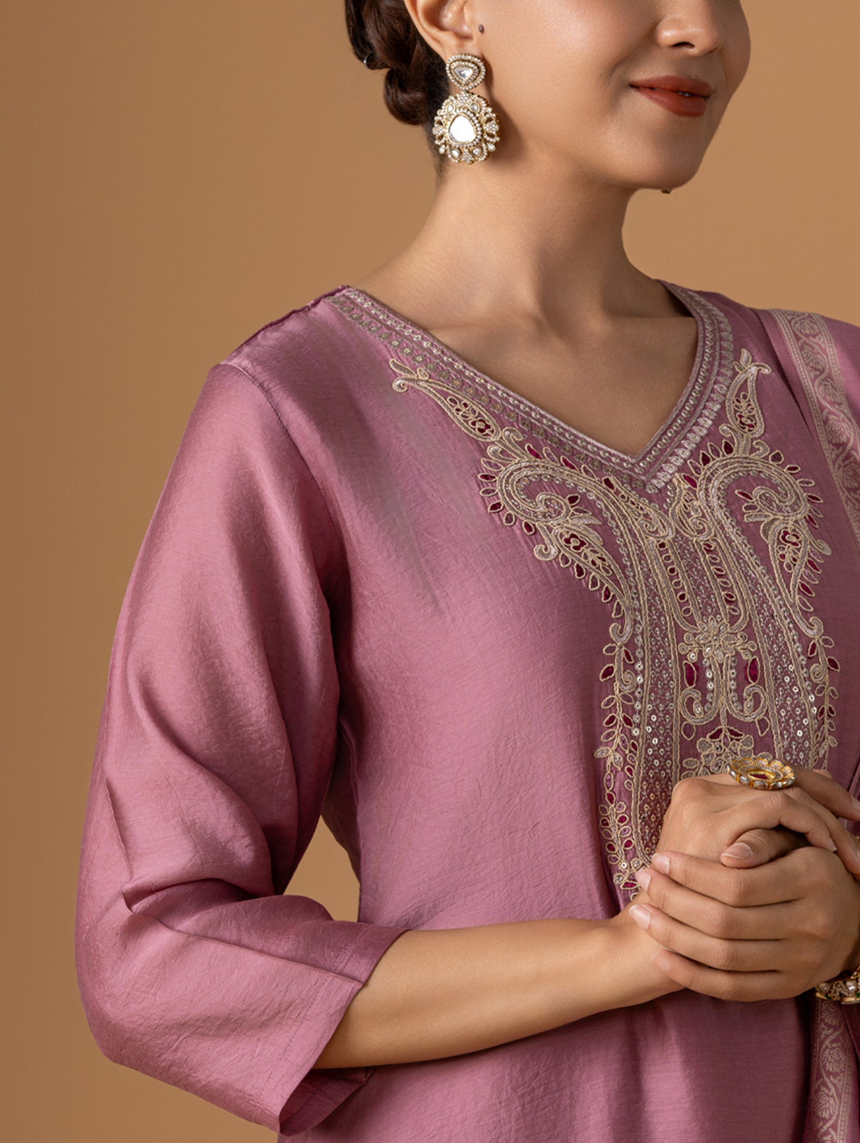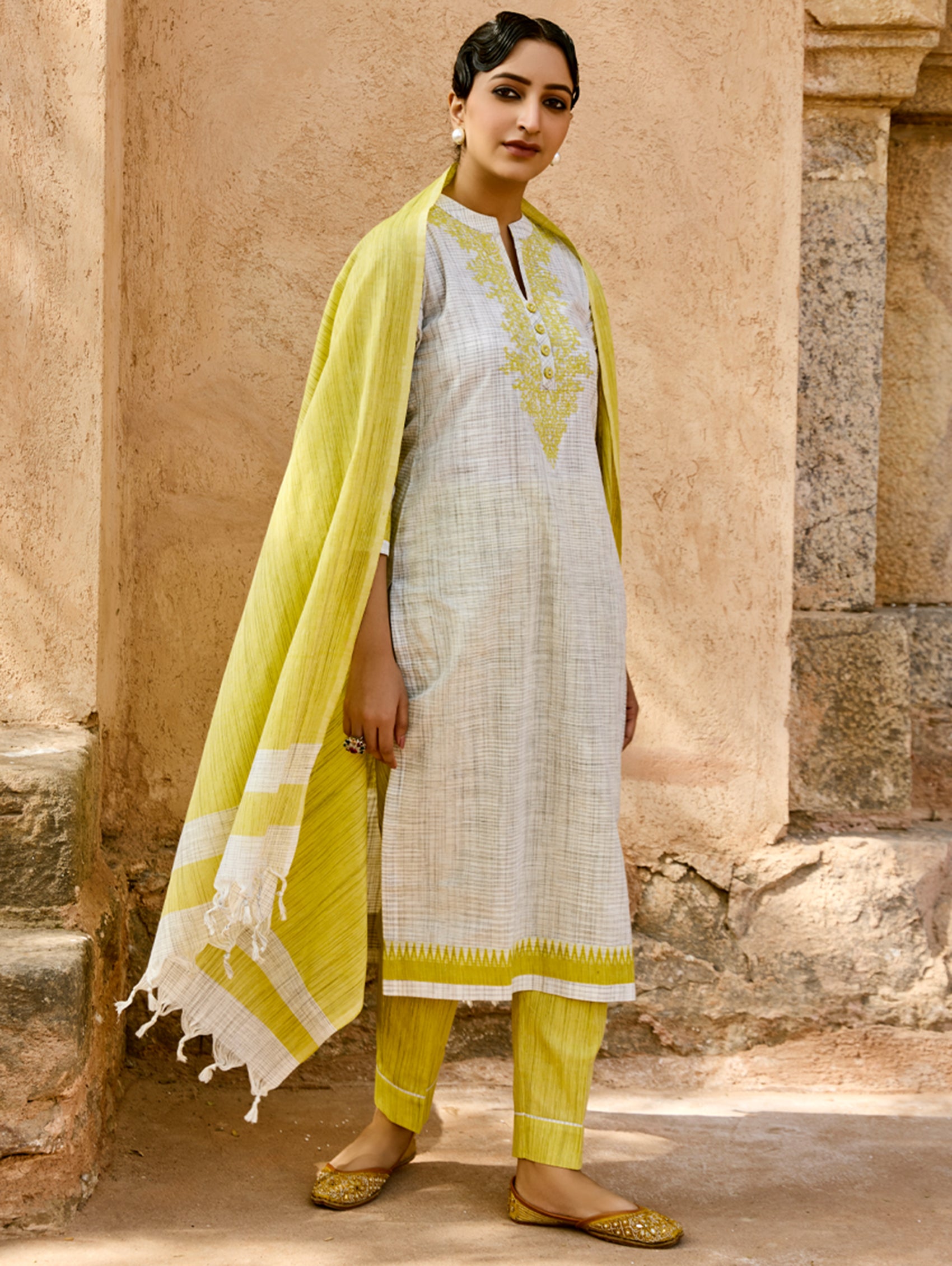 • Short Kurti with mandarin collar, three-fourth sleeves, and side slits open
