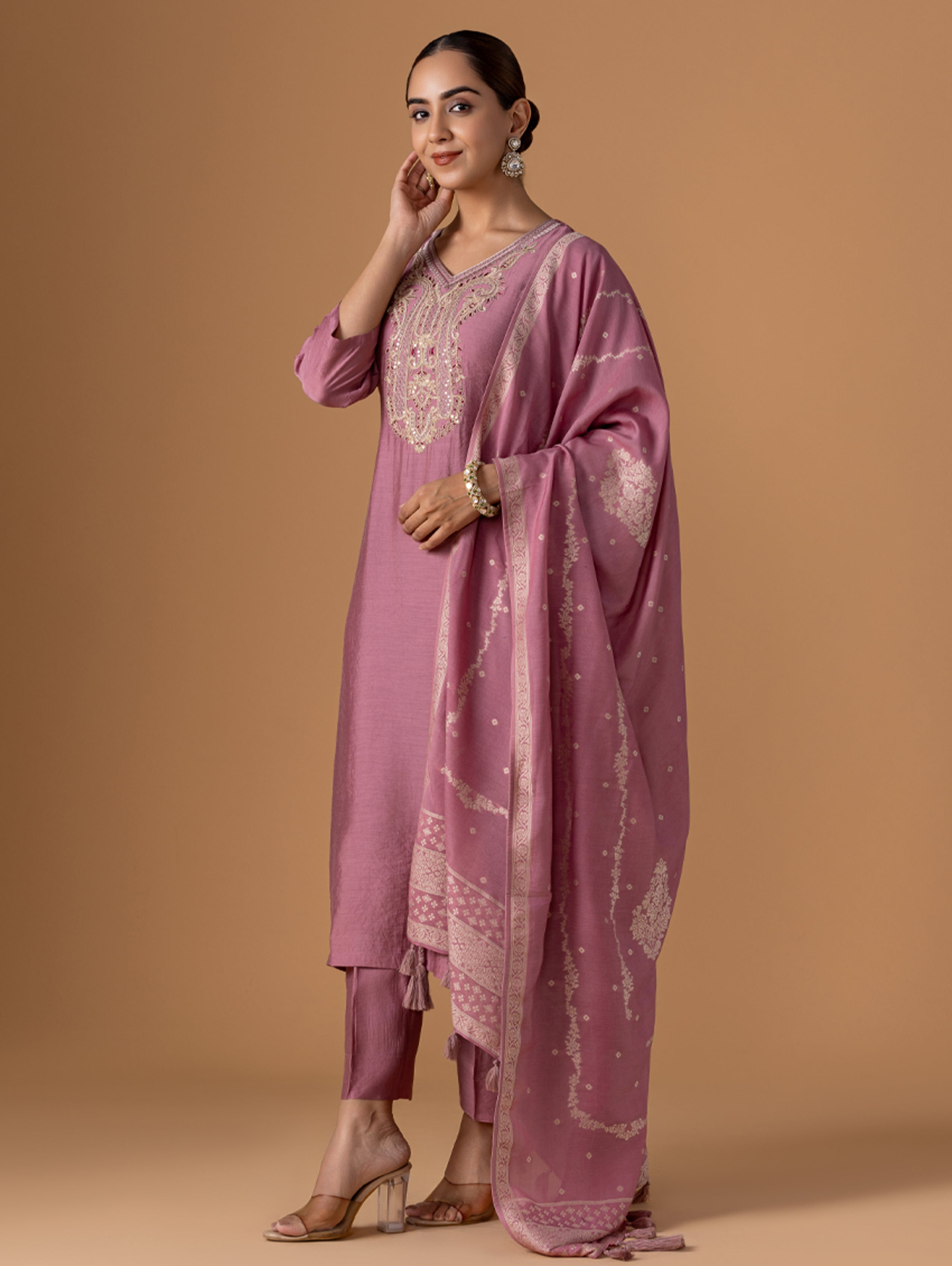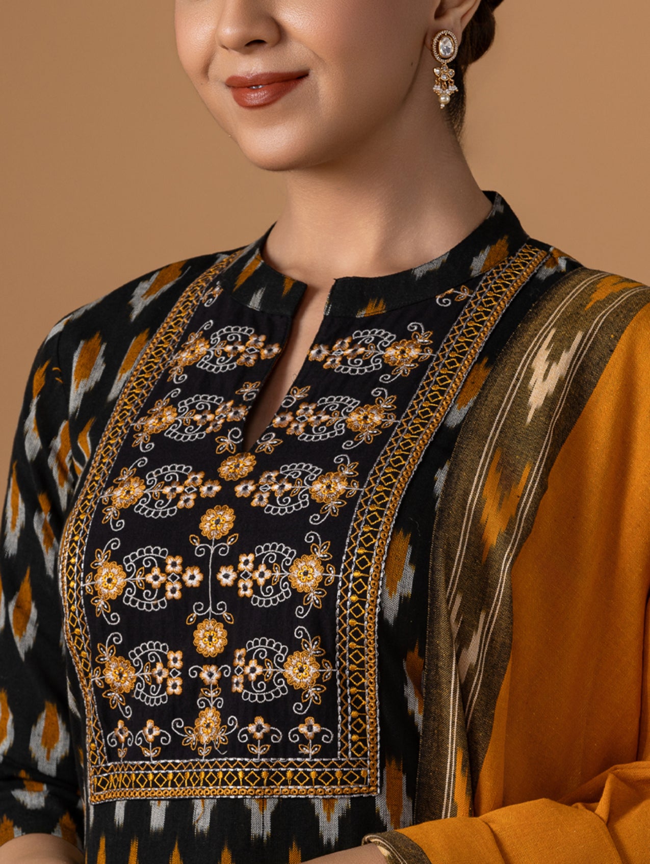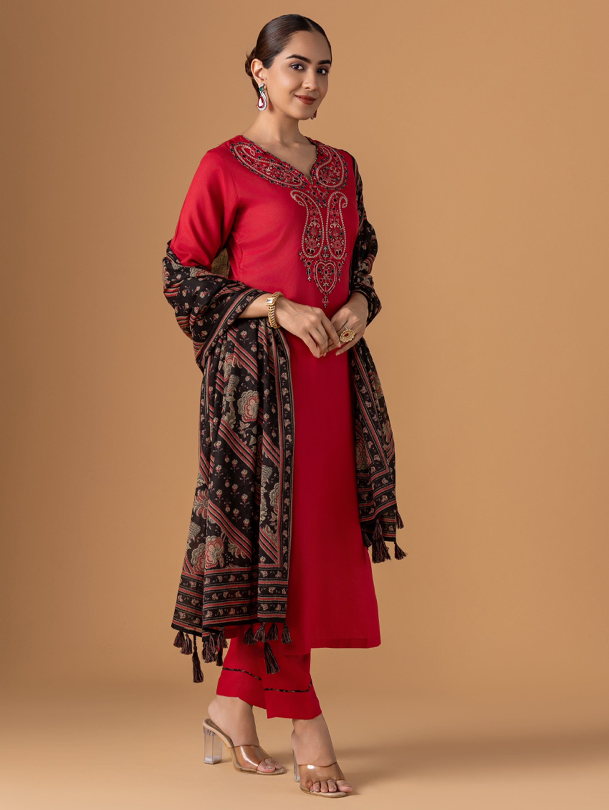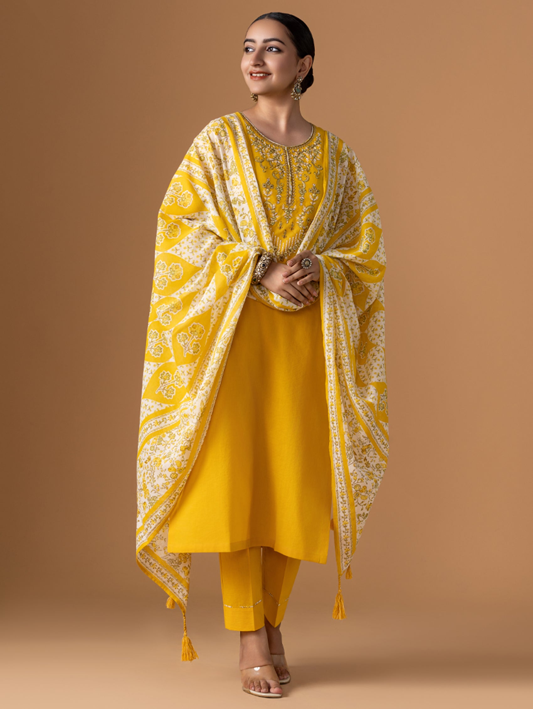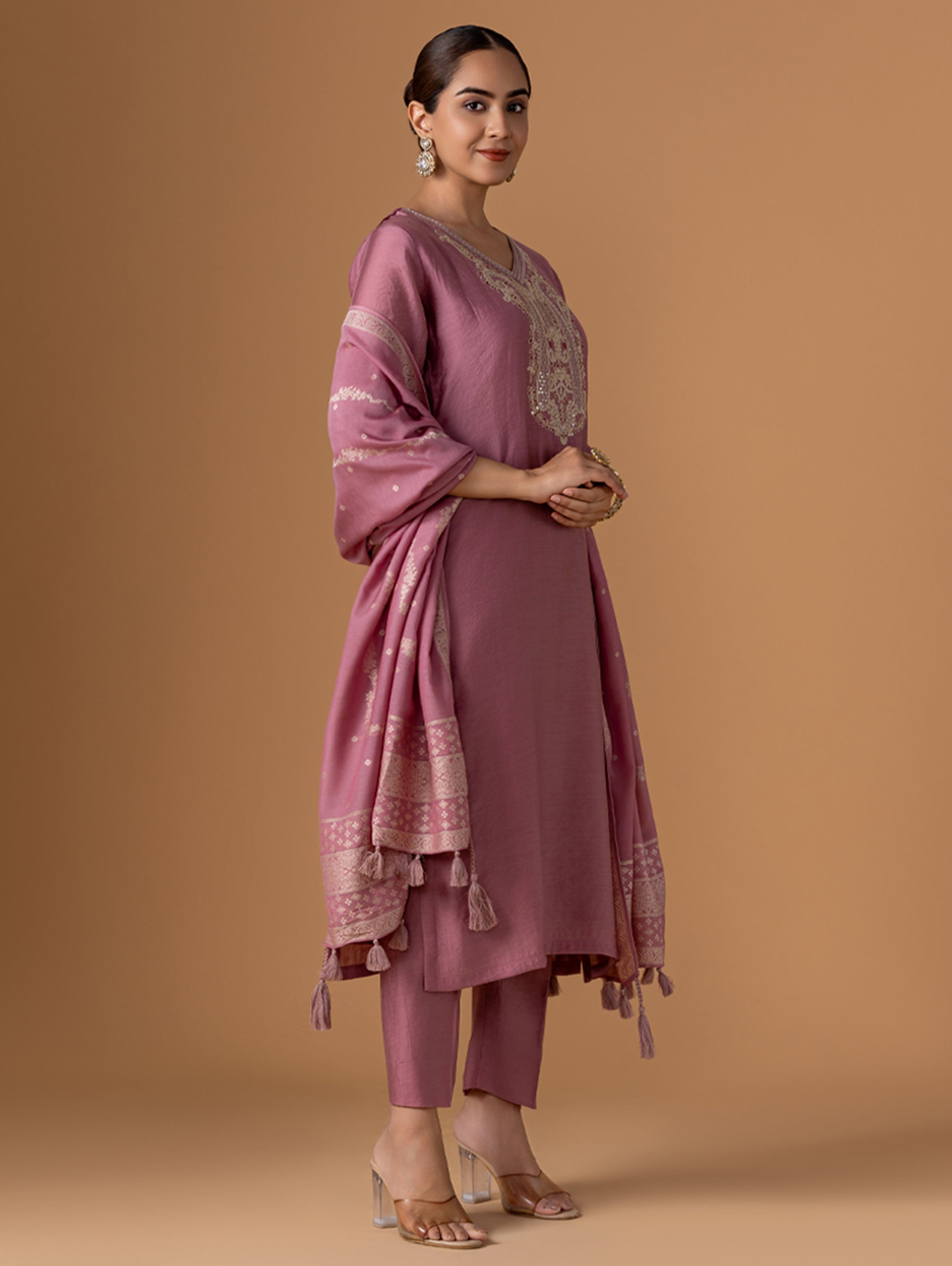 • Short Kurti with mandarin collar, three-fourth sleeves, and side slits open