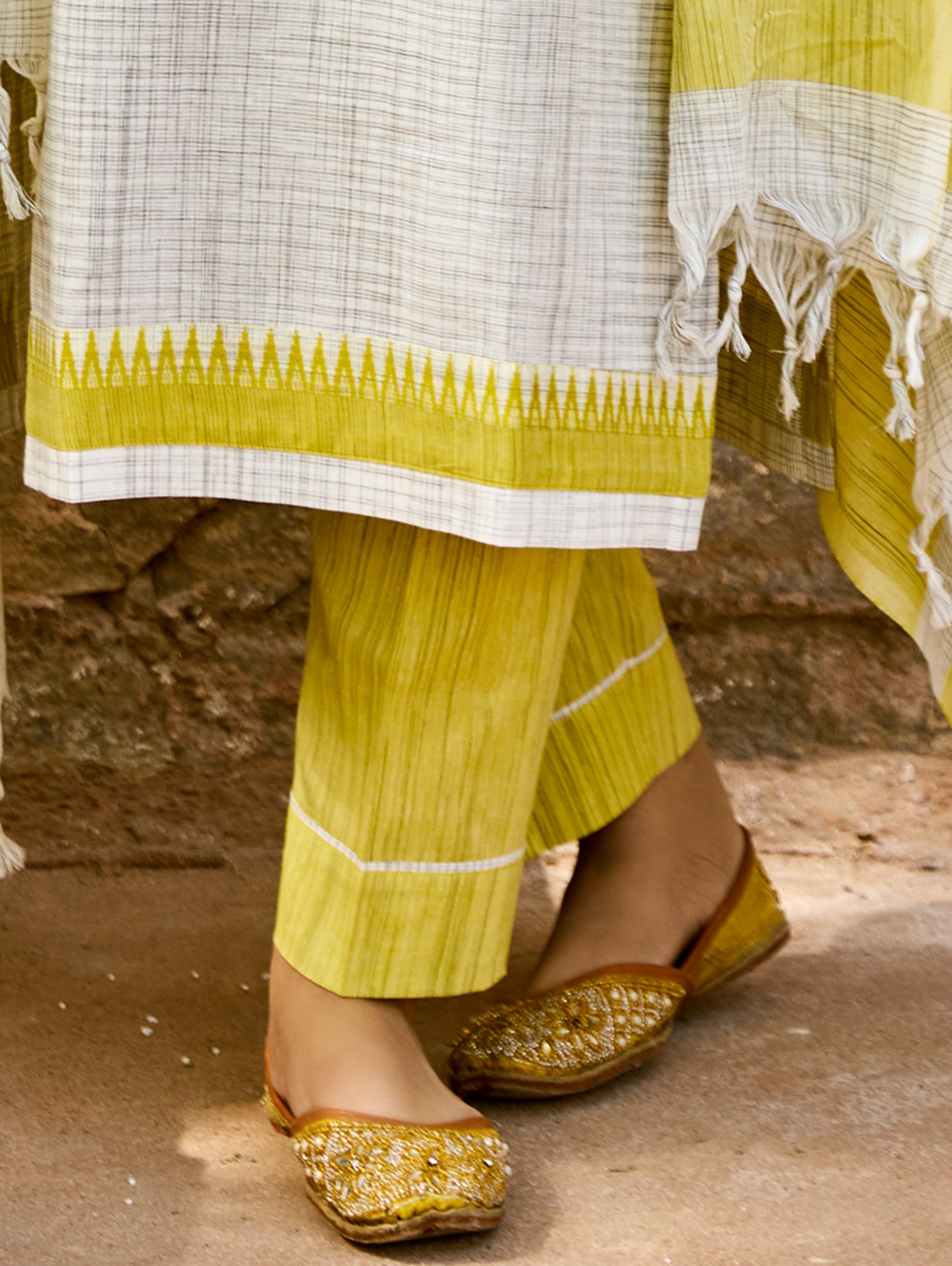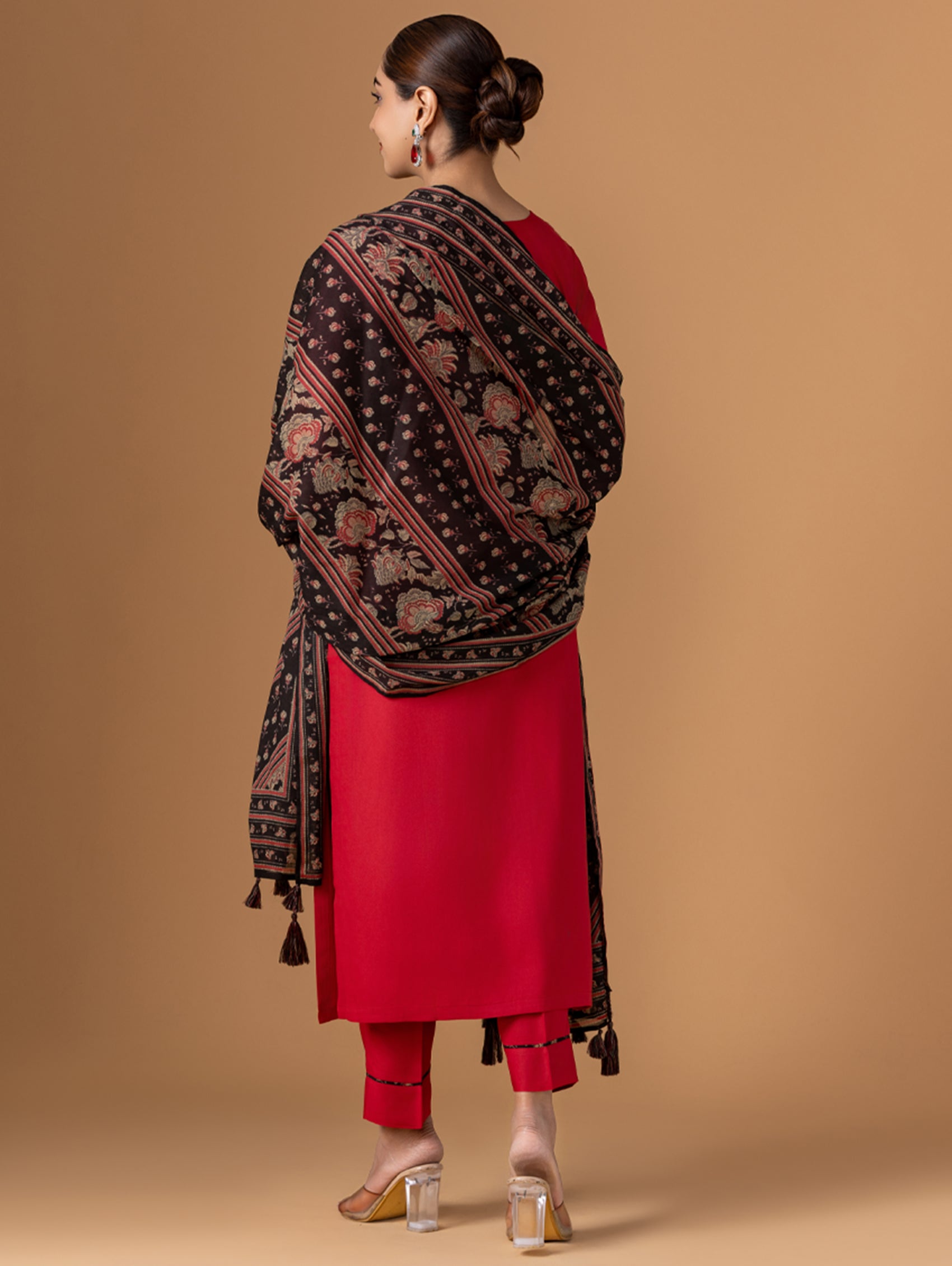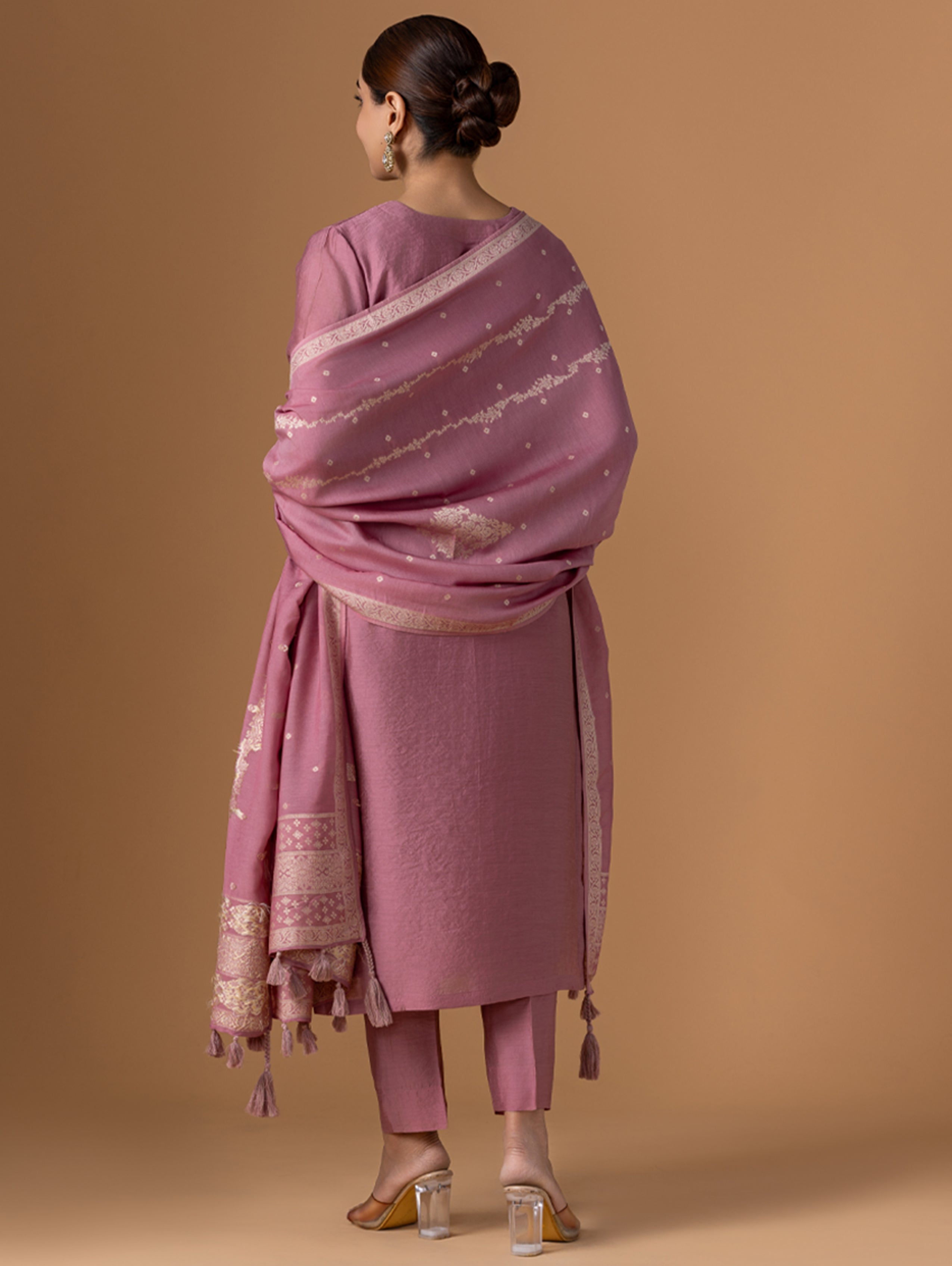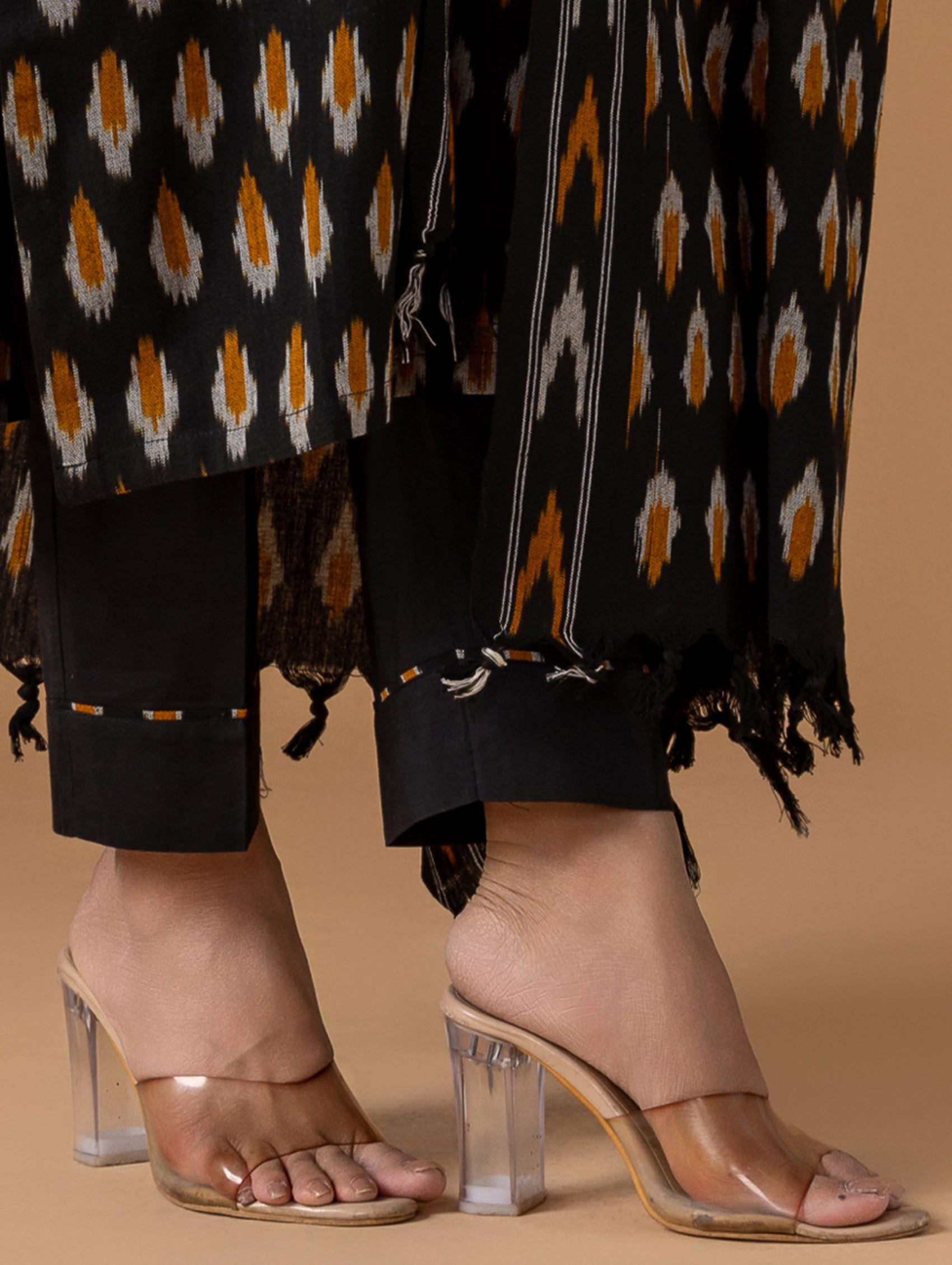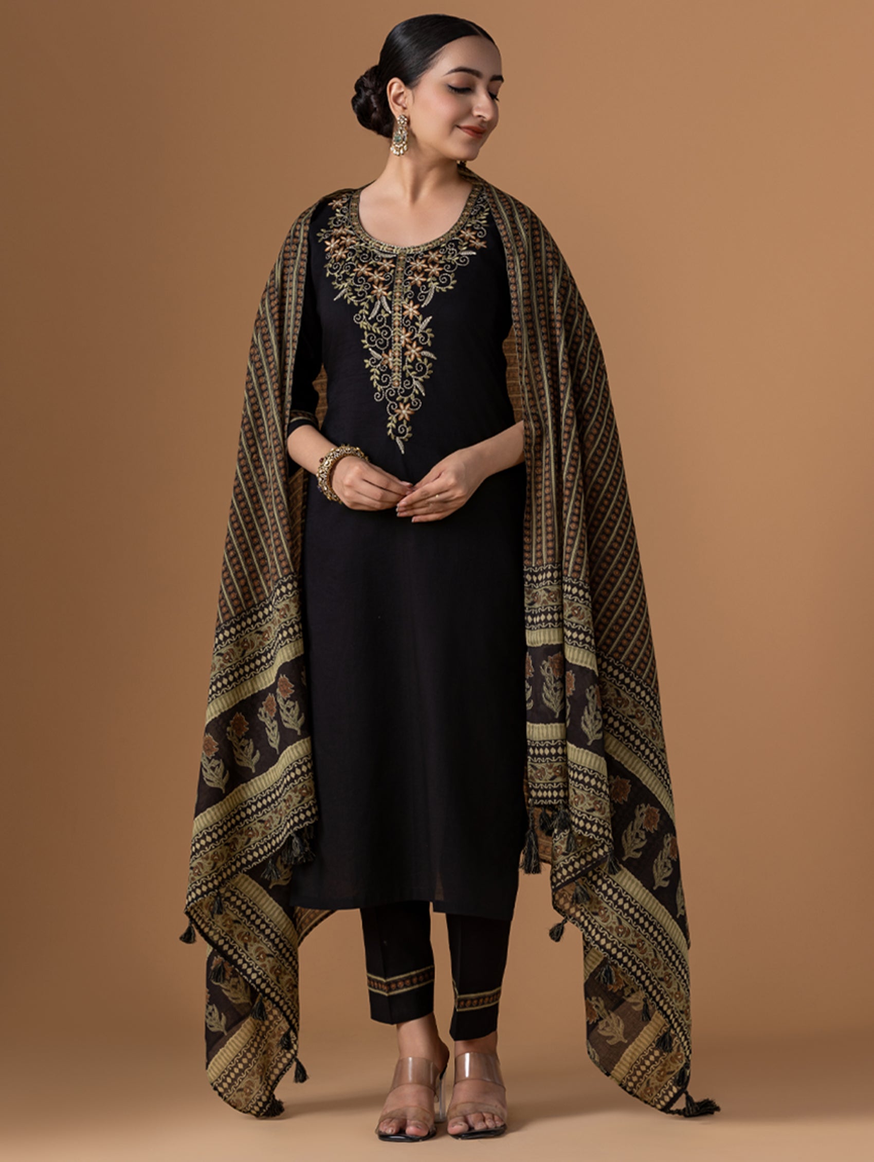 • Short Kurti with mandarin collar, three-fourth sleeves, and side slits open