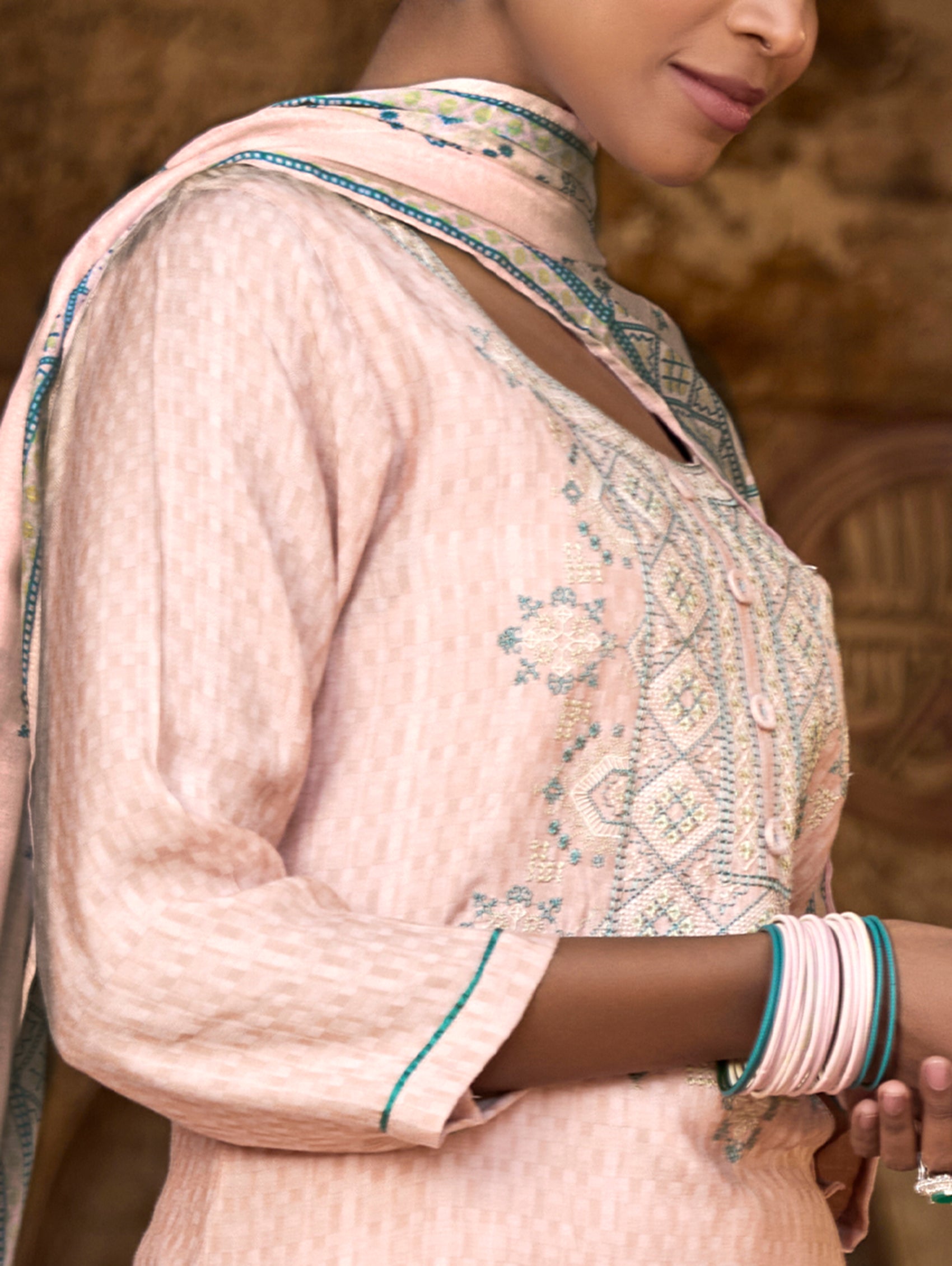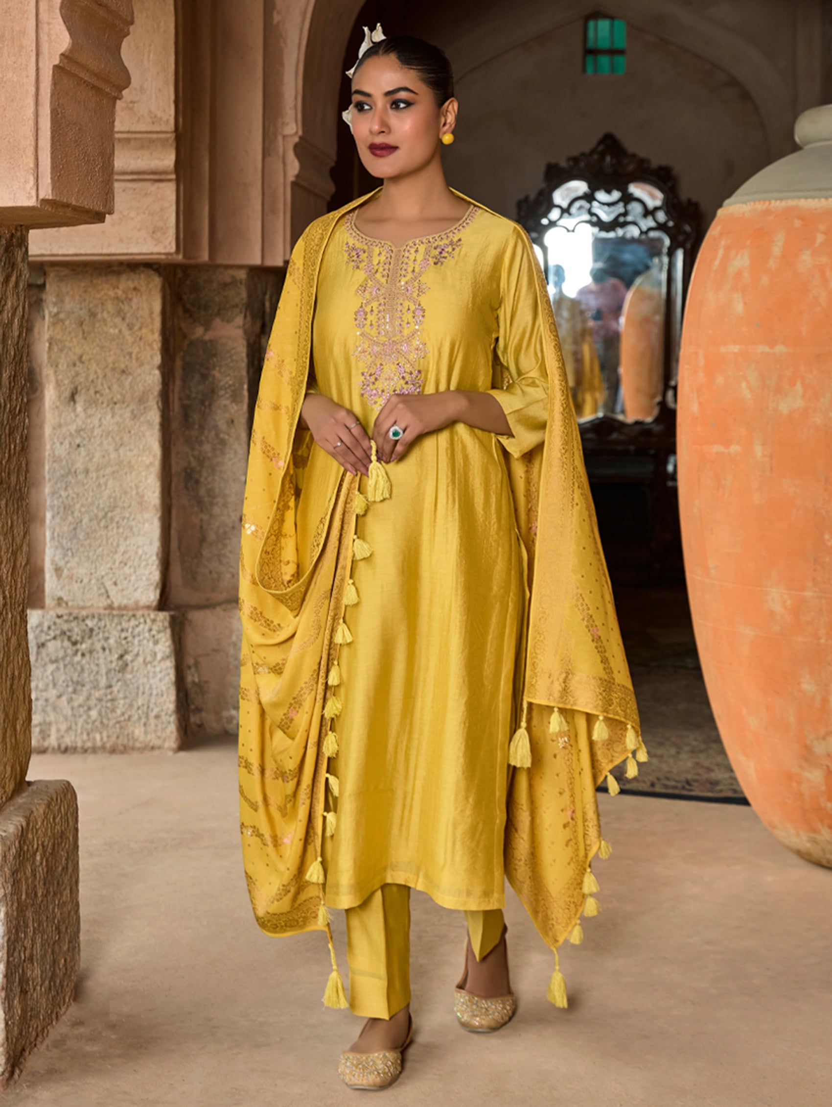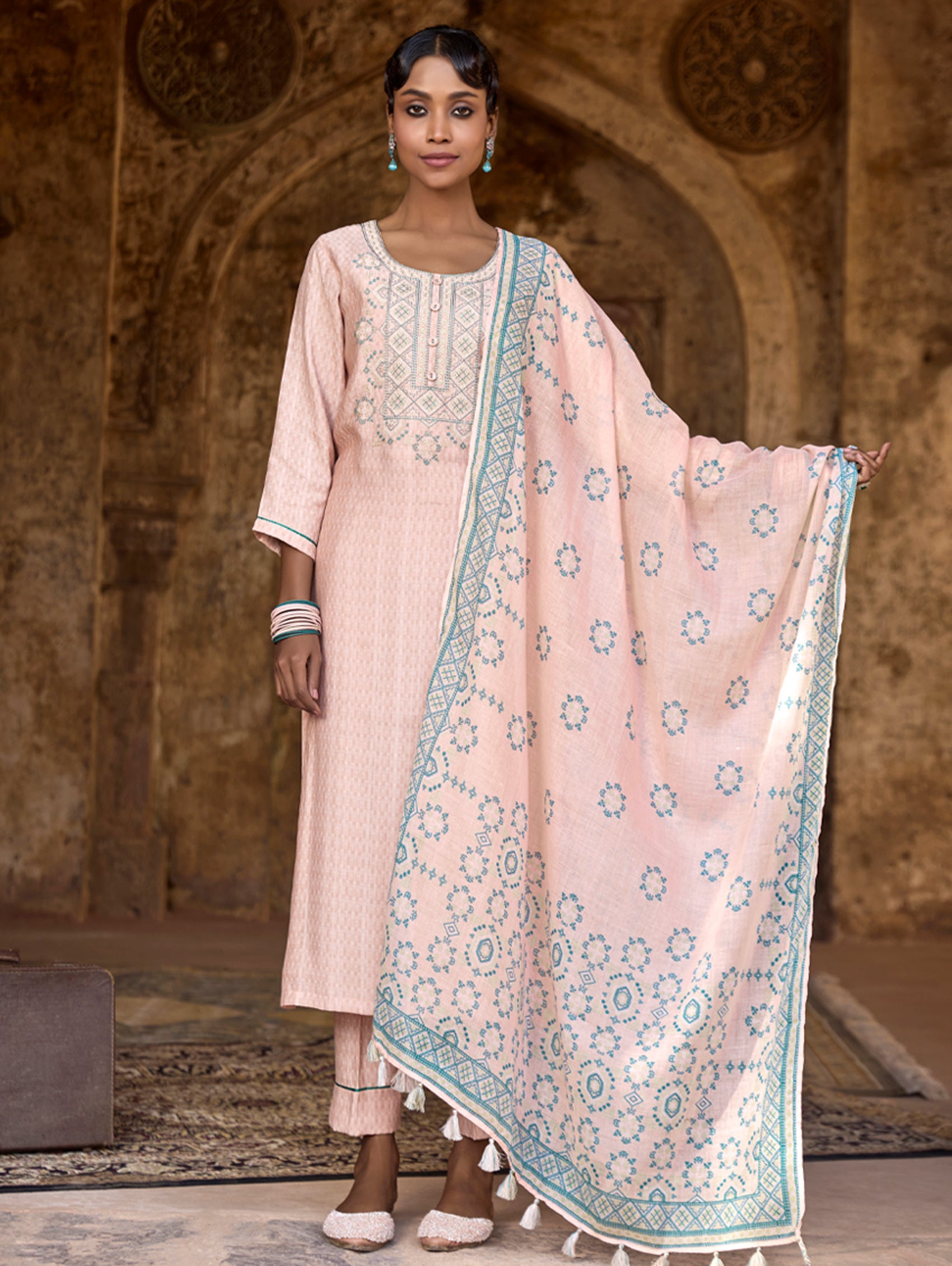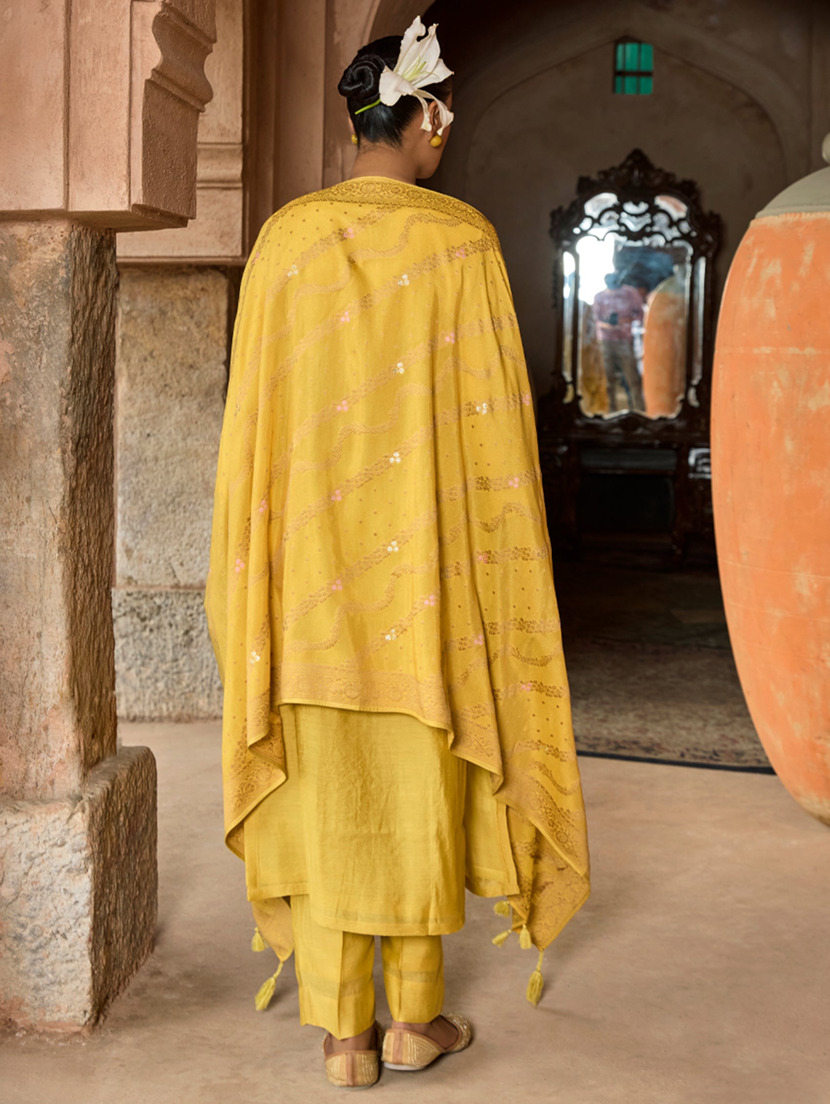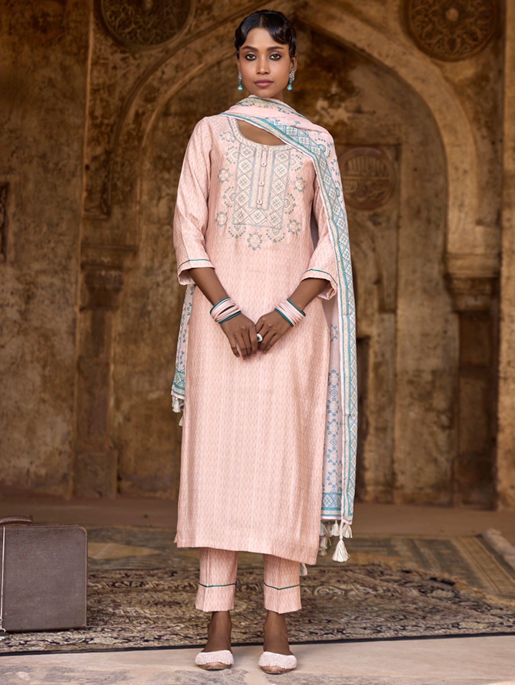 • Short Kurti with mandarin collar, three-fourth sleeves, and side slits open