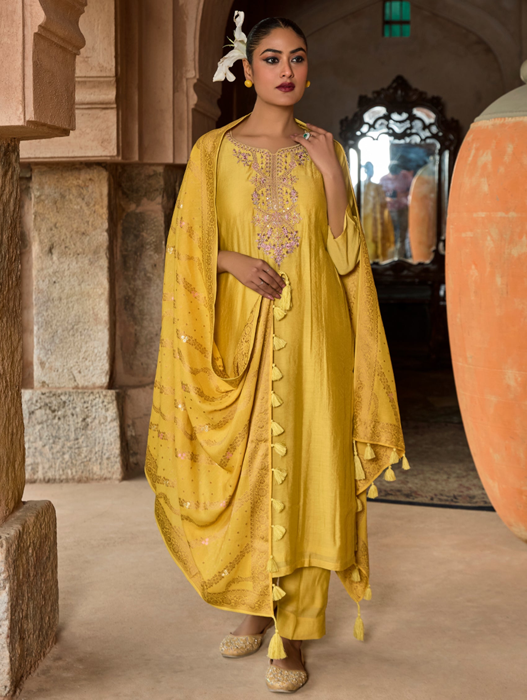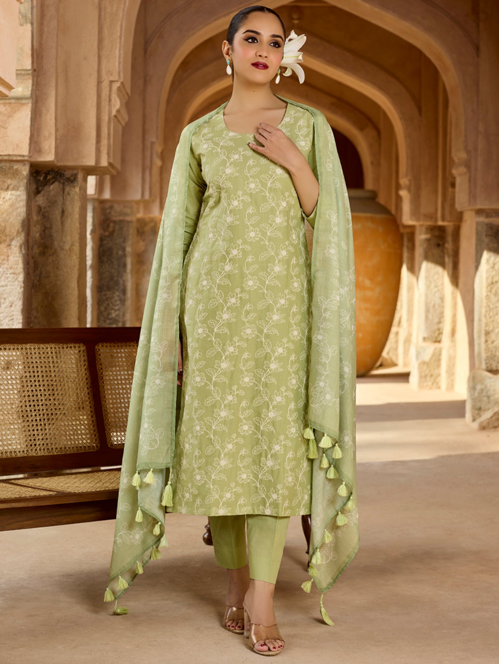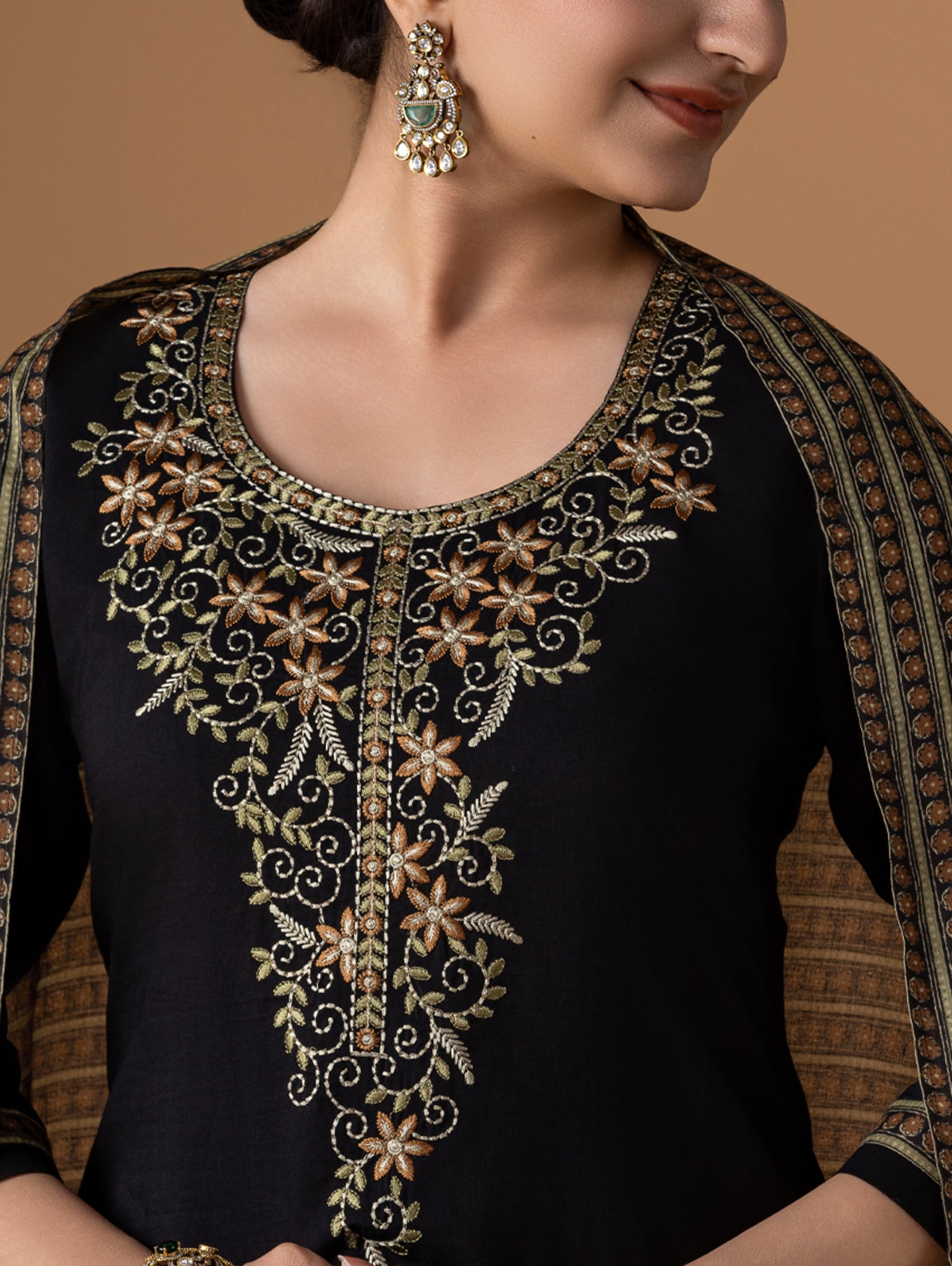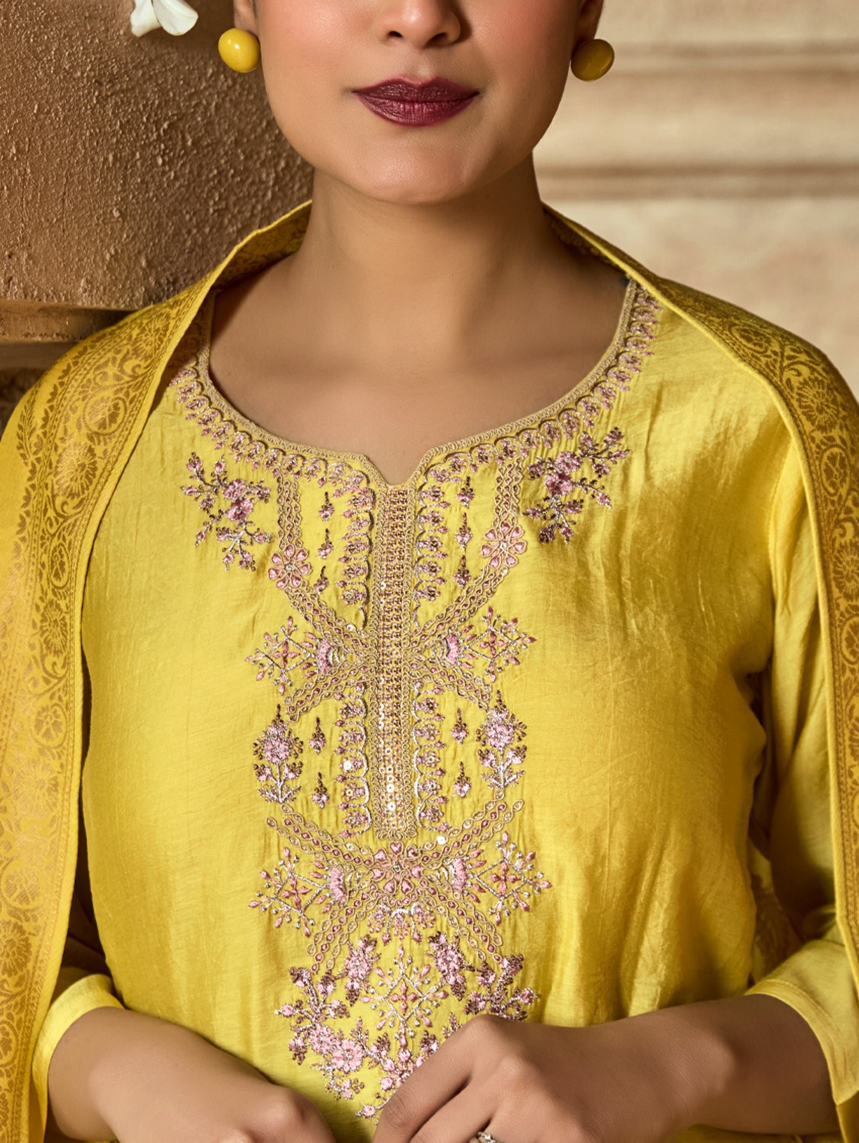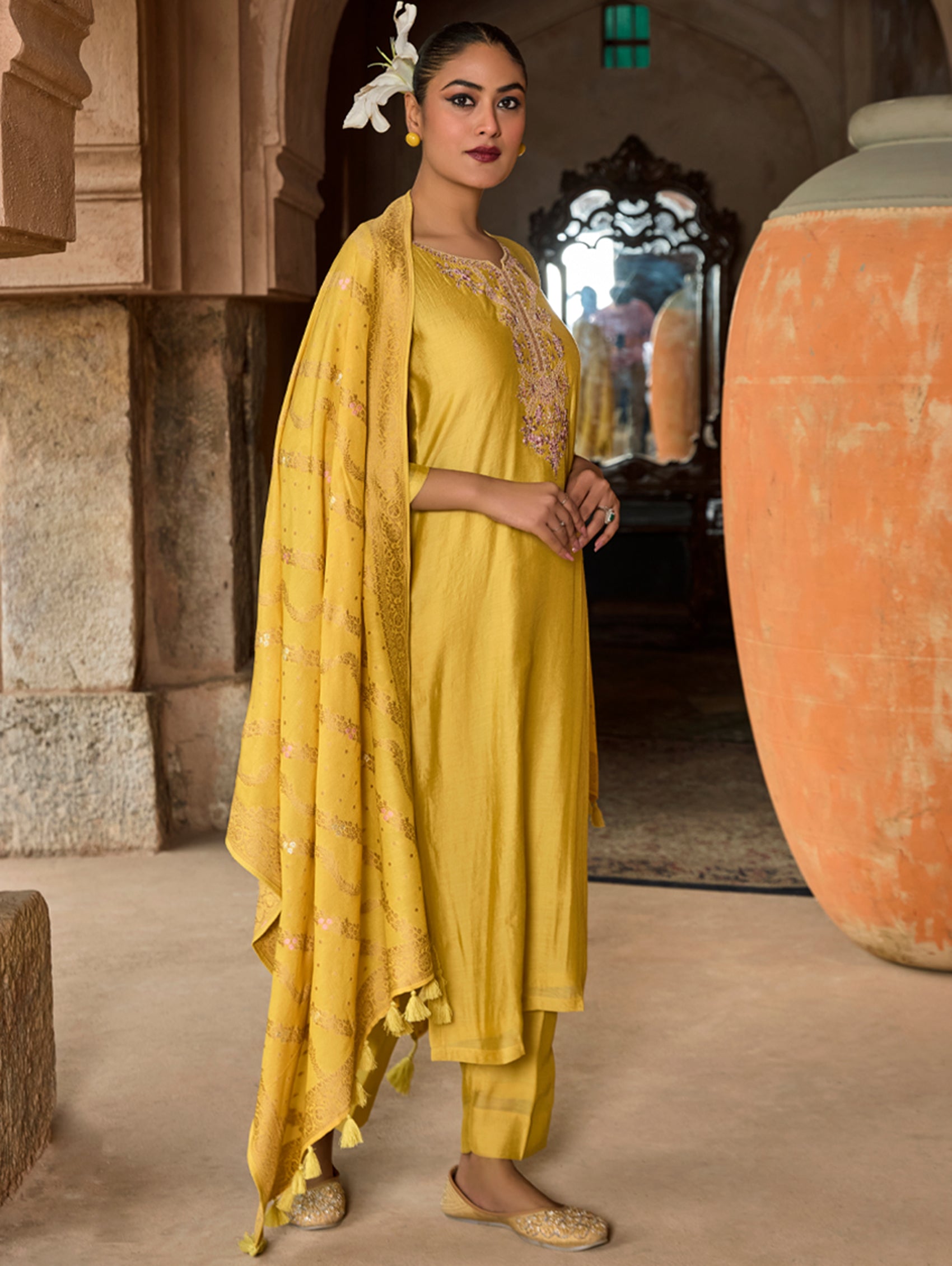 • Short Kurti with mandarin collar, three-fourth sleeves, and side slits open