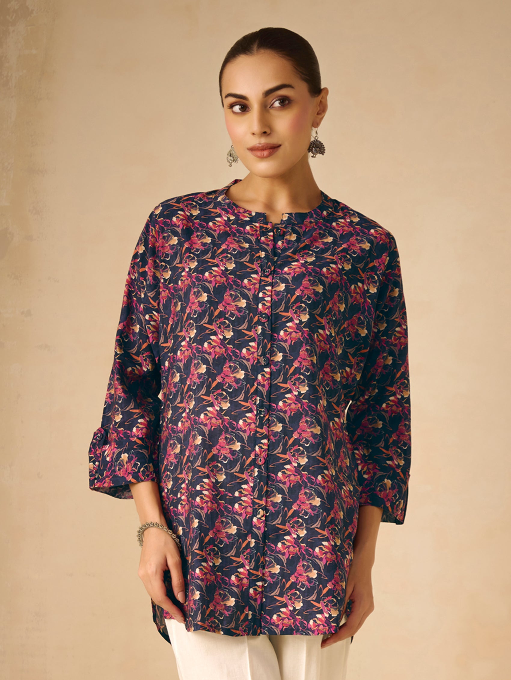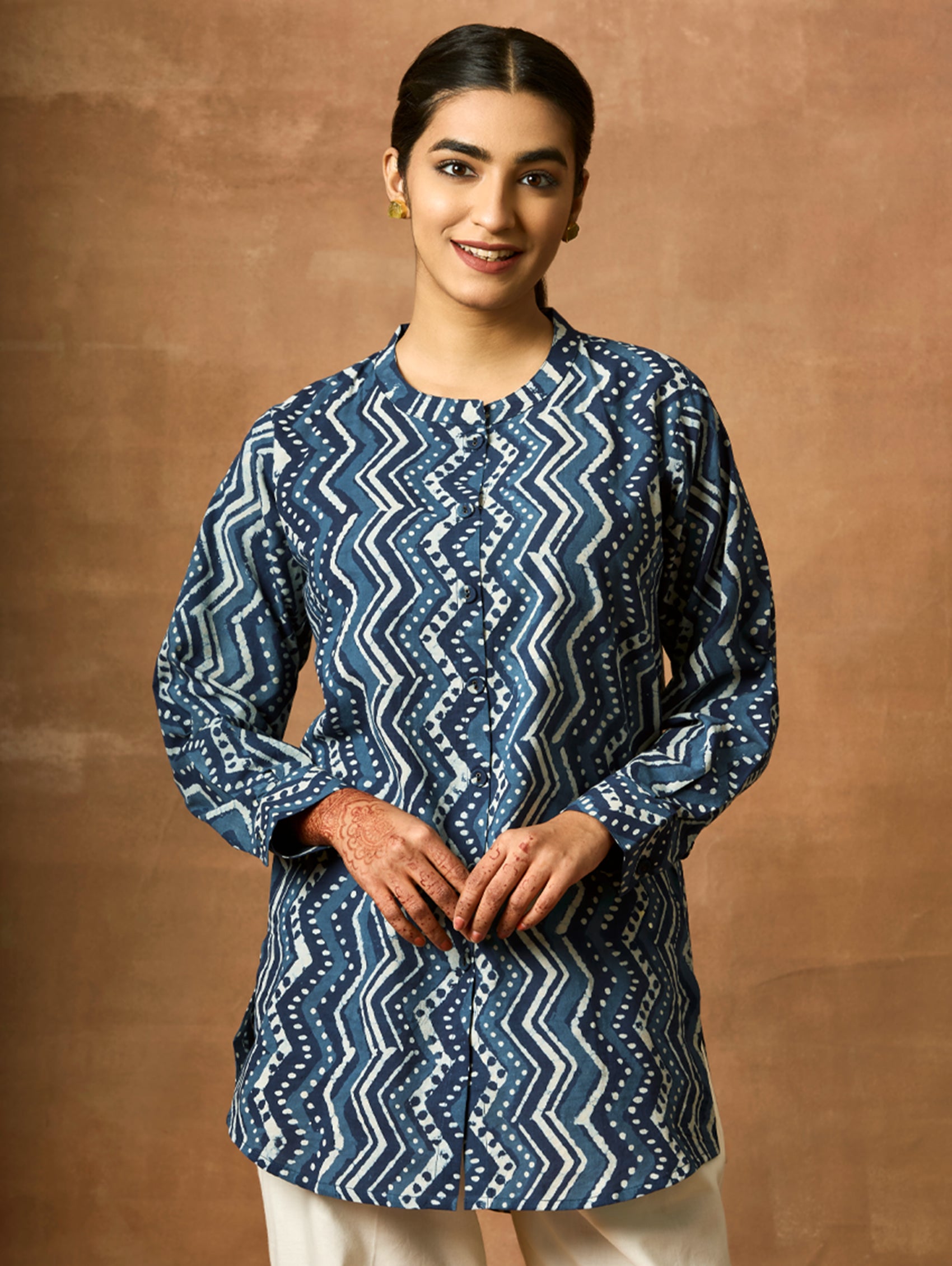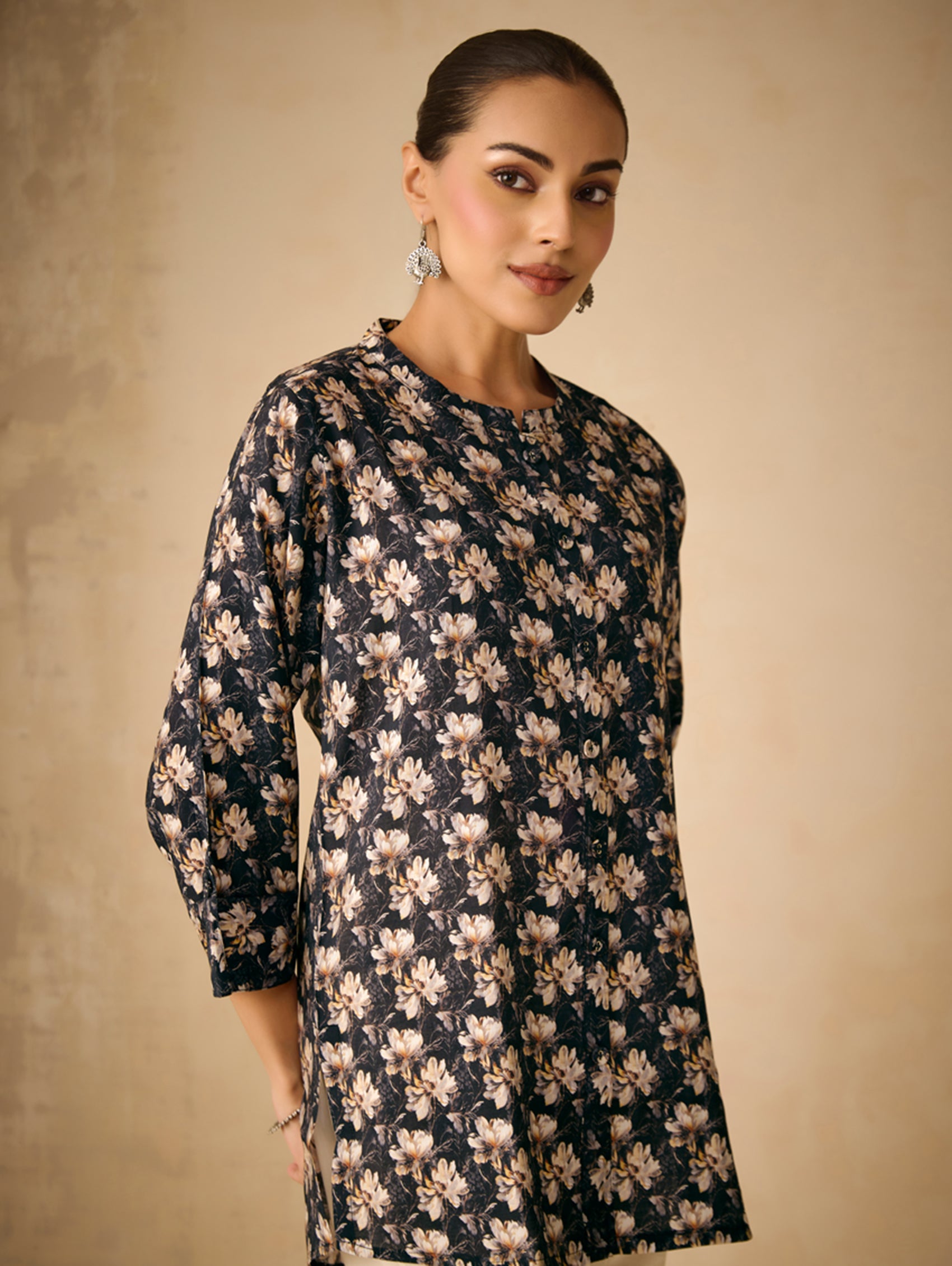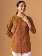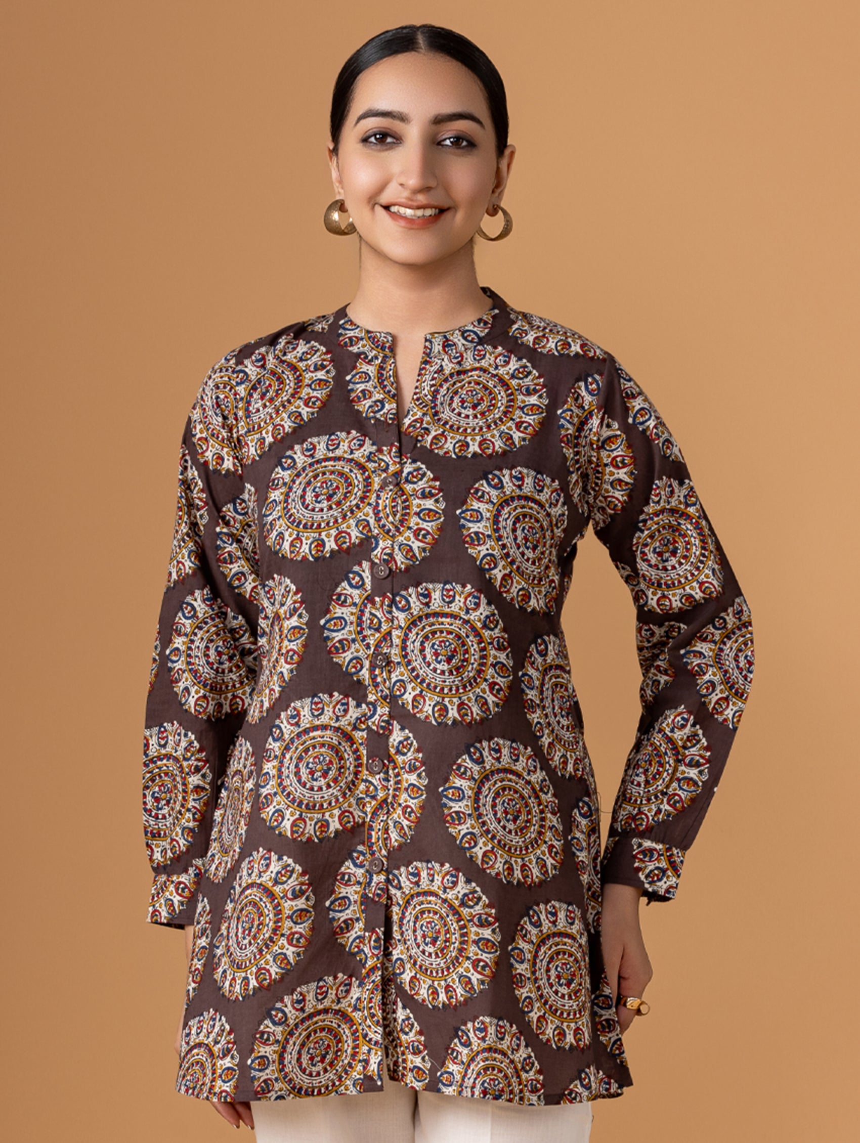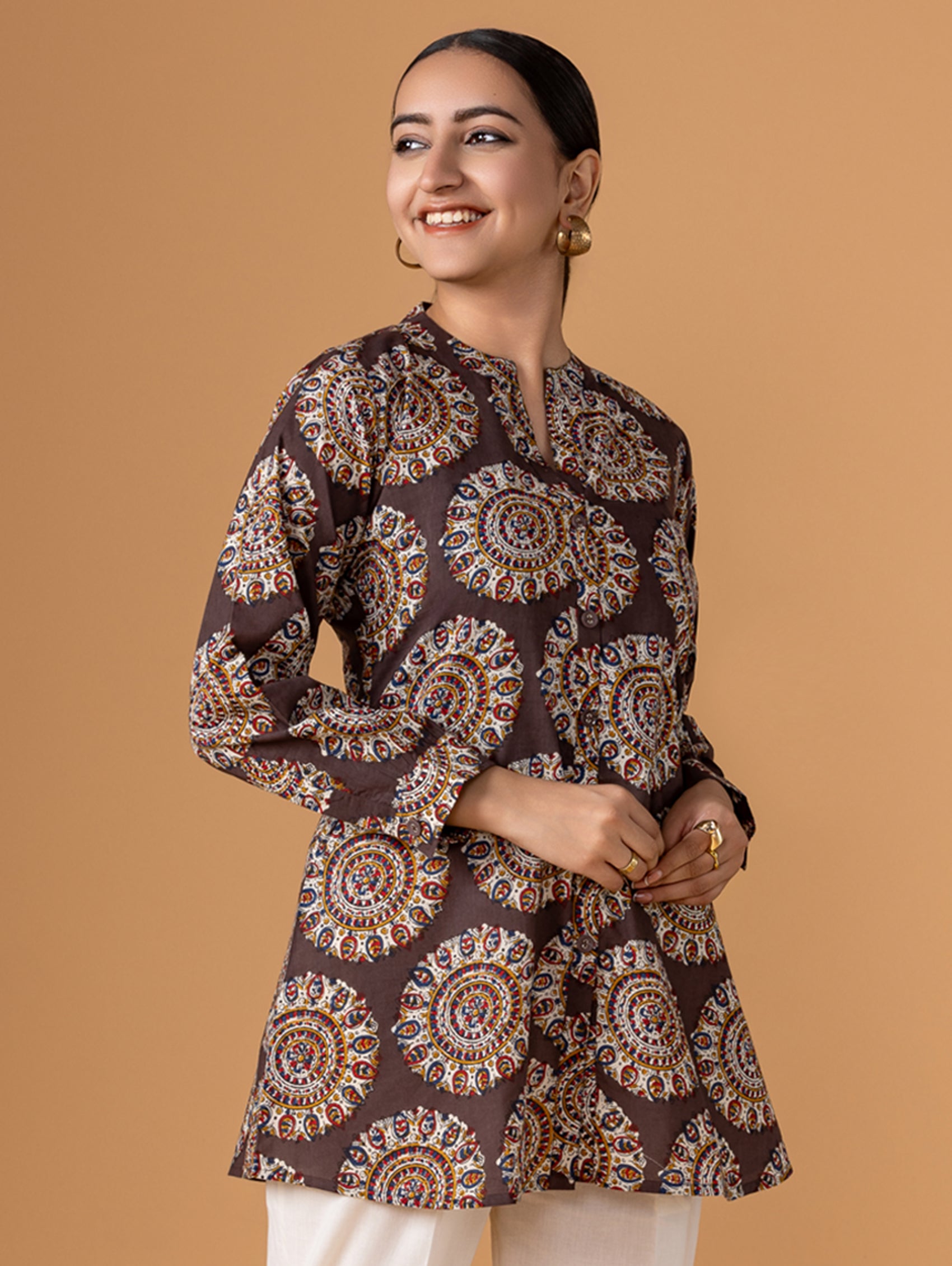 Discover our newest addition—a beautifully printed pure cotton short kurti featuring a mandarin collar, three-fourth sleeves, and stylish open side slits. This finely tailored kurta exudes sophistication and charm. Elevate your wardrobe with this must-have piece!