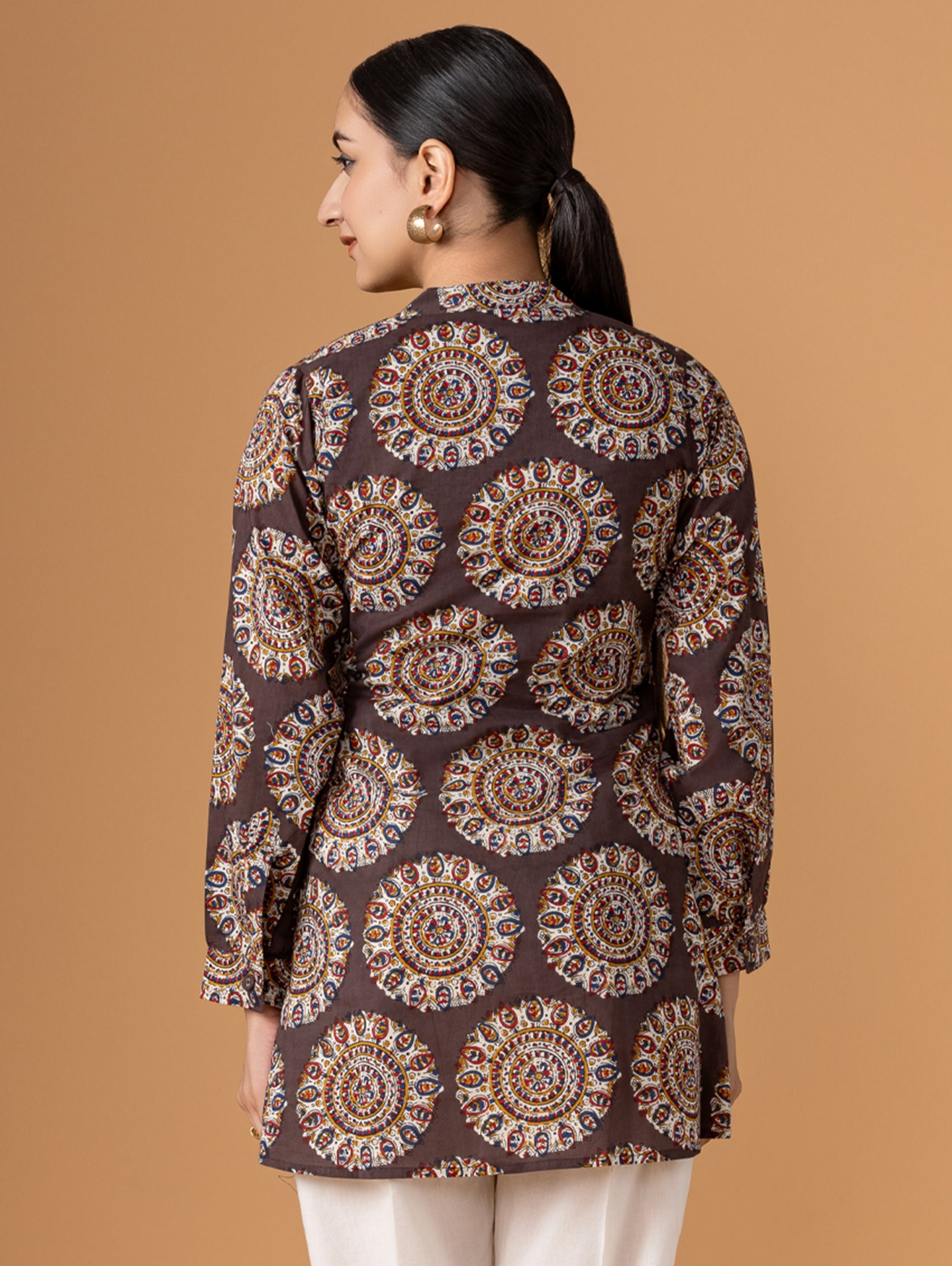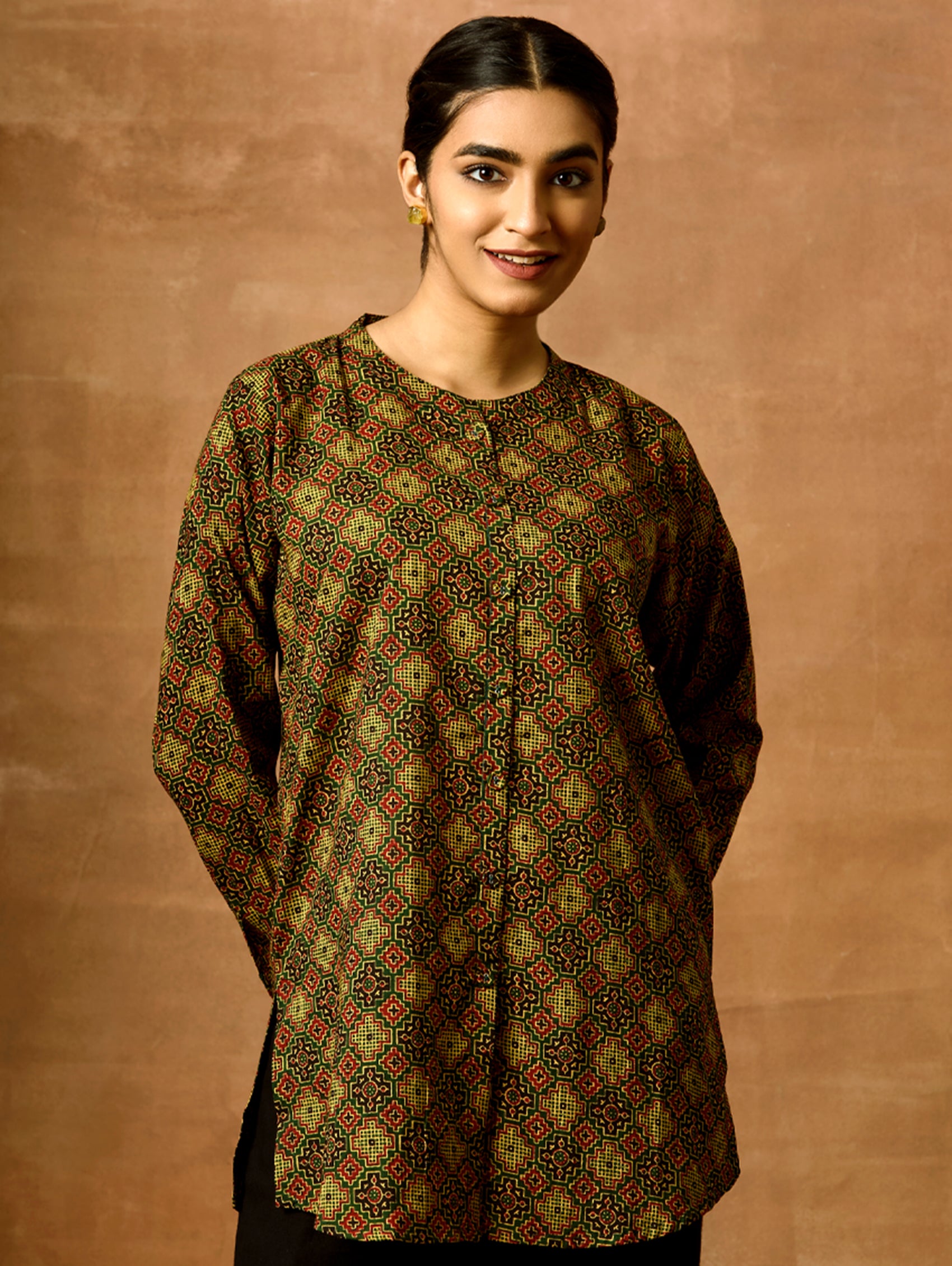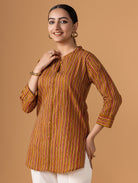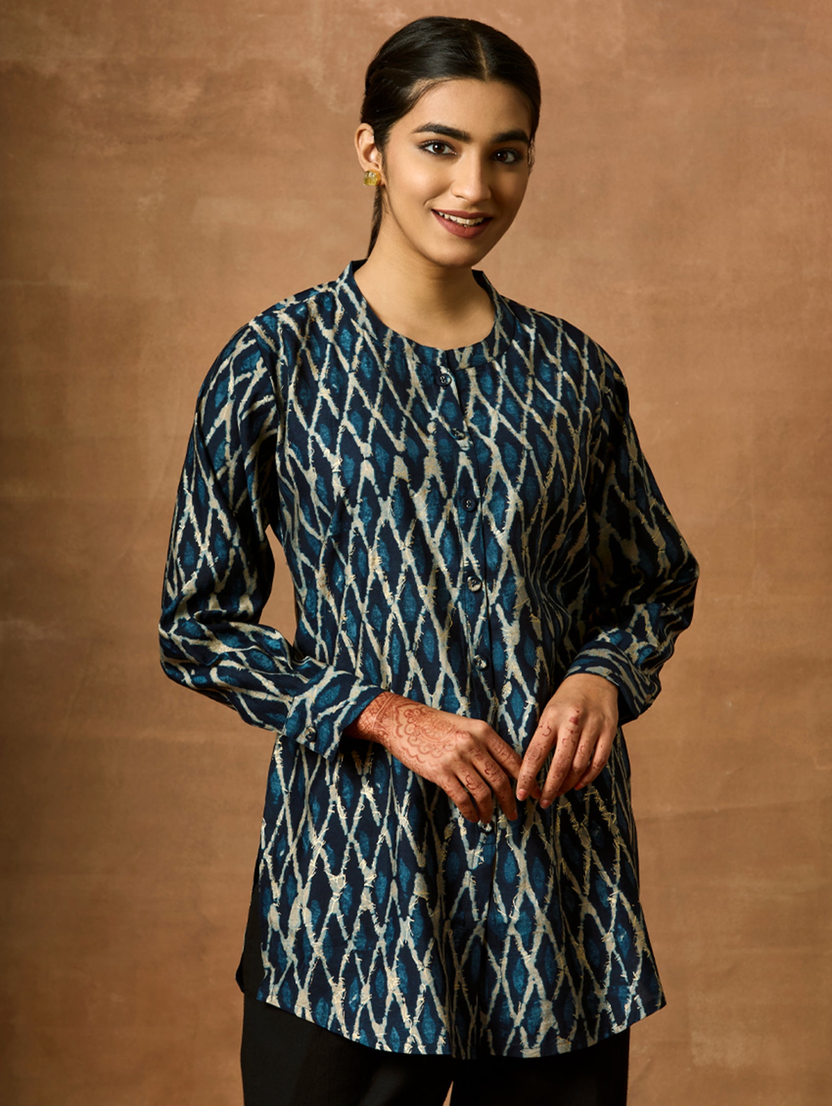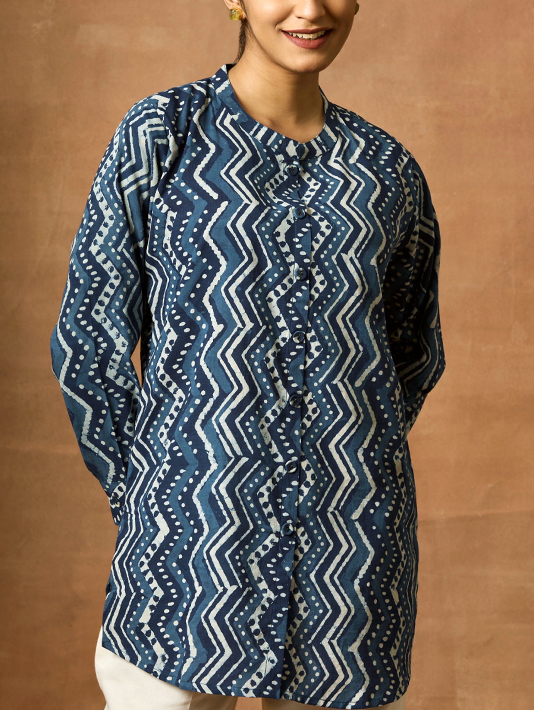 Discover our newest addition—a beautifully printed pure cotton short kurti featuring a mandarin collar, three-fourth sleeves, and stylish open side slits. This finely tailored kurta exudes sophistication and charm. Elevate your wardrobe with this must-have piece!