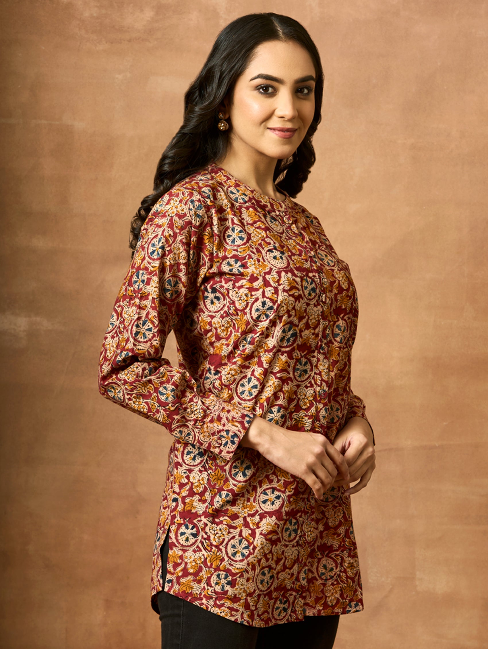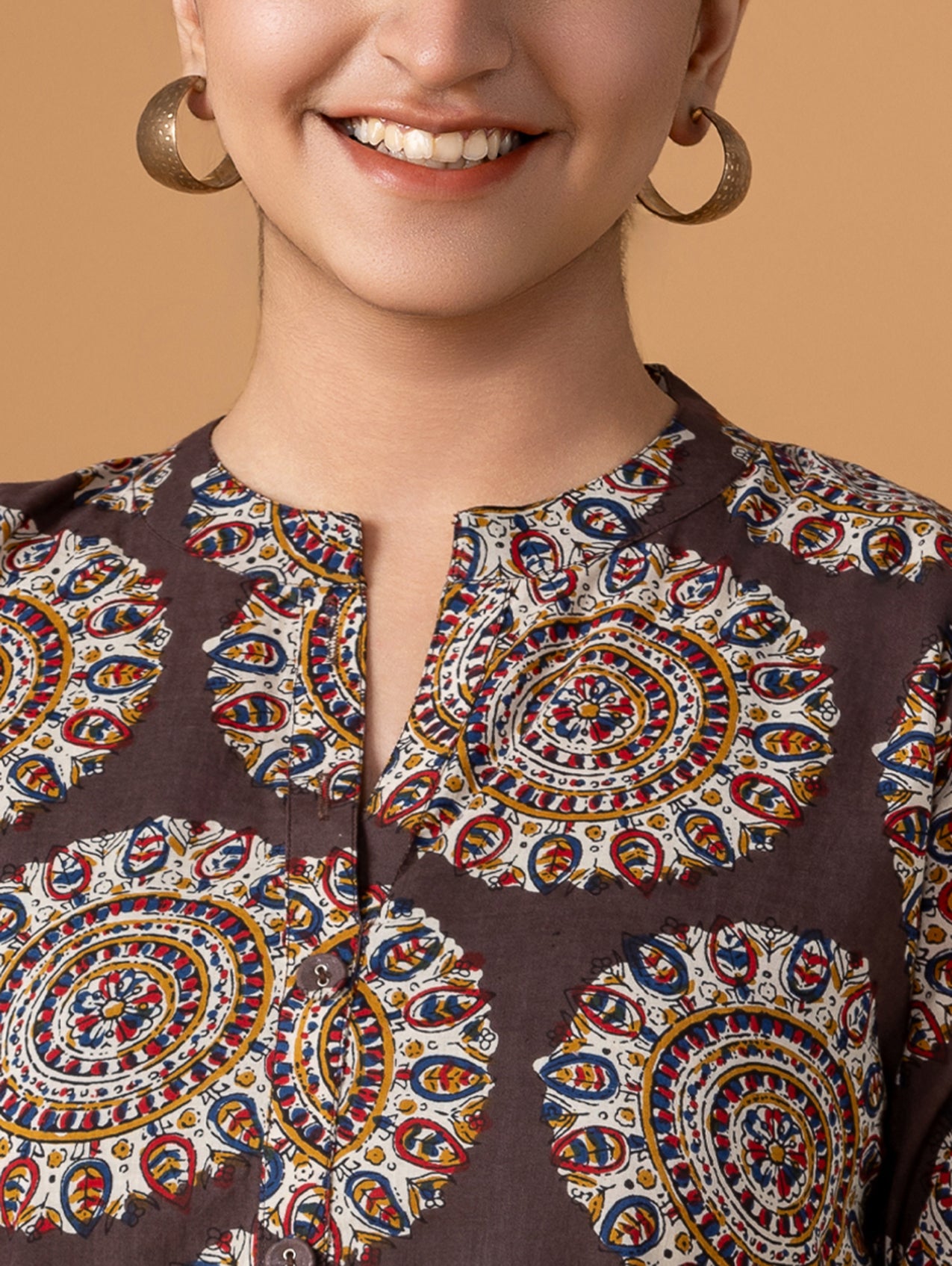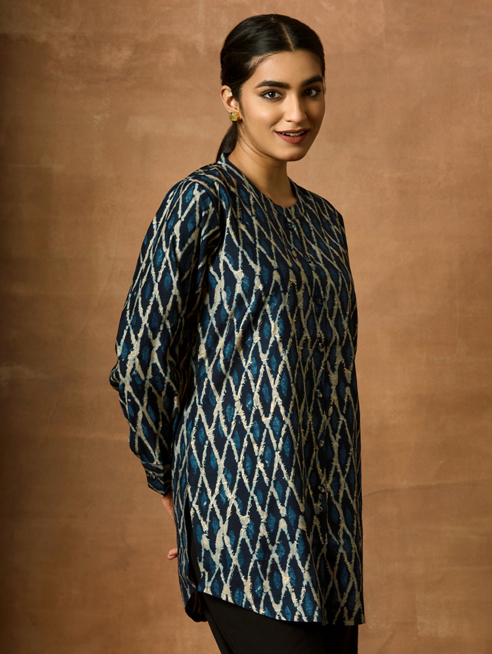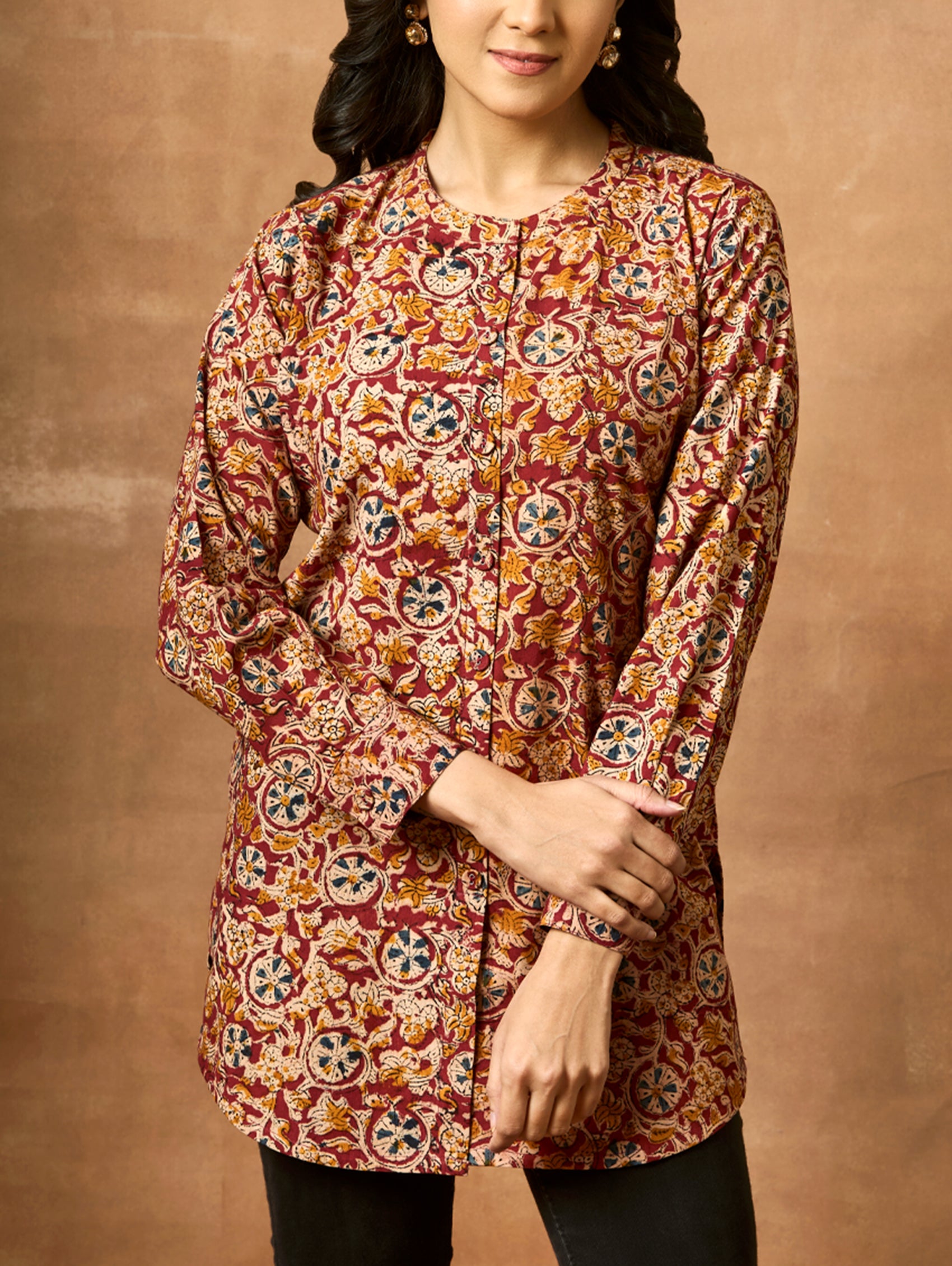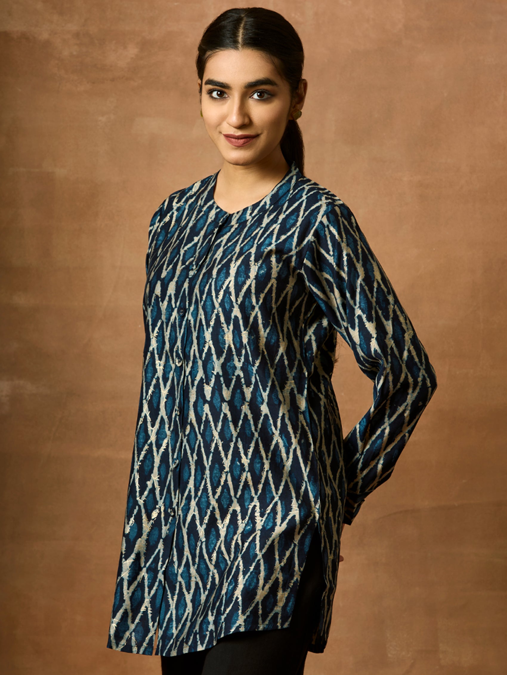 Discover our newest addition—a beautifully printed pure cotton short kurti featuring a mandarin collar, three-fourth sleeves, and stylish open side slits. This finely tailored kurta exudes sophistication and charm. Elevate your wardrobe with this must-have piece!