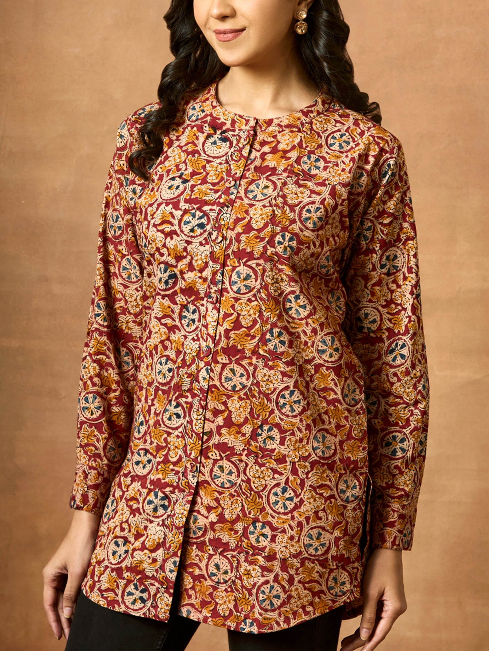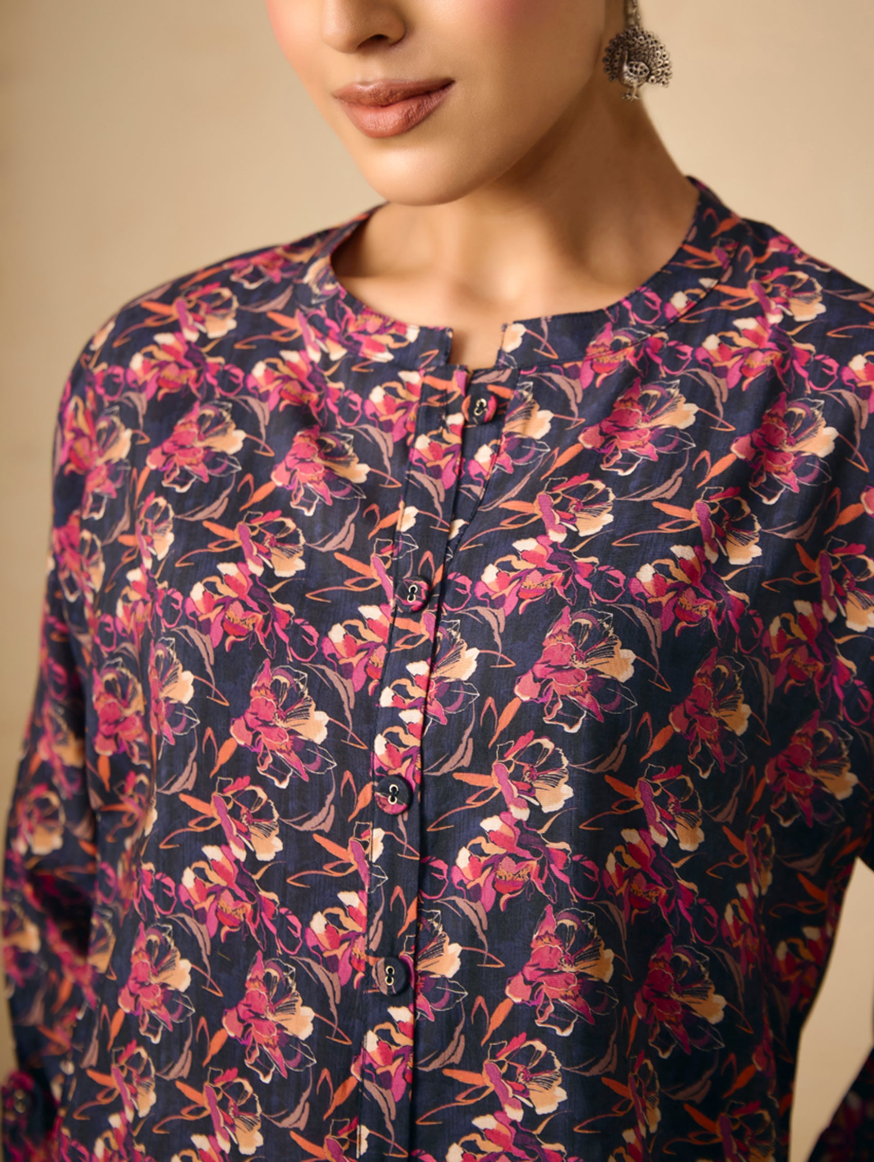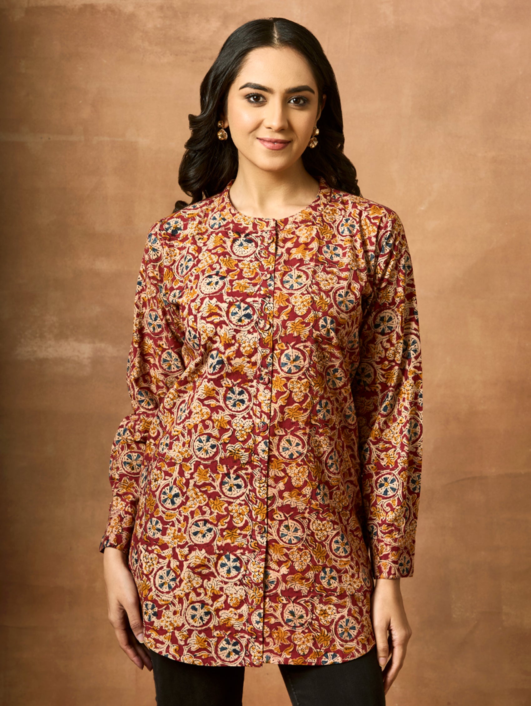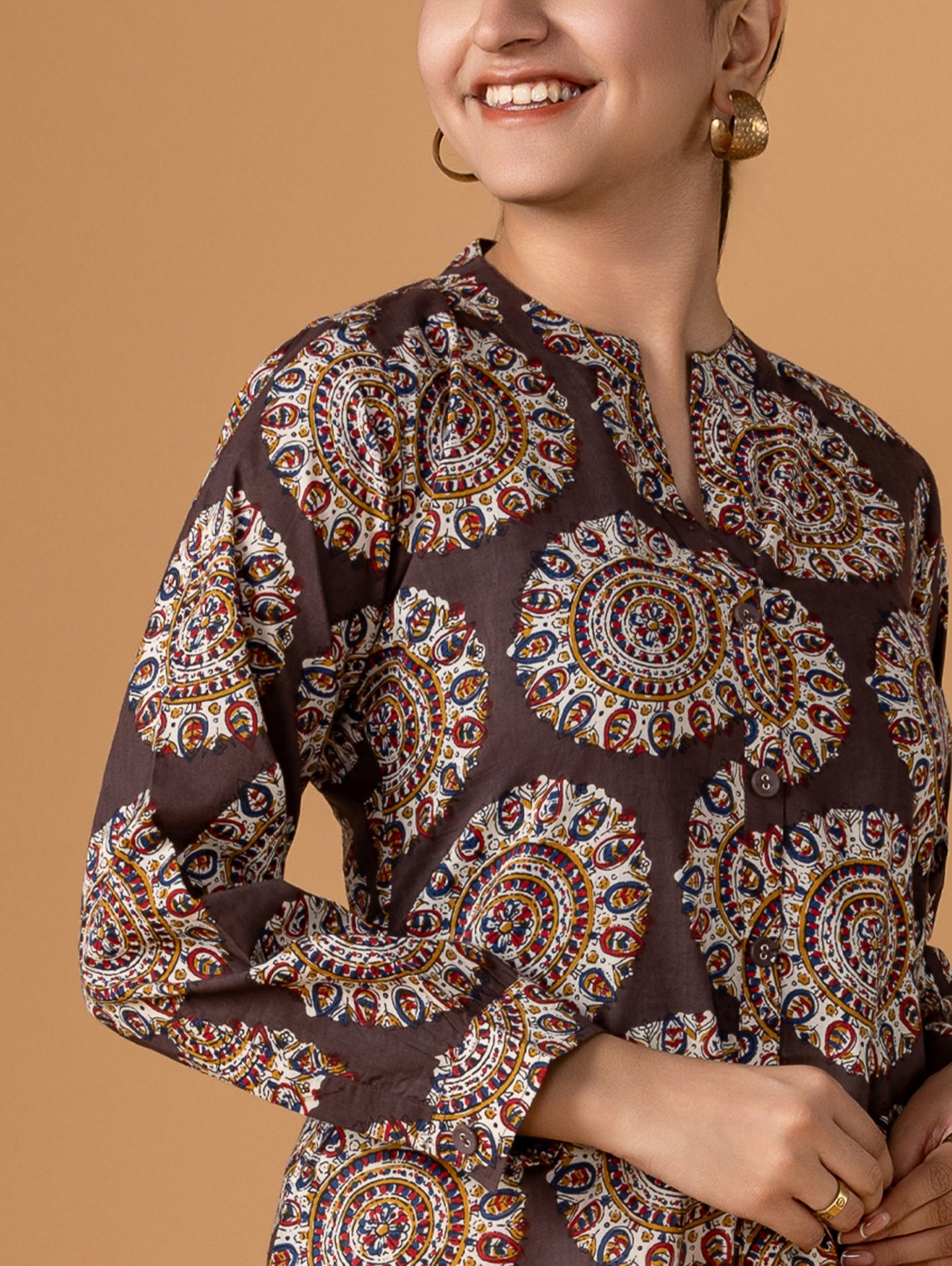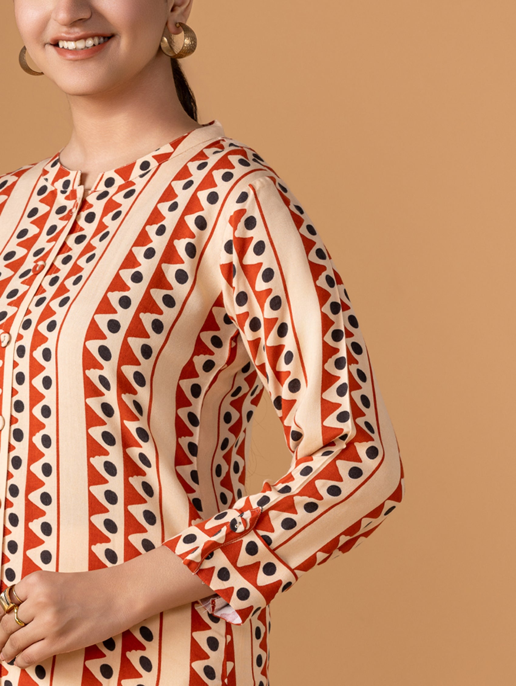 Discover our newest addition—a beautifully printed pure cotton short kurti featuring a mandarin collar, three-fourth sleeves, and stylish open side slits. This finely tailored kurta exudes sophistication and charm. Elevate your wardrobe with this must-have piece!