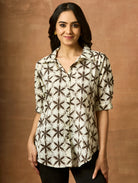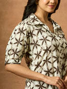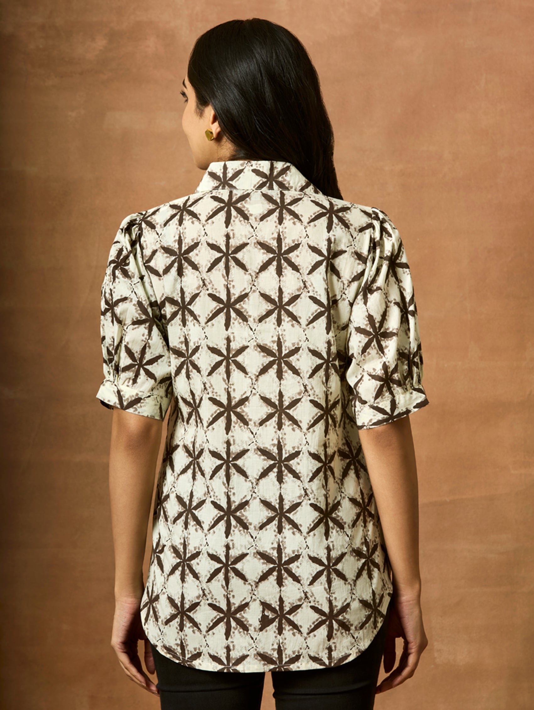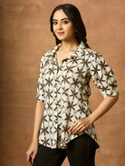 Introducing the newest member of our collection - a printed cotton tunic adorned with a revere collar and half-length sleeves. Elevate your fashion game with this essential ensemble!