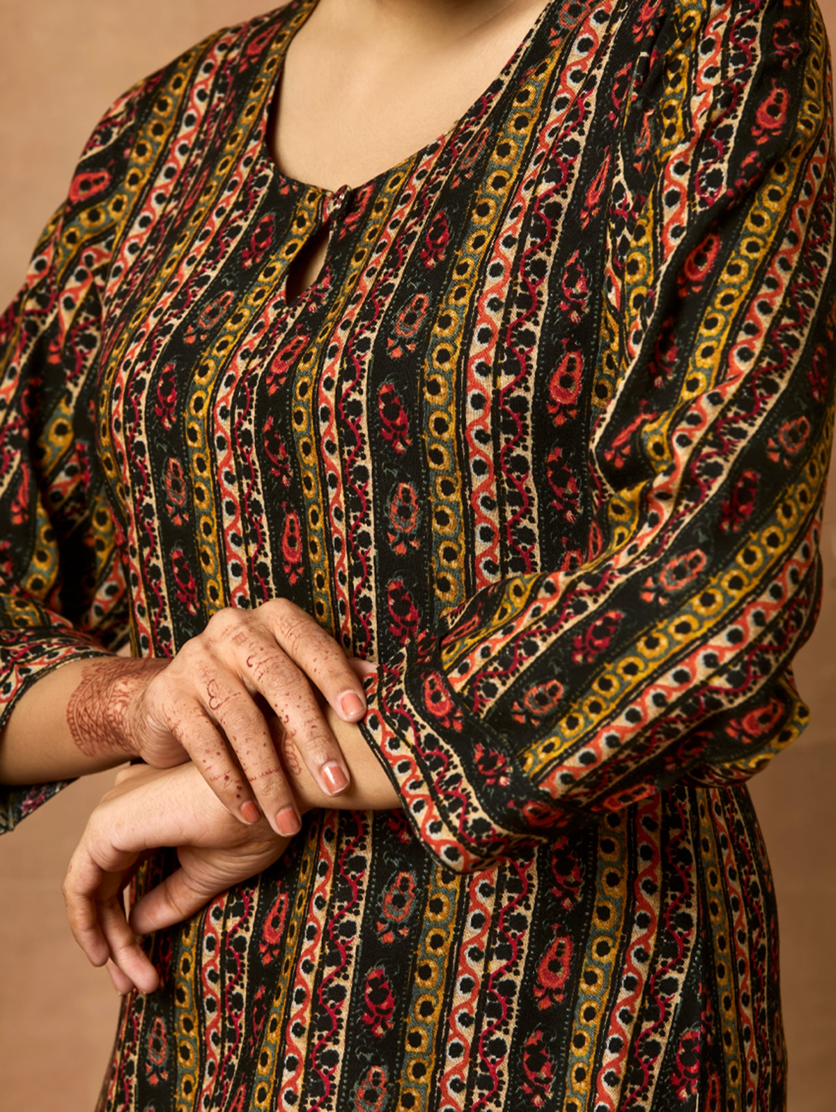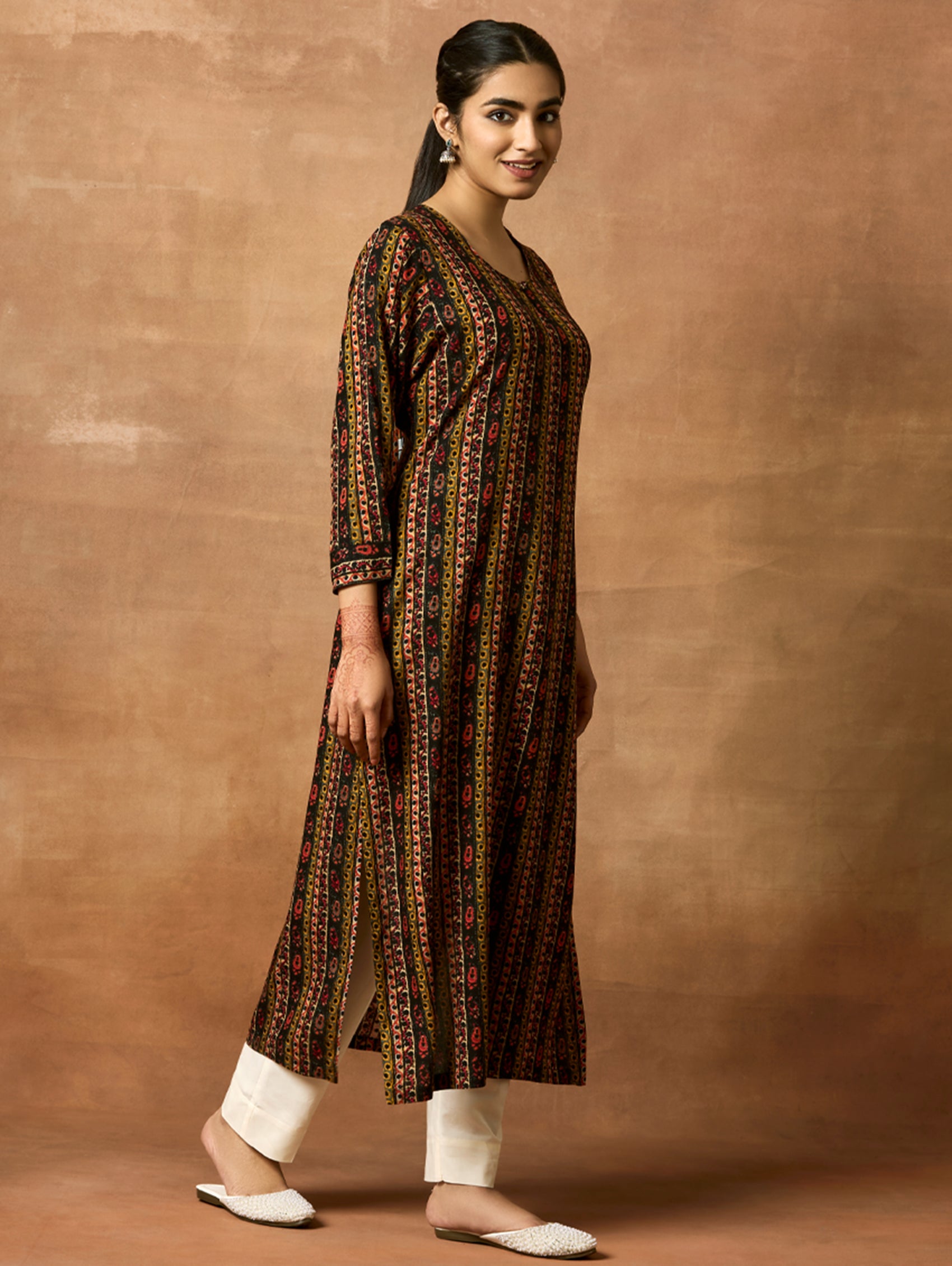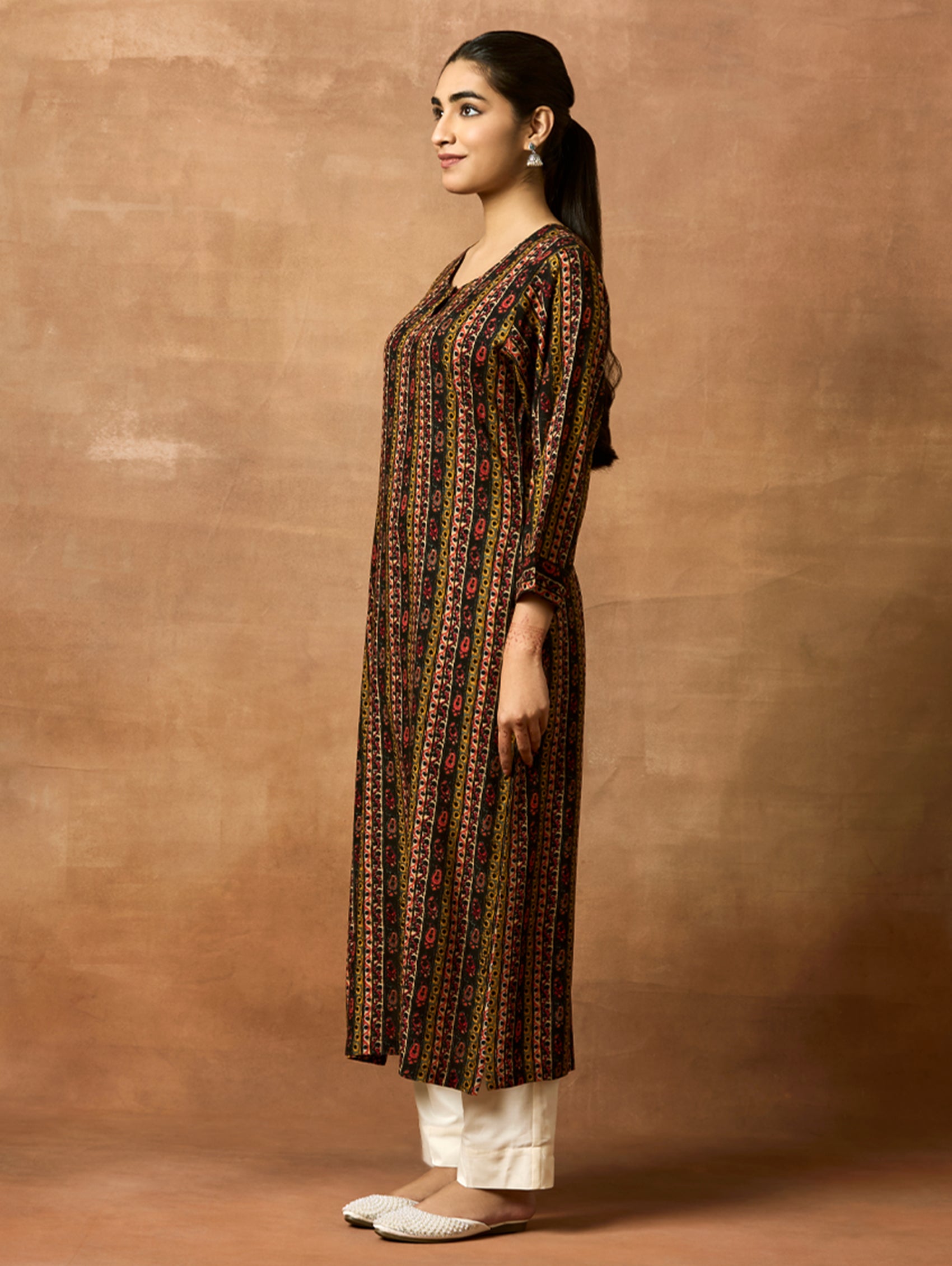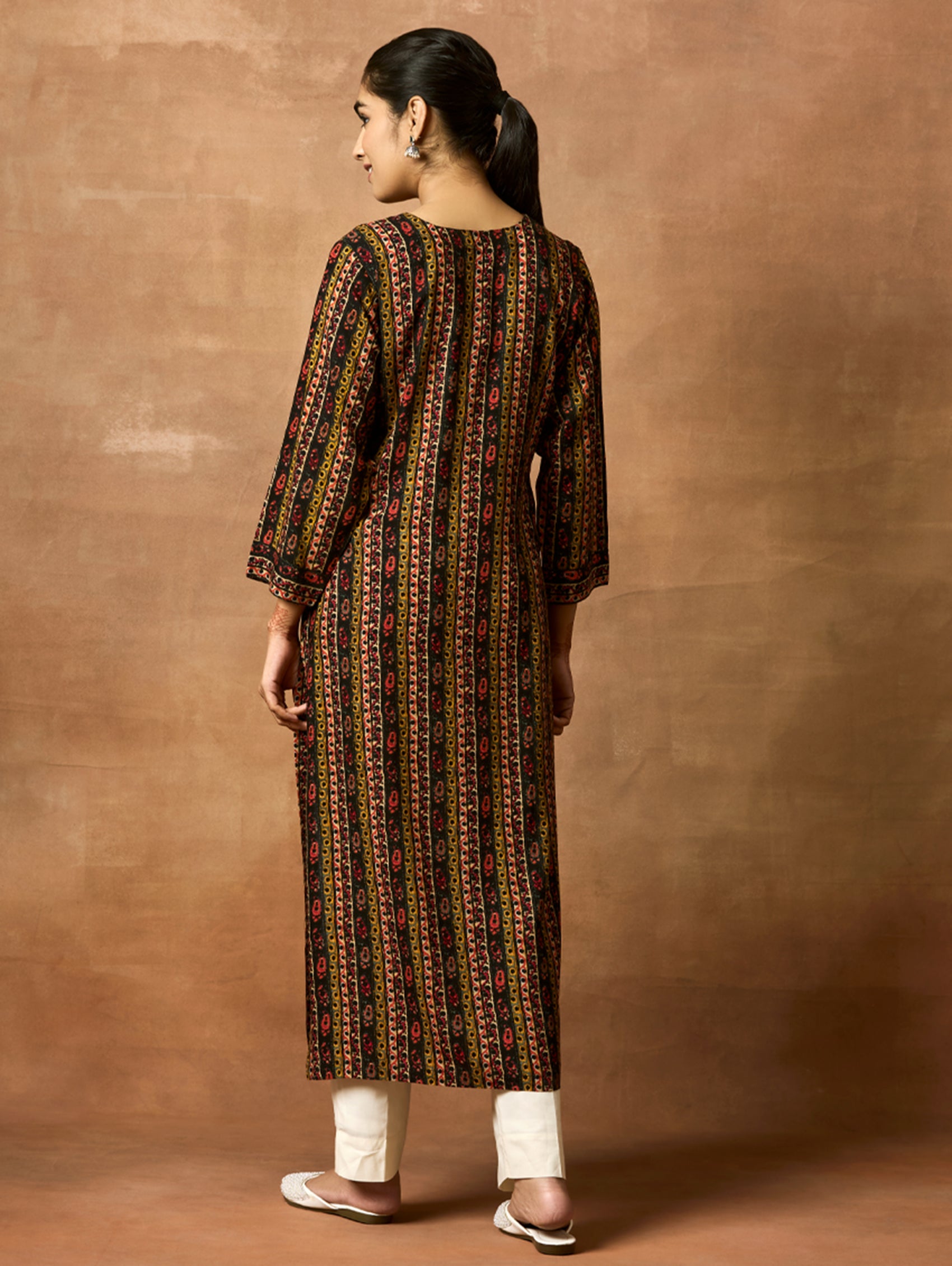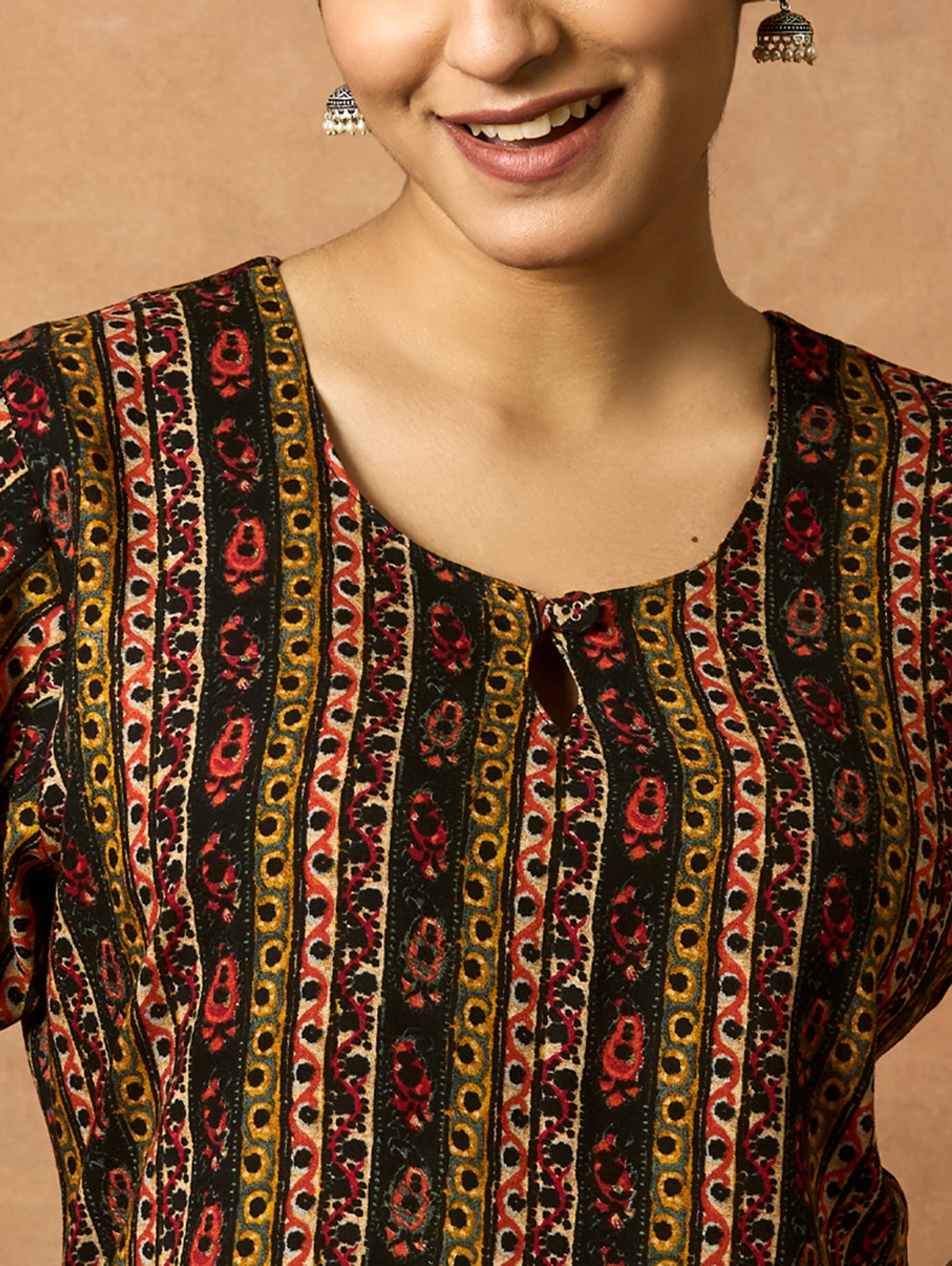 Indulge in the simplicity of this Women Plus kurta. Featuring a keyhole round neckline, and three-fourth sleeves, this kurta is made of printed rayon to keep you cool and comfortable during the hot summer days.