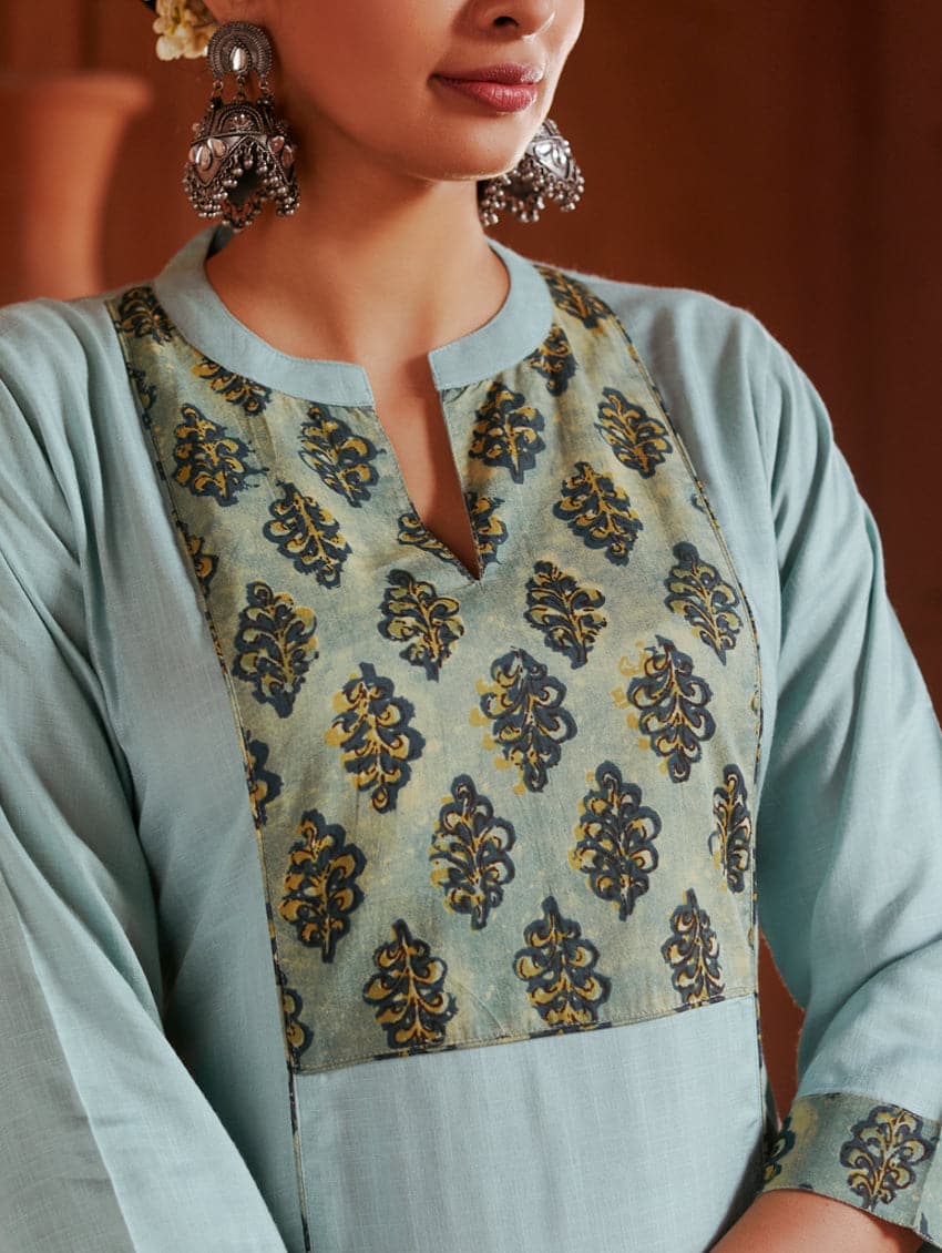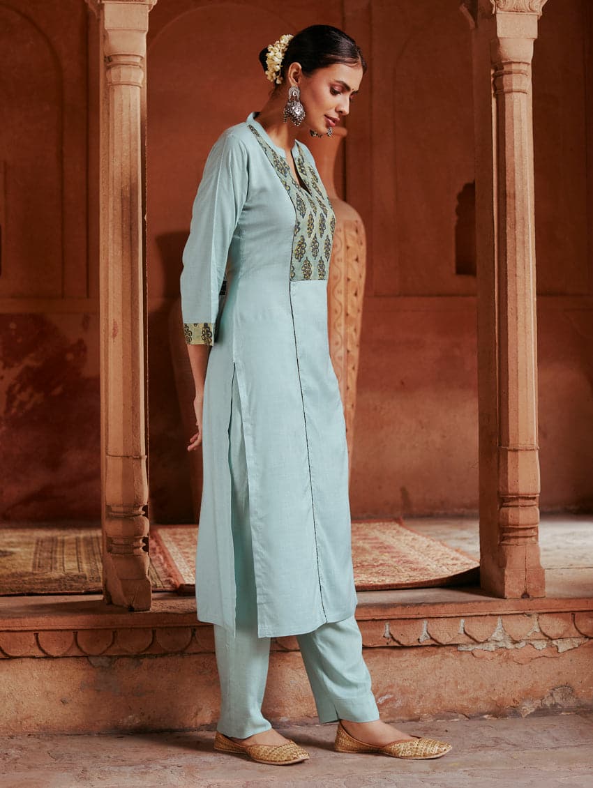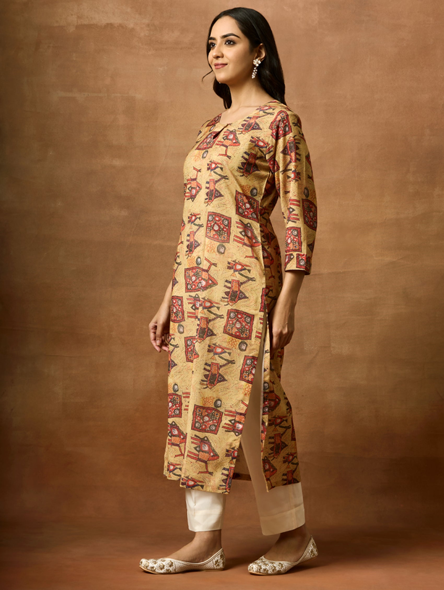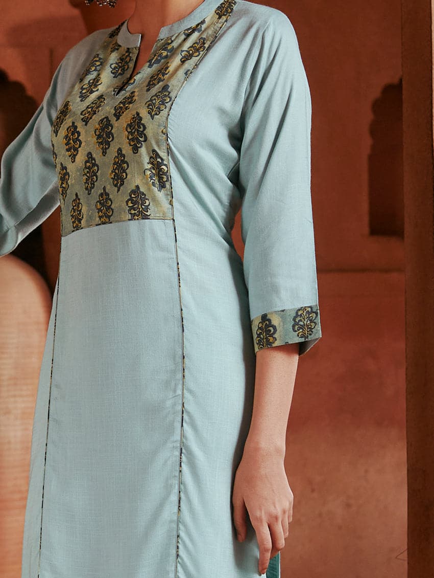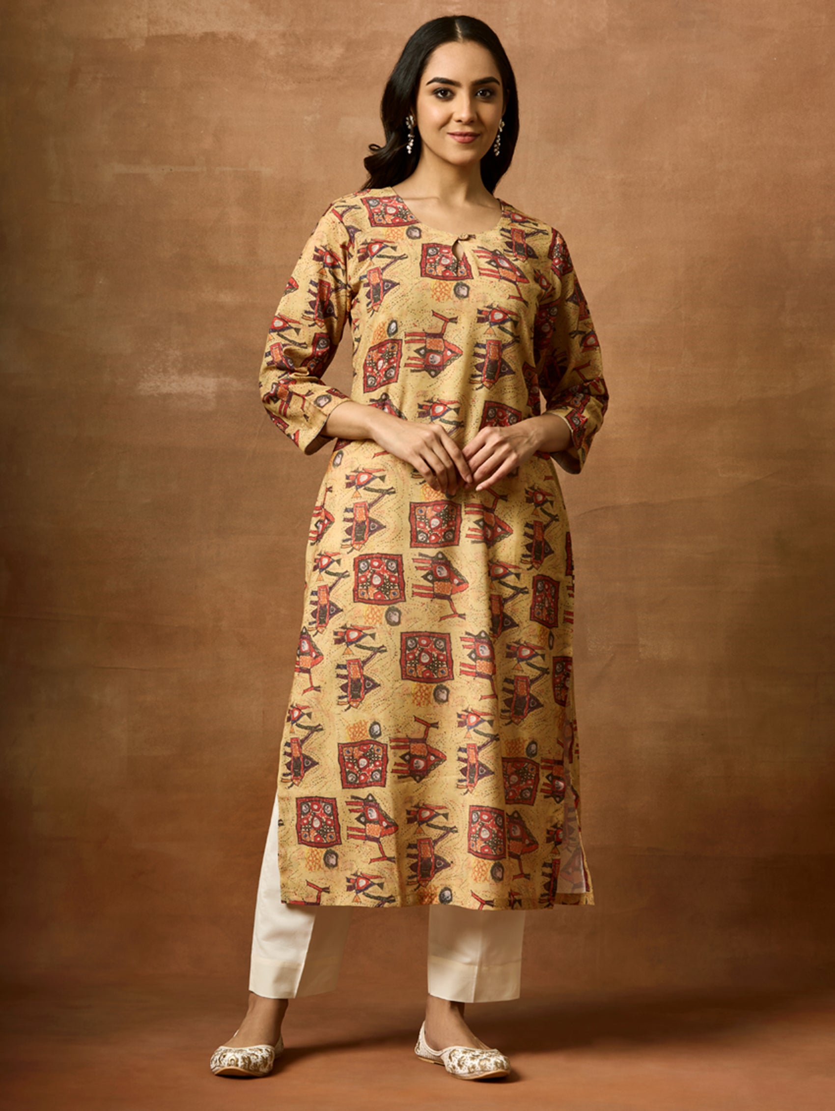 • Kurta with keyhole round neckline, three-fourth sleeves, and side slits open.