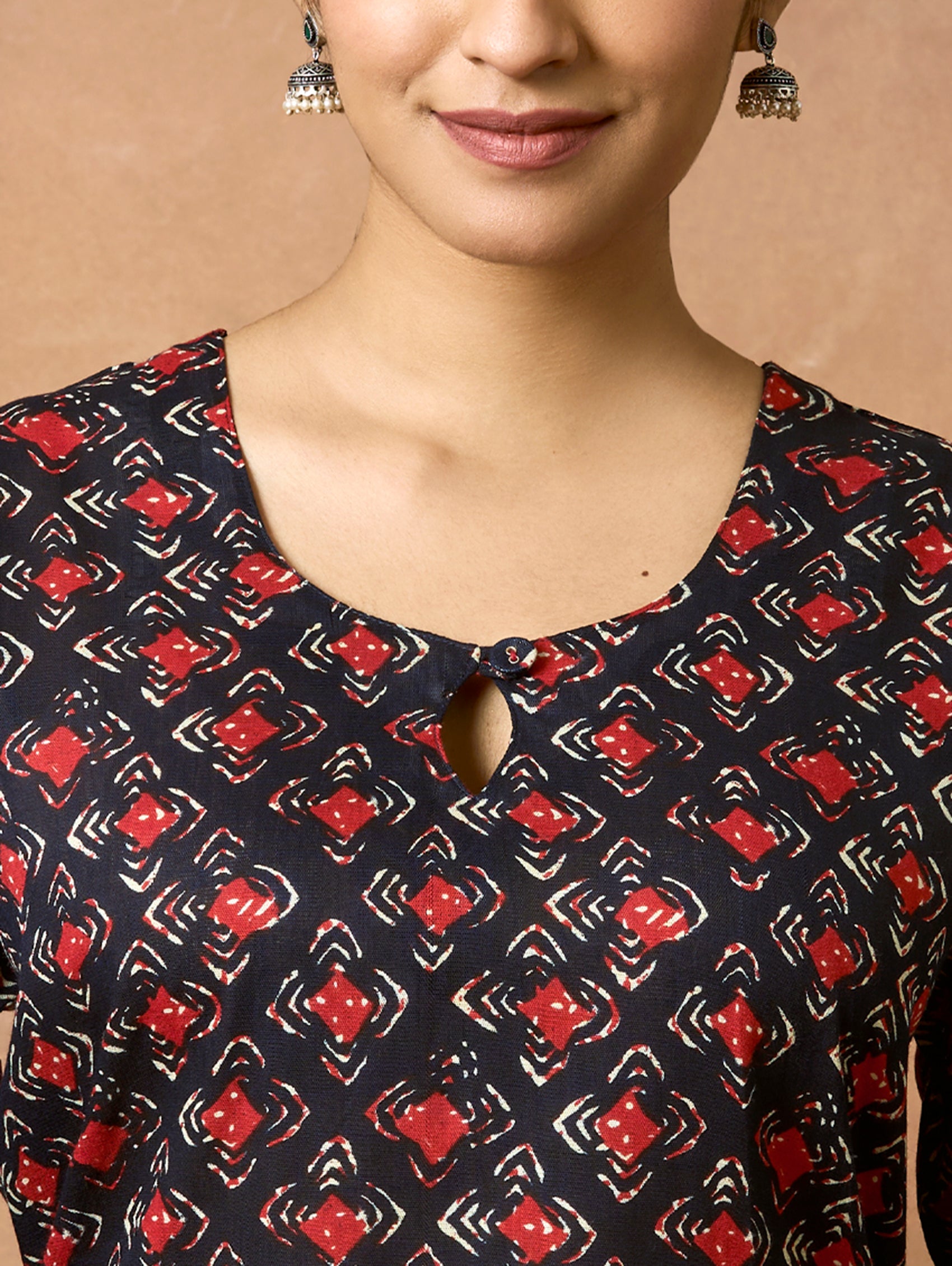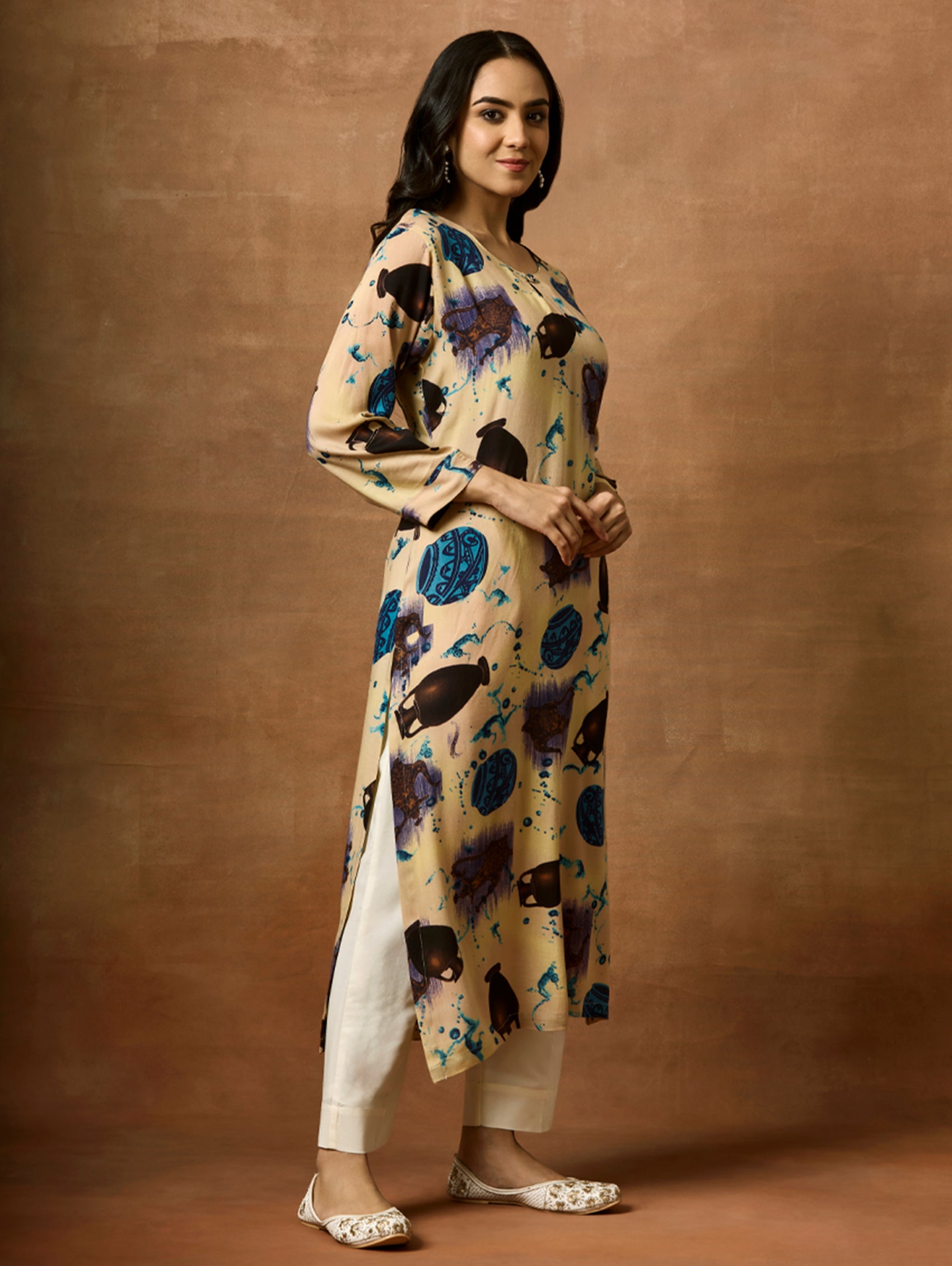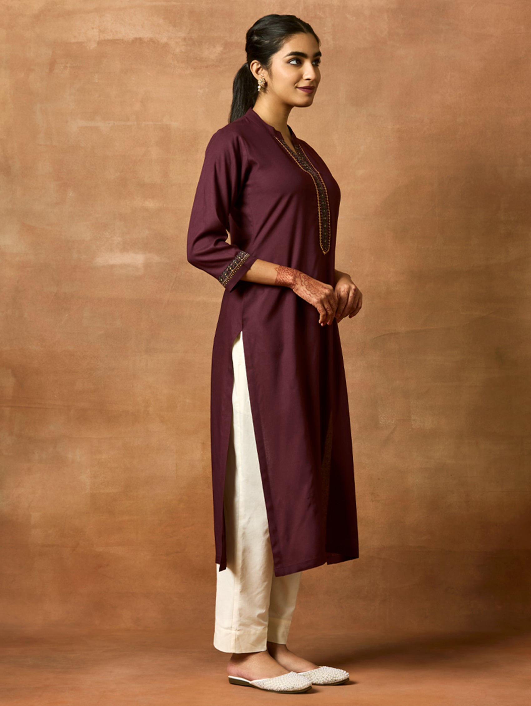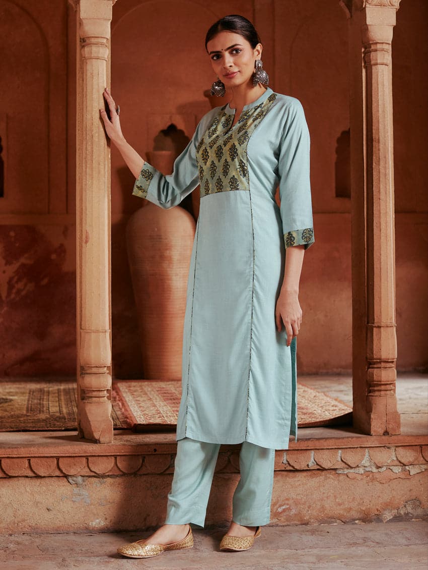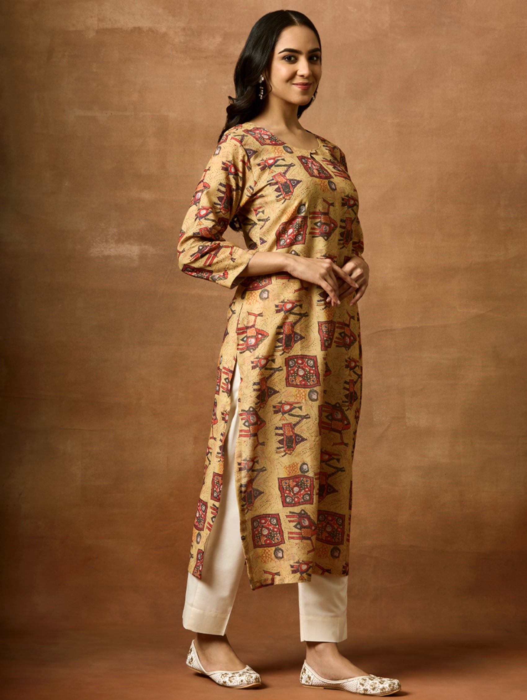 • Kurta with keyhole round neckline, three-fourth sleeves, and side slits open.