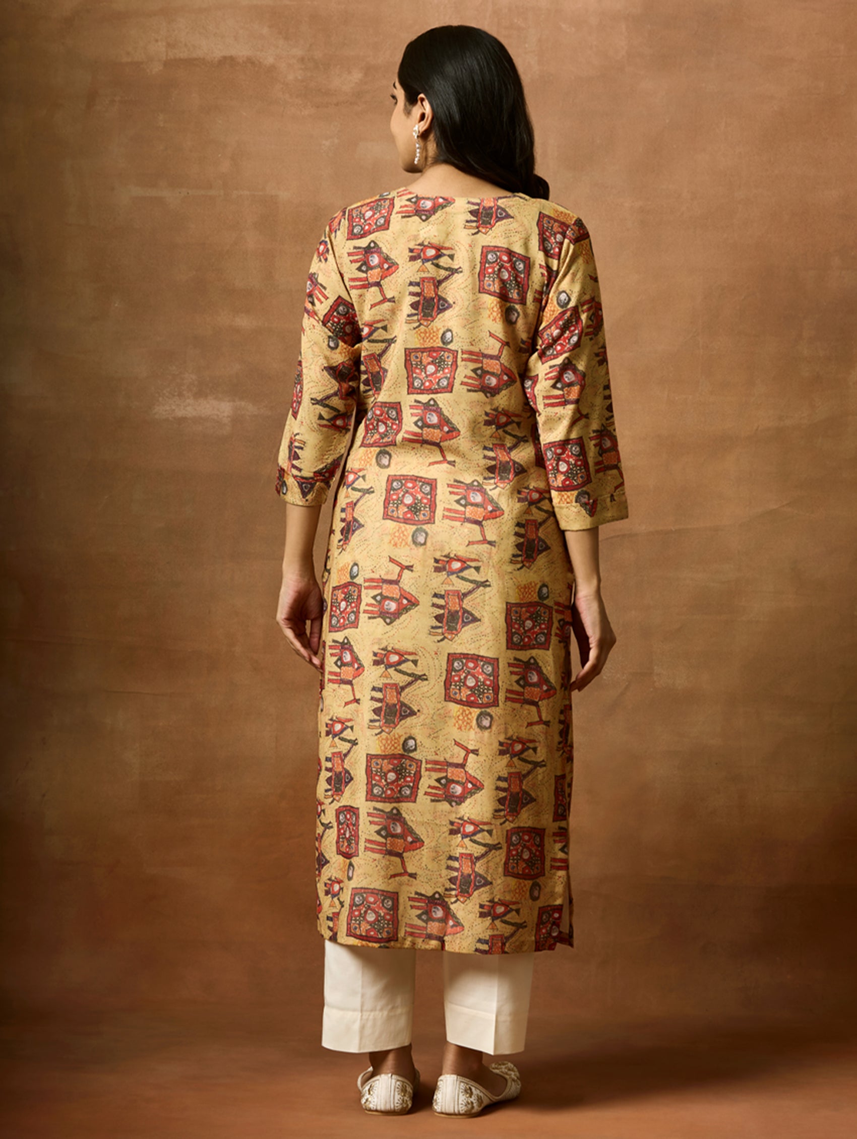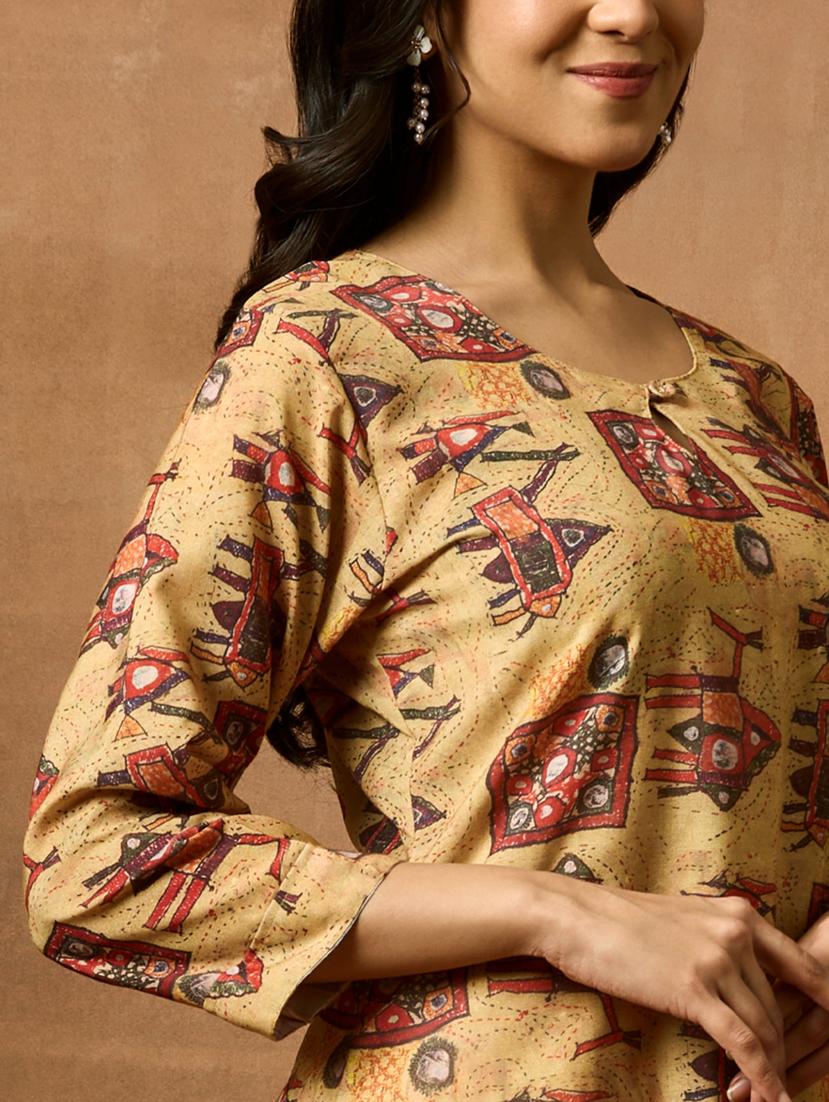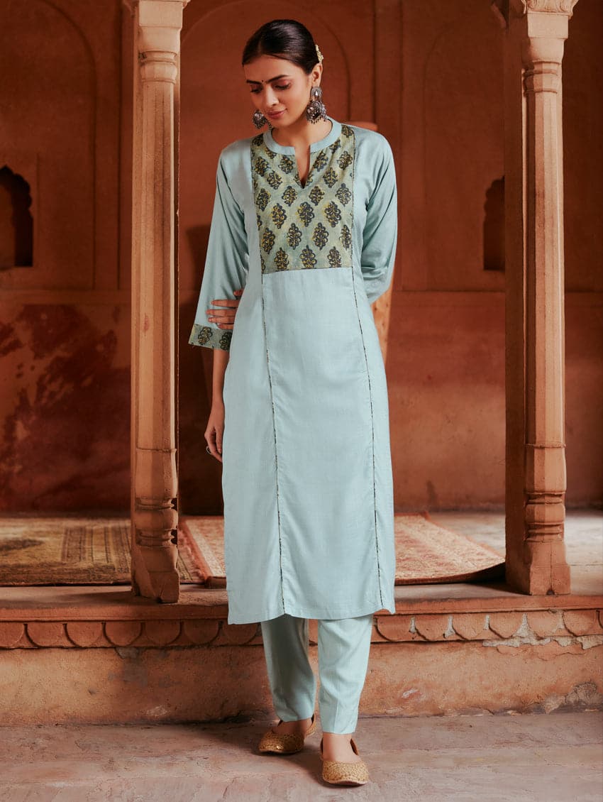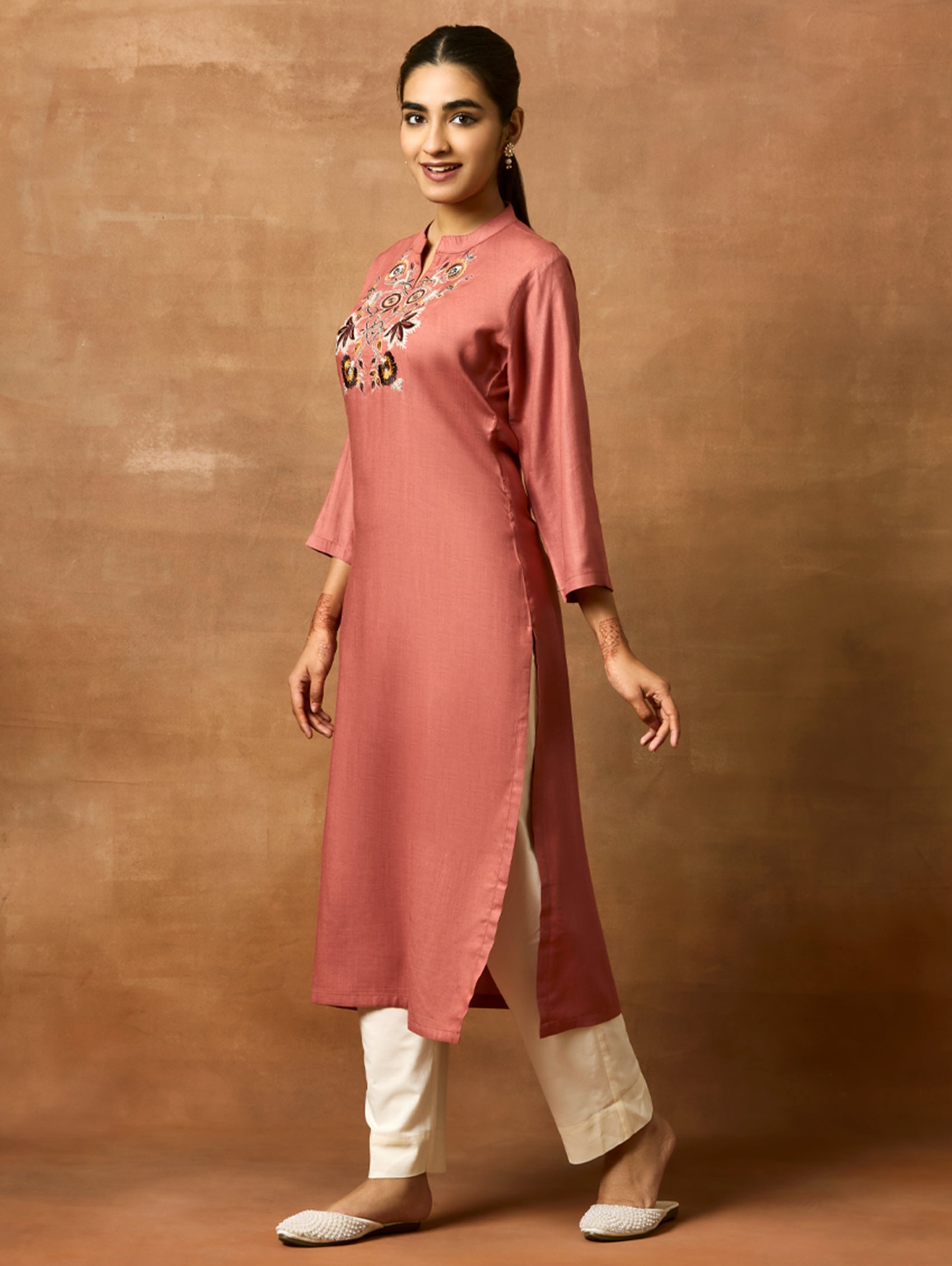 • Kurta with keyhole round neckline, three-fourth sleeves, and side slits open.