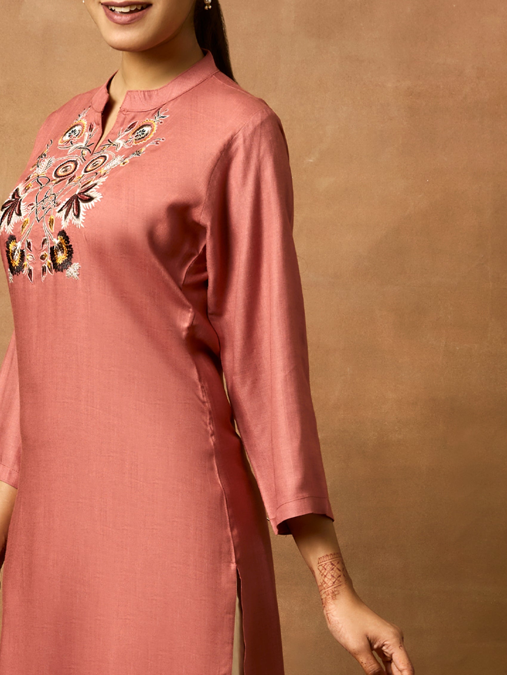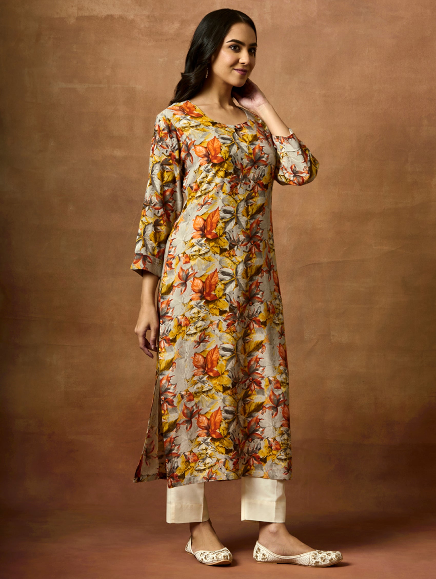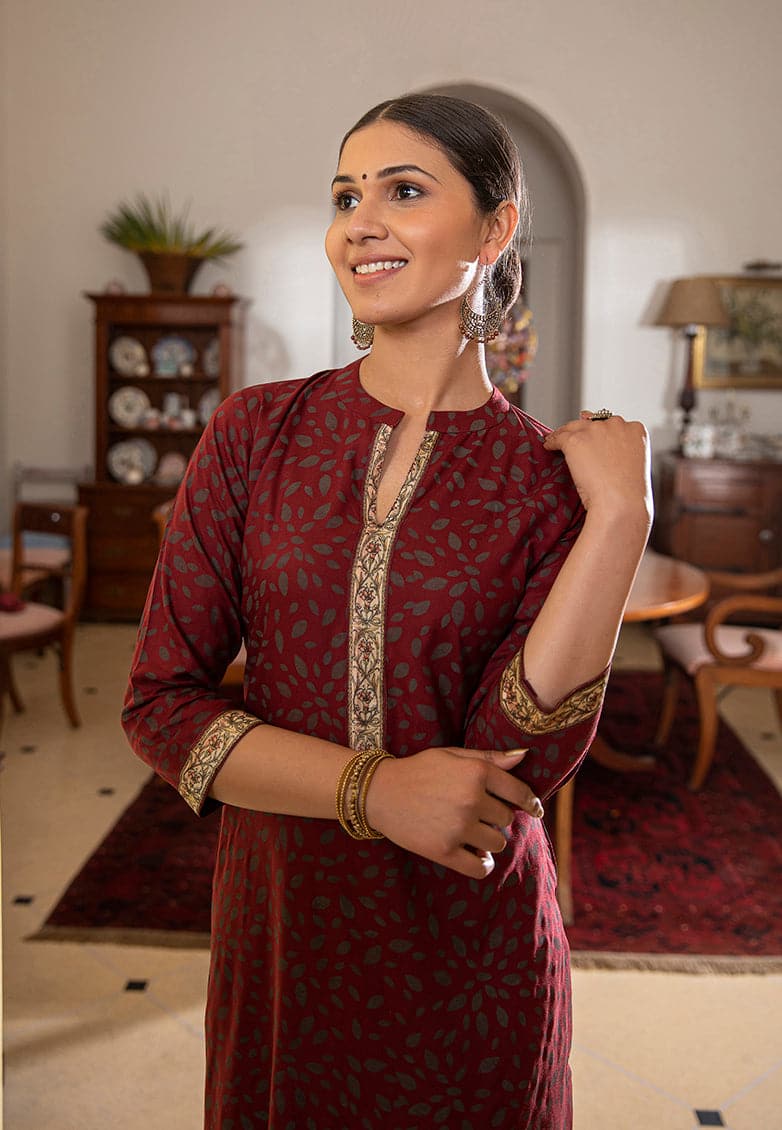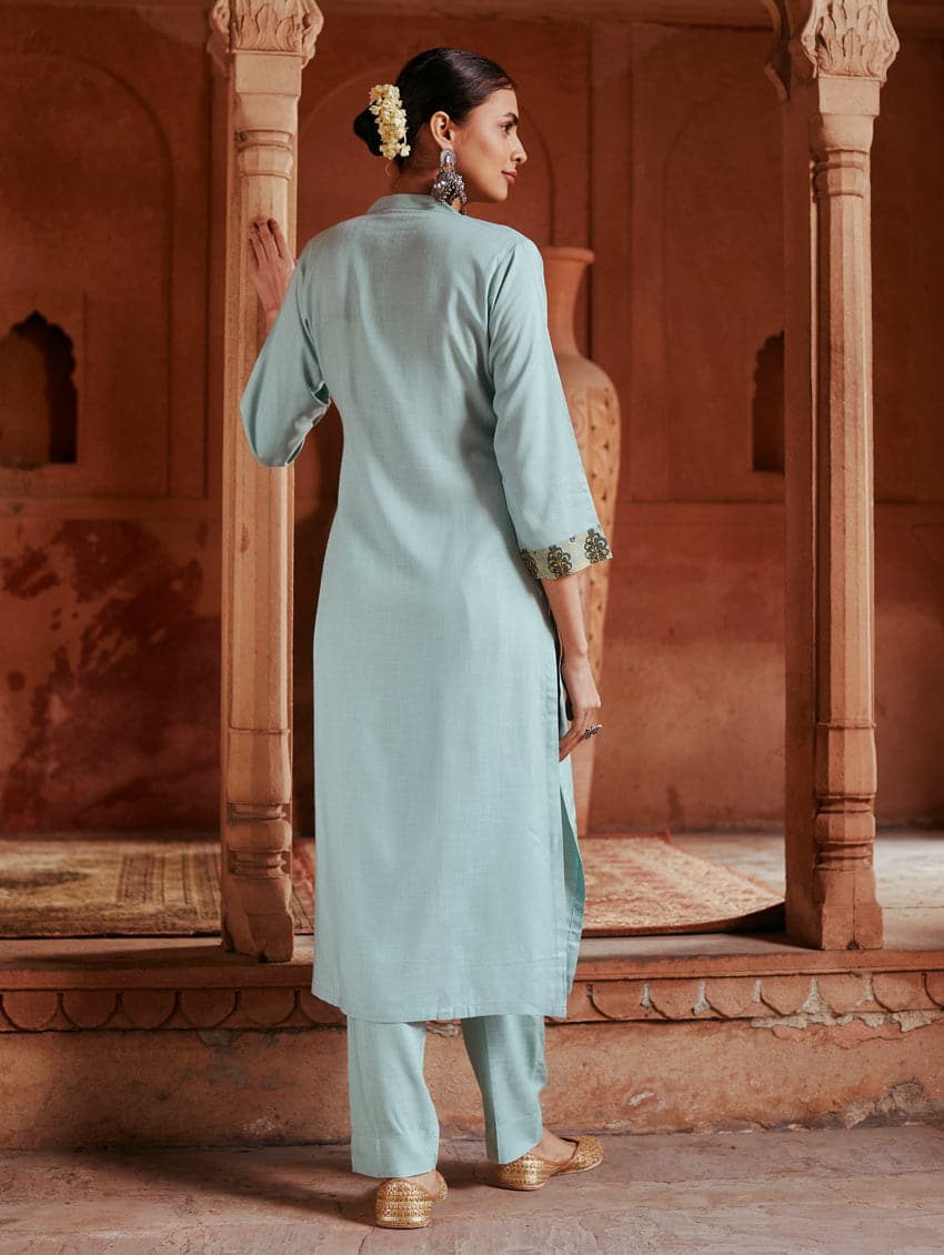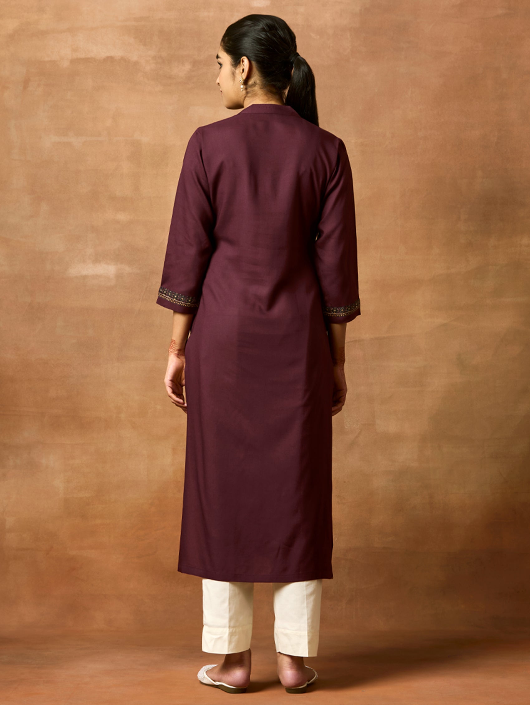 • Kurta with keyhole round neckline, three-fourth sleeves, and side slits open.