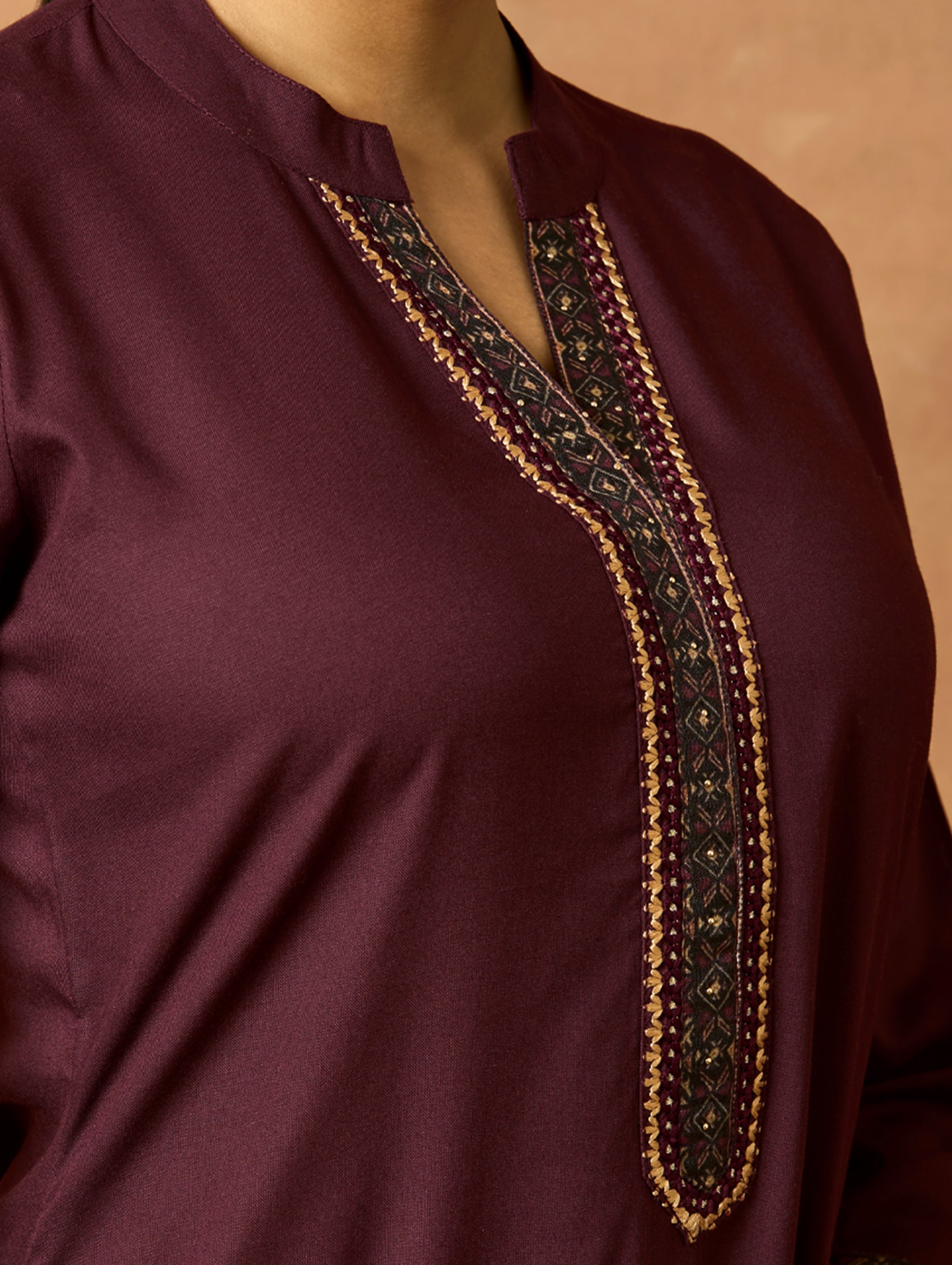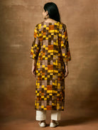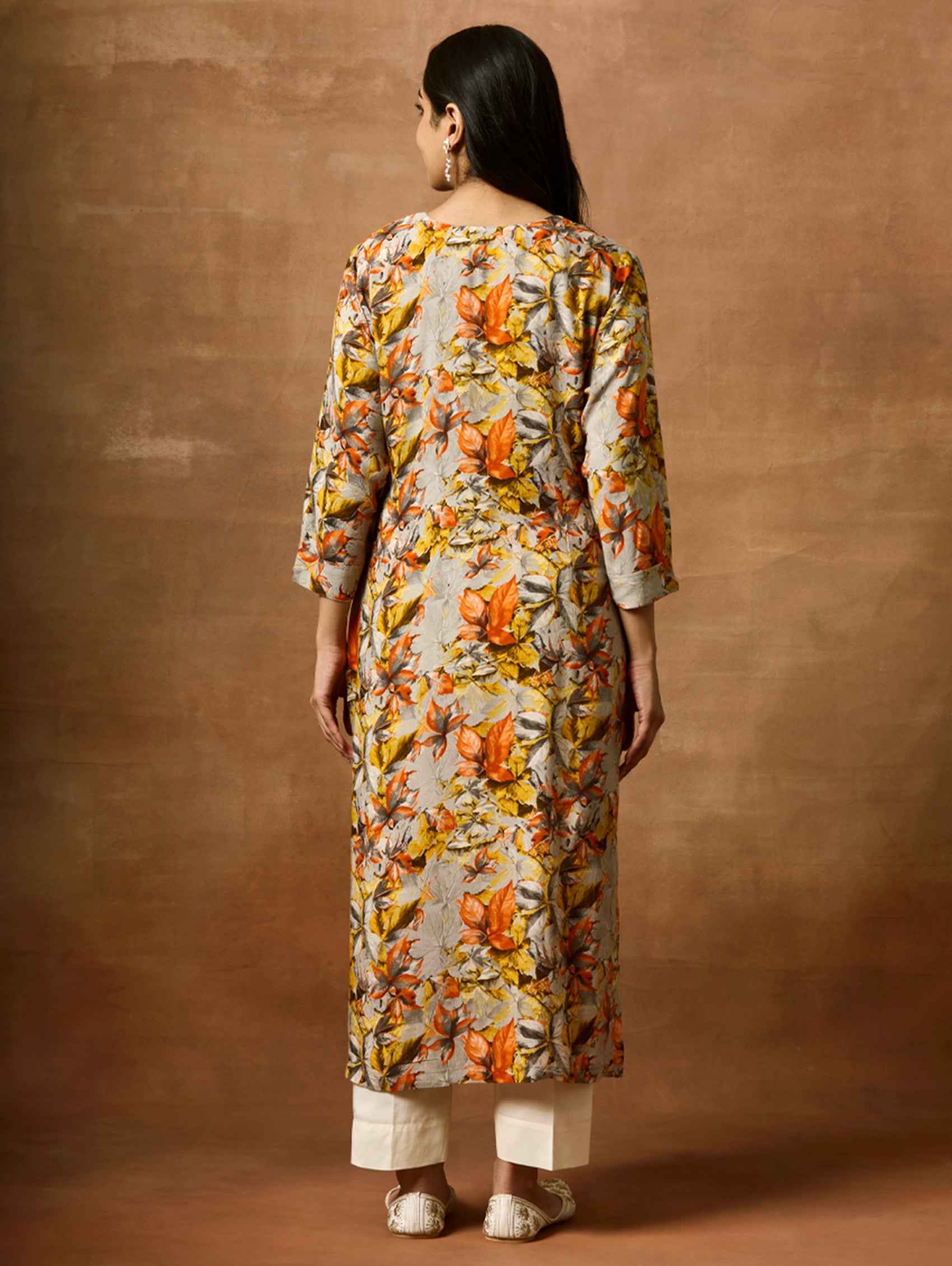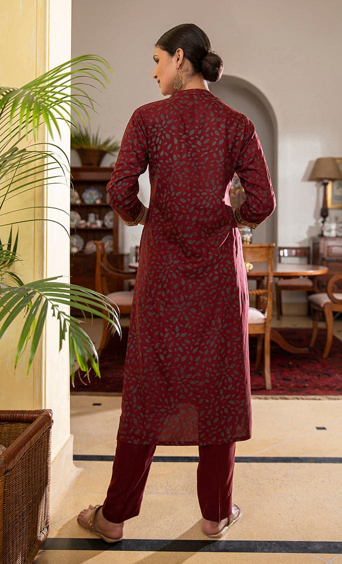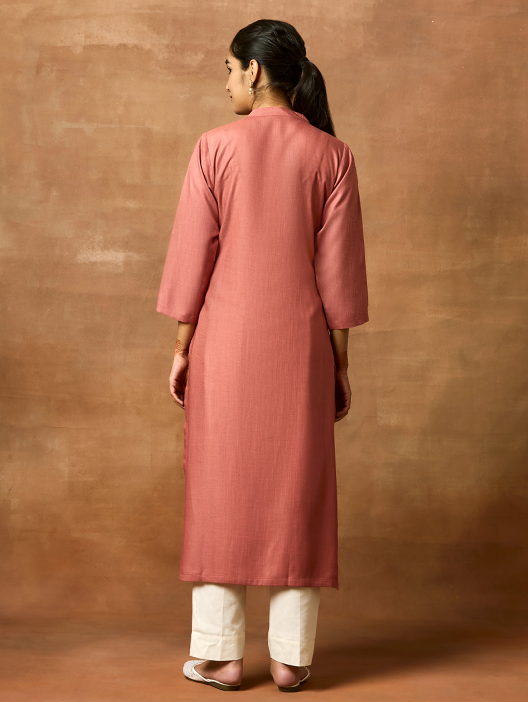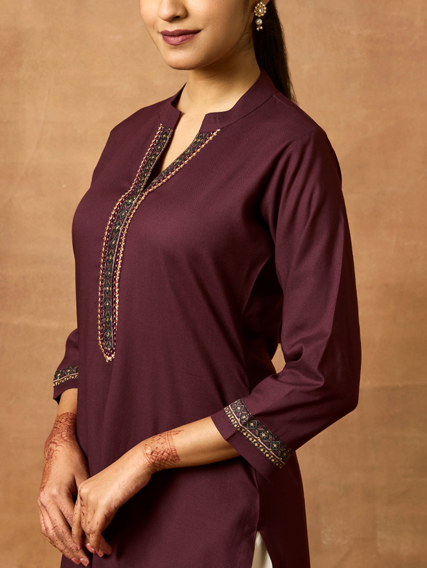 • Kurta with keyhole round neckline, three-fourth sleeves, and side slits open.