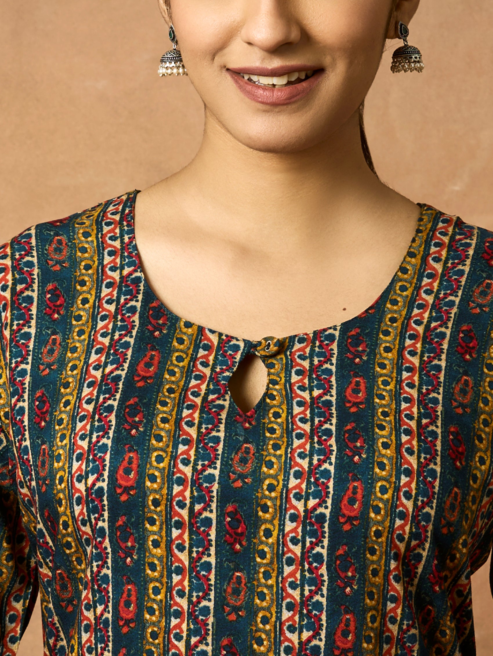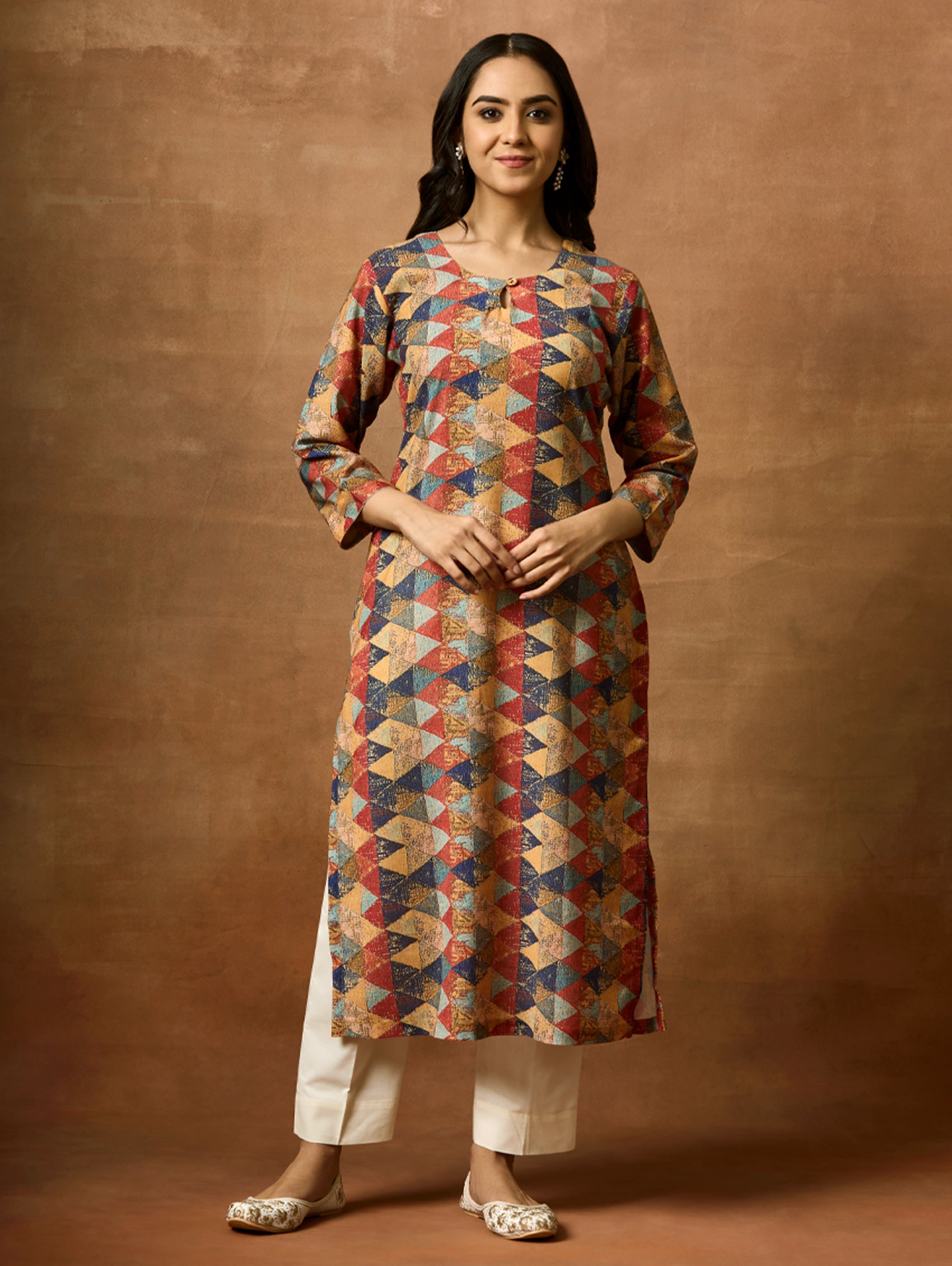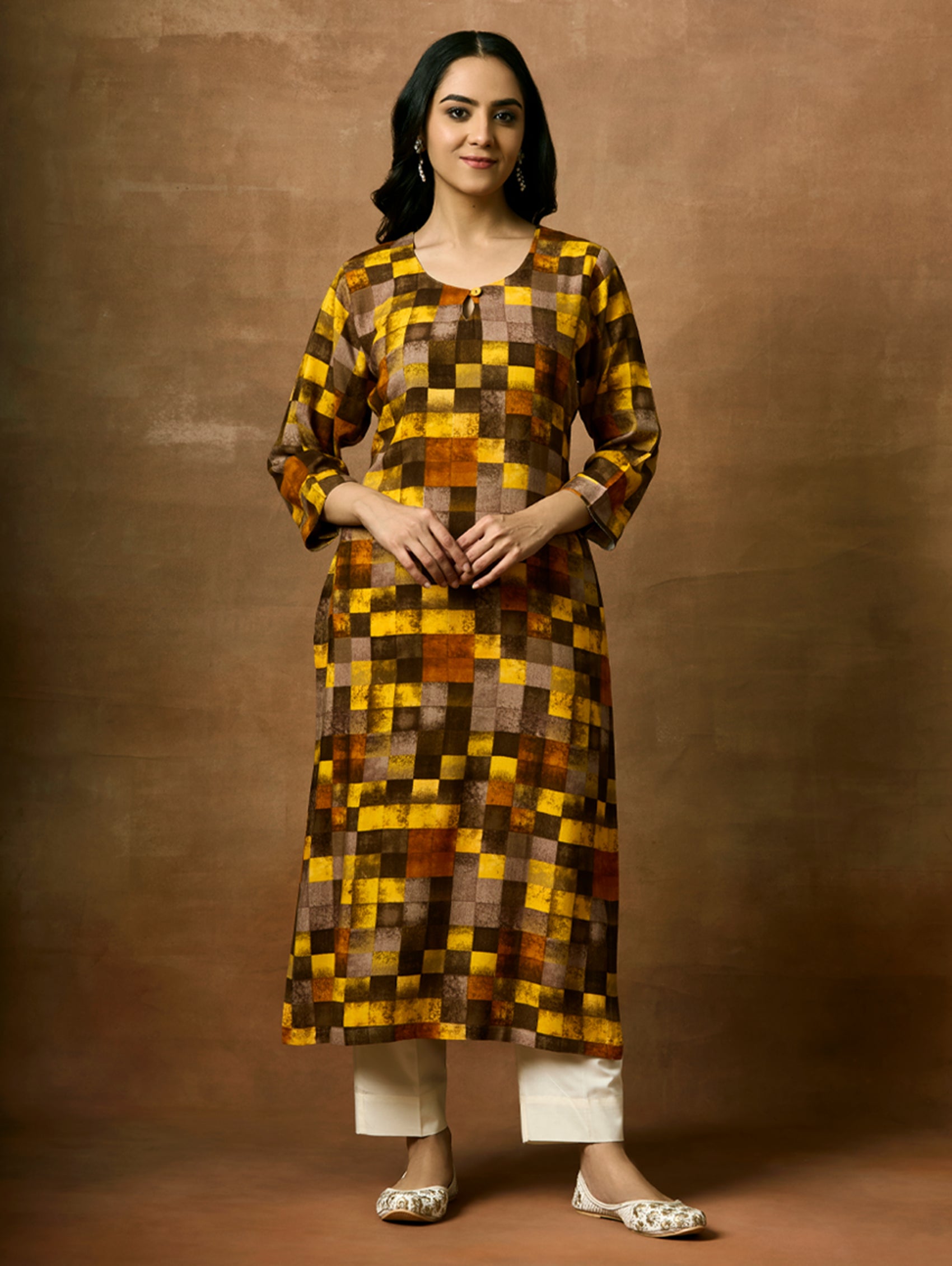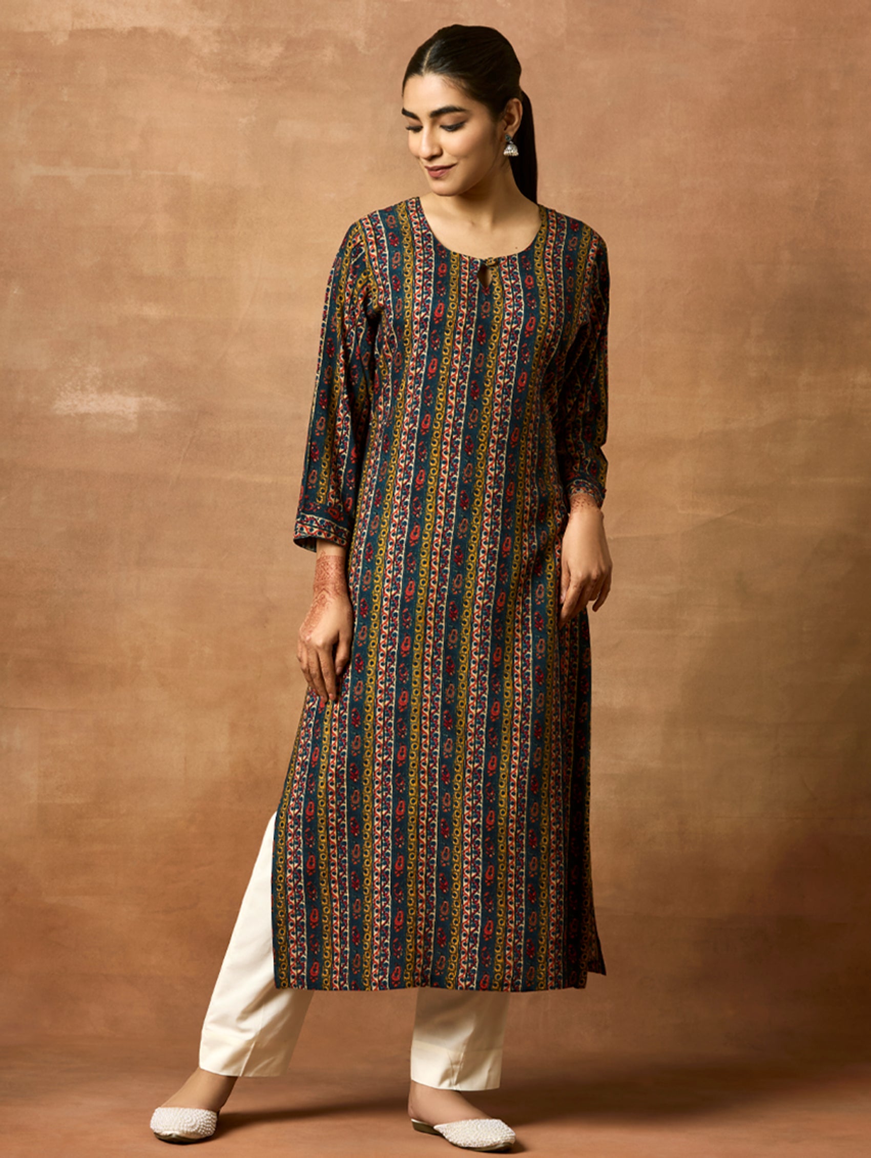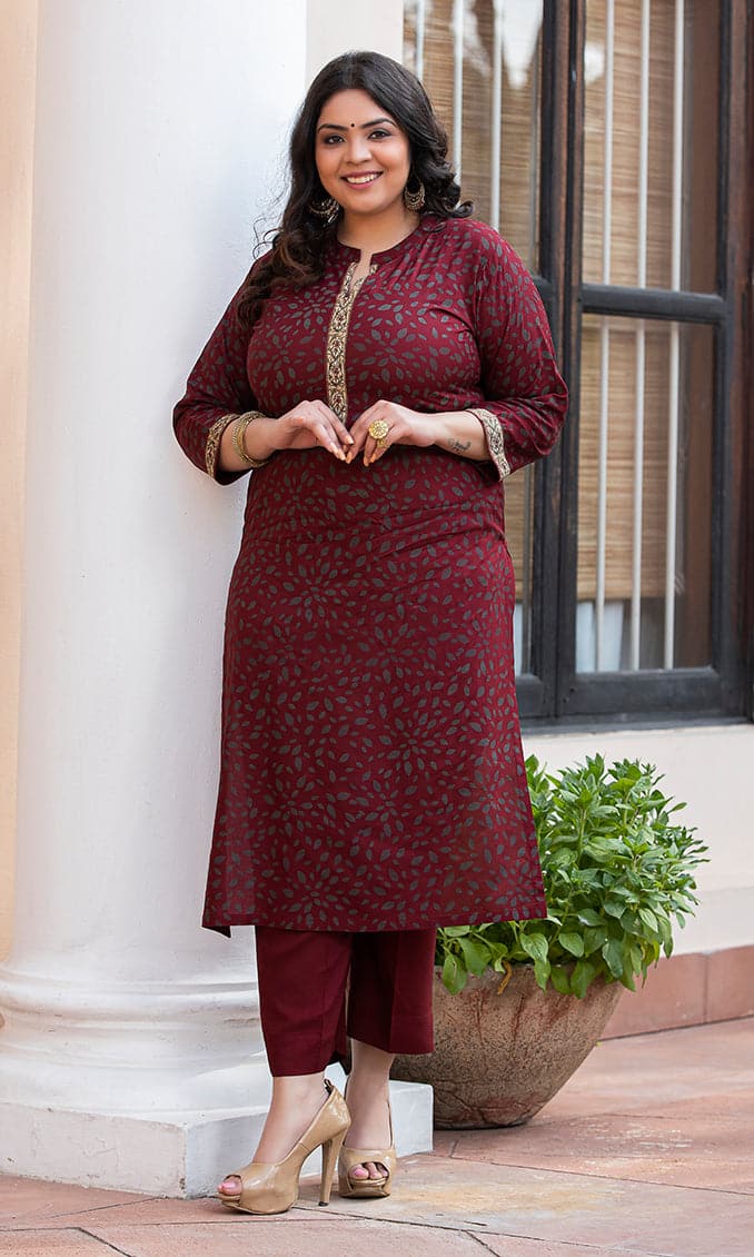 Experience the effortless elegance of this Women Plus kurta. Adorned with a keyhole round neckline and three-fourth sleeves, this kurta is crafted from printed rayon to keep you comfortable and stylish in the scorching summer heat.