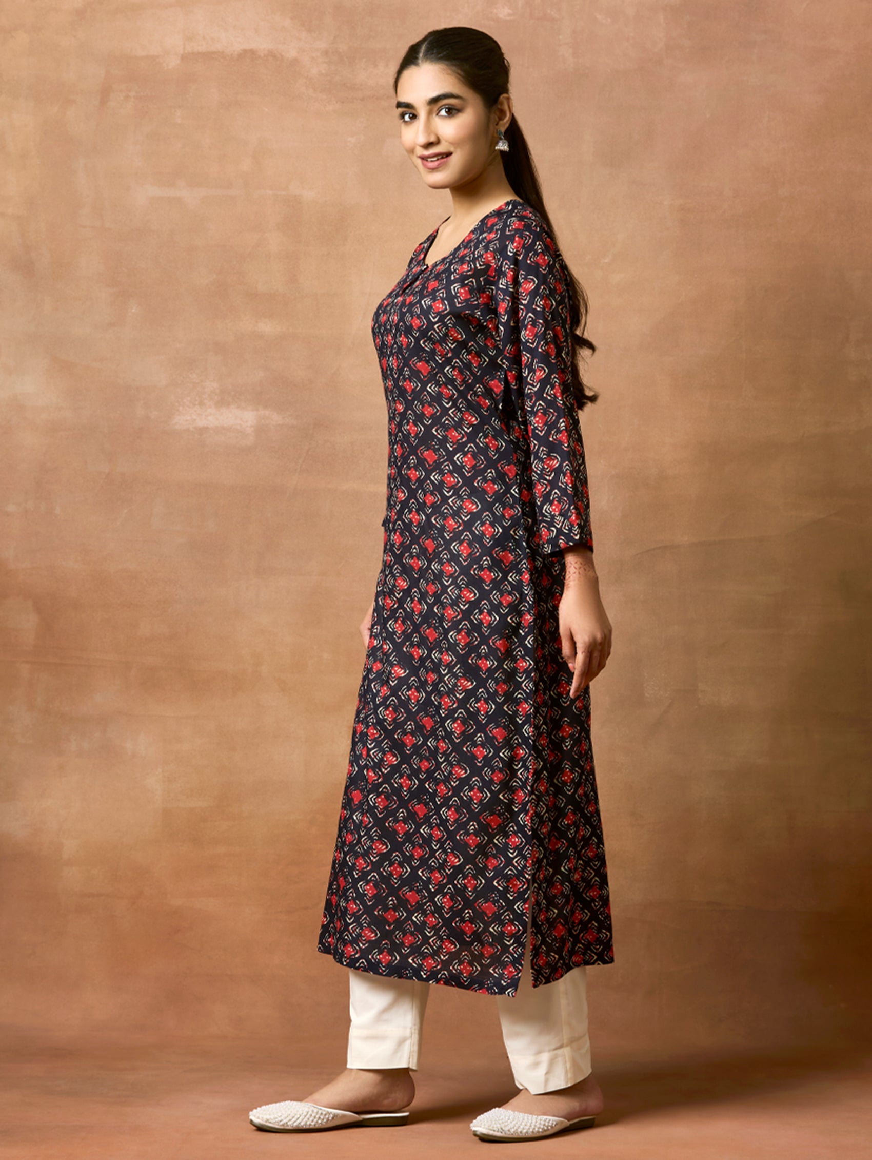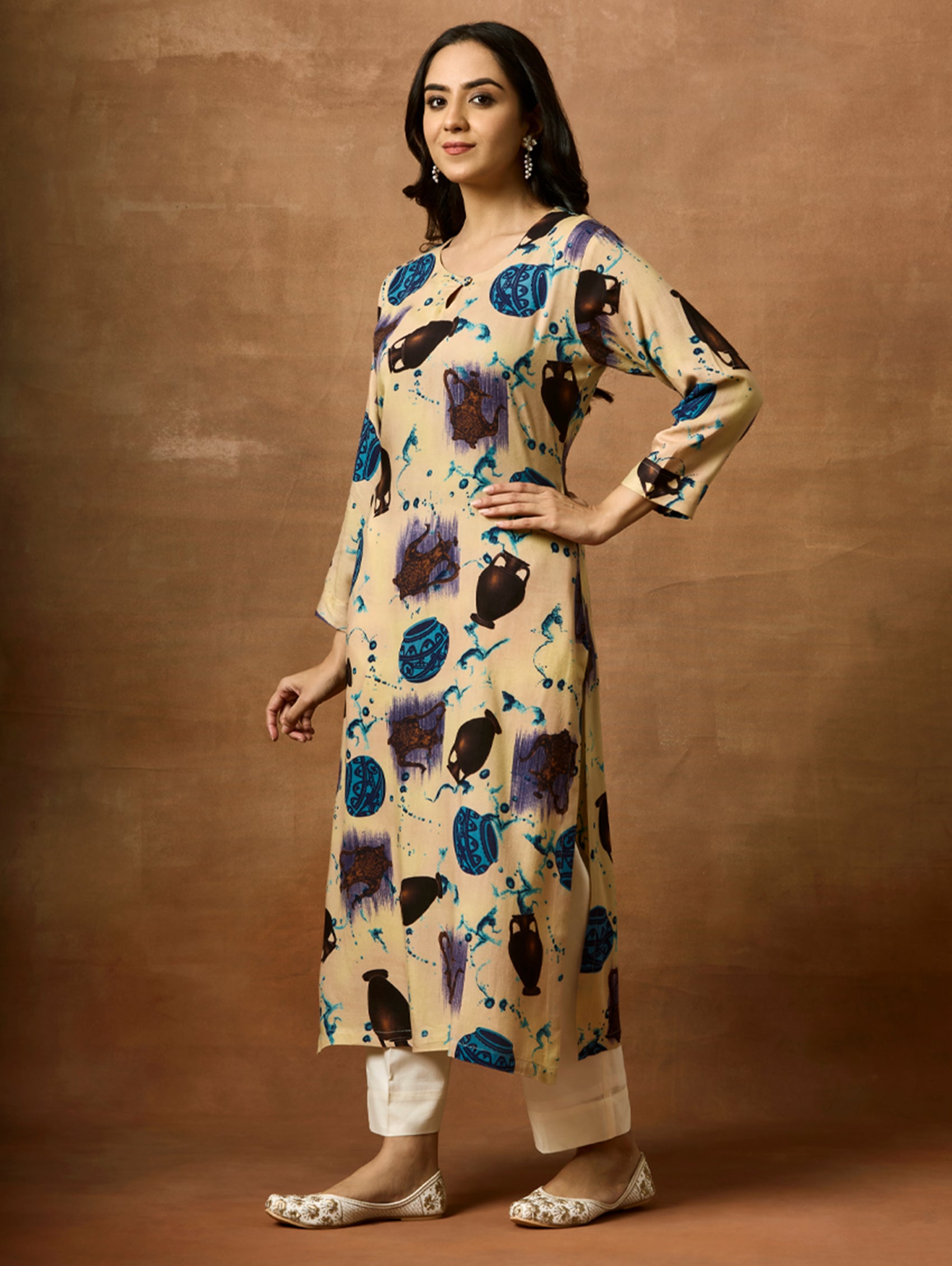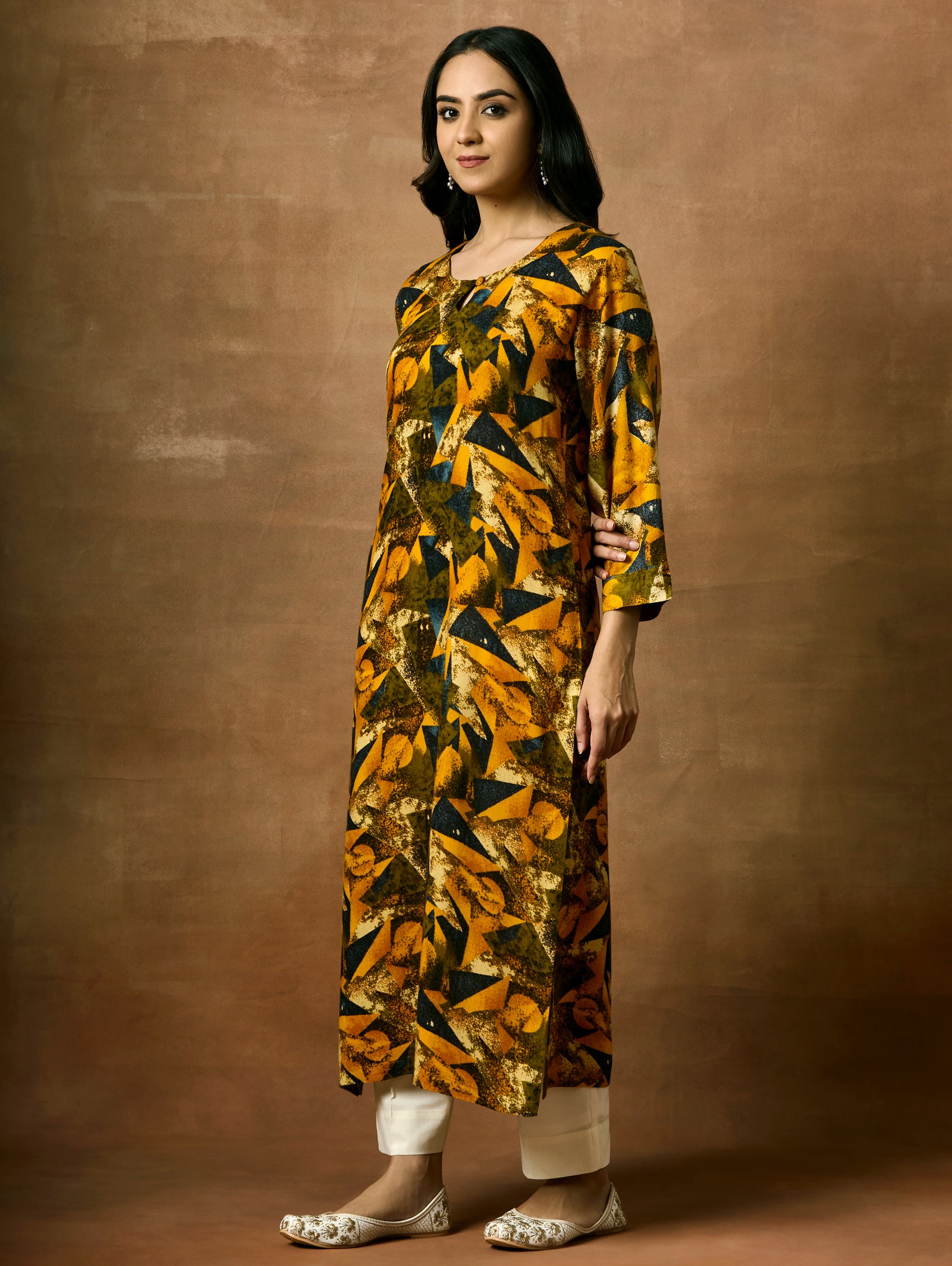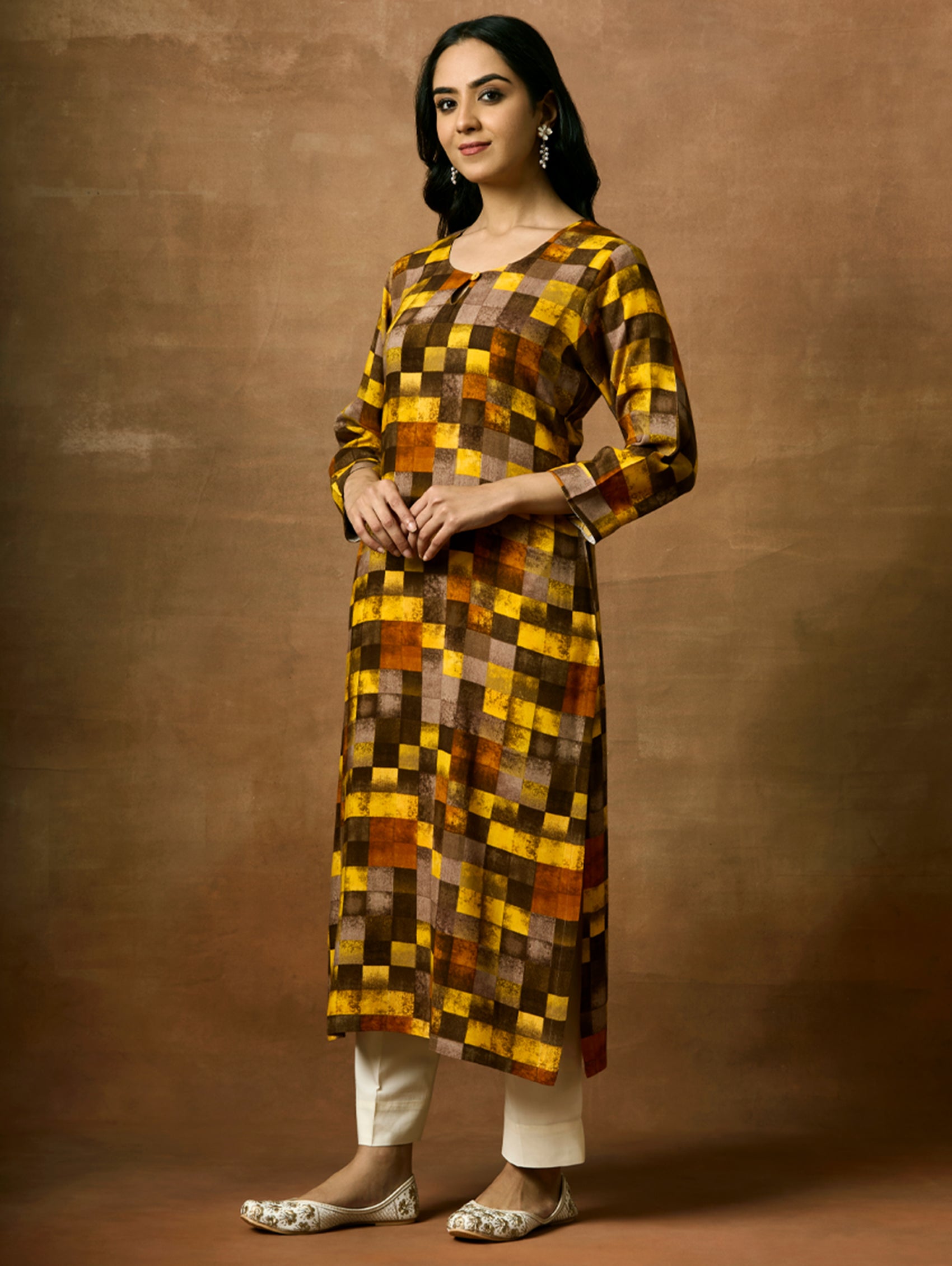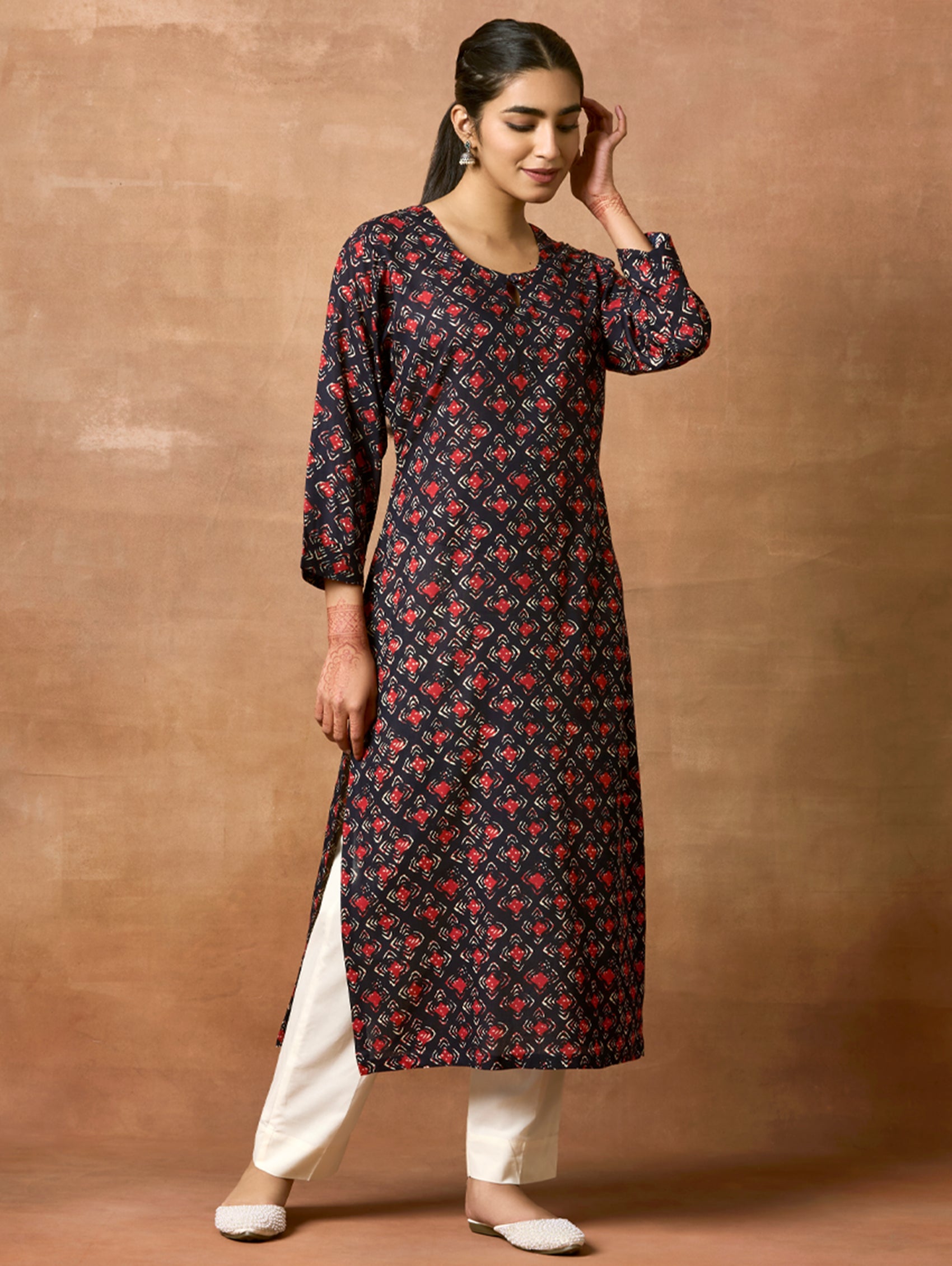 Experience the effortless elegance of this Women Plus kurta. Adorned with a keyhole round neckline and three-fourth sleeves, this kurta is crafted from printed rayon to keep you comfortable and stylish in the scorching summer heat.
