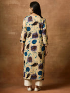• Kurta with round neckline, three-fourth sleeves, and side slits open.