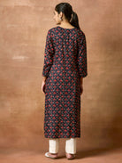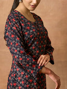 • Kurta with keyhole-round neckline, three-fourth sleeves, and side slits open.