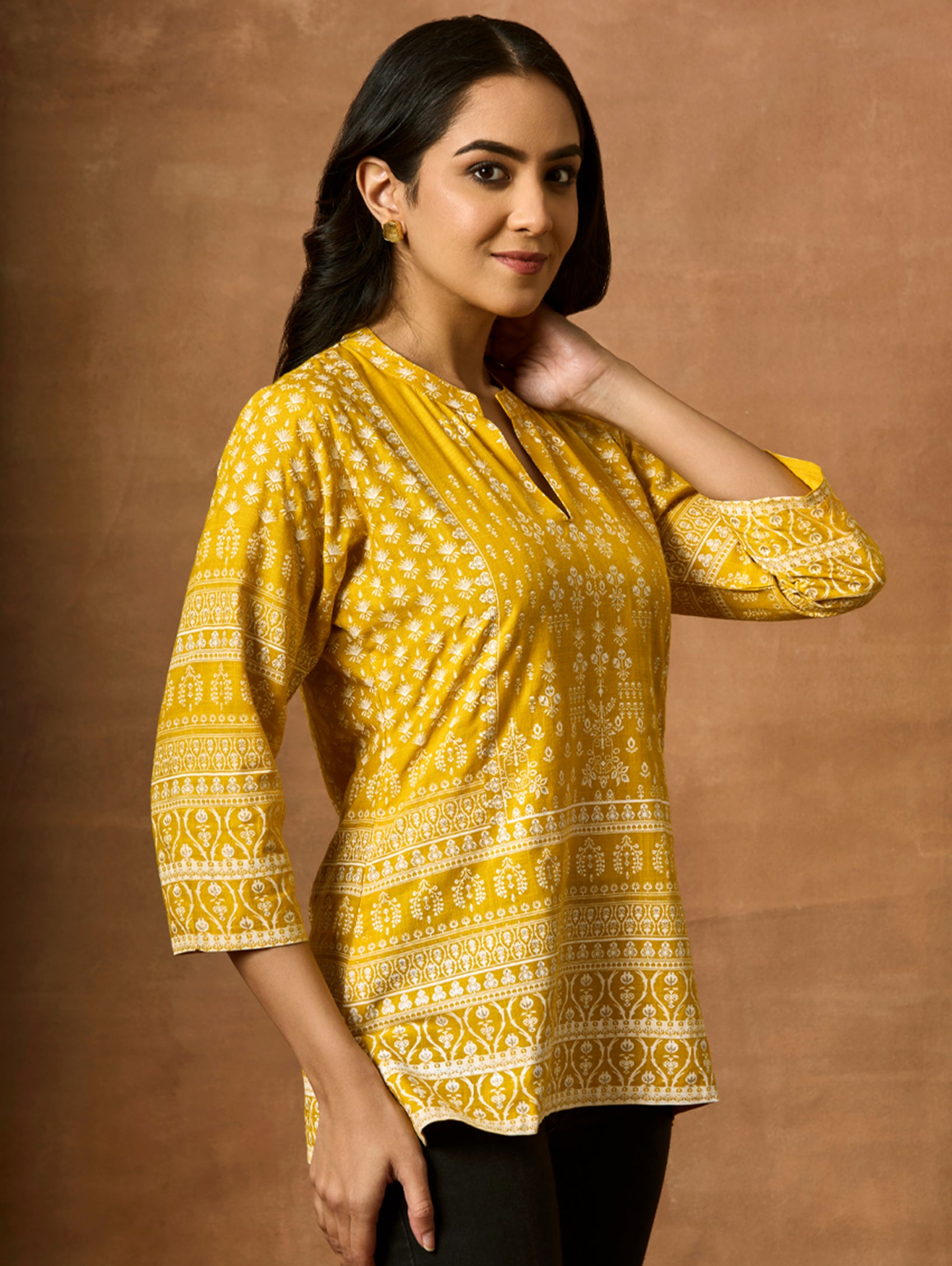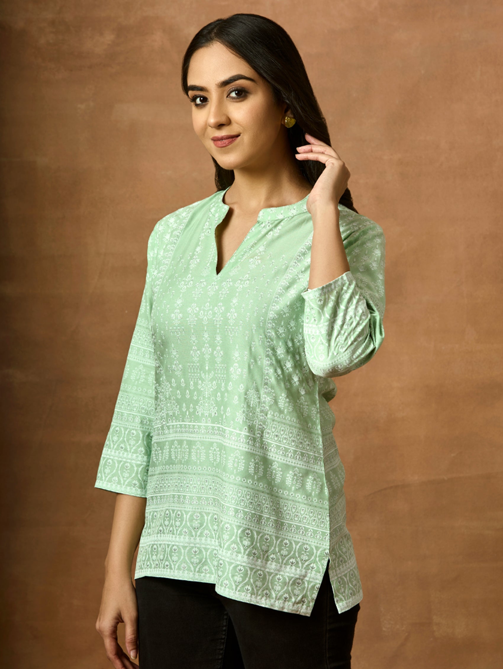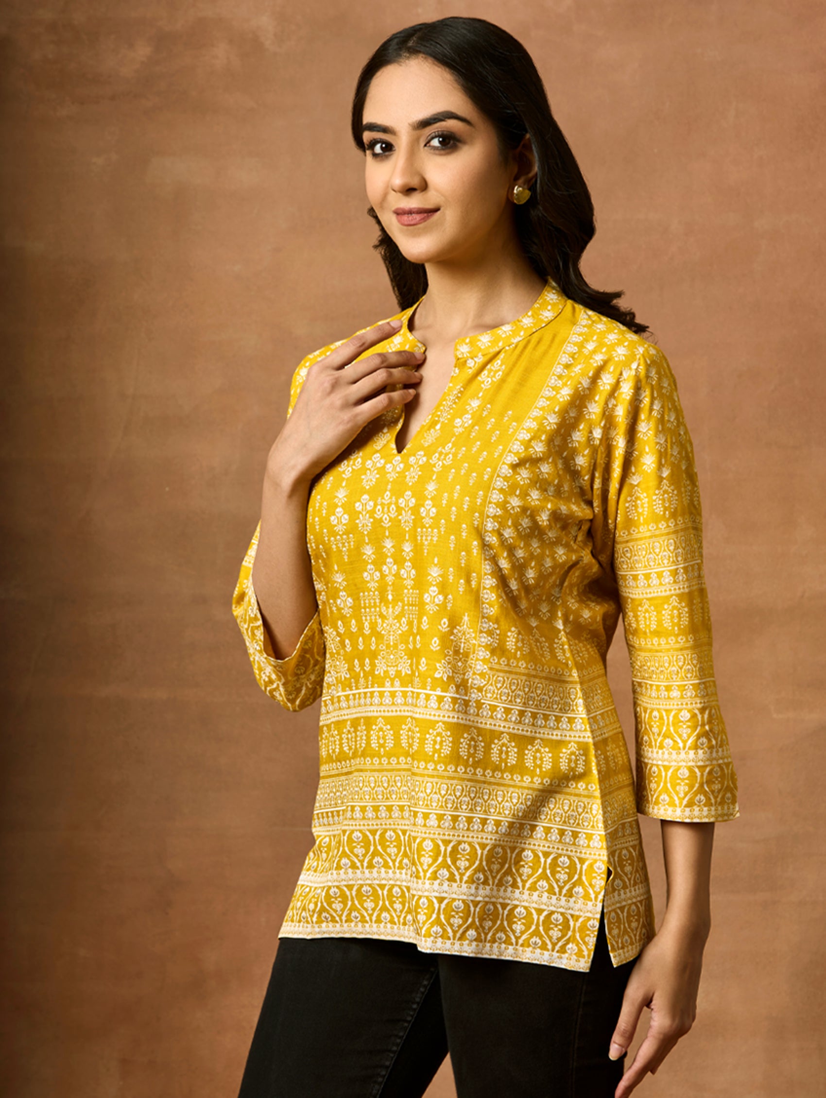 Step up your fashion game with our latest addition - a printed viscose rayon tunic featuring a ban collar and three-fourth sleeves. Embrace this essential ensemble and elevate your style!