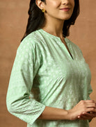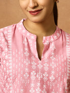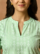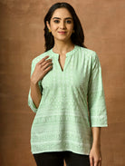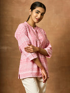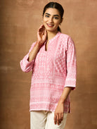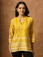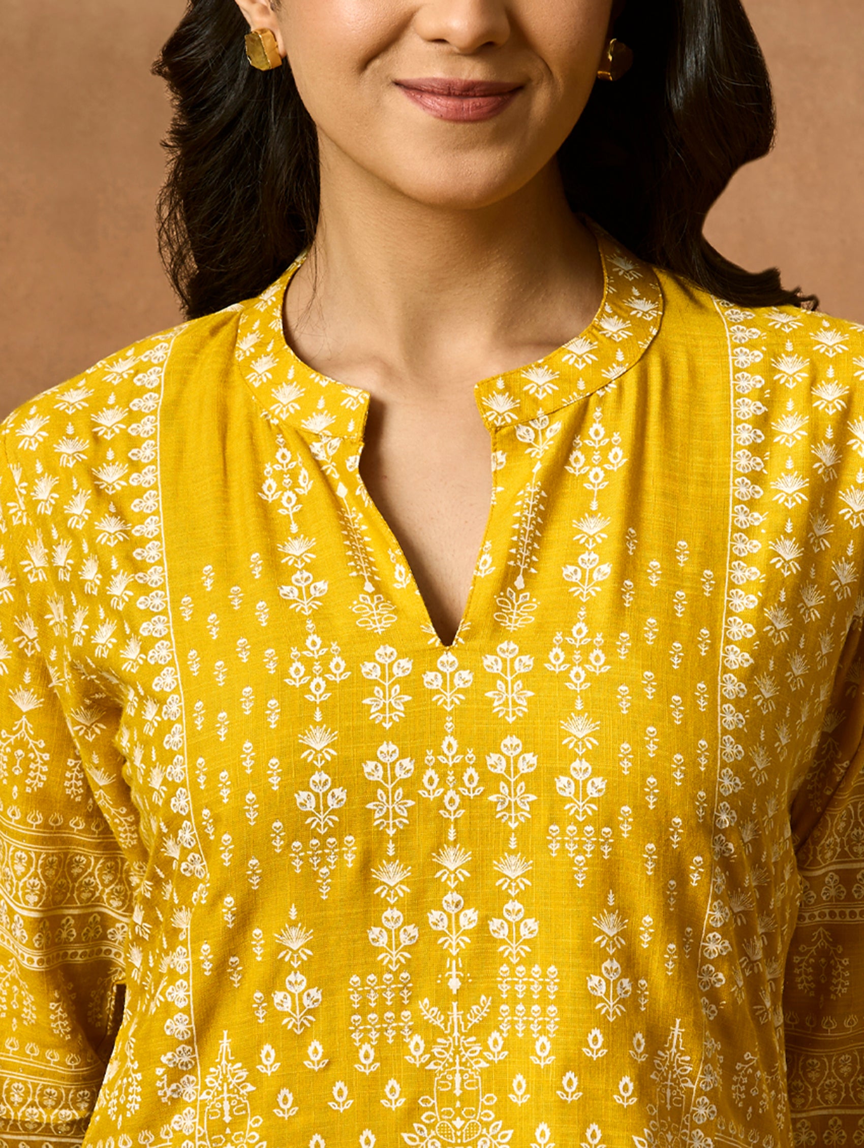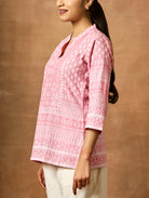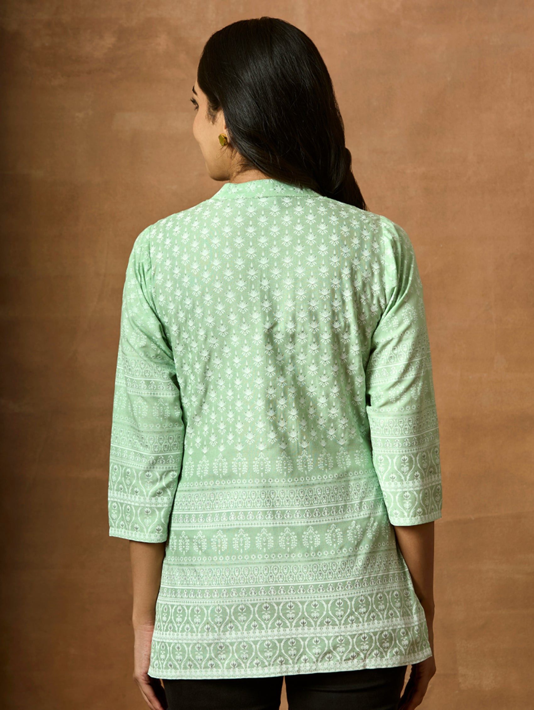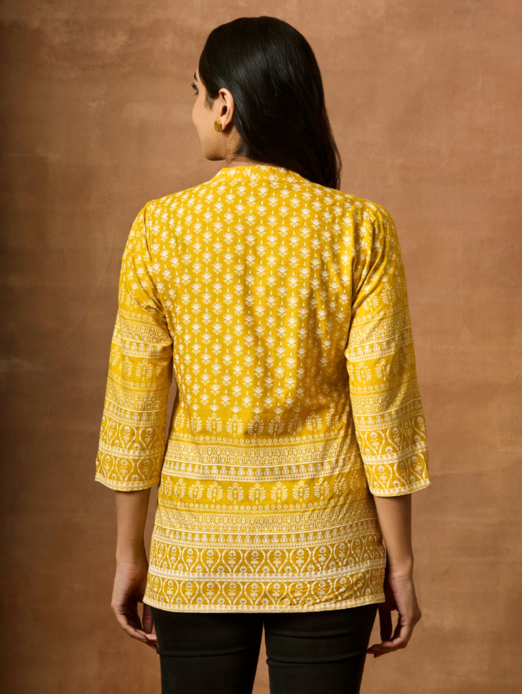 Step up your fashion game with our latest addition - a printed viscose rayon tunic featuring a ban collar and three-fourth sleeves. Embrace this essential ensemble and elevate your style!