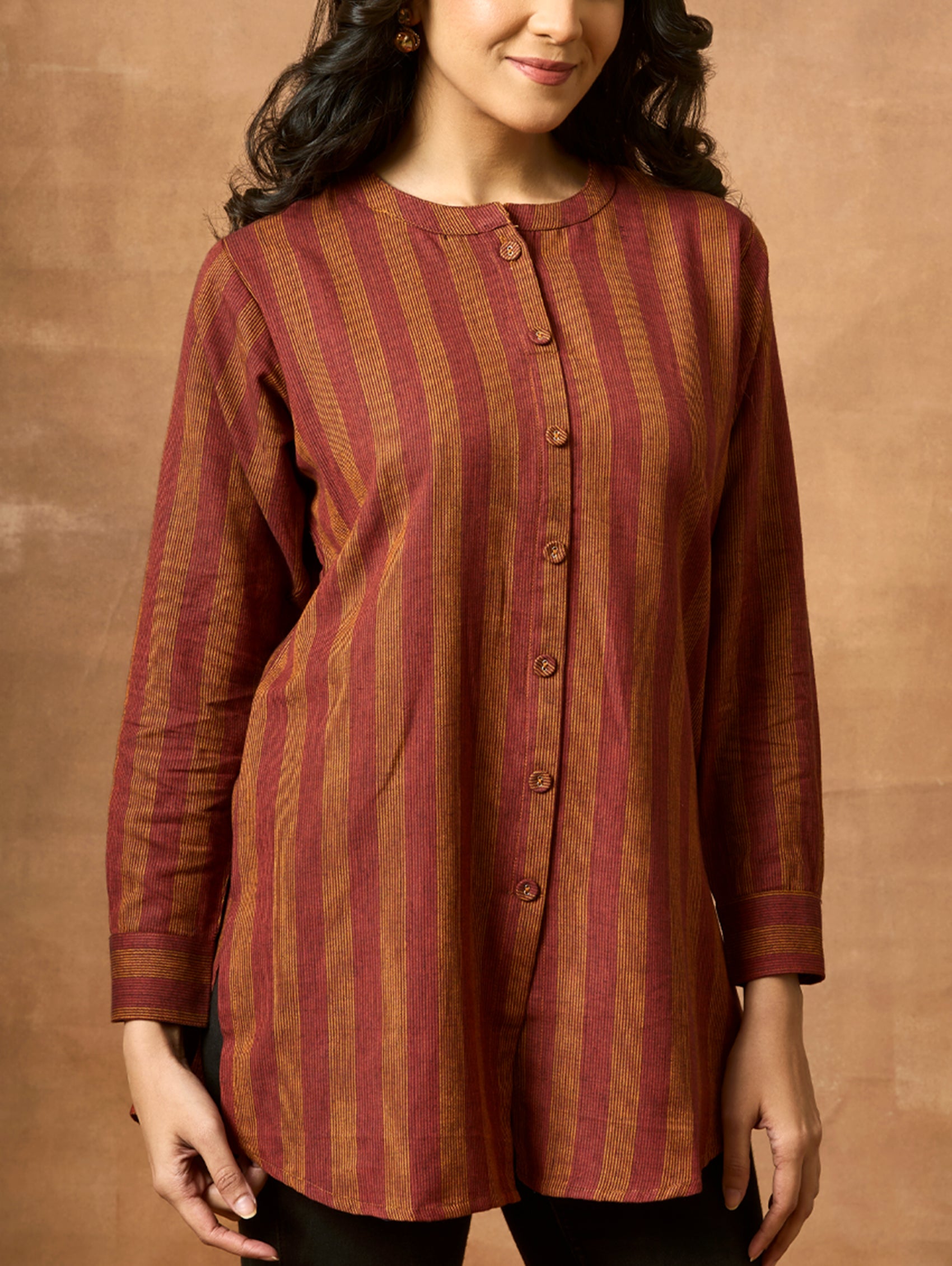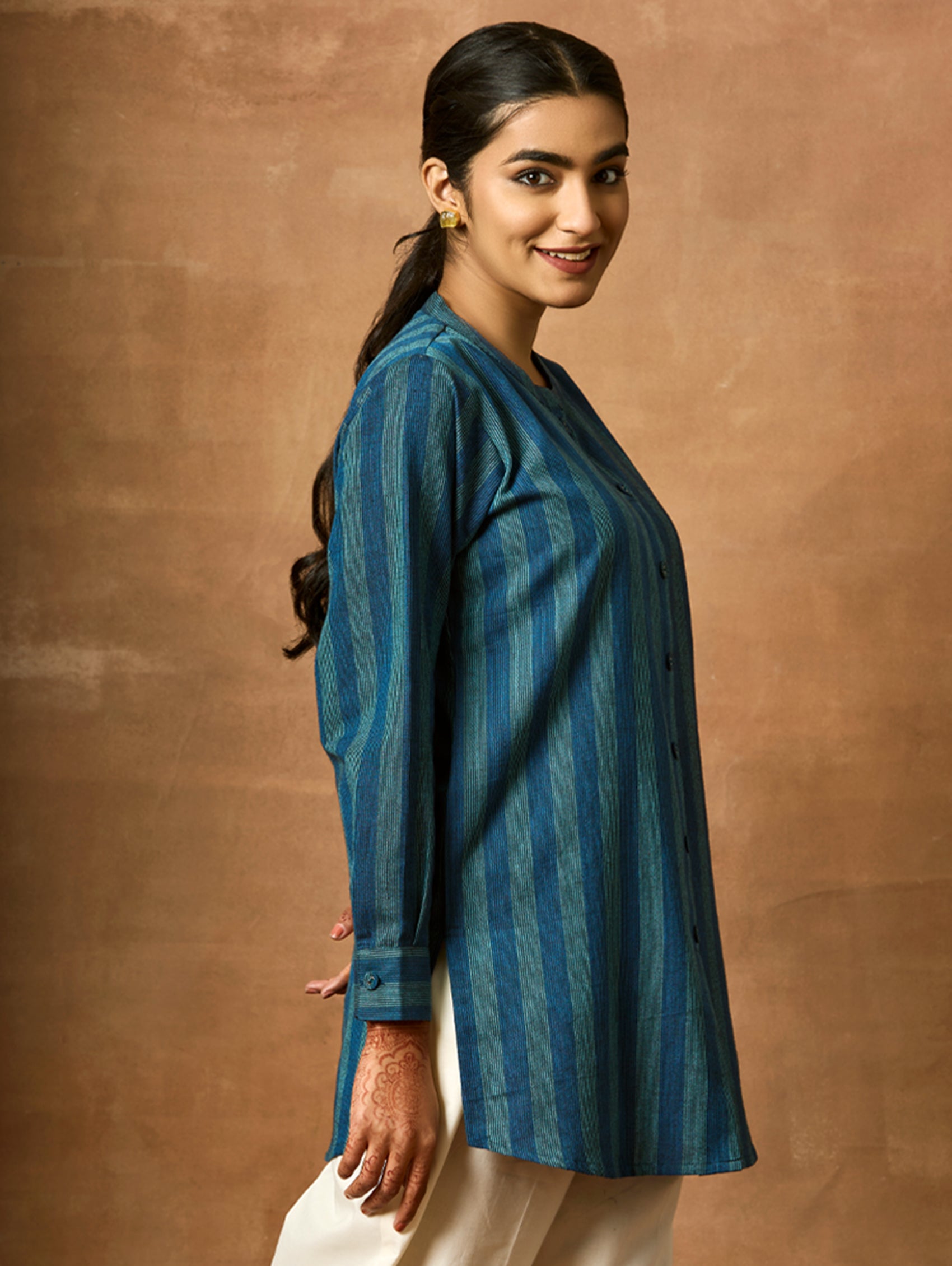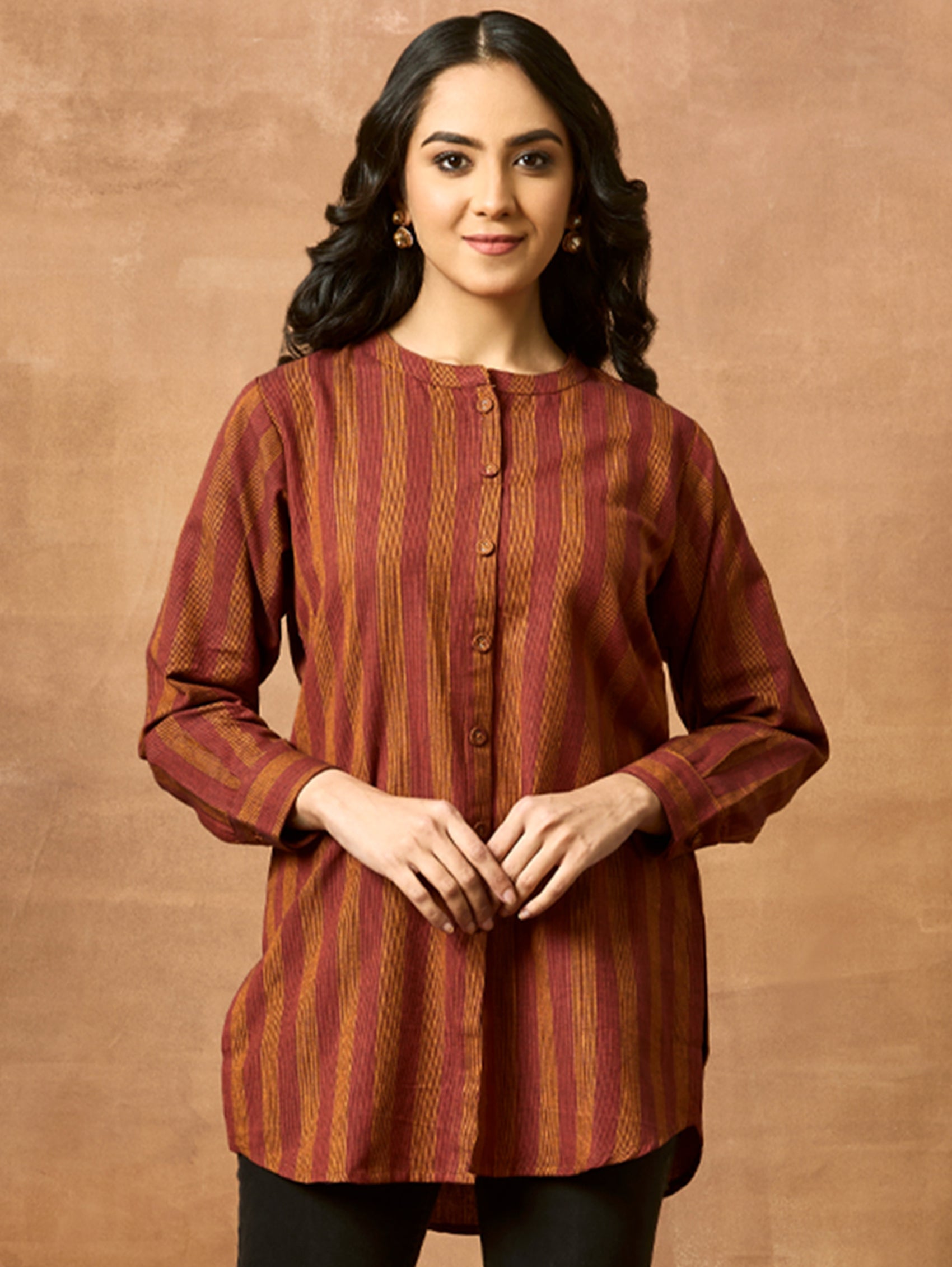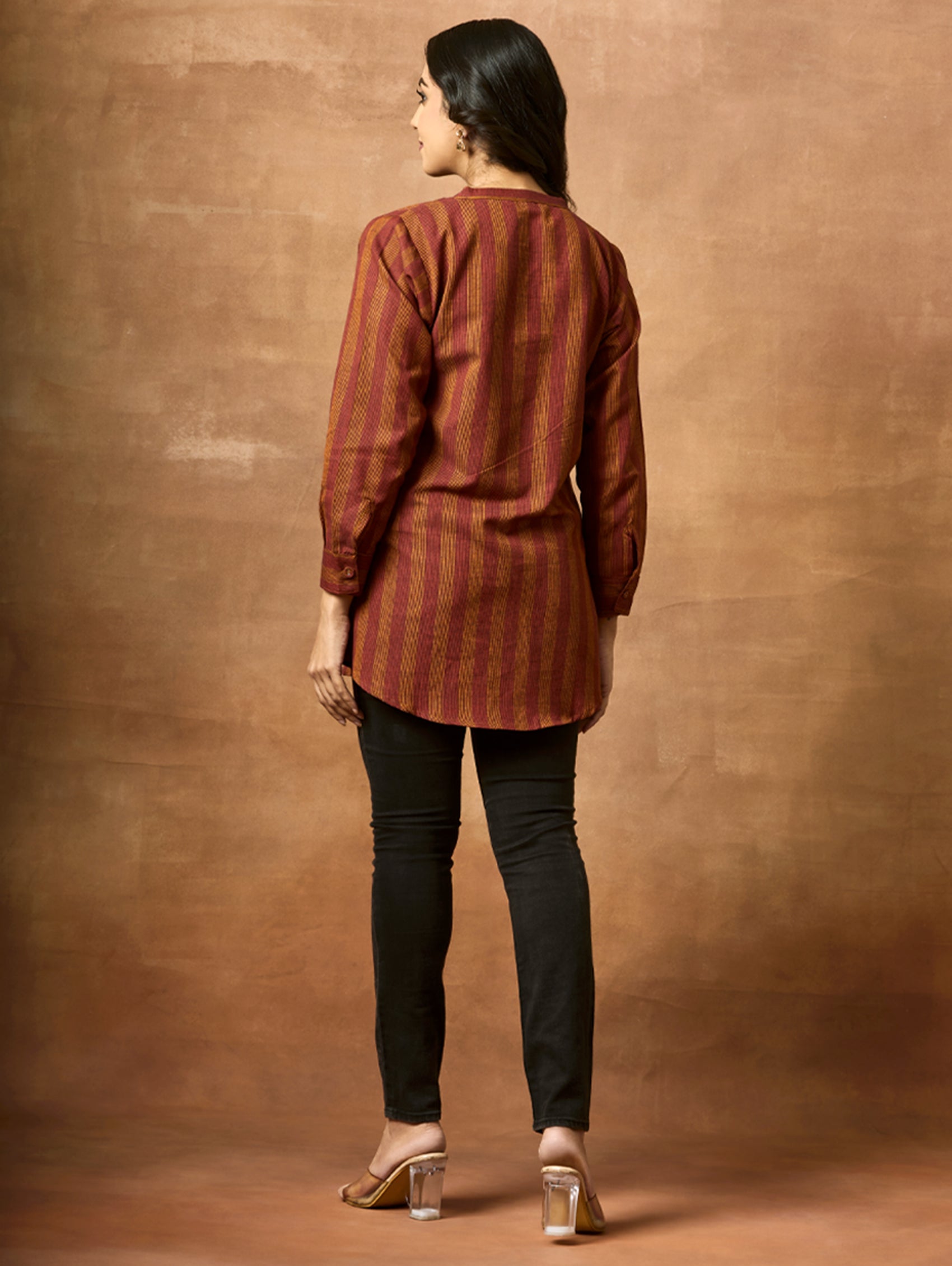 • Short Kurti with mandarin collar, full sleeves, and side slits open