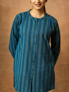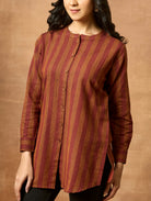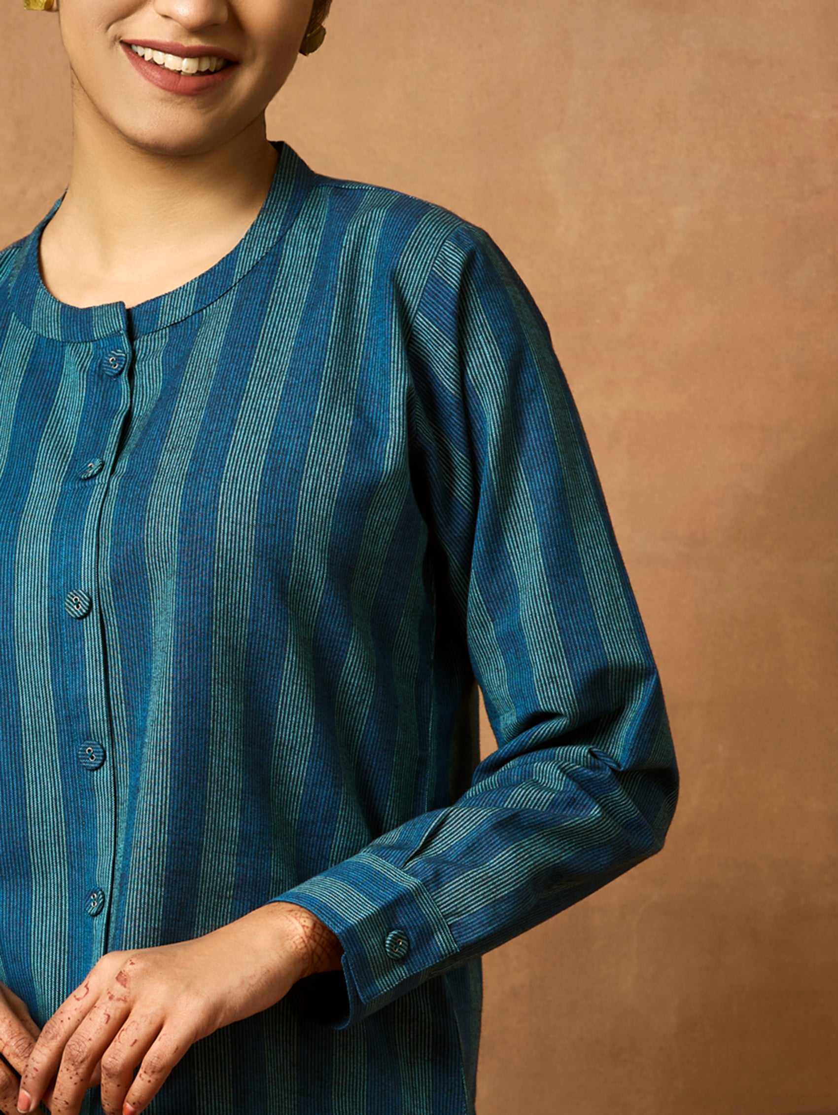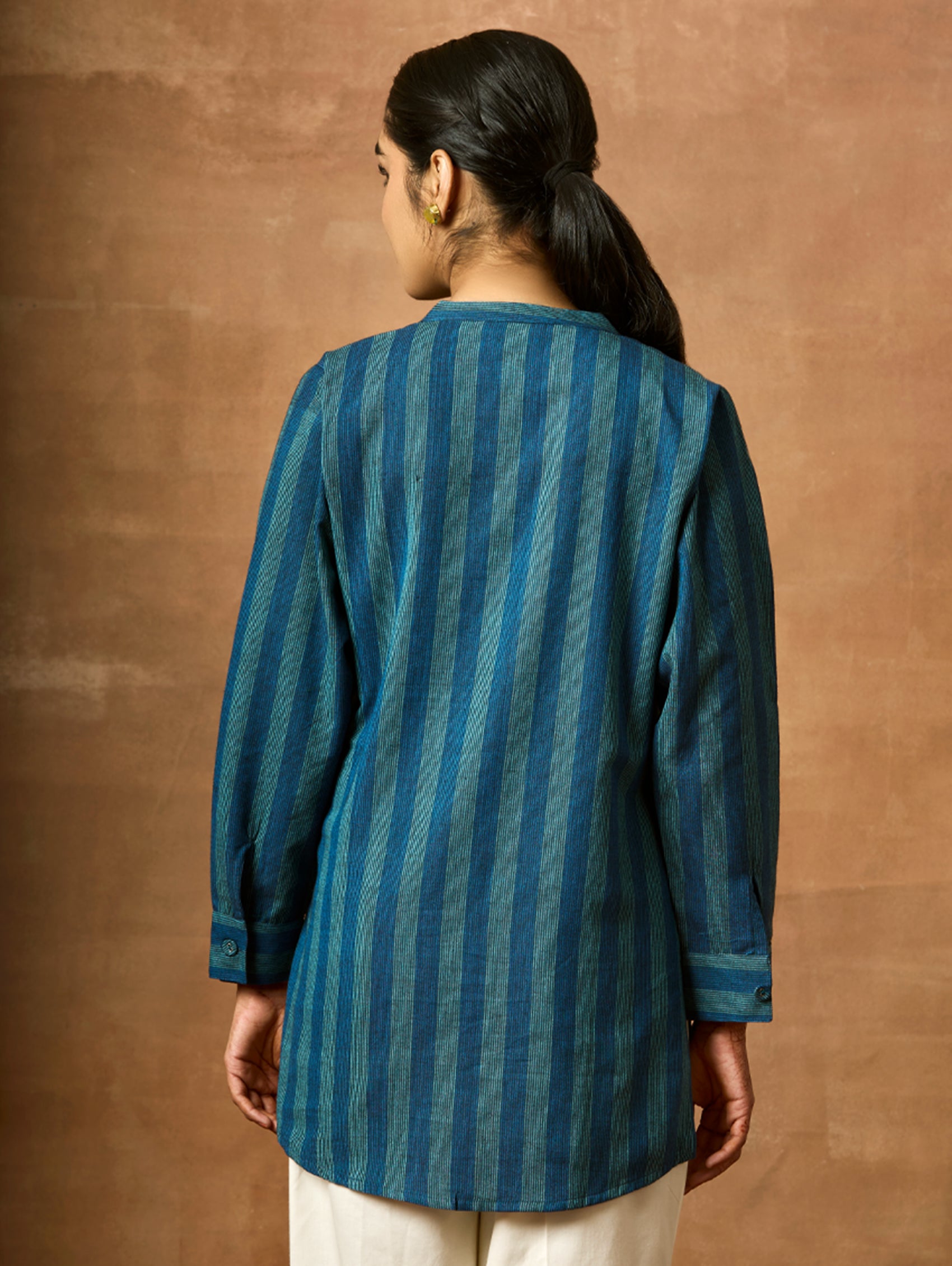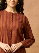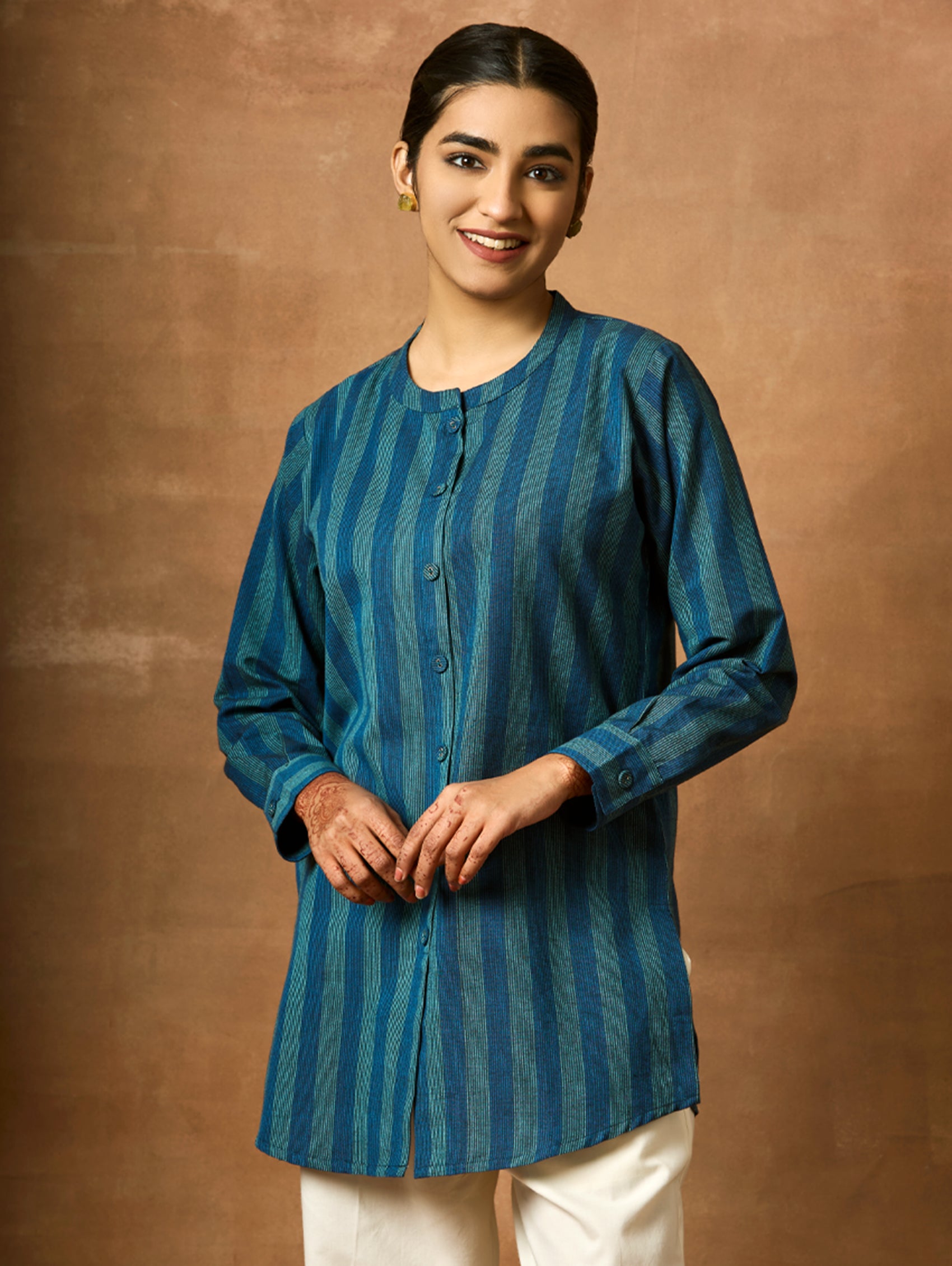 • Short Kurti with mandarin collar, full sleeves, and side slits open