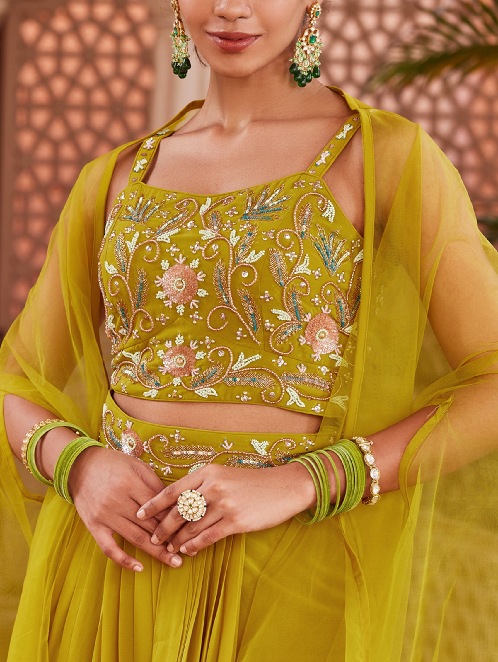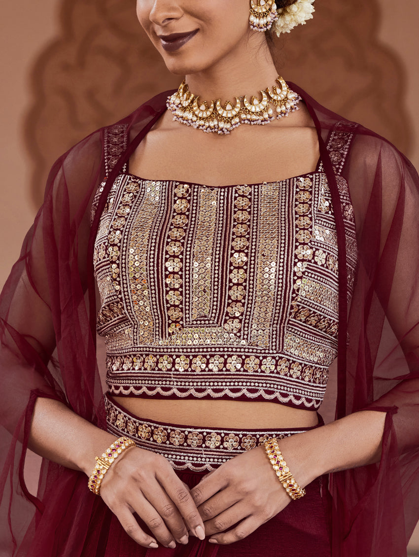This outfit includes a georgette crop top with a shantoon lining, matched with a solid petal-style skirt and a delicate net cape. The crop top showcases detailed hand embroidery enhanced by sparkling sequins, adding a touch of sophistication.