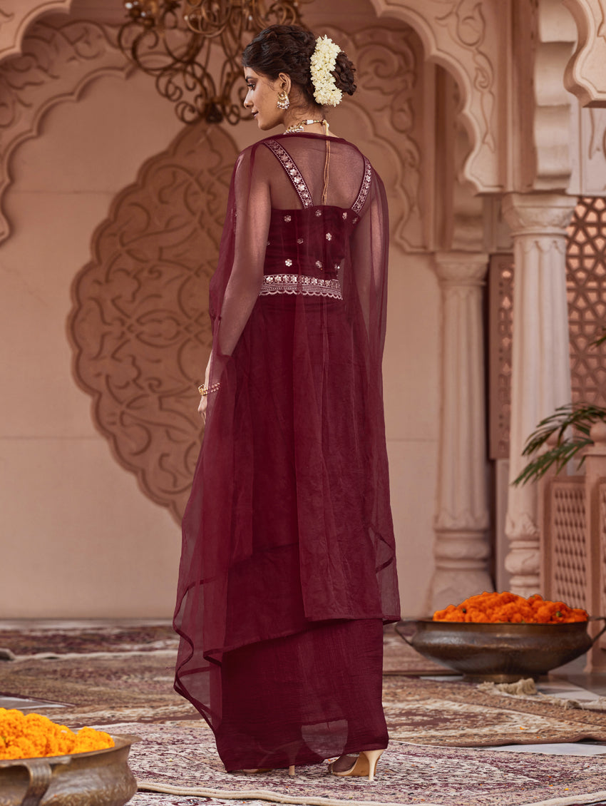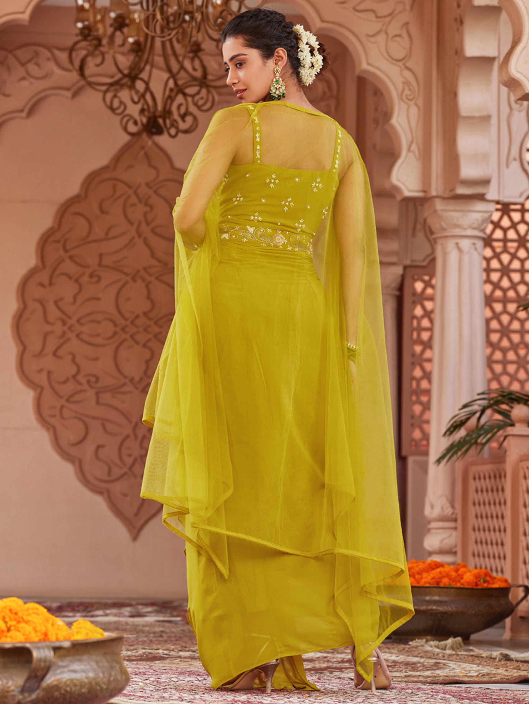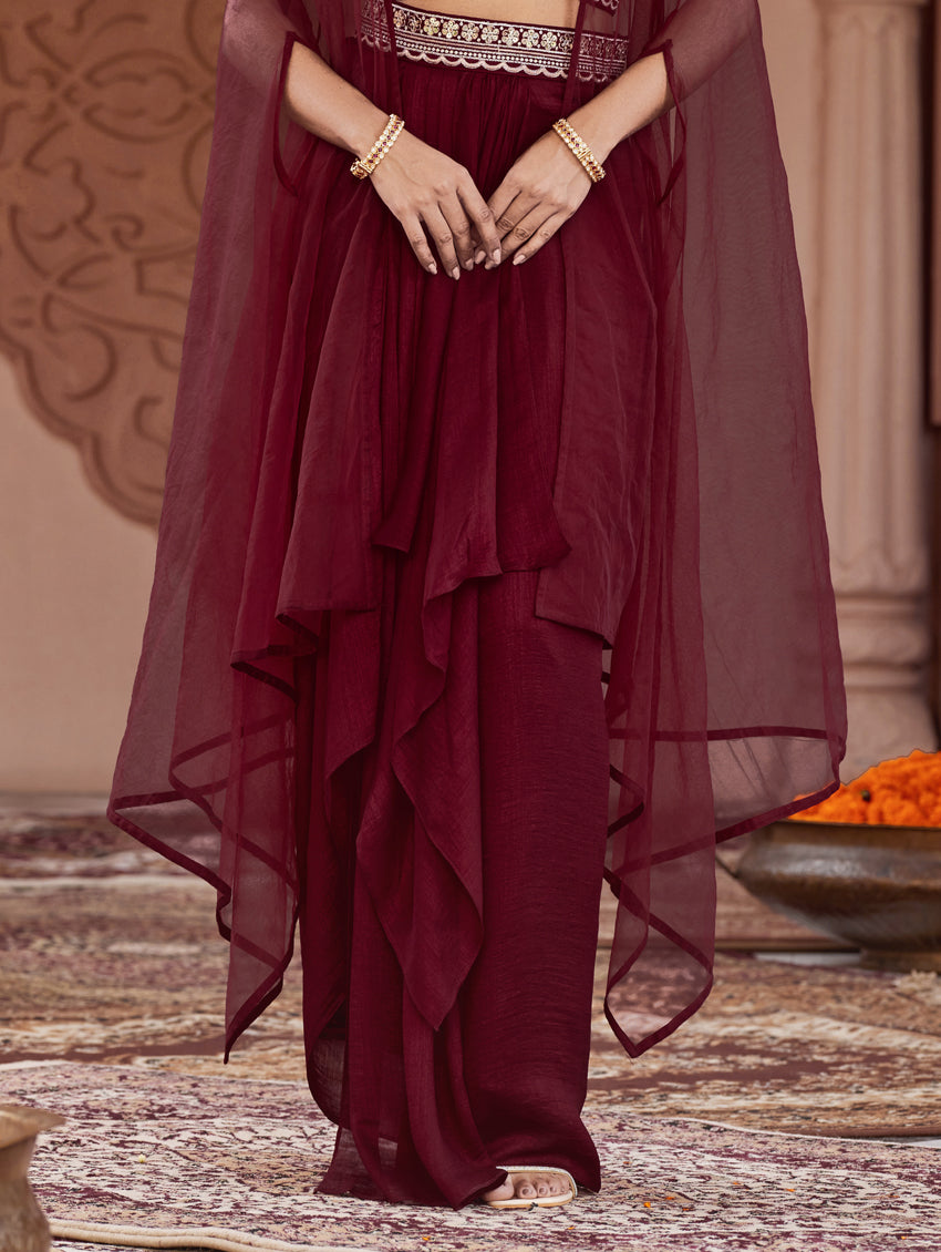 • Embroidered crop top in georgette with a petal-style skirt and cape.