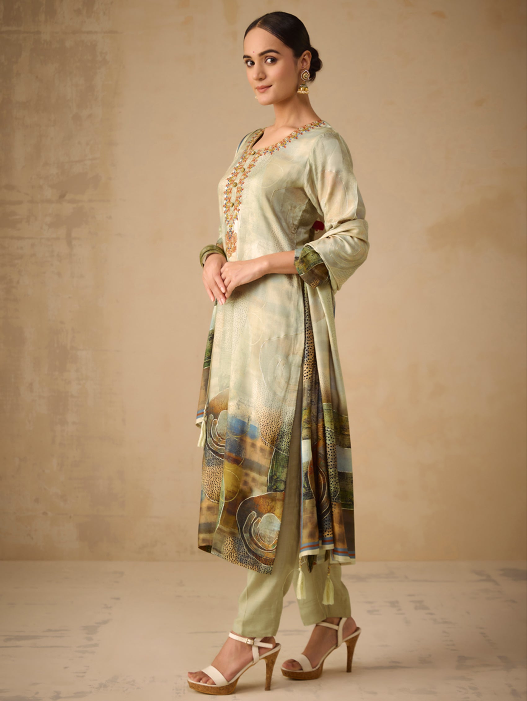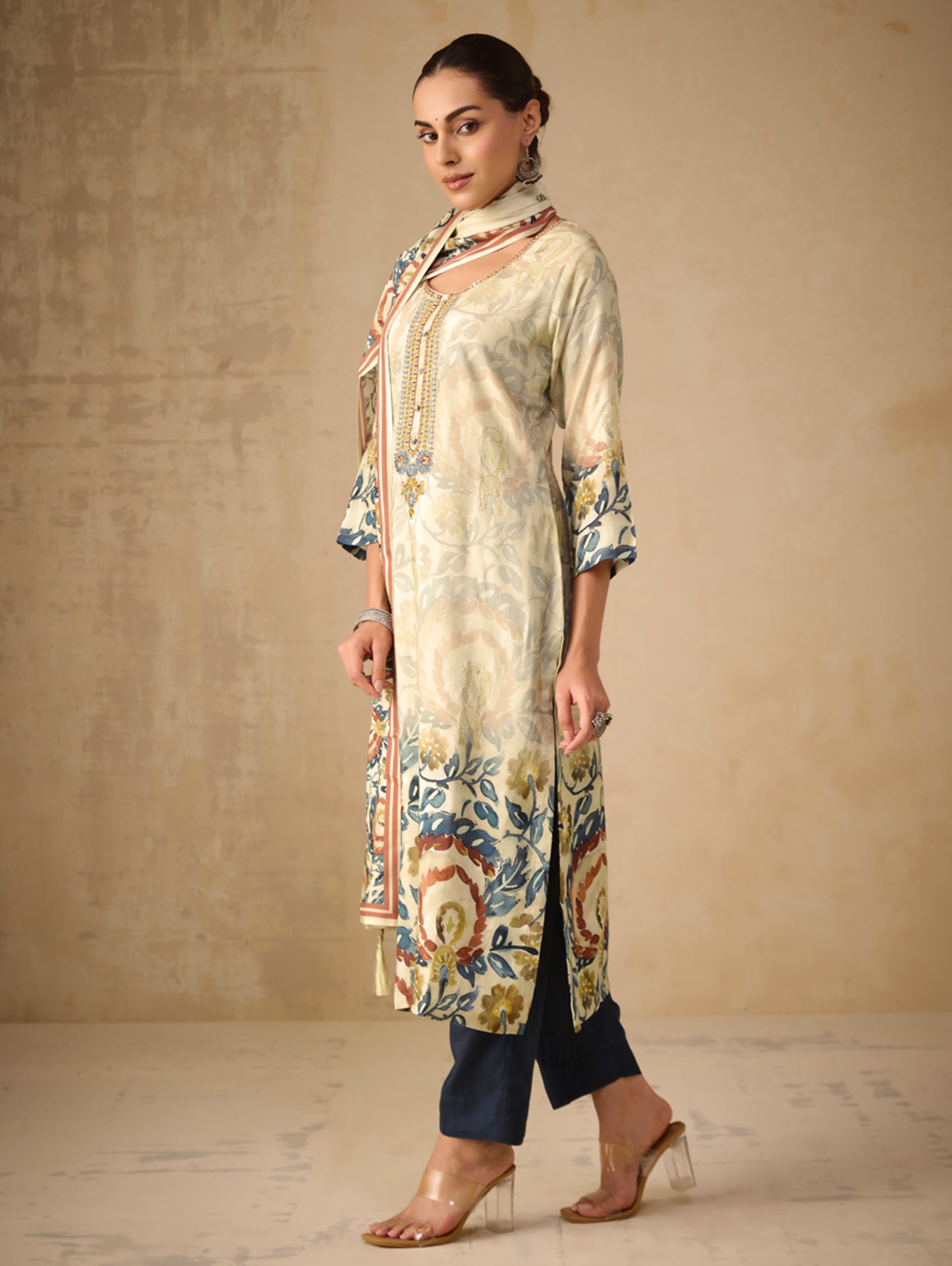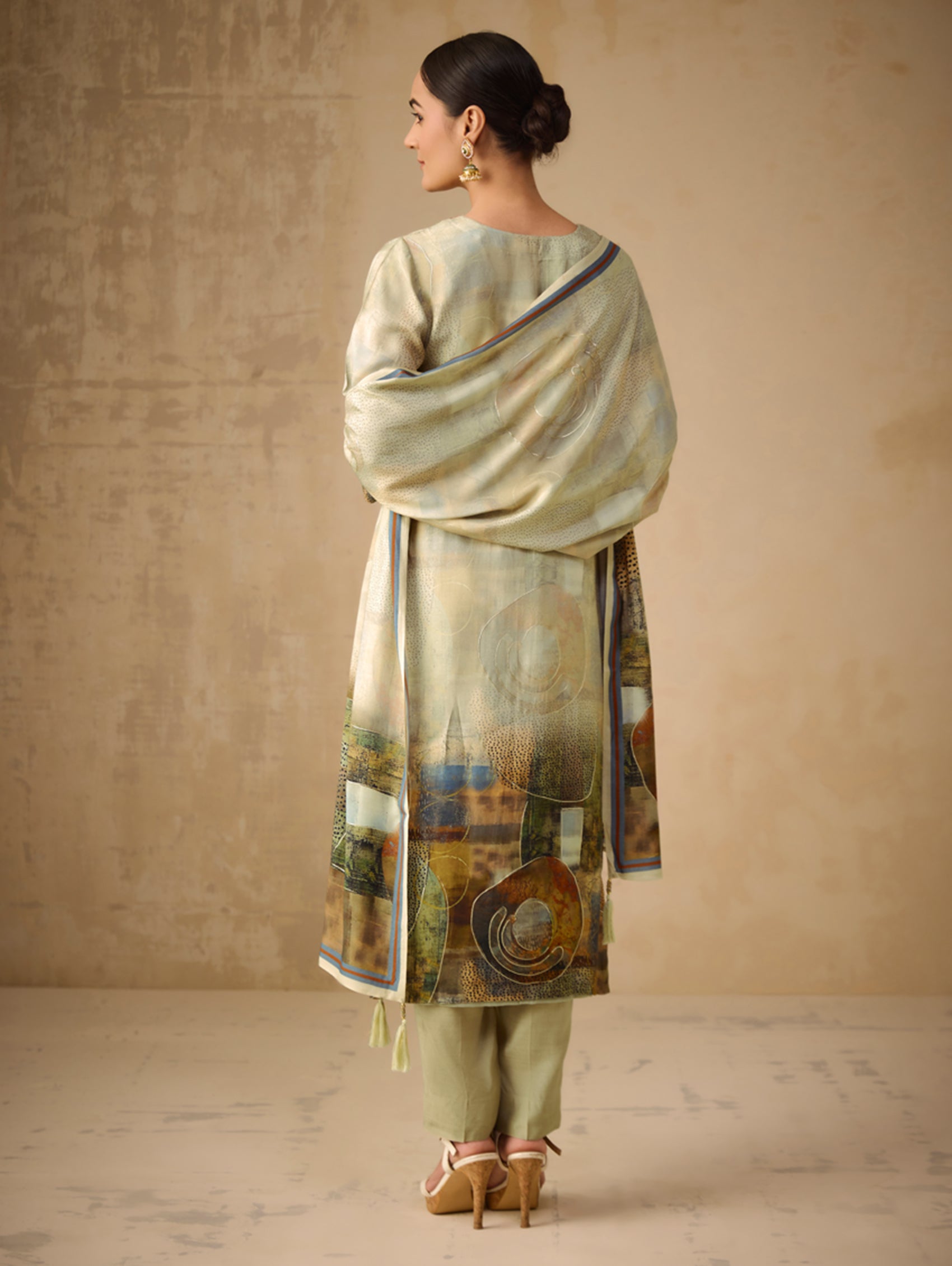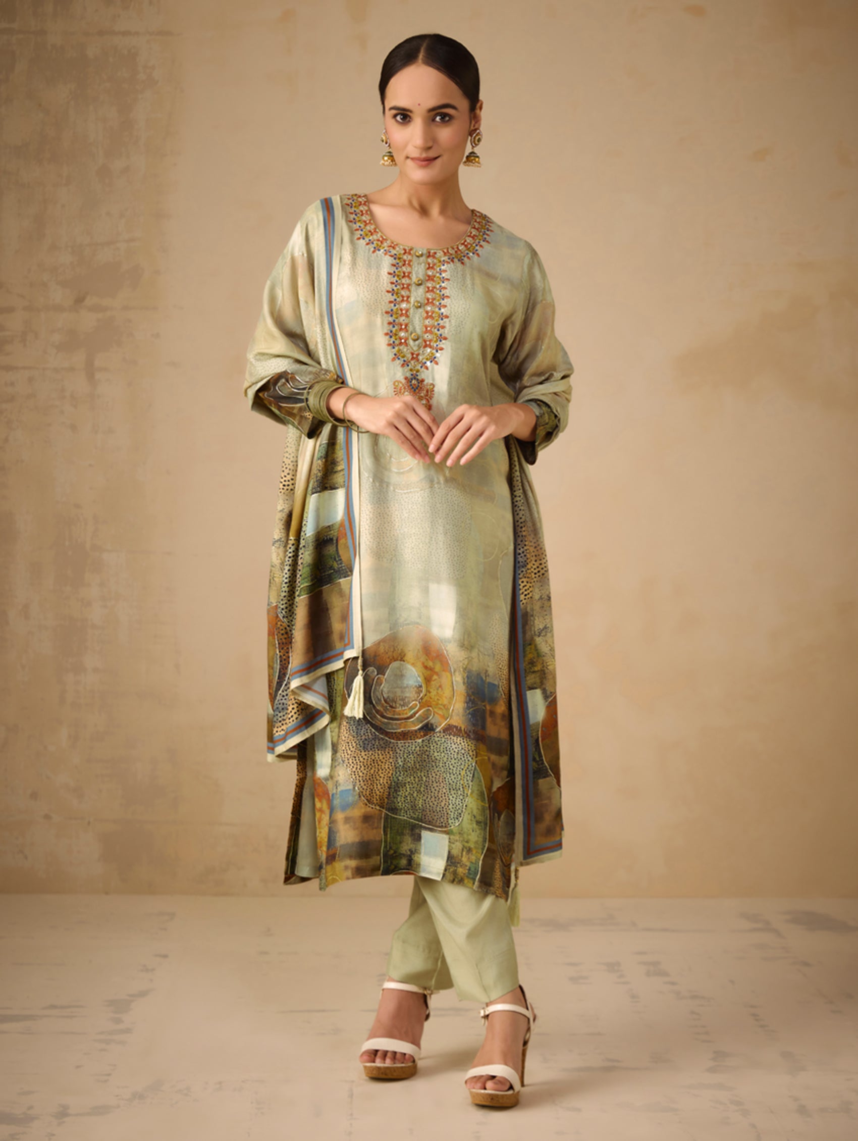 • Digitally Printed kurta with pants and digitally printed shimmer silk dupatta
