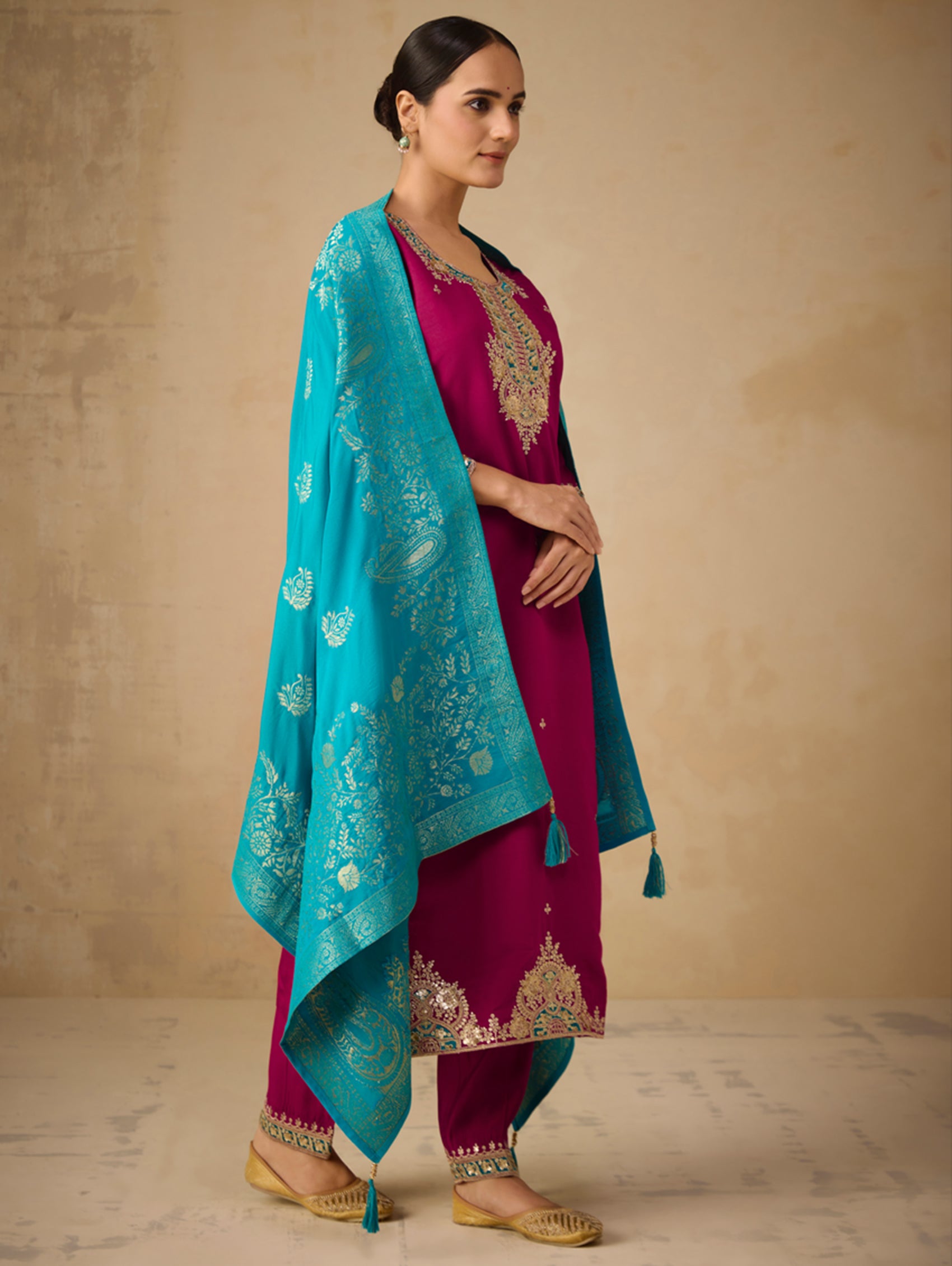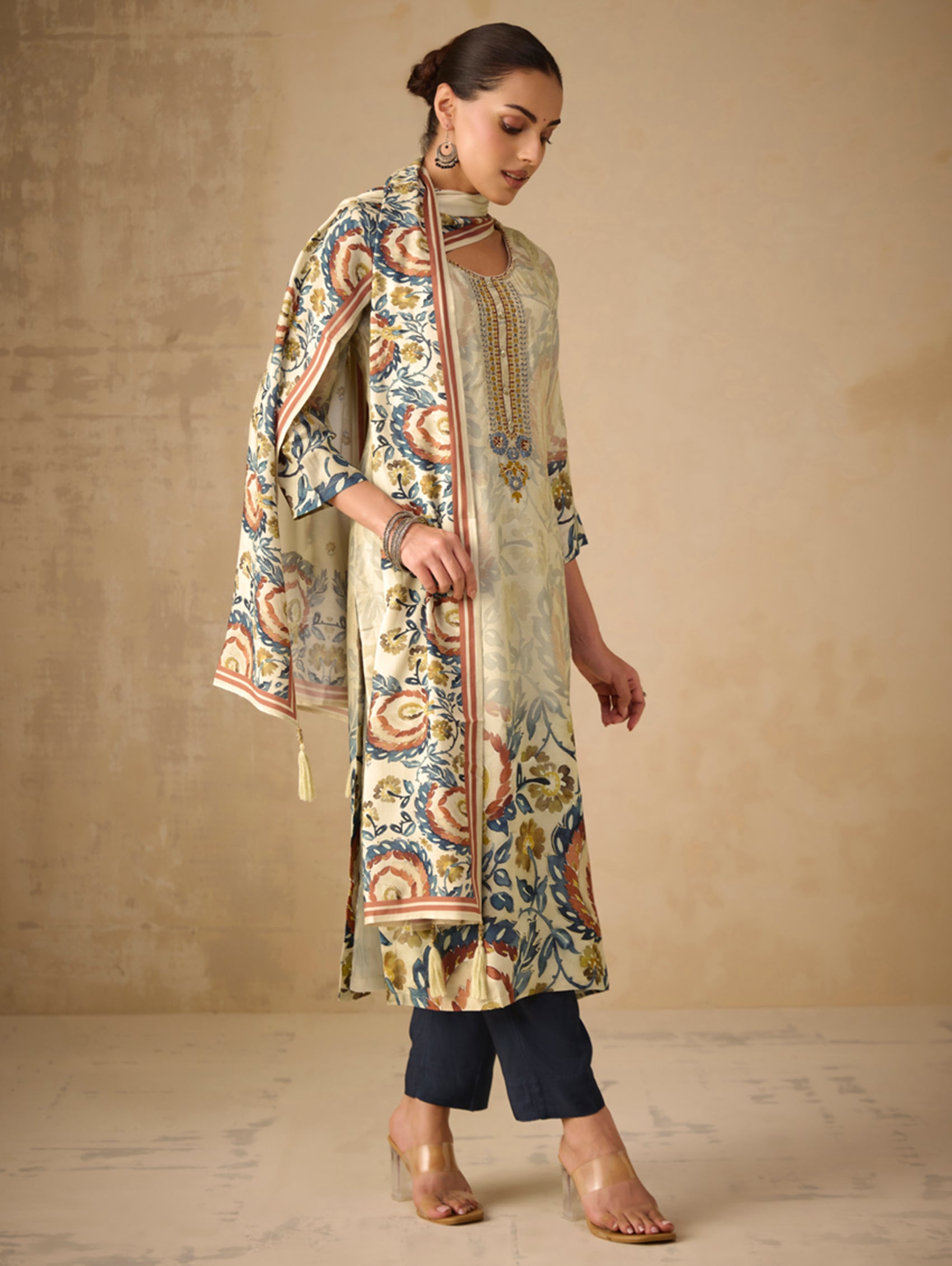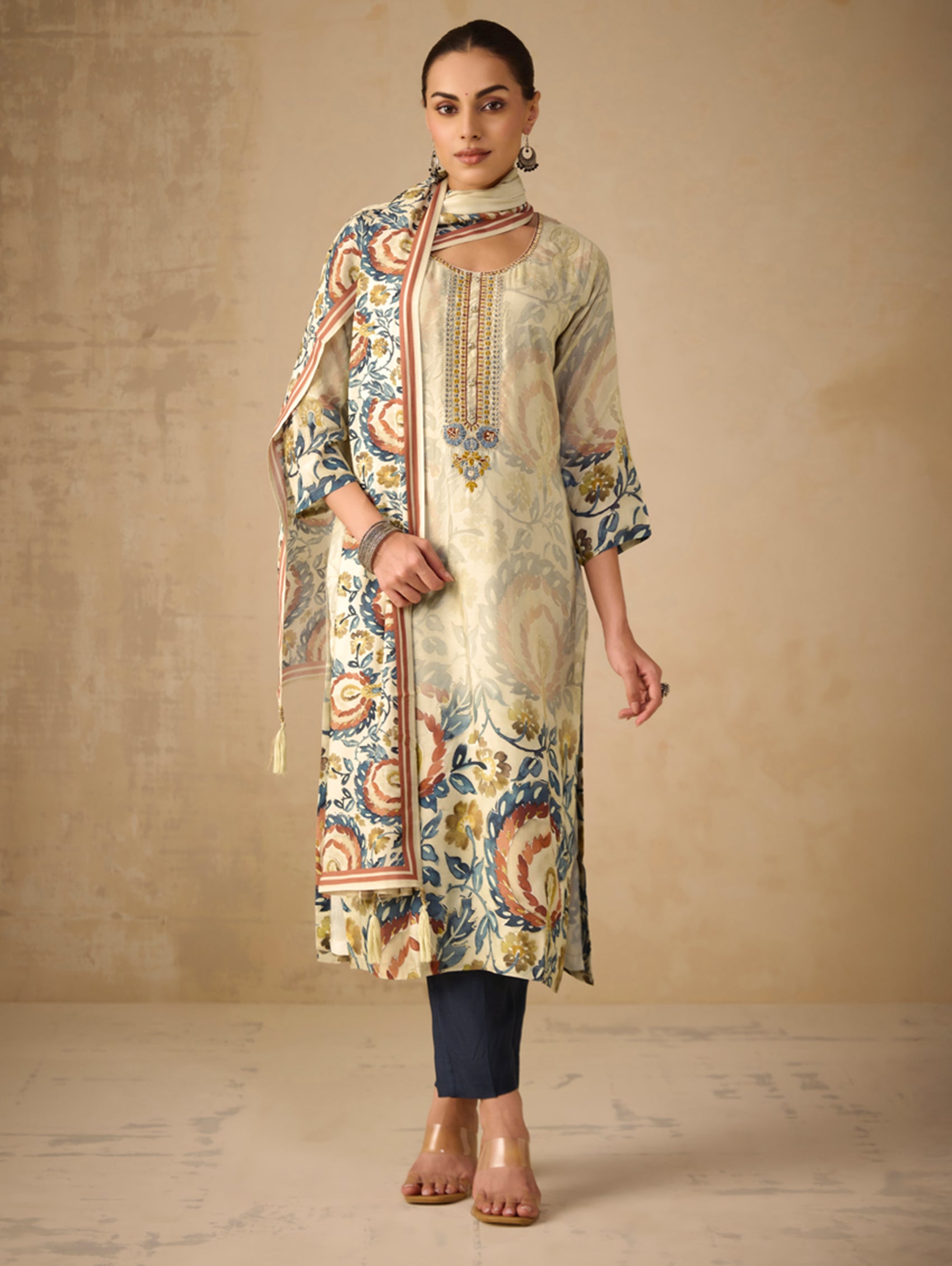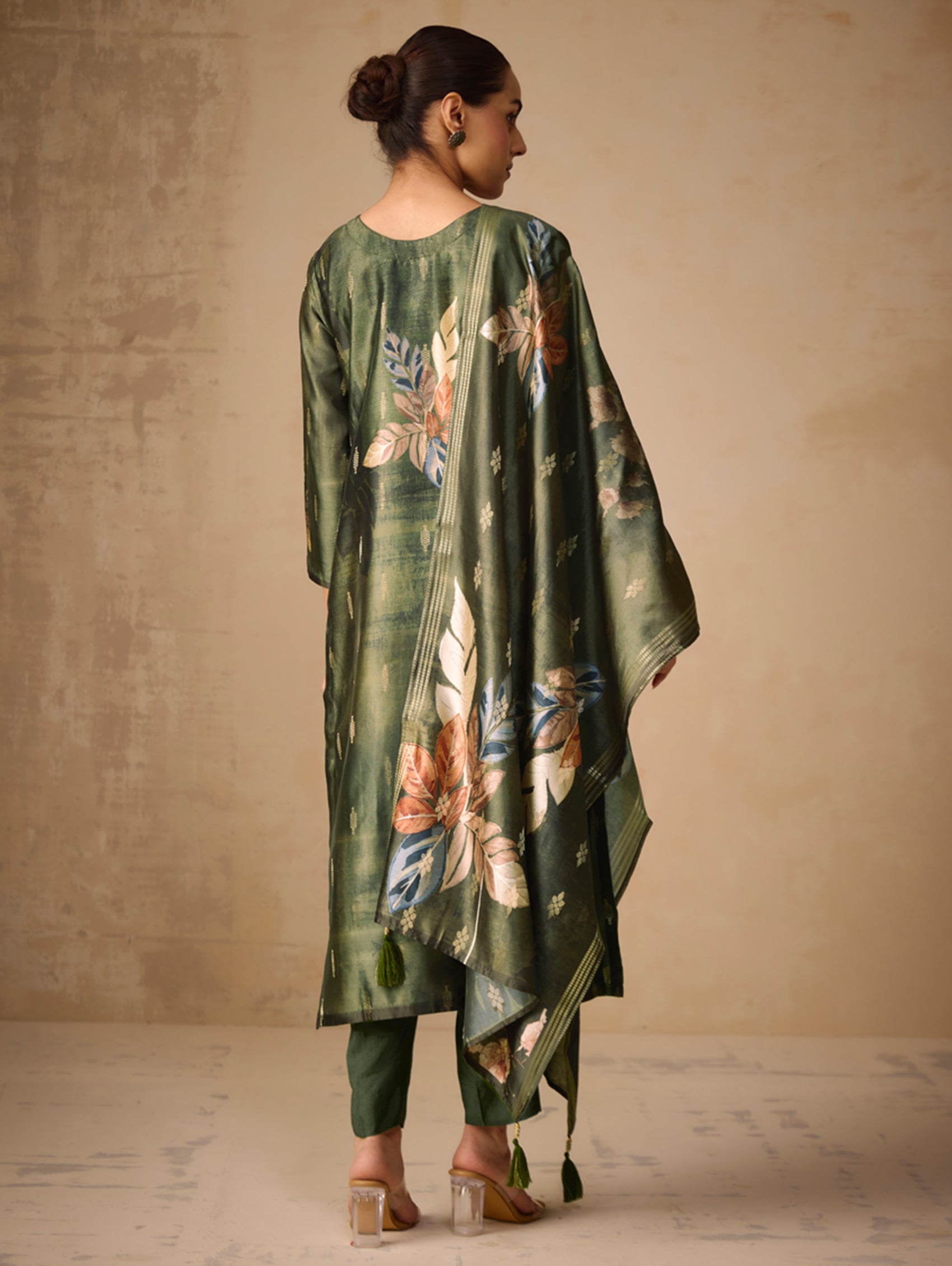 • Digitally Printed kurta with pants and digitally printed shimmer silk dupatta