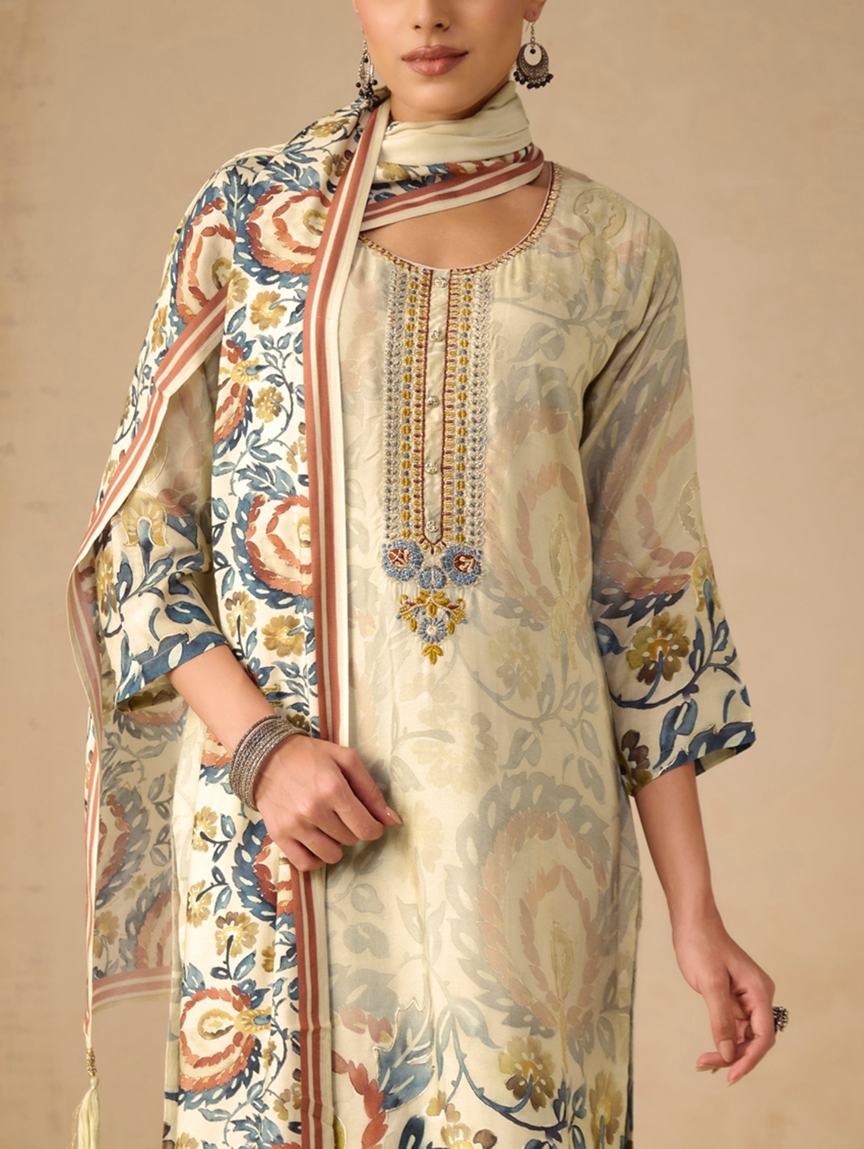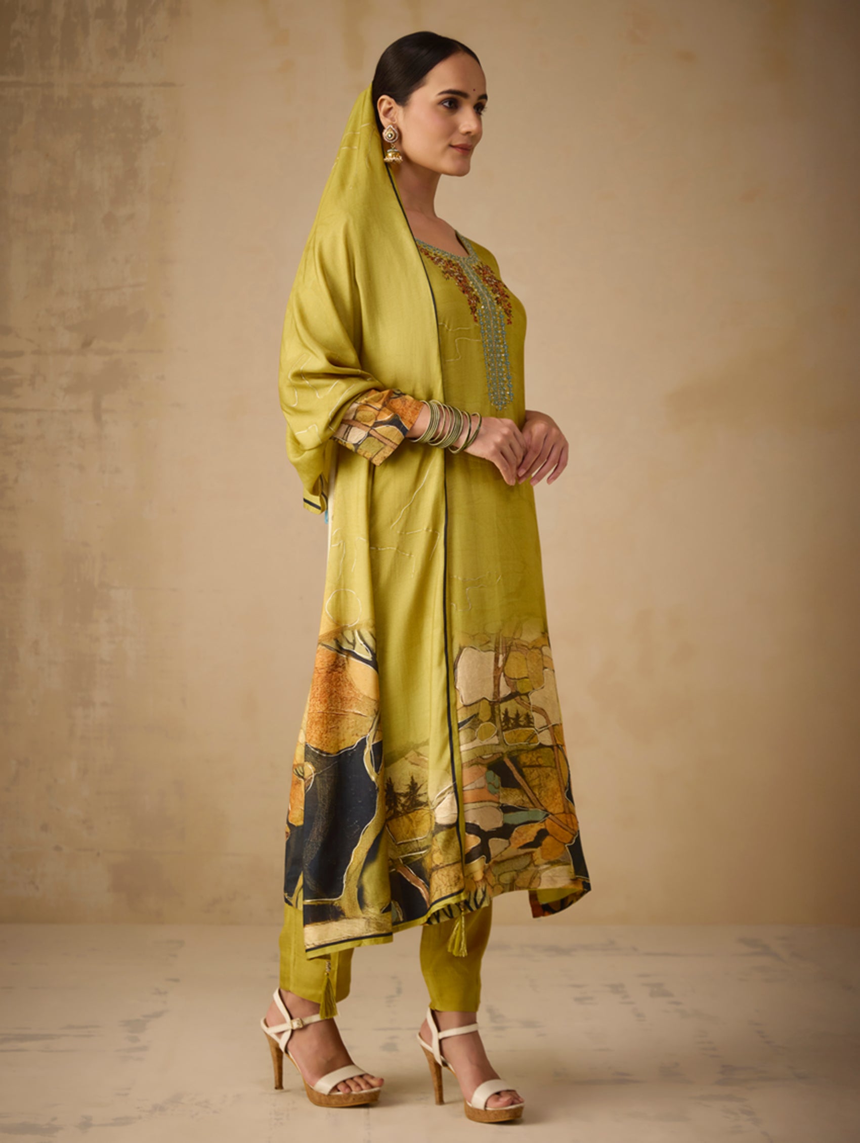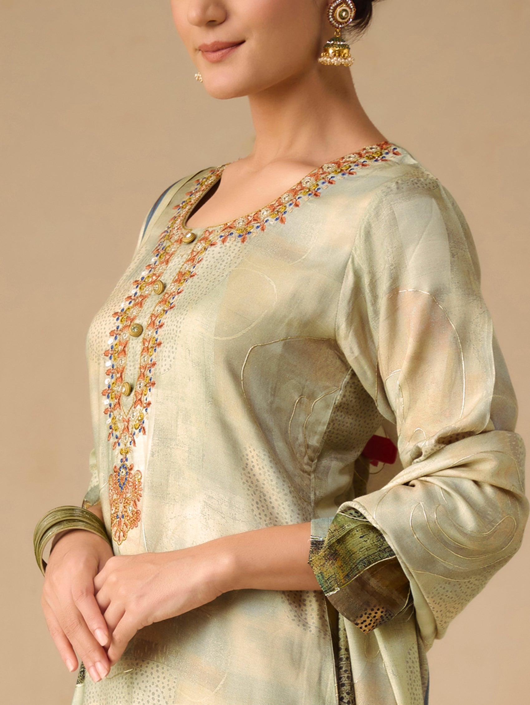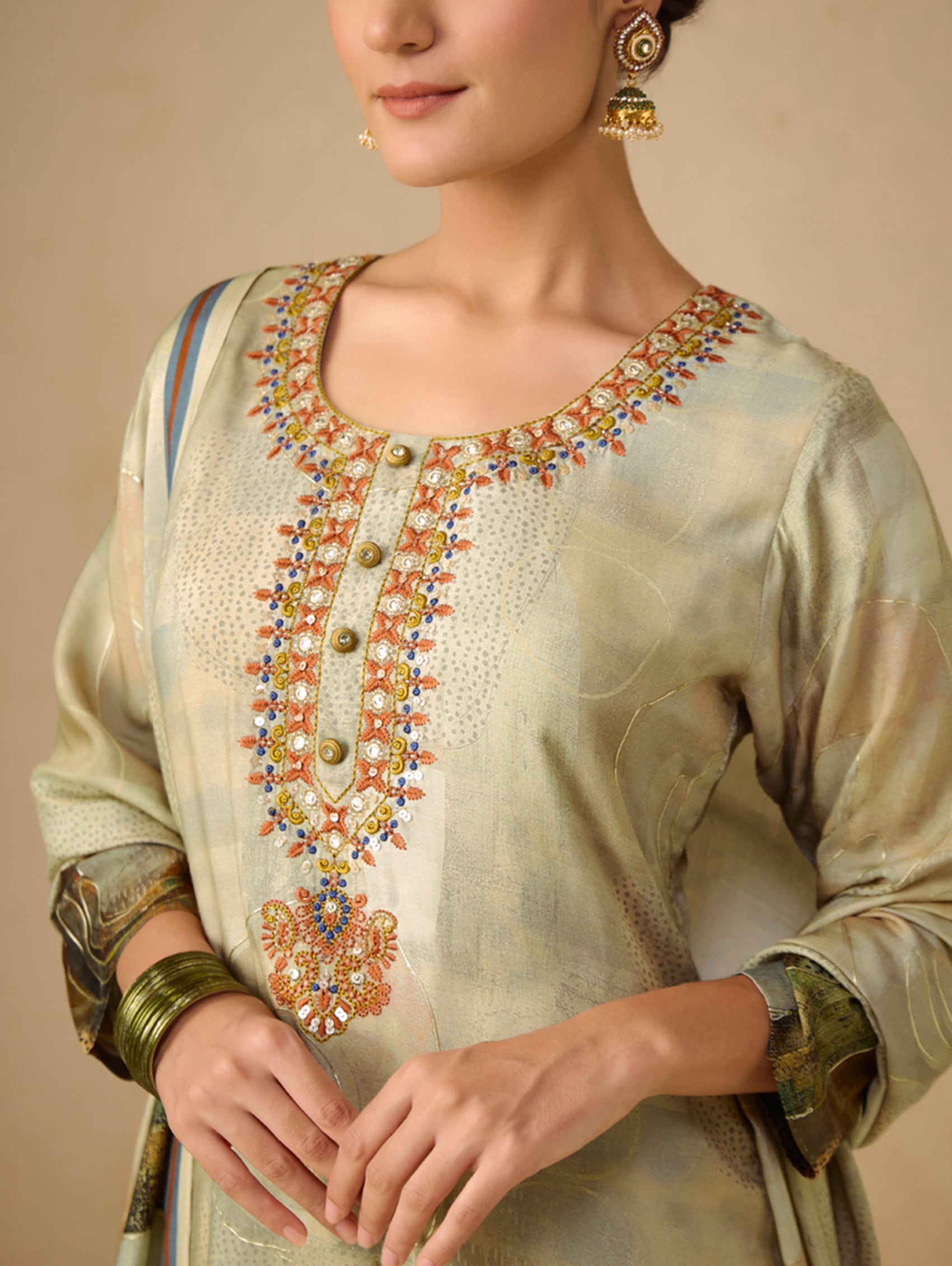 • Digitally Printed kurta with pants and digitally printed shimmer silk dupatta