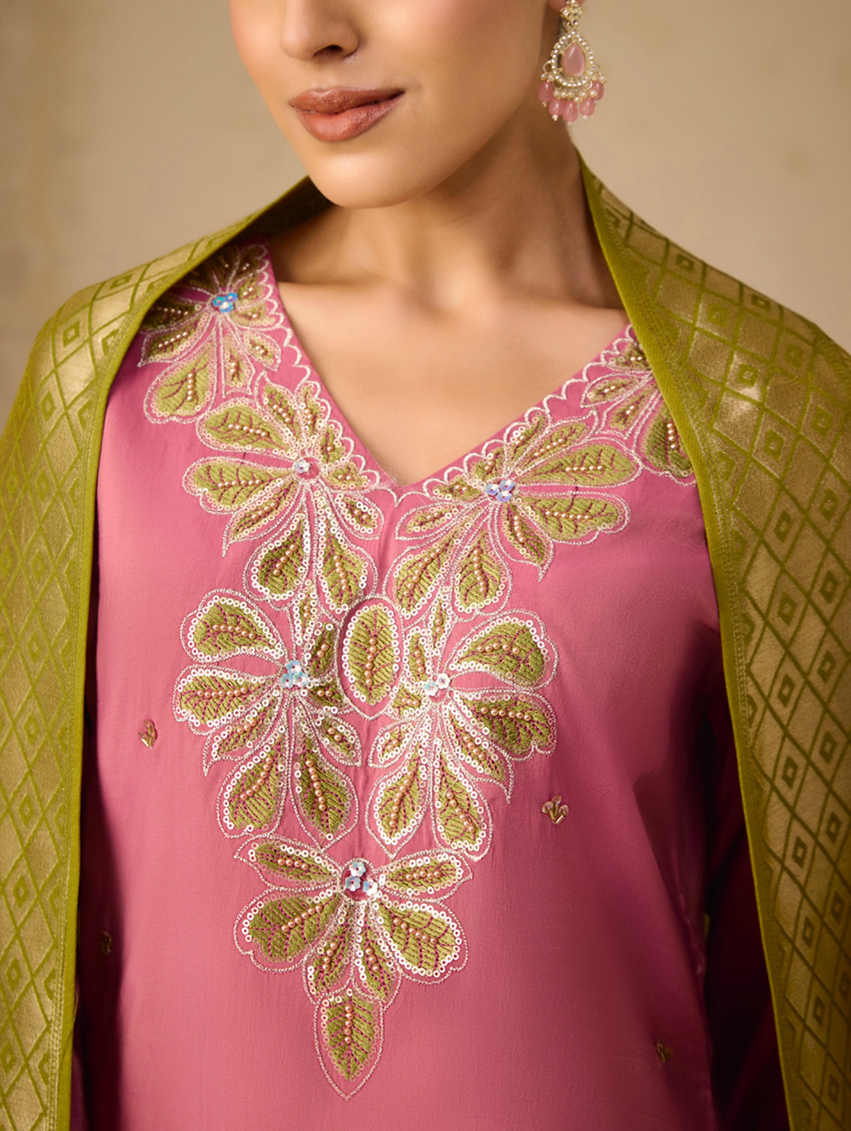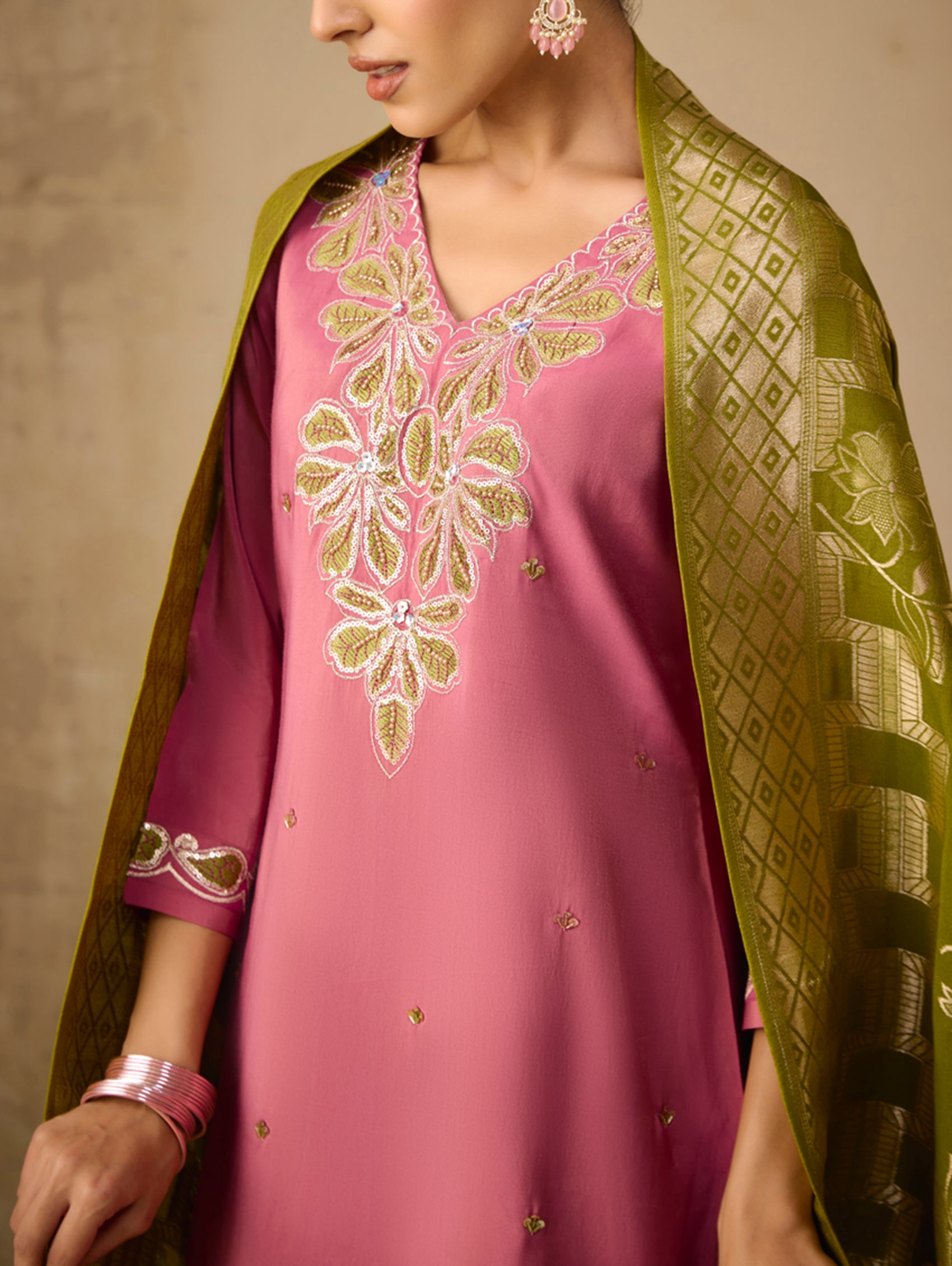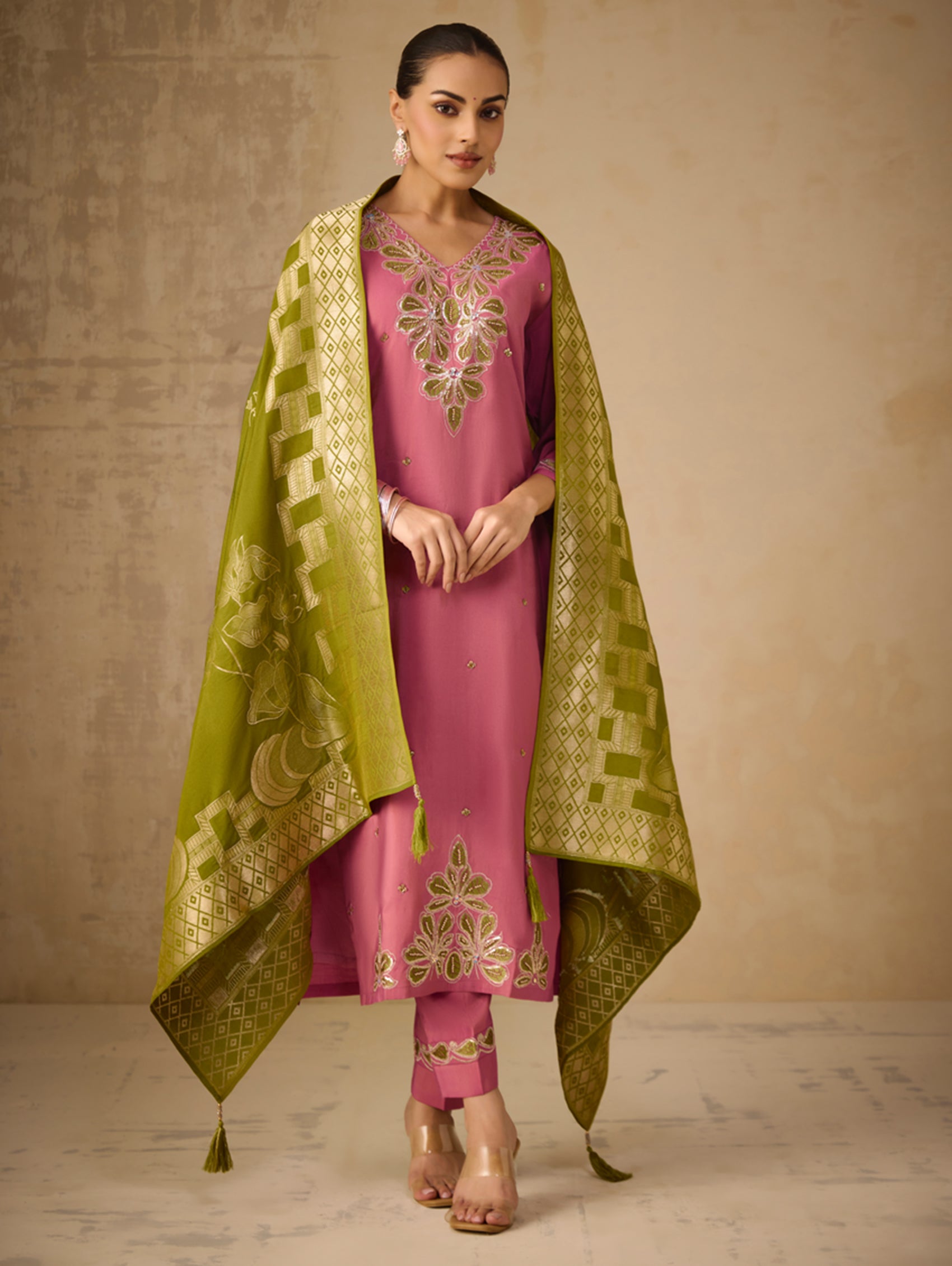 Ignite your passion for pure elegance and luxury with our latest festive collection, 'MEENA'. Experience the exquisite beauty of a digitally printed shimmer silk kurta, adorned with aari and hand embroidery, paired perfectly with straight pants and a matching dupatta. Elevate your wardrobe today to new levels of sophistication and style!