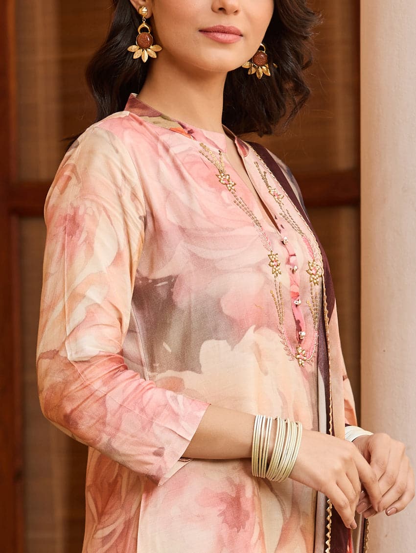 • Kurta with round neckline, three-fourth sleeves, and side slits open