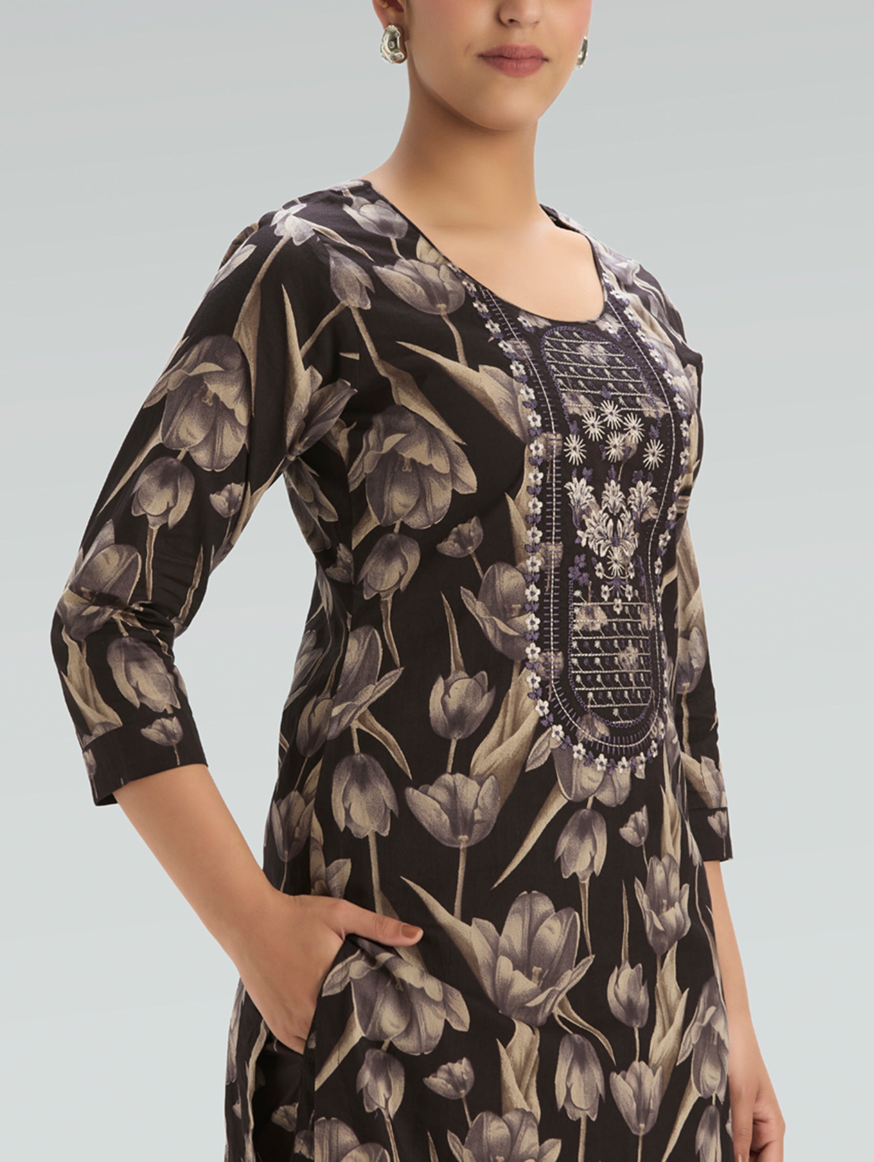 • Kurta with round-neckline, three-fourth sleeves, and side slits open