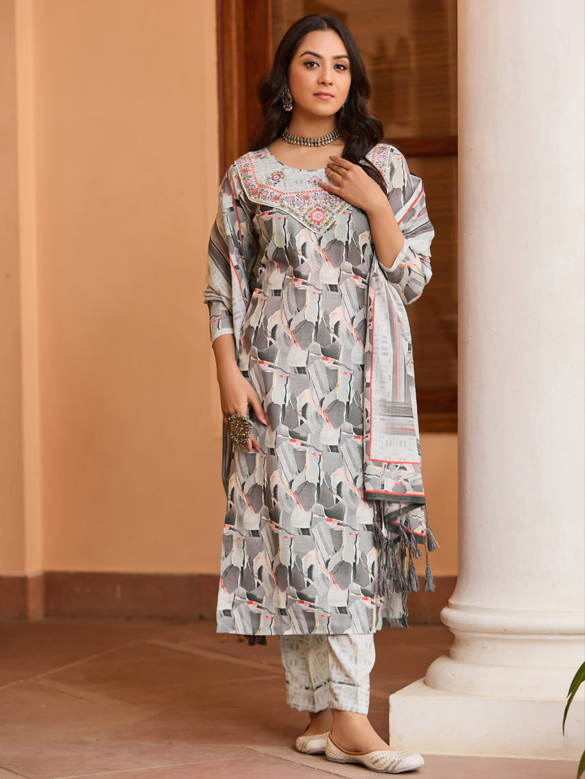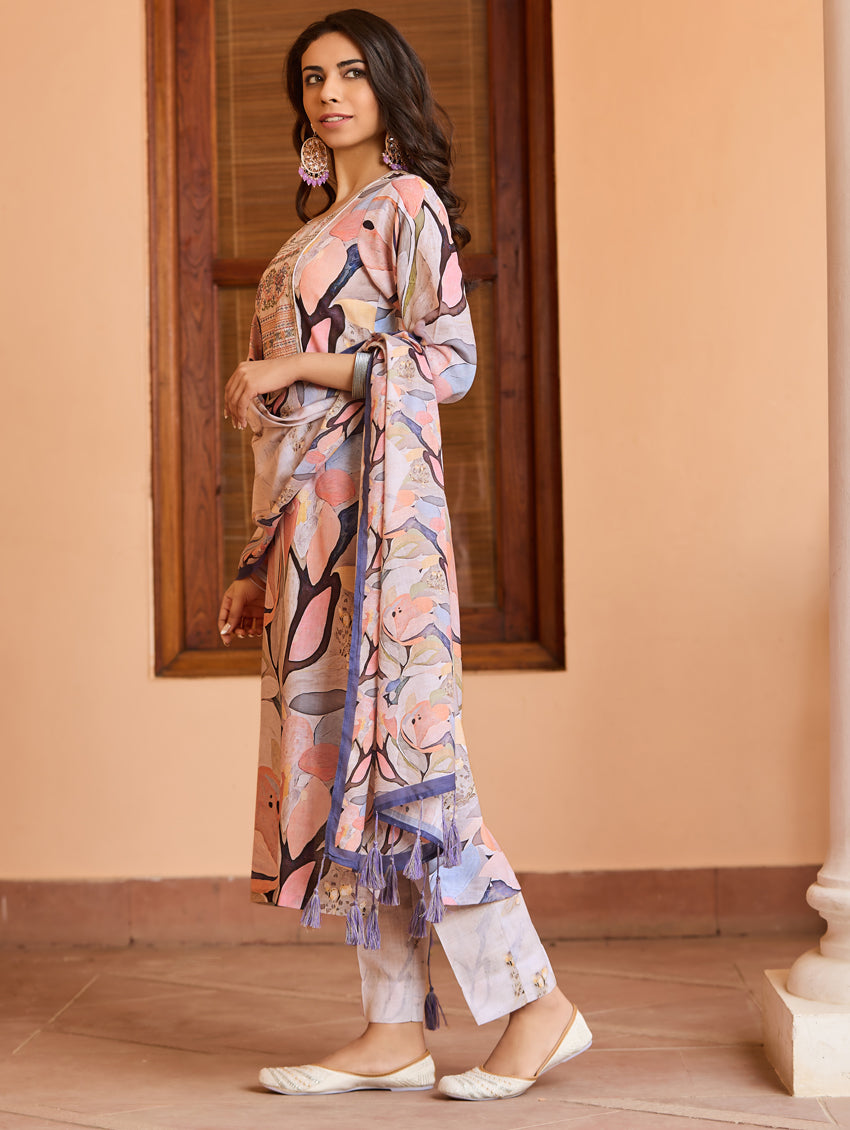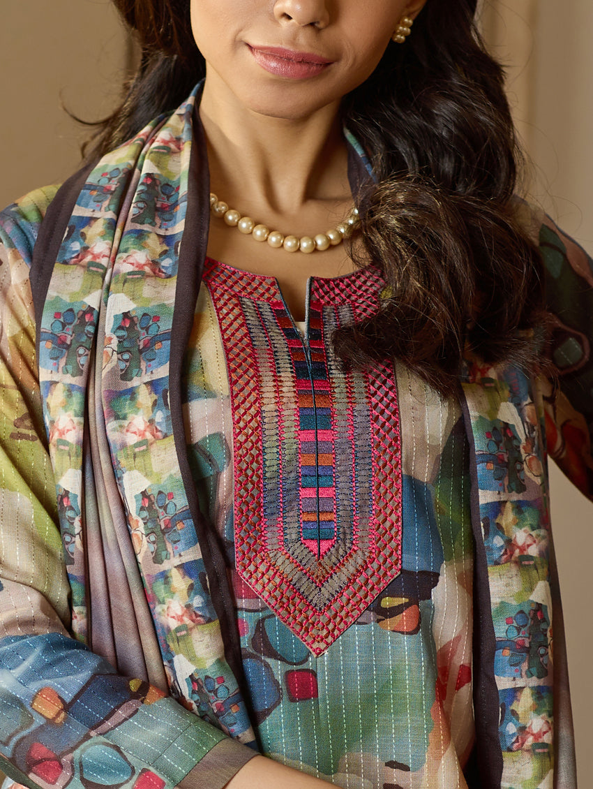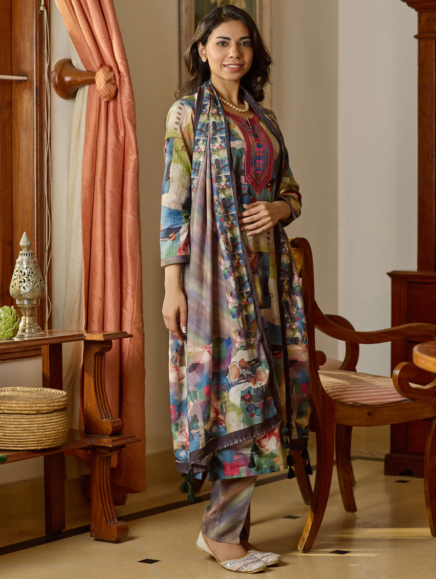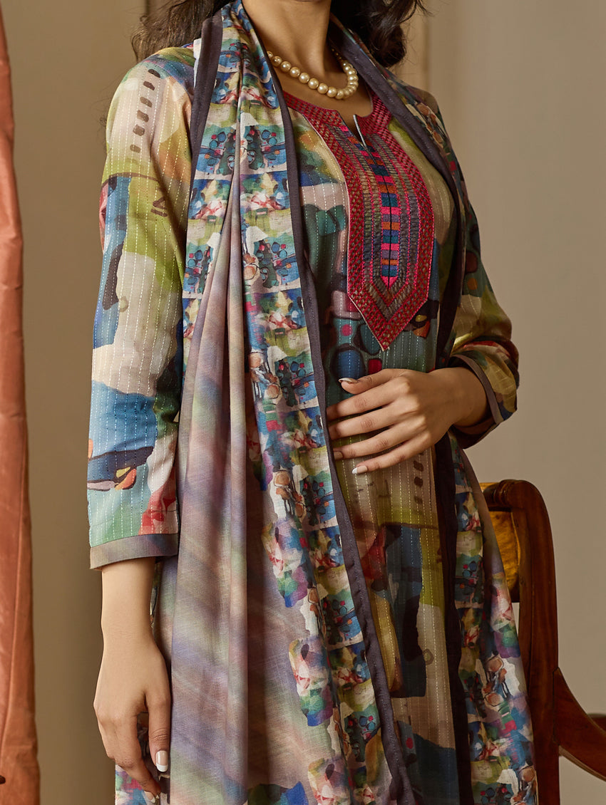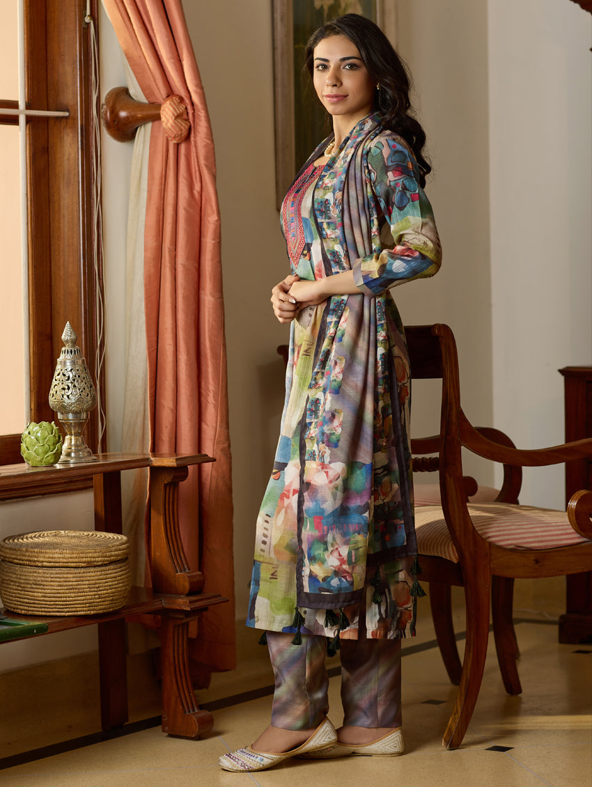 Explore the fashion-forward, one-of-a-kind suit set made of digitally printed viscose rayon that will enhance your wardrobe. The kurta showcases intricate computerized thread embroidery, while the straight pants and matching mul dupatta add to the stunning appearance of our latest collection. Discover the passion and value of this ensemble with its striking design and captivating style.