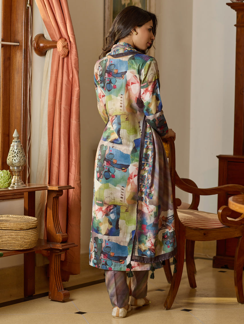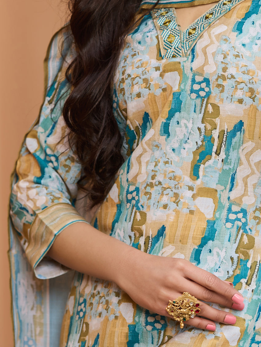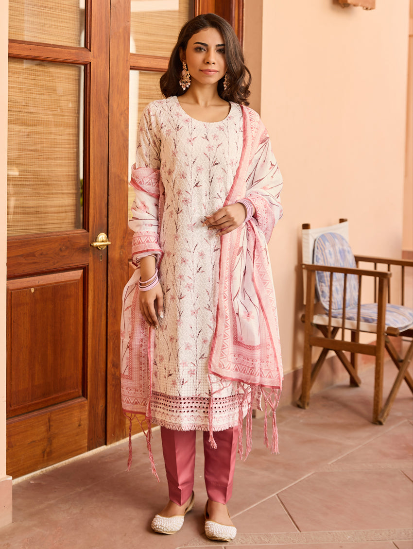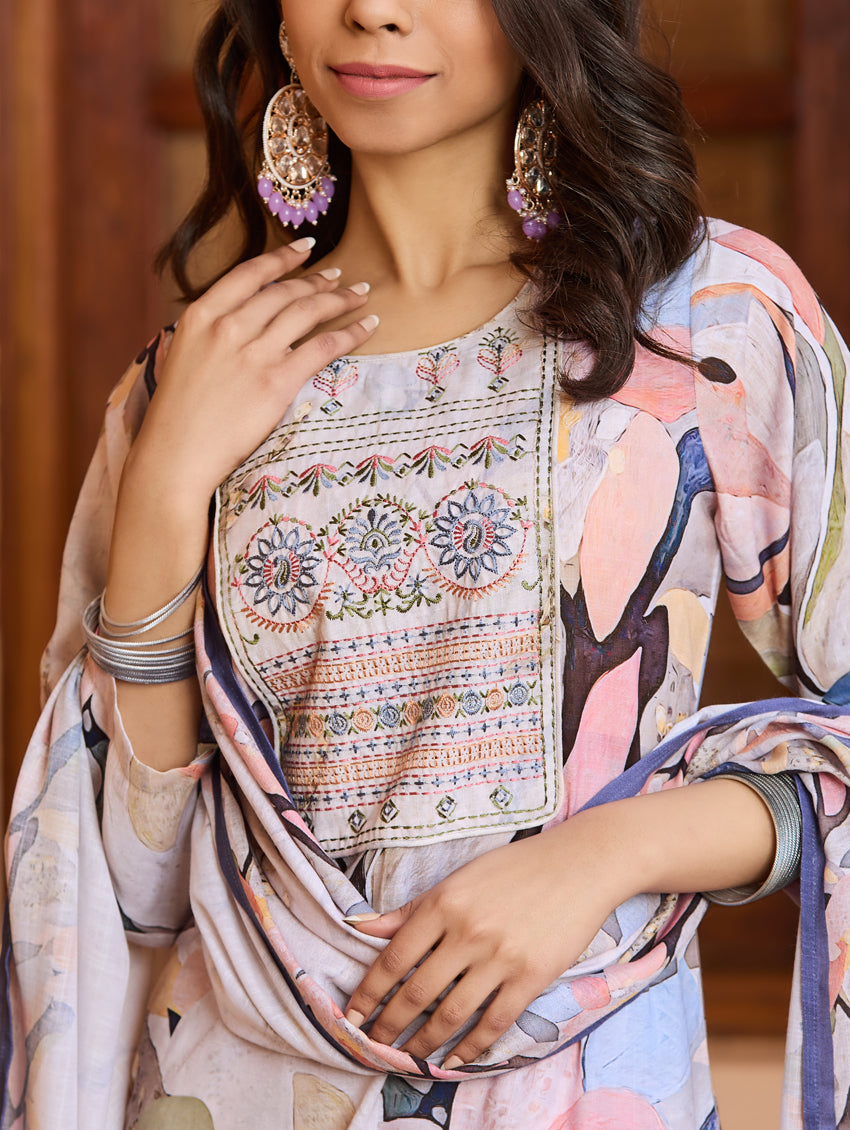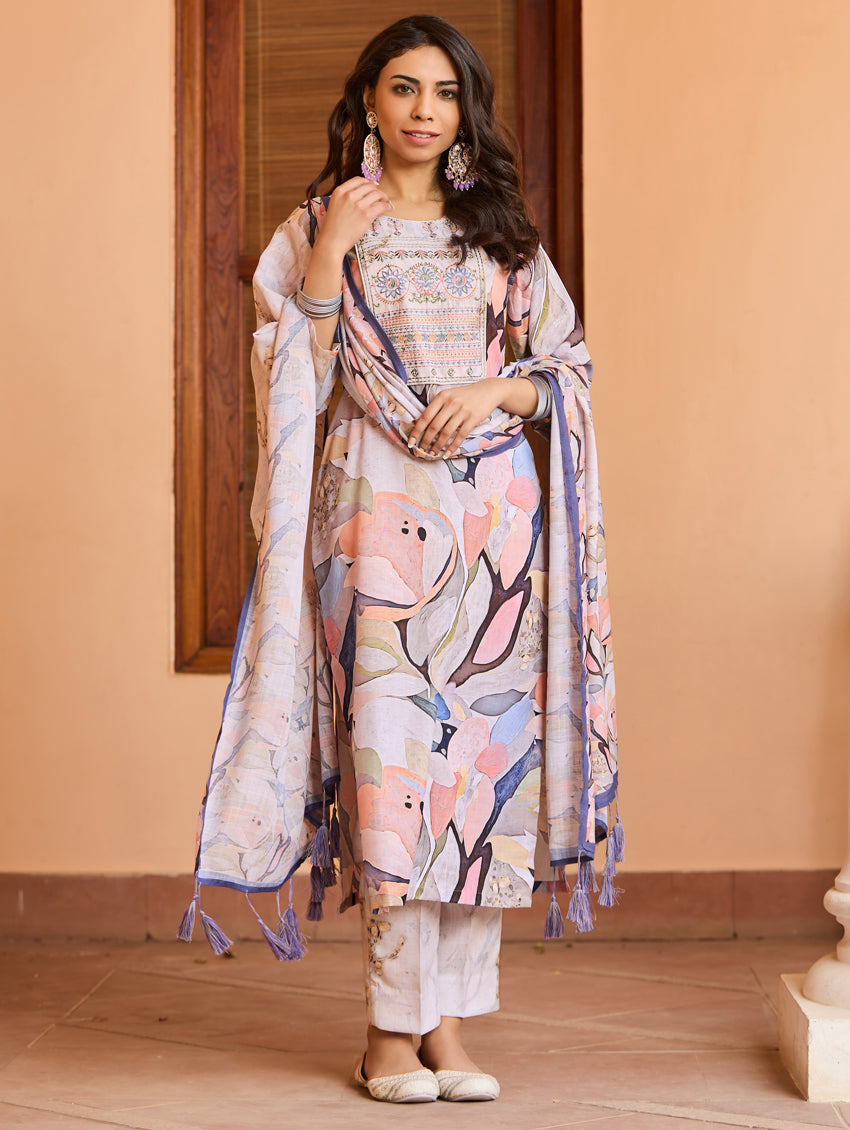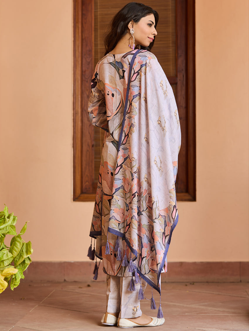 Explore the fashion-forward, one-of-a-kind suit set made of digitally printed viscose rayon that will enhance your wardrobe. The kurta showcases intricate computerized thread embroidery, while the straight pants and matching mul dupatta add to the stunning appearance of our latest collection. Discover the passion and value of this ensemble with its striking design and captivating style.