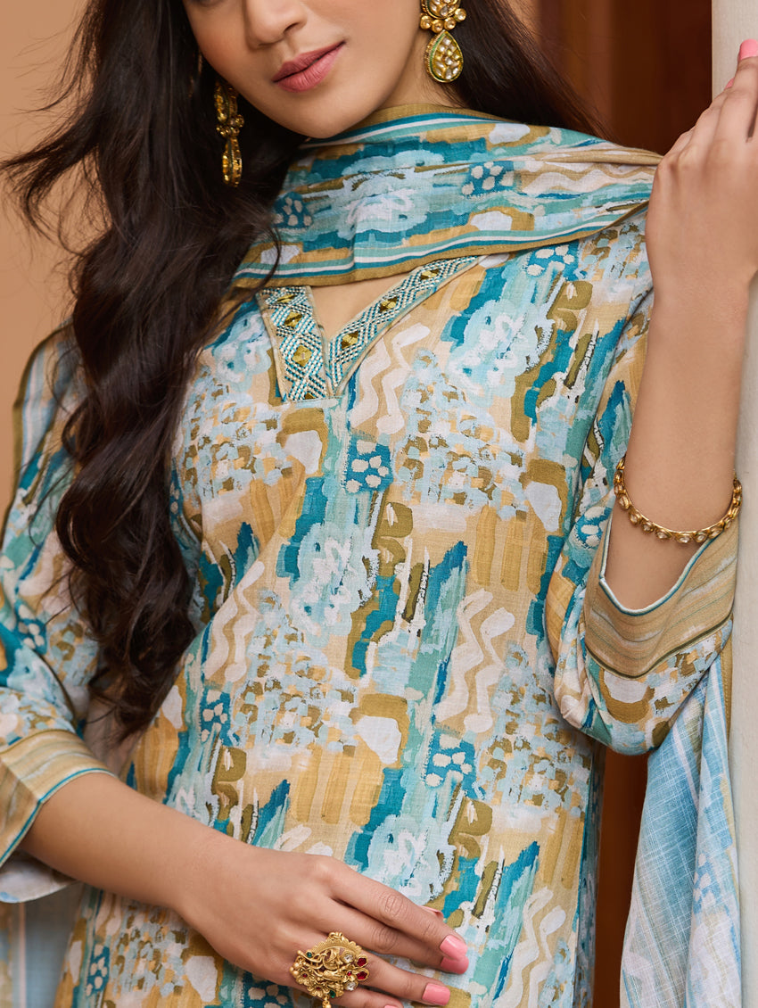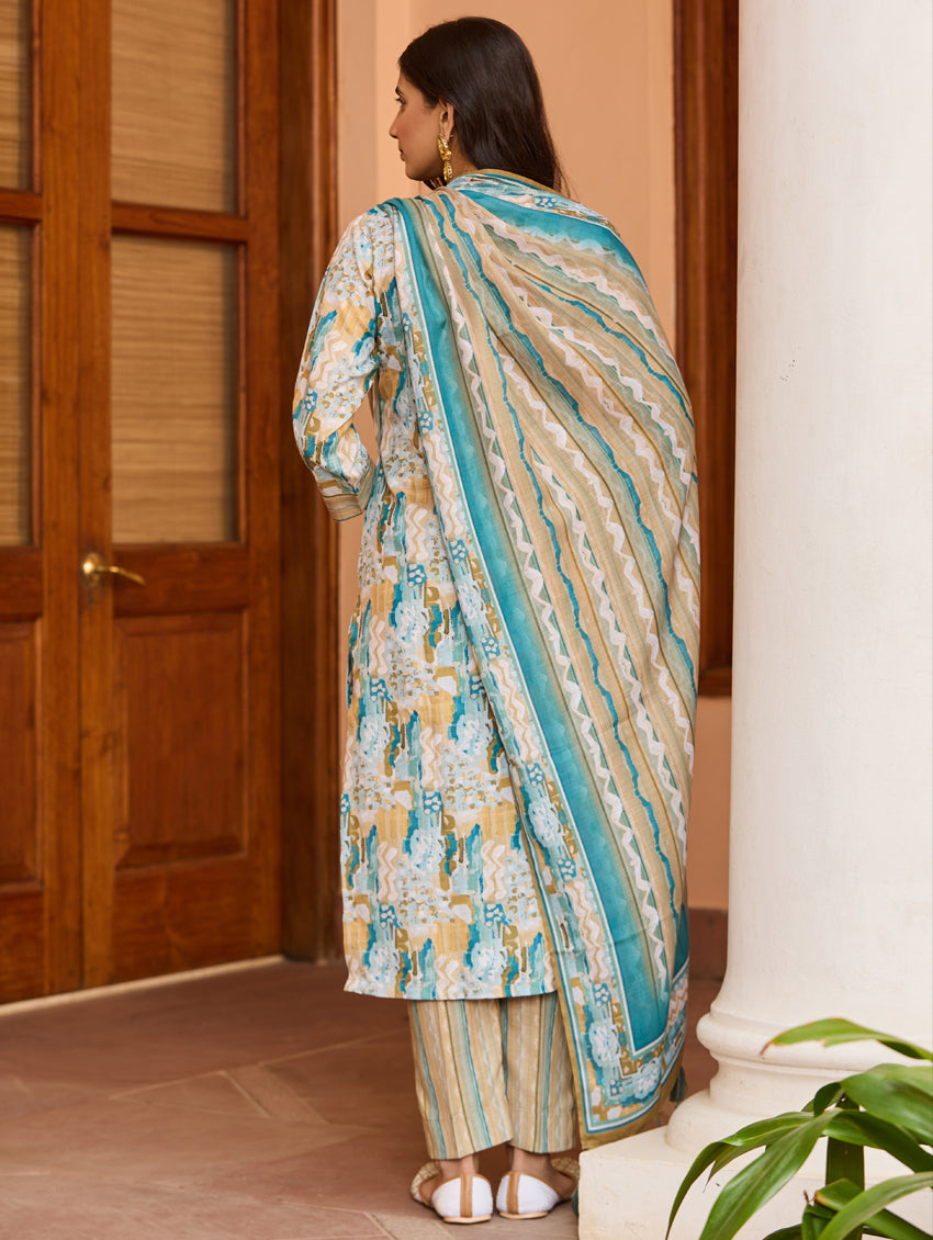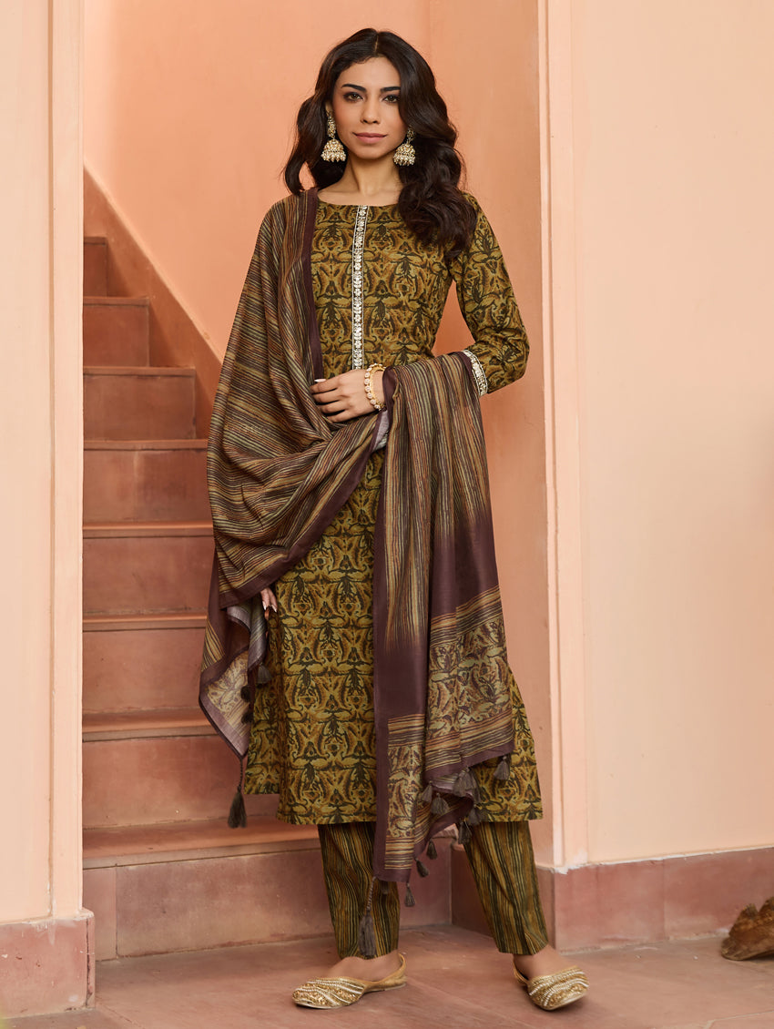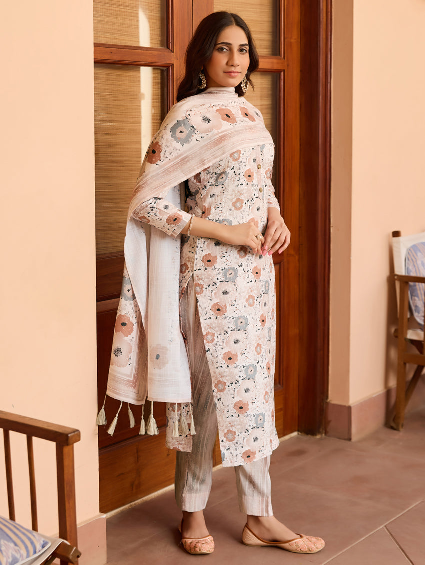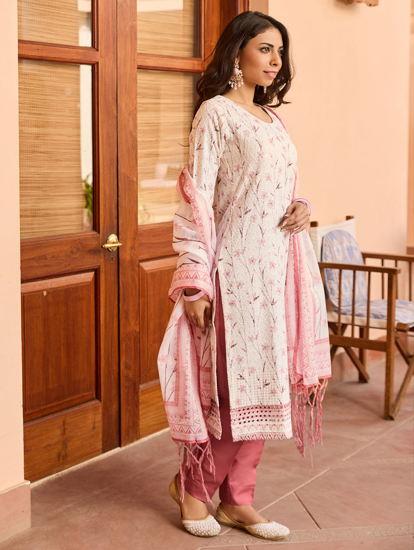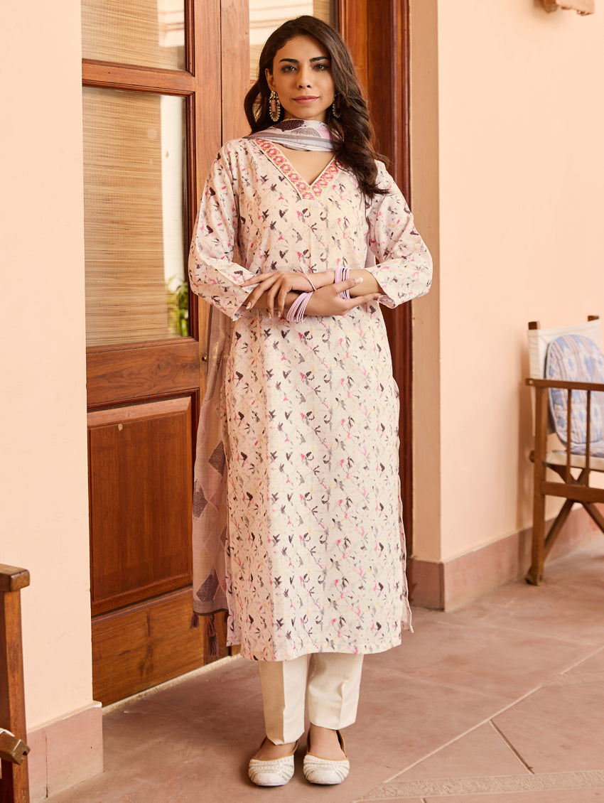 Explore the fashion-forward, one-of-a-kind suit set made of digitally printed viscose rayon that will enhance your wardrobe. The kurta showcases intricate computerized thread embroidery, while the straight pants and matching mul dupatta add to the stunning appearance of our latest collection. Discover the passion and value of this ensemble with its striking design and captivating style.