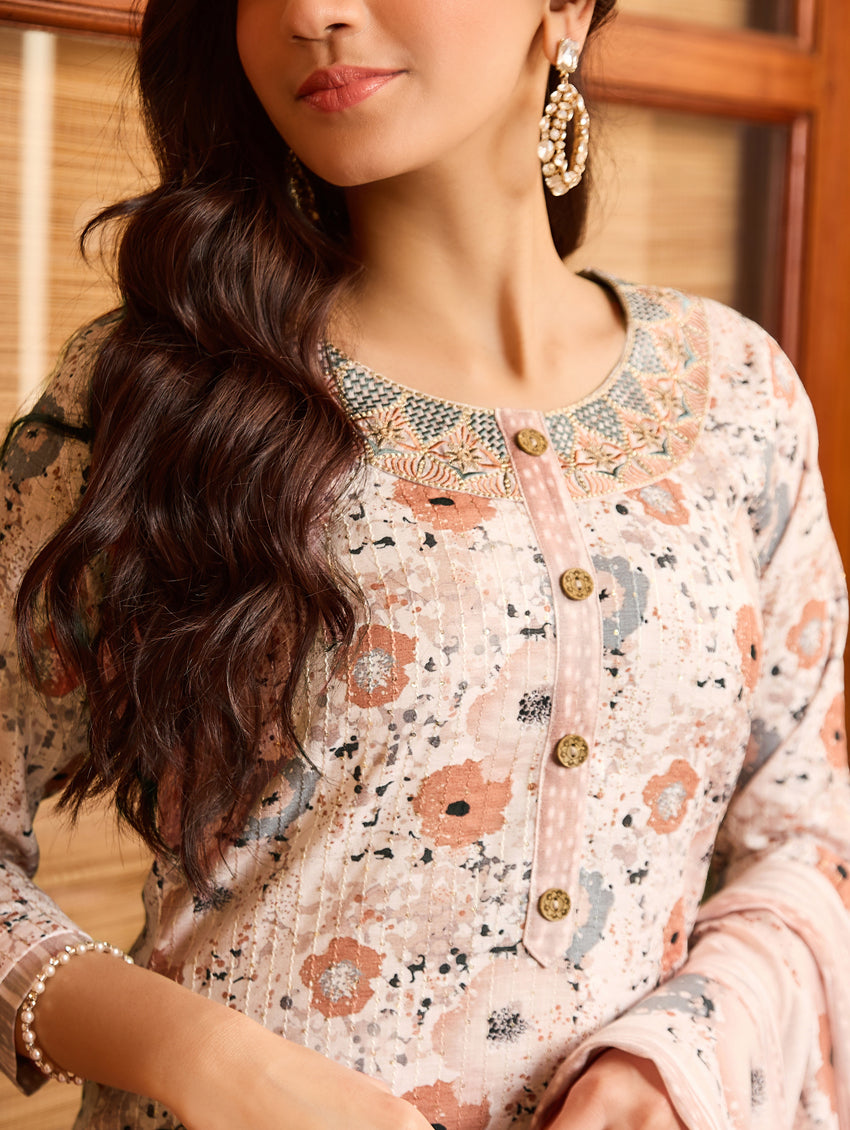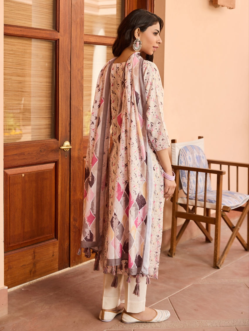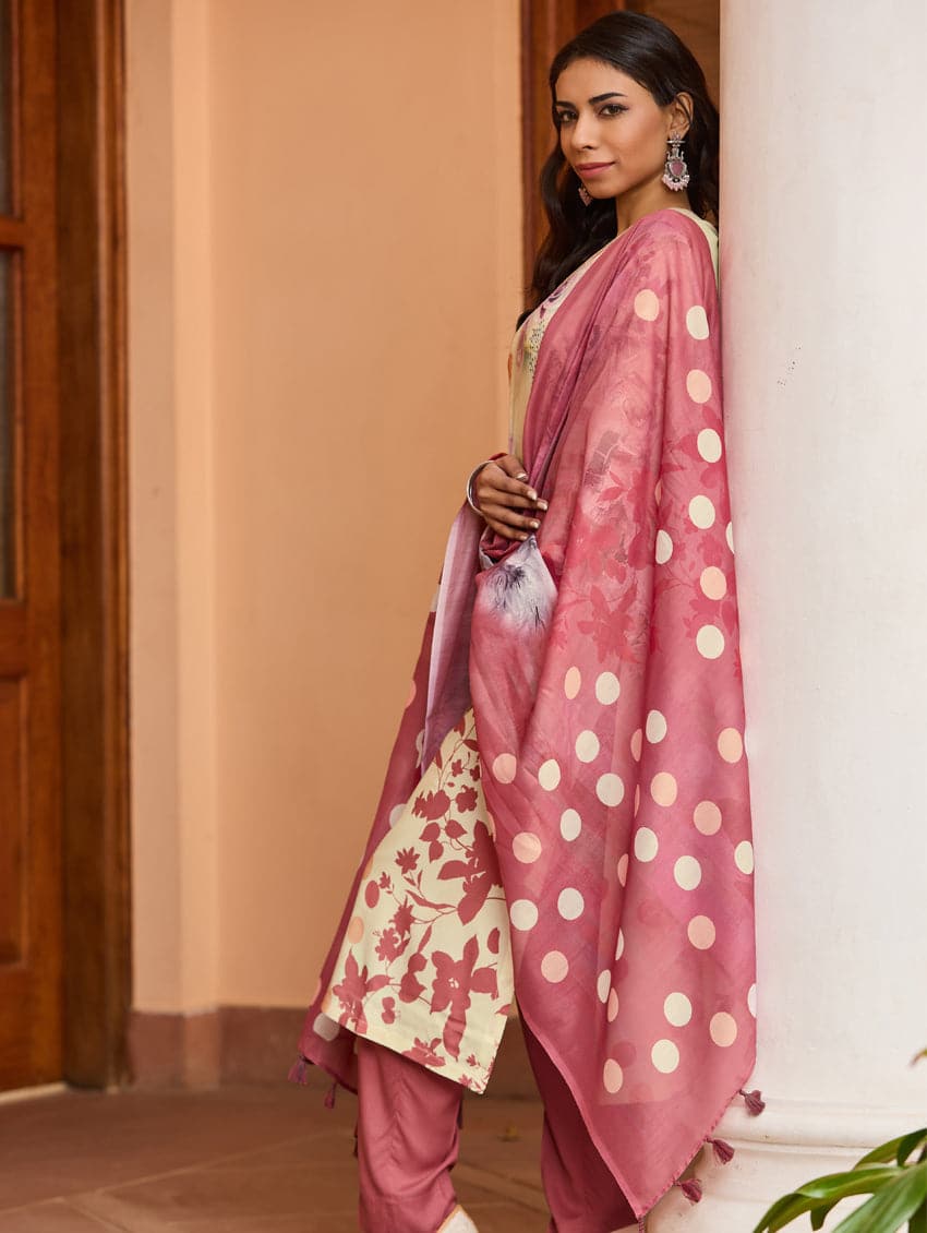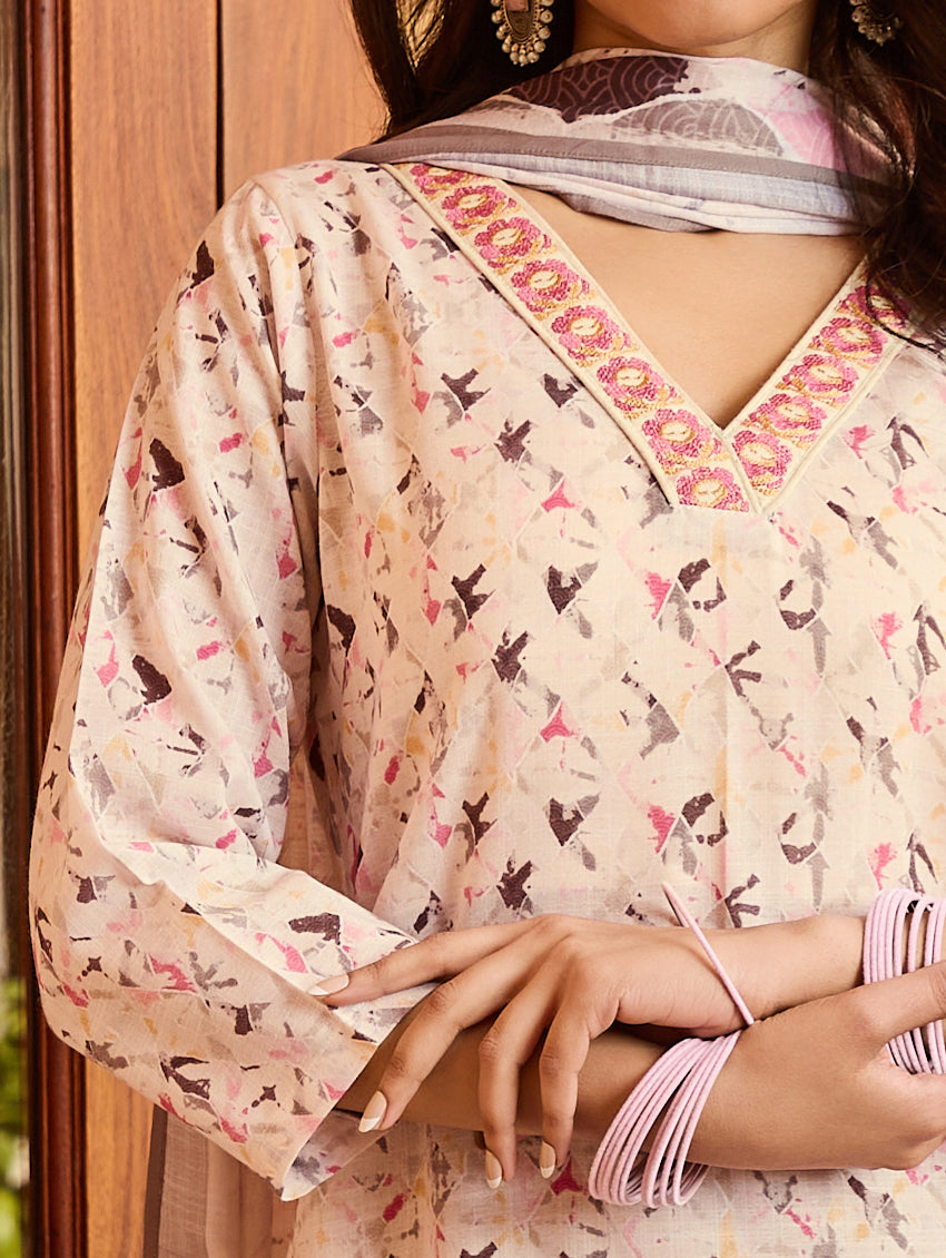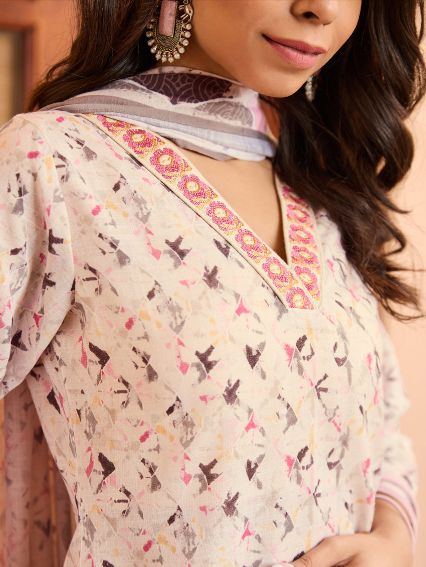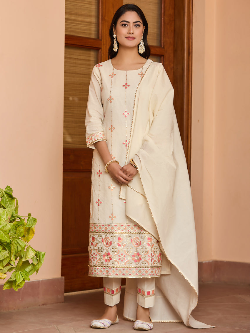 Explore the fashion-forward, one-of-a-kind suit set made of digitally printed viscose rayon that will enhance your wardrobe. The kurta showcases intricate computerized thread embroidery, while the straight pants and matching mul dupatta add to the stunning appearance of our latest collection. Discover the passion and value of this ensemble with its striking design and captivating style.