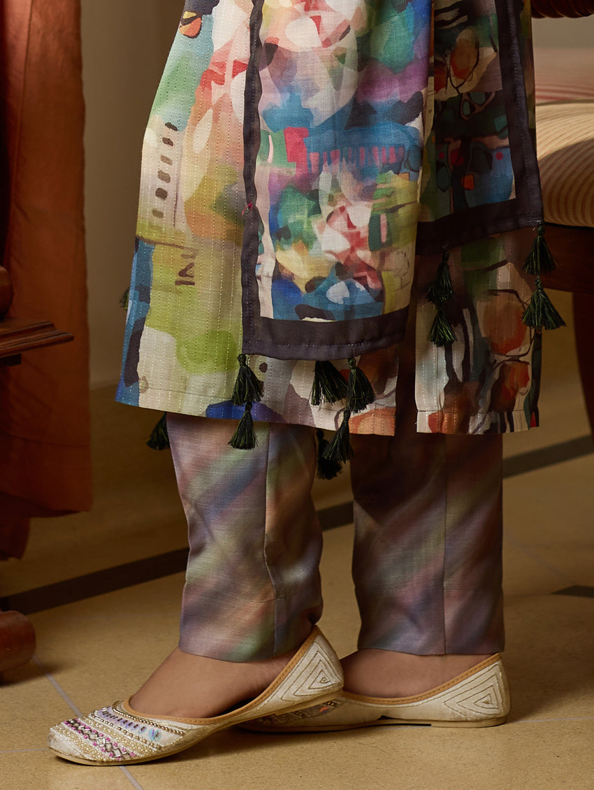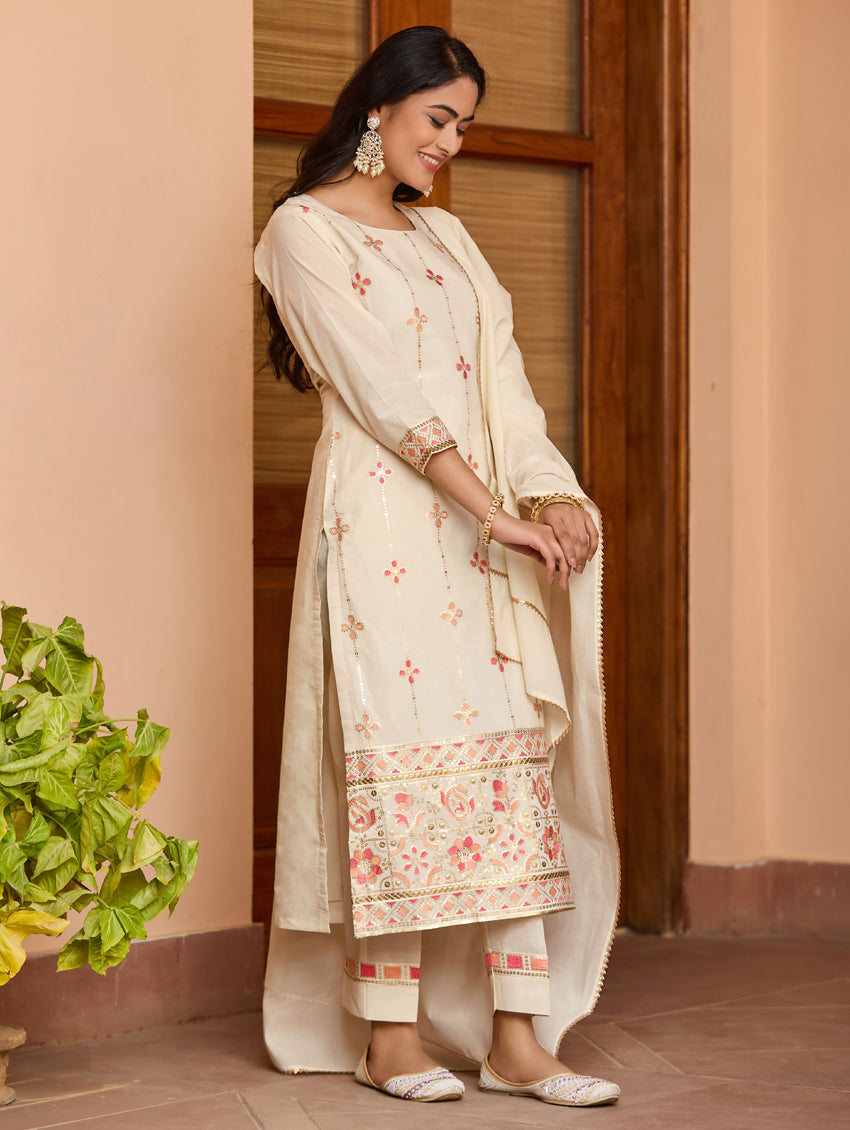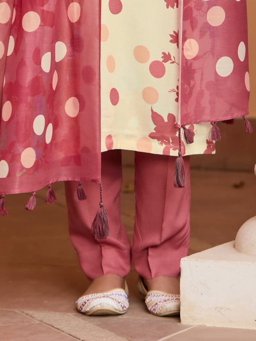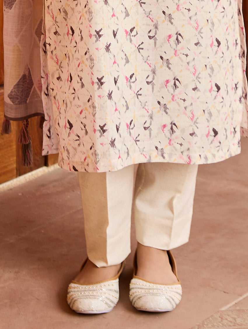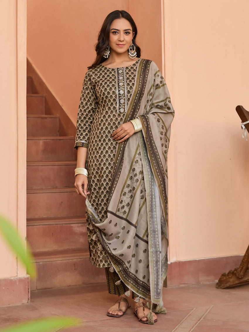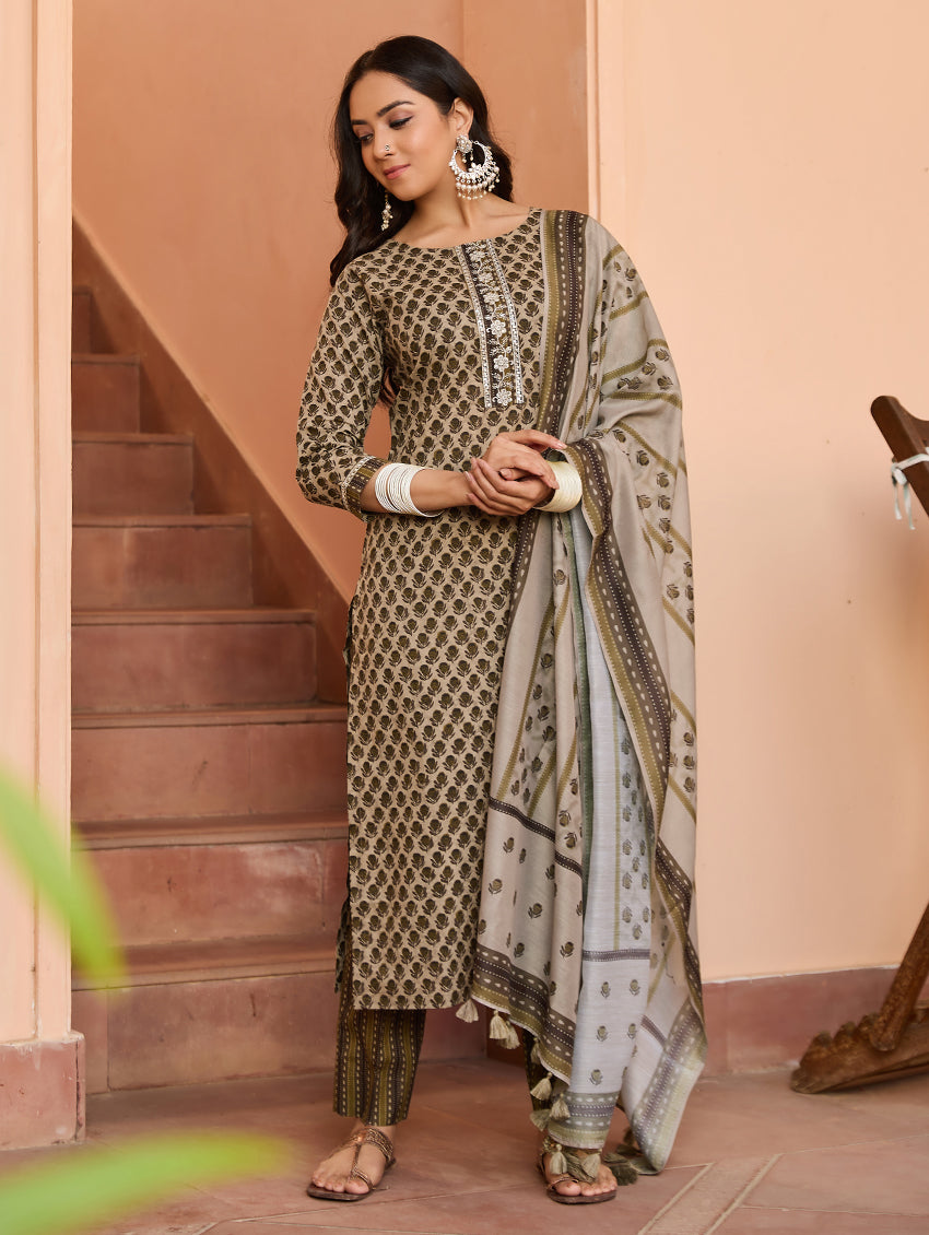 Explore the fashion-forward, one-of-a-kind suit set made of digitally printed viscose rayon that will enhance your wardrobe. The kurta showcases intricate computerized thread embroidery, while the straight pants and matching mul dupatta add to the stunning appearance of our latest collection. Discover the passion and value of this ensemble with its striking design and captivating style.