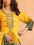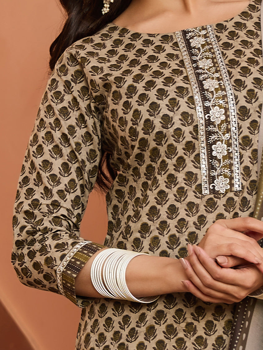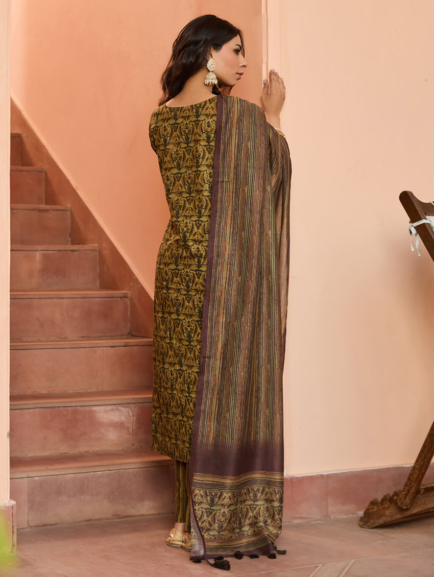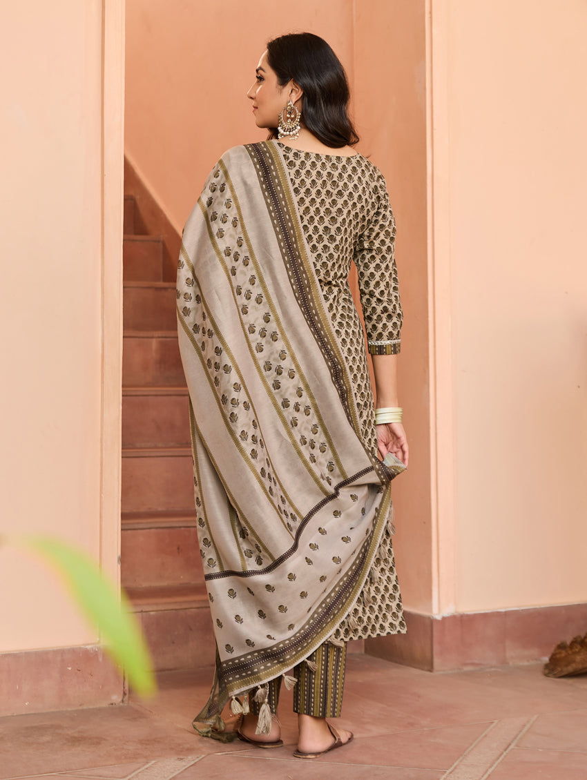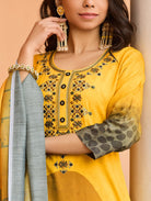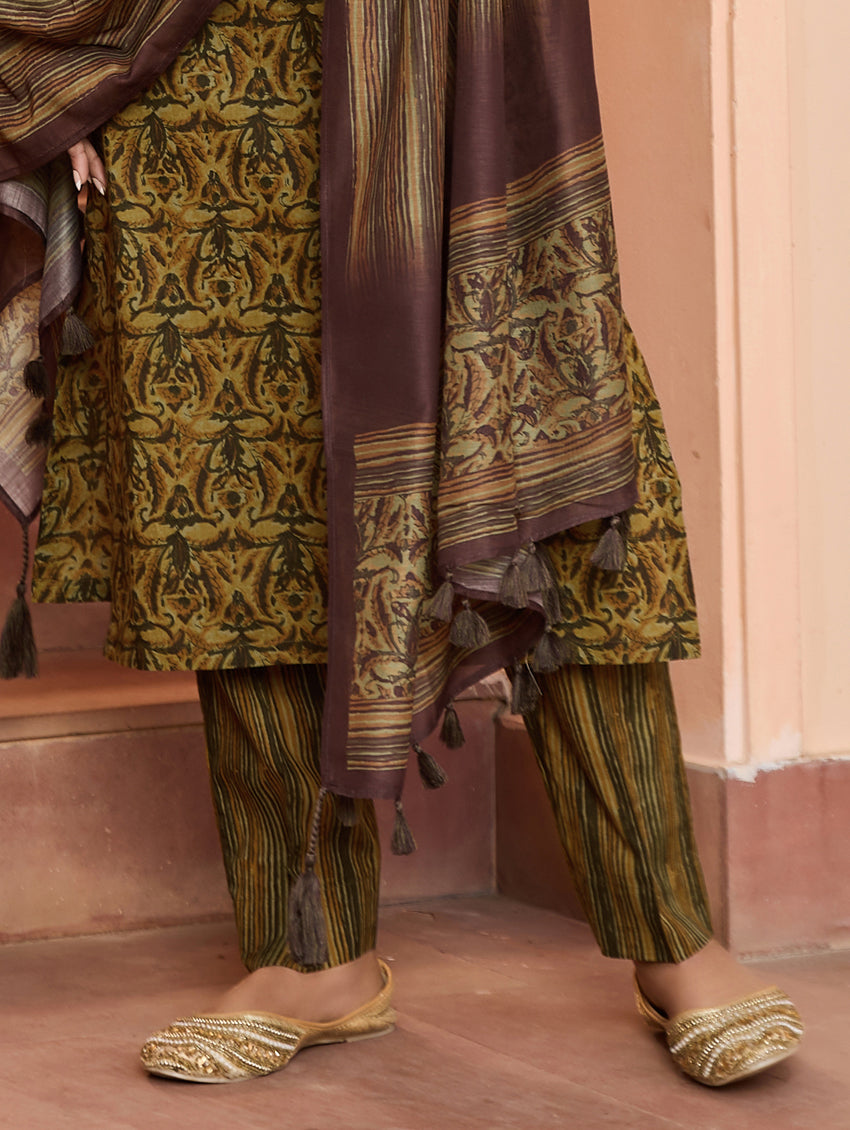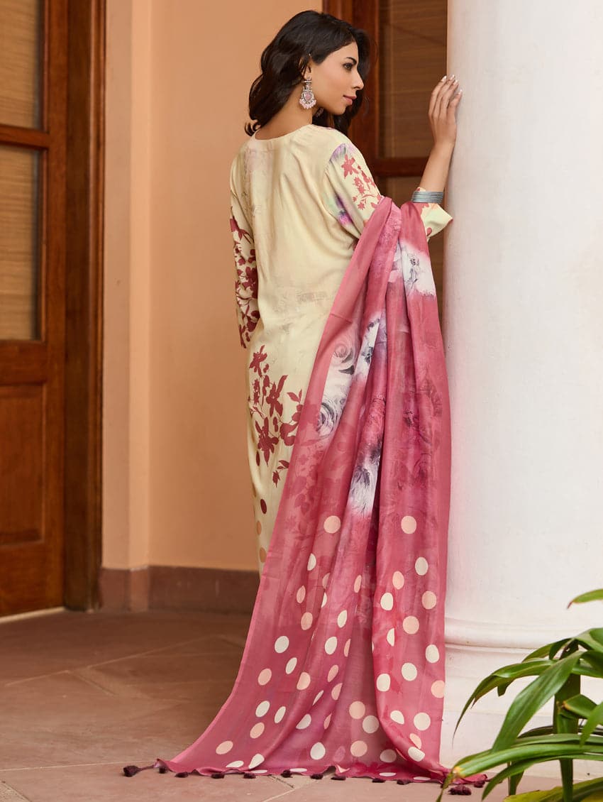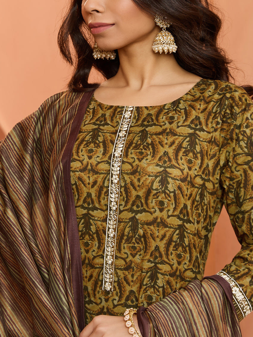 Explore the fashion-forward, one-of-a-kind suit set made of digitally printed viscose rayon that will enhance your wardrobe. The kurta showcases intricate computerized thread embroidery, while the straight pants and matching mul dupatta add to the stunning appearance of our latest collection. Discover the passion and value of this ensemble with its striking design and captivating style.