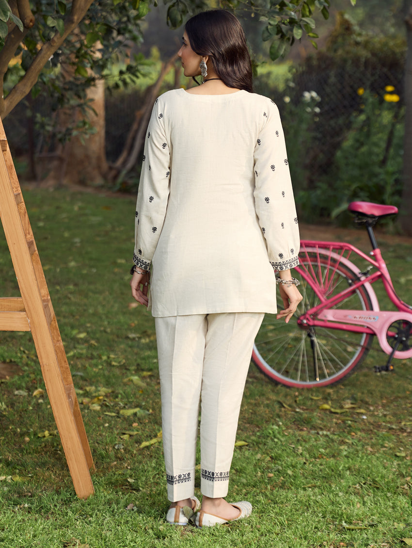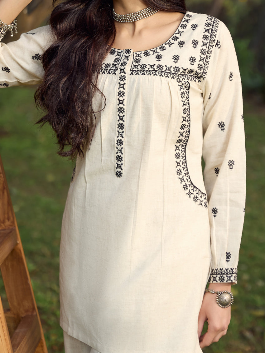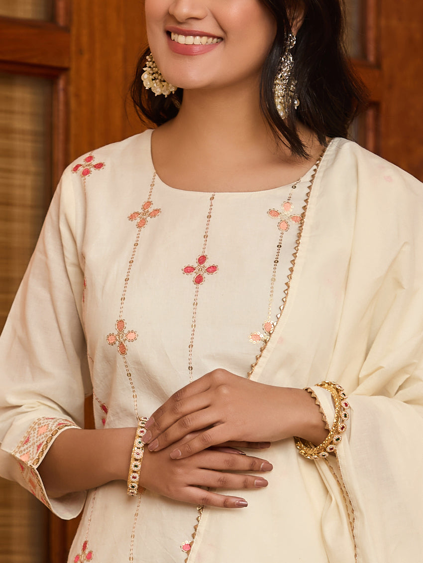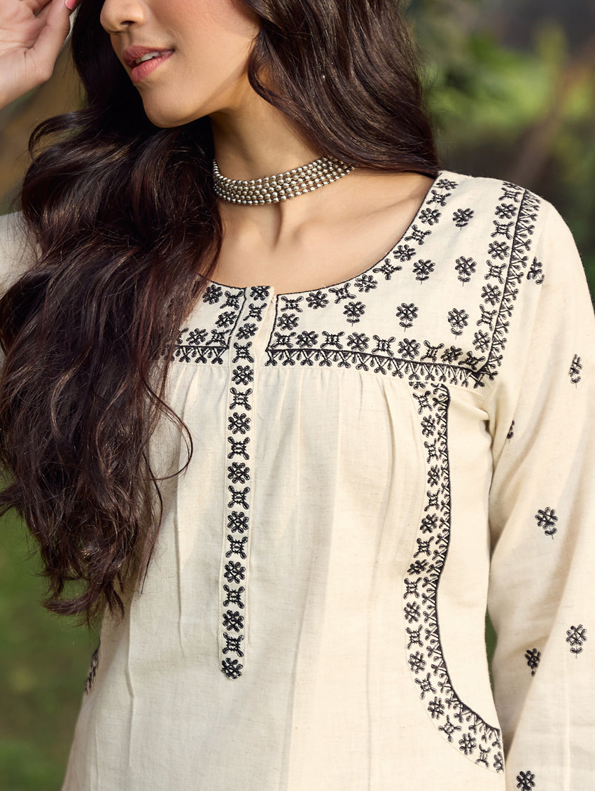 • Kurta with round neckline, three-fourth sleeves, and side slits open