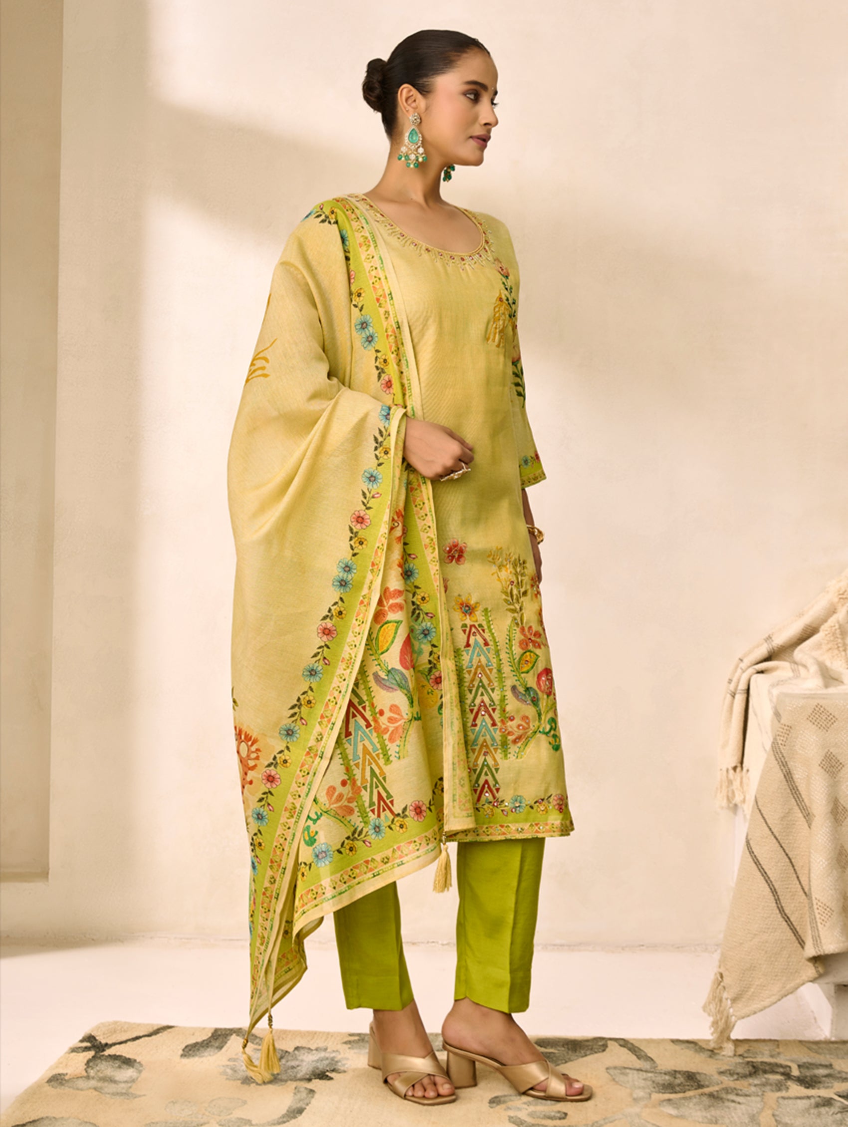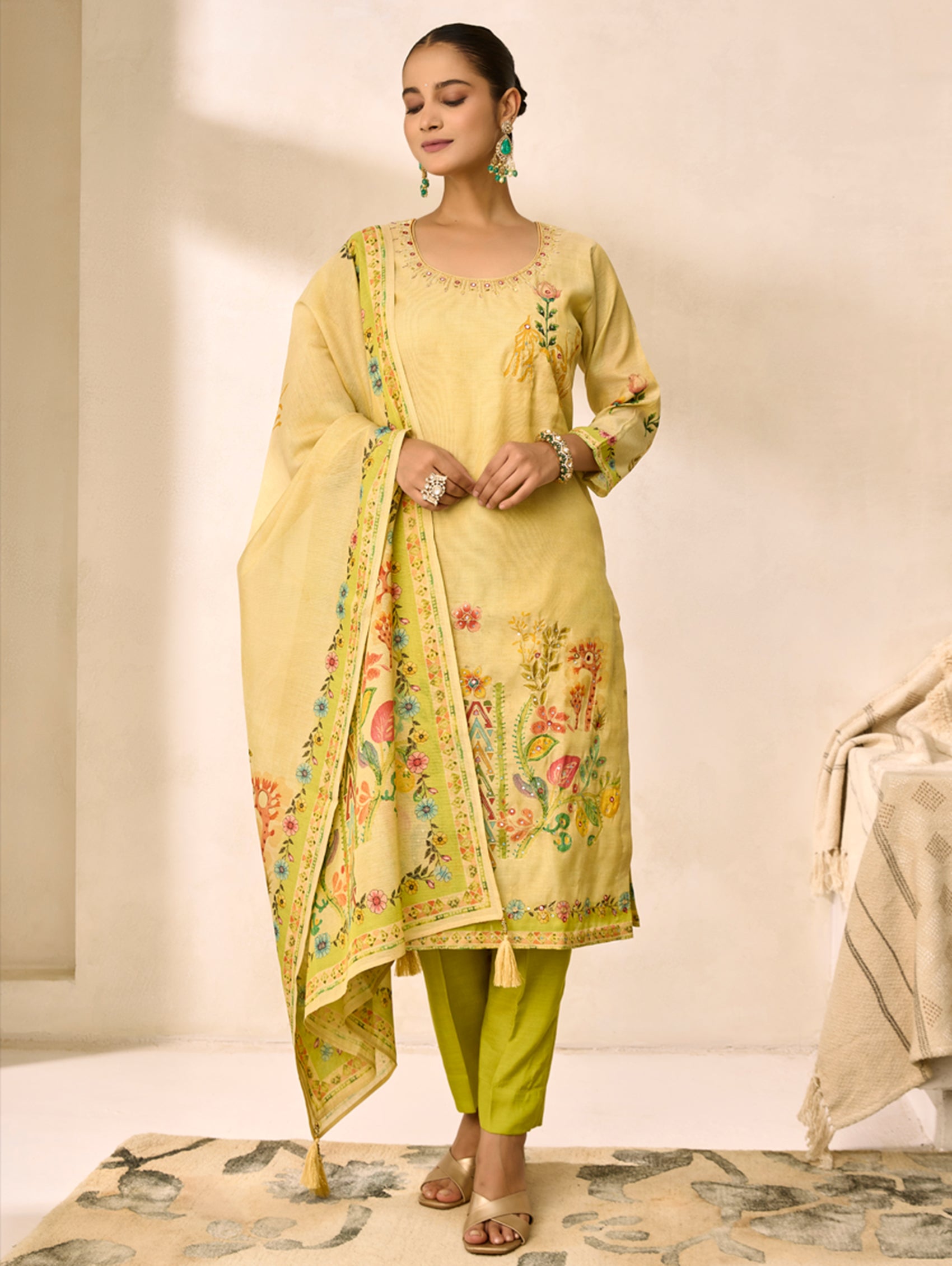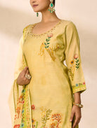 Elevate your wardrobe with this captivating suit set that seamlessly blends contemporary design with timeless sophistication. The digitally printed shimmer silk kurta features intricate aari work and delicate hand embroidery, creating an eye-catching focal point. Paired with tailored straight pants and a matching dupatta, this ensemble delivers the perfect balance of comfort and glamour for any occasion. Discover the luxurious feel and refined aesthetic that makes this collection truly unforgettable.