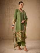 Discover the charm of this digitally printed viscose muslin silk suit set, featuring a kurta adorned with intricate computerised thread and hand embroidery, paired with classic pants and a coordinating digitally printed muslin silk dupatta. Ideal for those who appreciate refined style, this stunning ensemble brings an enduring elegance to your wardrobe. Secure this unique and fashionable outfit today!