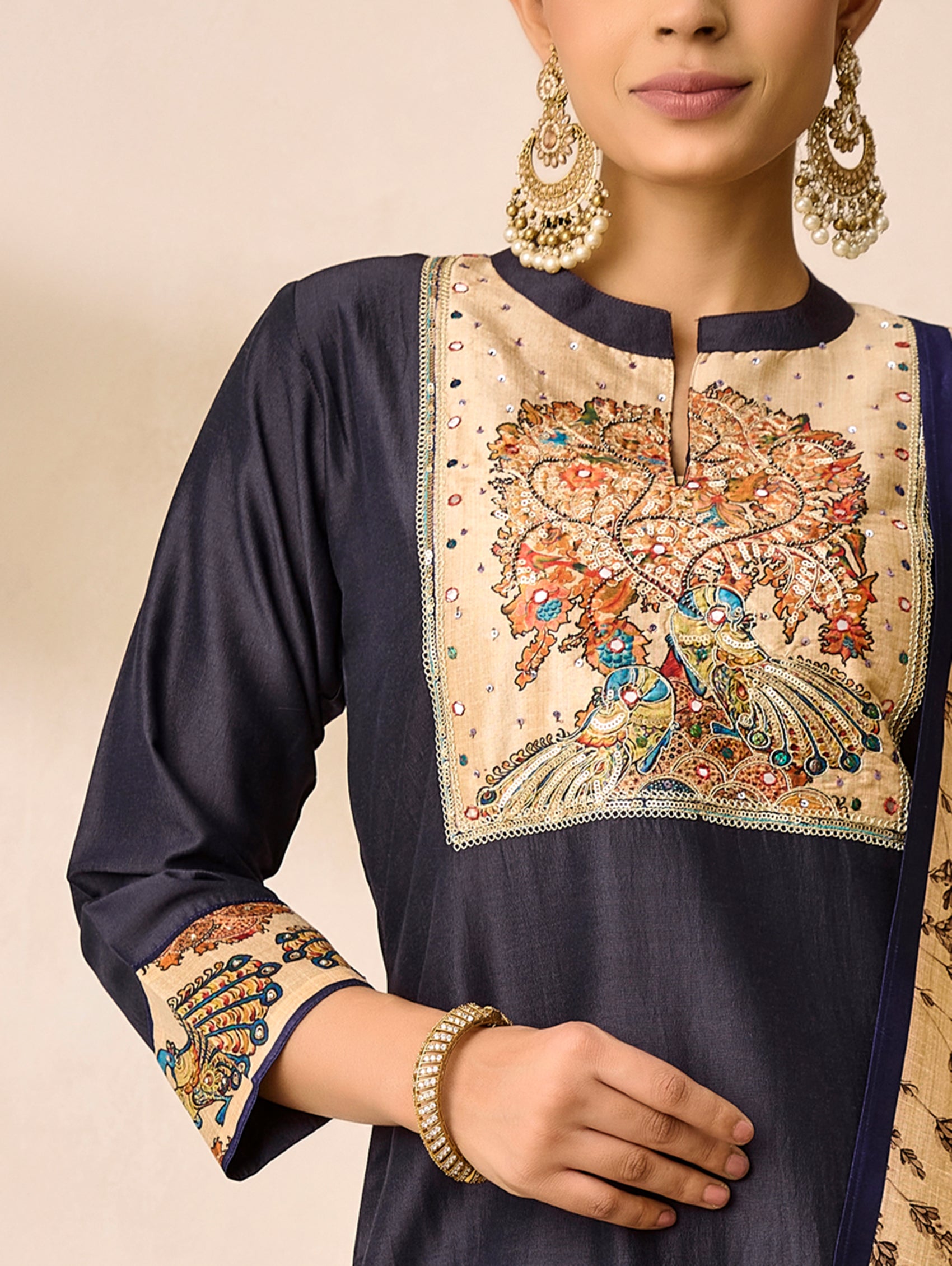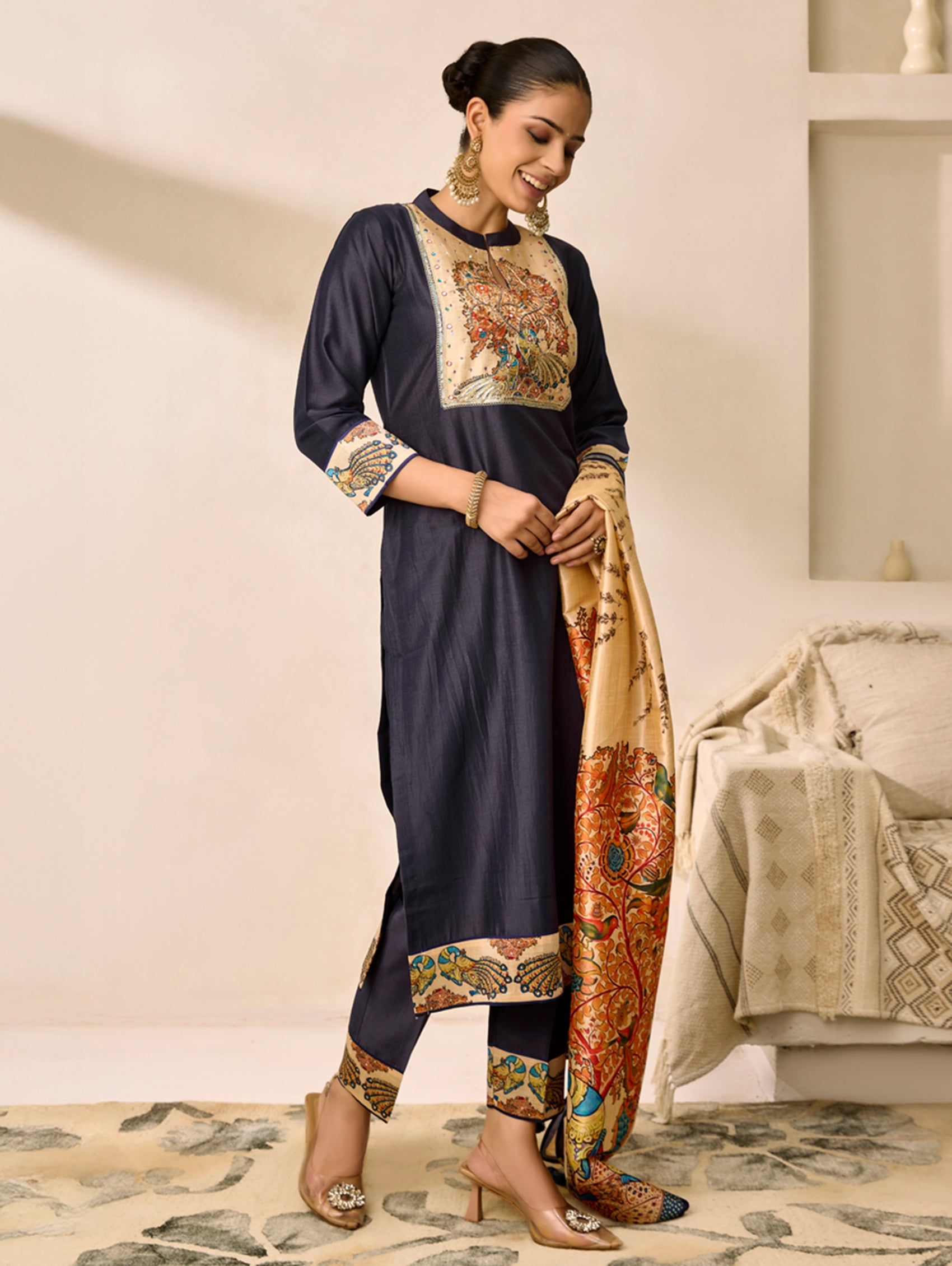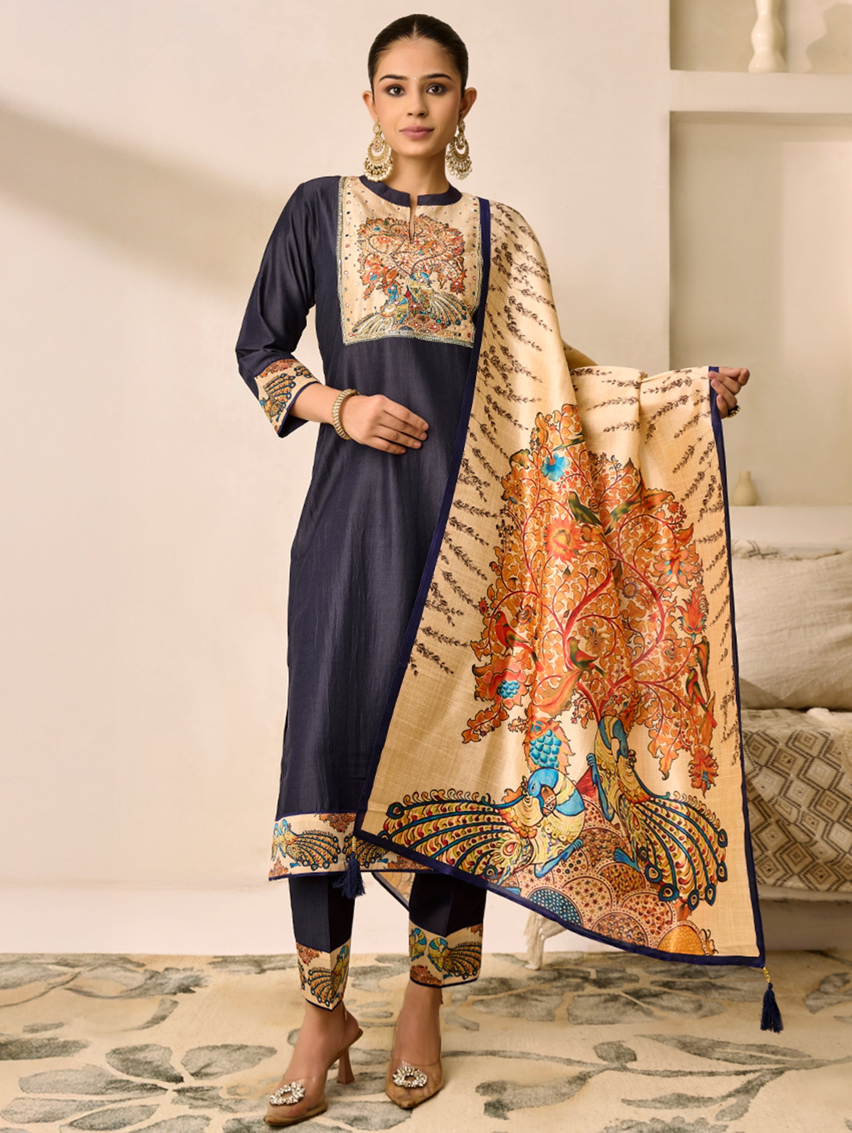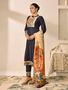 Upgrade your collection with this straight-cut suit crafted from premium viscose silk. The kurta showcases intricate computerized zari, sequin, and hand embroidery on the yoke, paired with coordinating straight pants and a digitally printed silk dupatta. This ensemble perfectly blends classic artistry with modern style, delivering a sophisticated and elegant appearance with ease.