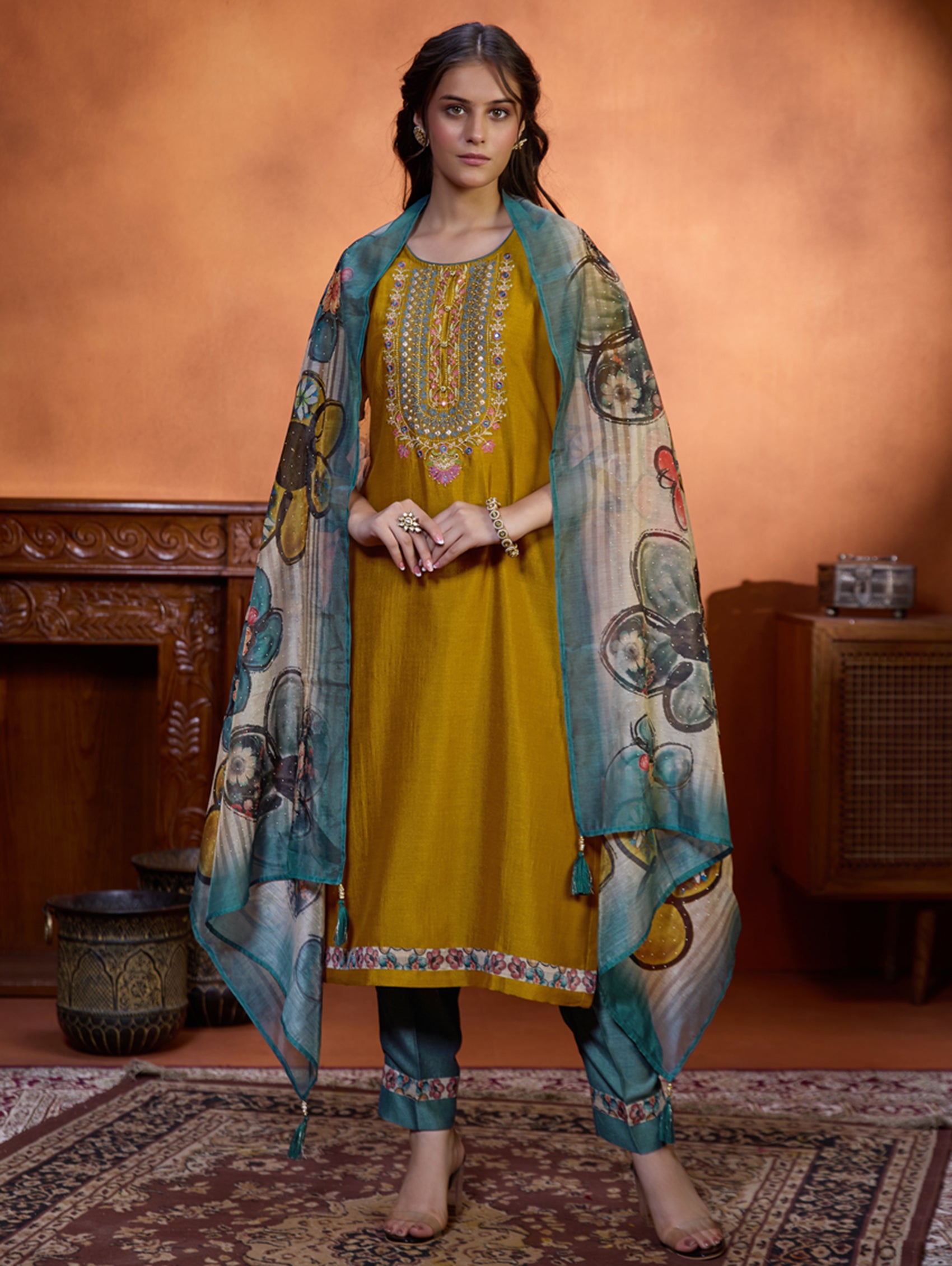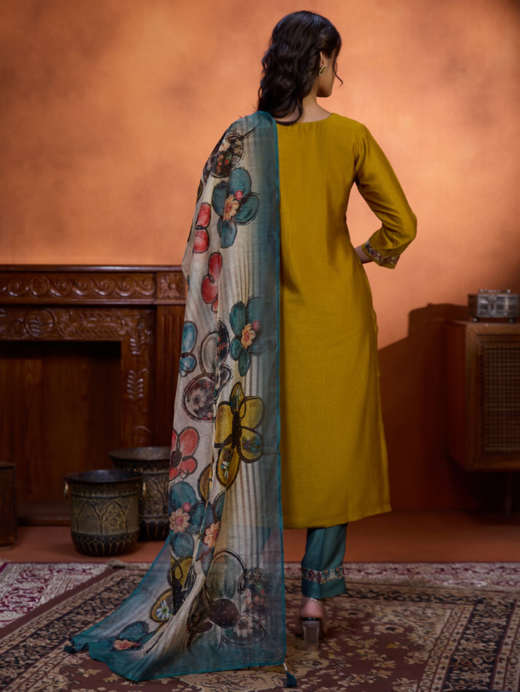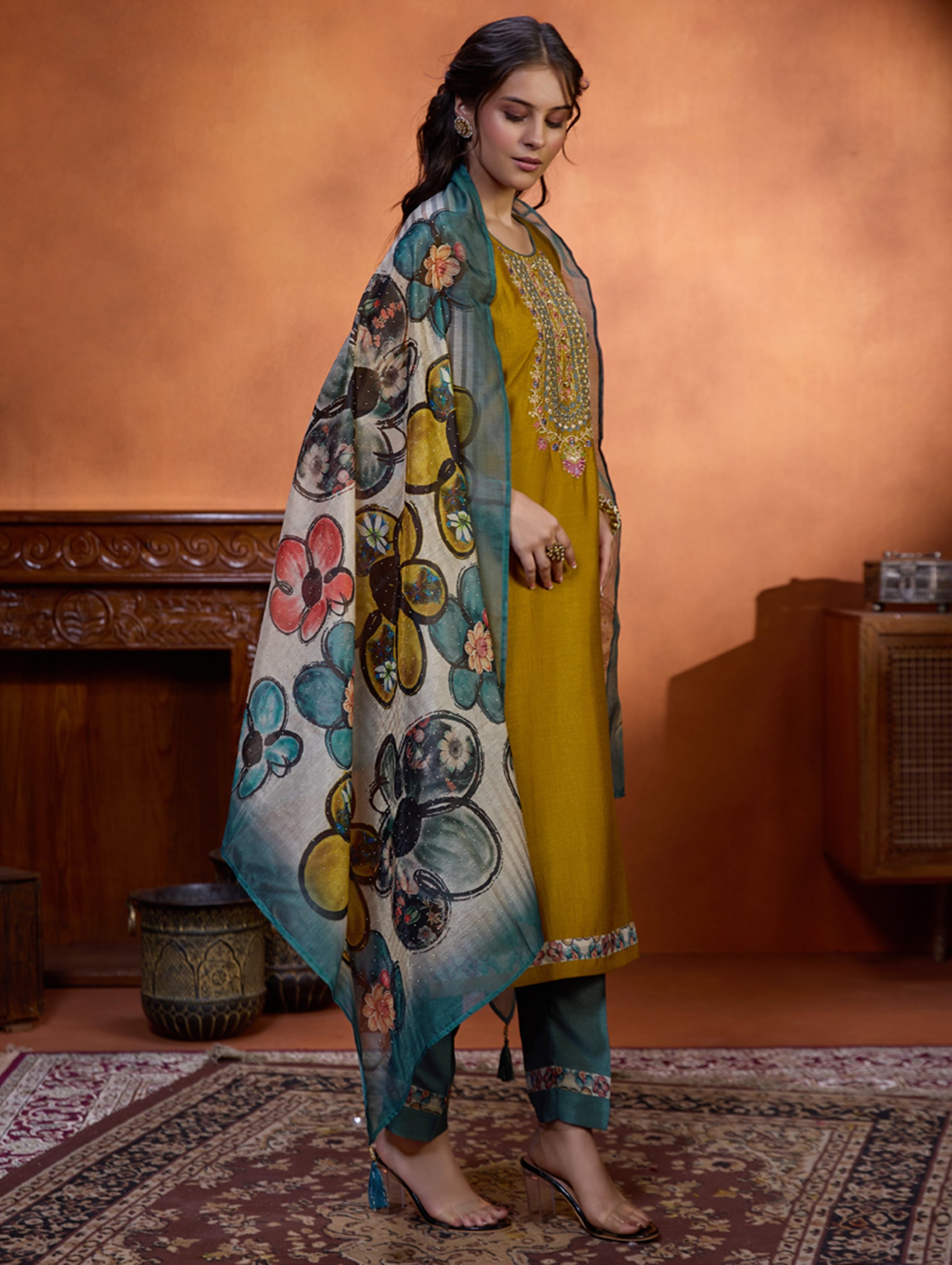 Experience the allure of this beautifully crafted viscose muslin suit set with digital prints! The kurta showcases delicate hand embroidery, paired with regular fit pants and a coordinating digitally printed muslin dupatta. Elevate your style with this distinctive and trendy ensemble that belongs in every modern wardrobe.