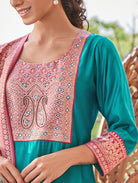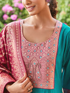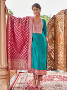 A straight-fit suit set from our latest collection. The set combines a kurta and regular pants in silk fabric and a jacquard weave silk dupatta. Kurta comes accentuated with hand embroidery on the jacquard weave silk yoke.