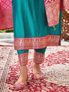* Solid-coloured kurta with pants and jacquard weave silk dupatta